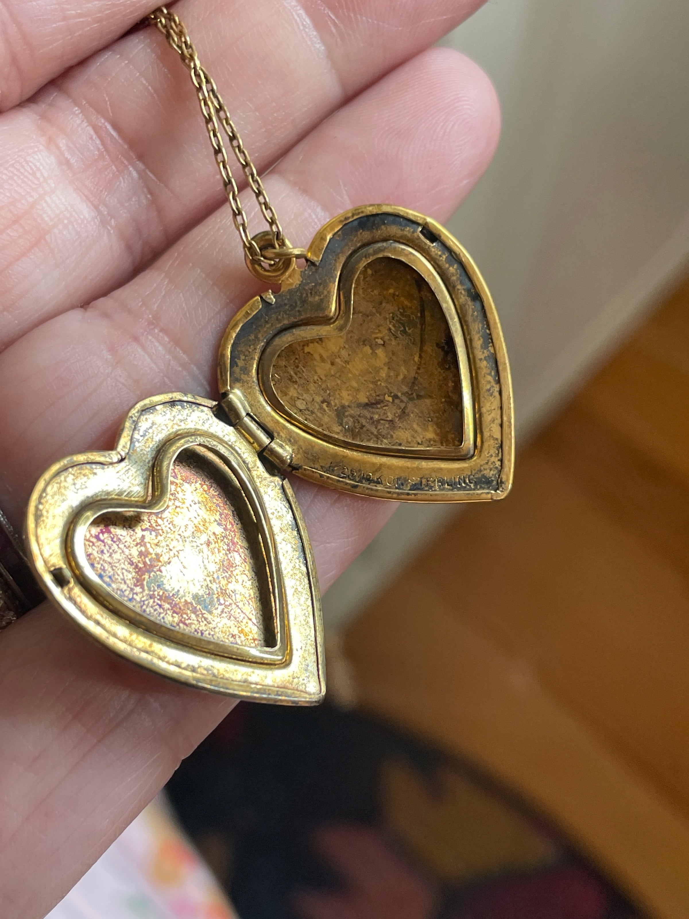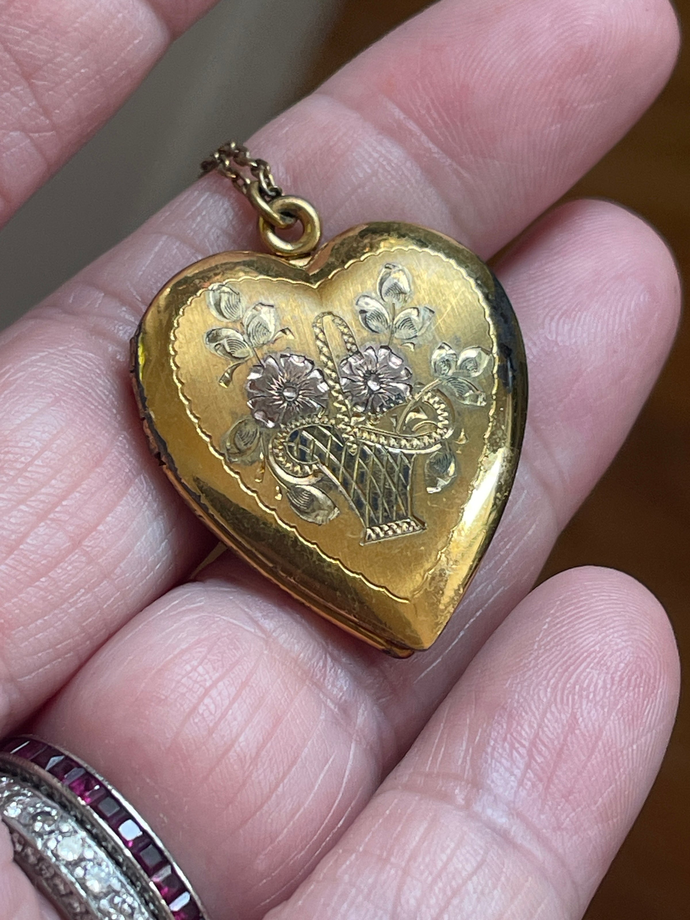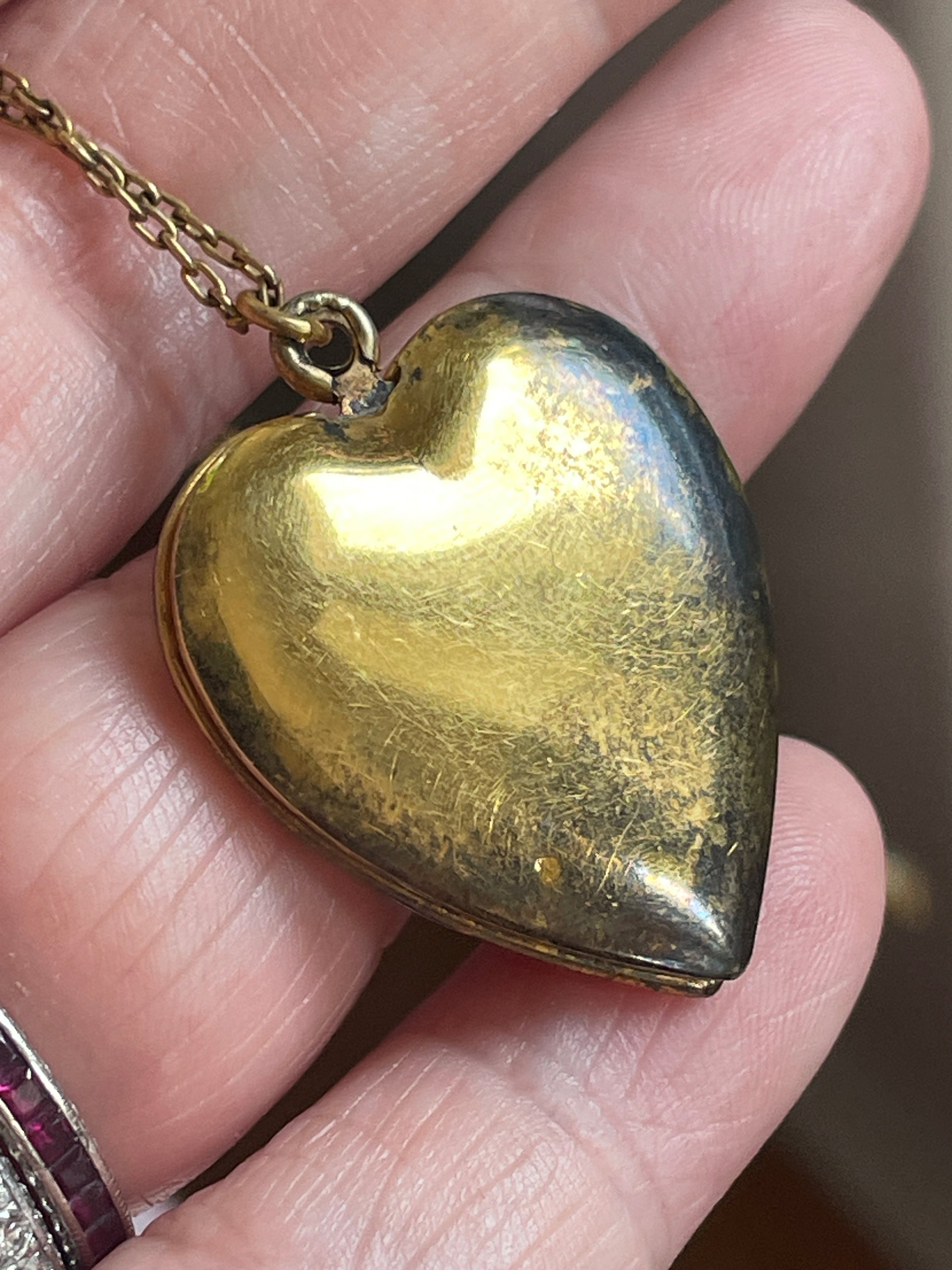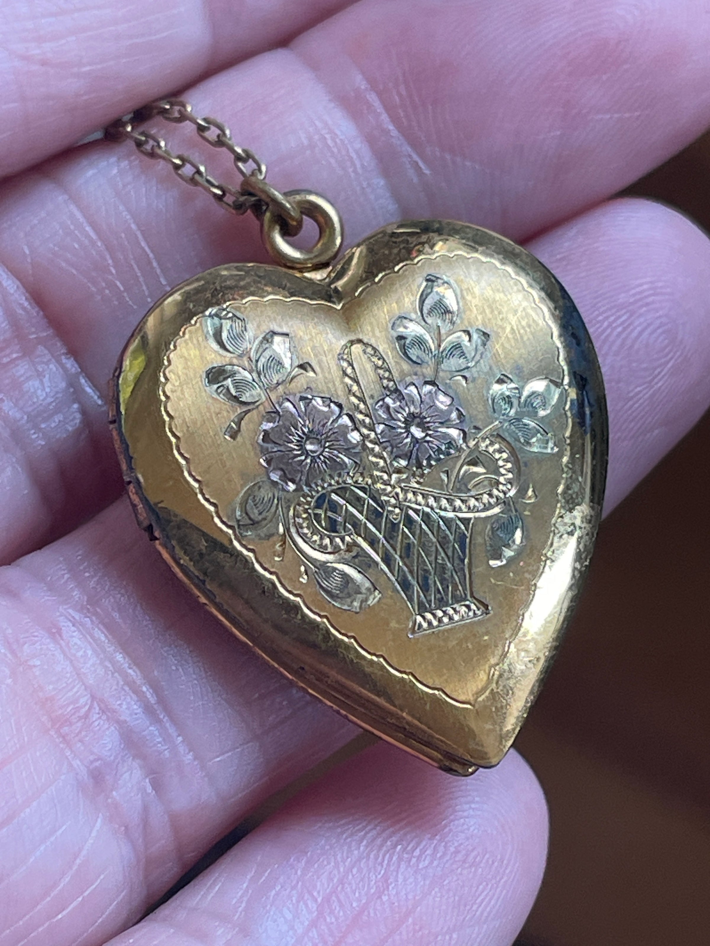 Gorgeous larger Heart locket with Rose gold floral bouquet. Leaves are a subtle shade of green gold. Locket measures 1.25 inches (with loop) x just under 1 inch. Some tarnish on one side and back and inside. This locket is gold over sterling so may be silver coming through. Both frames present no acetate. Stamped inside 1/20 10k over Sterling. Come on 17 inch chain. Locket closes but does not stay closed well. Priced accordingly. Jeweler can likely easily repair by adjusting latch.