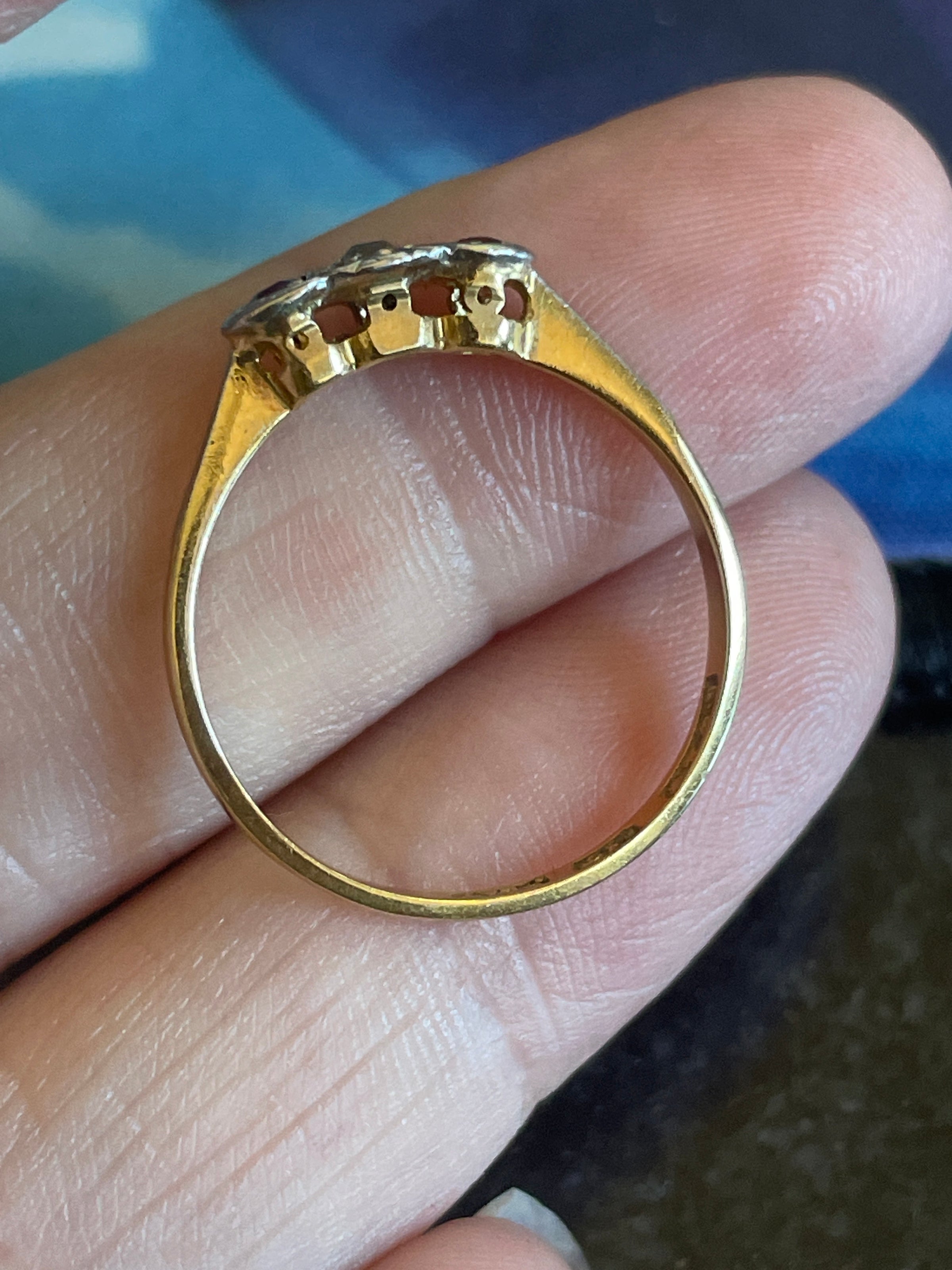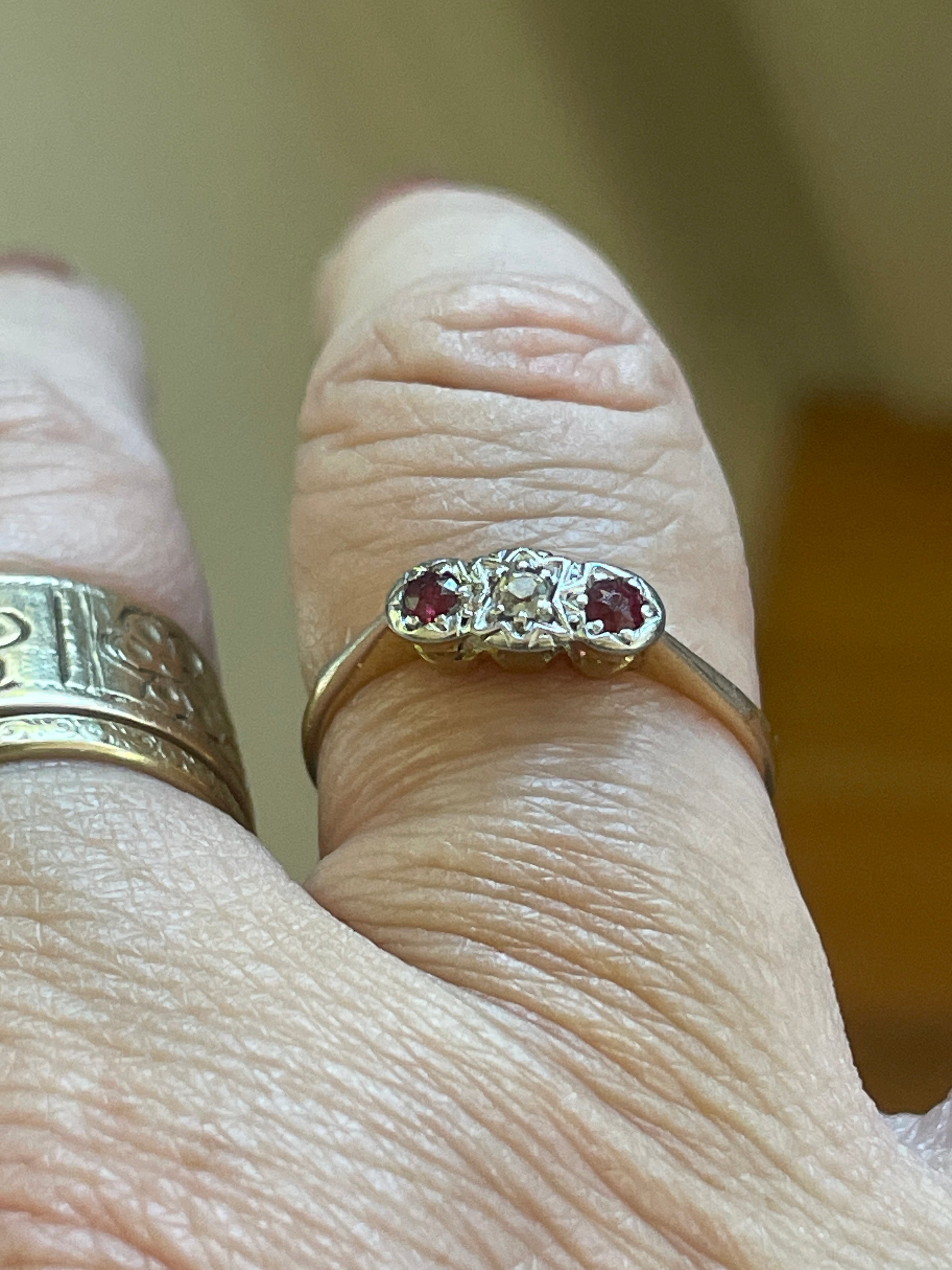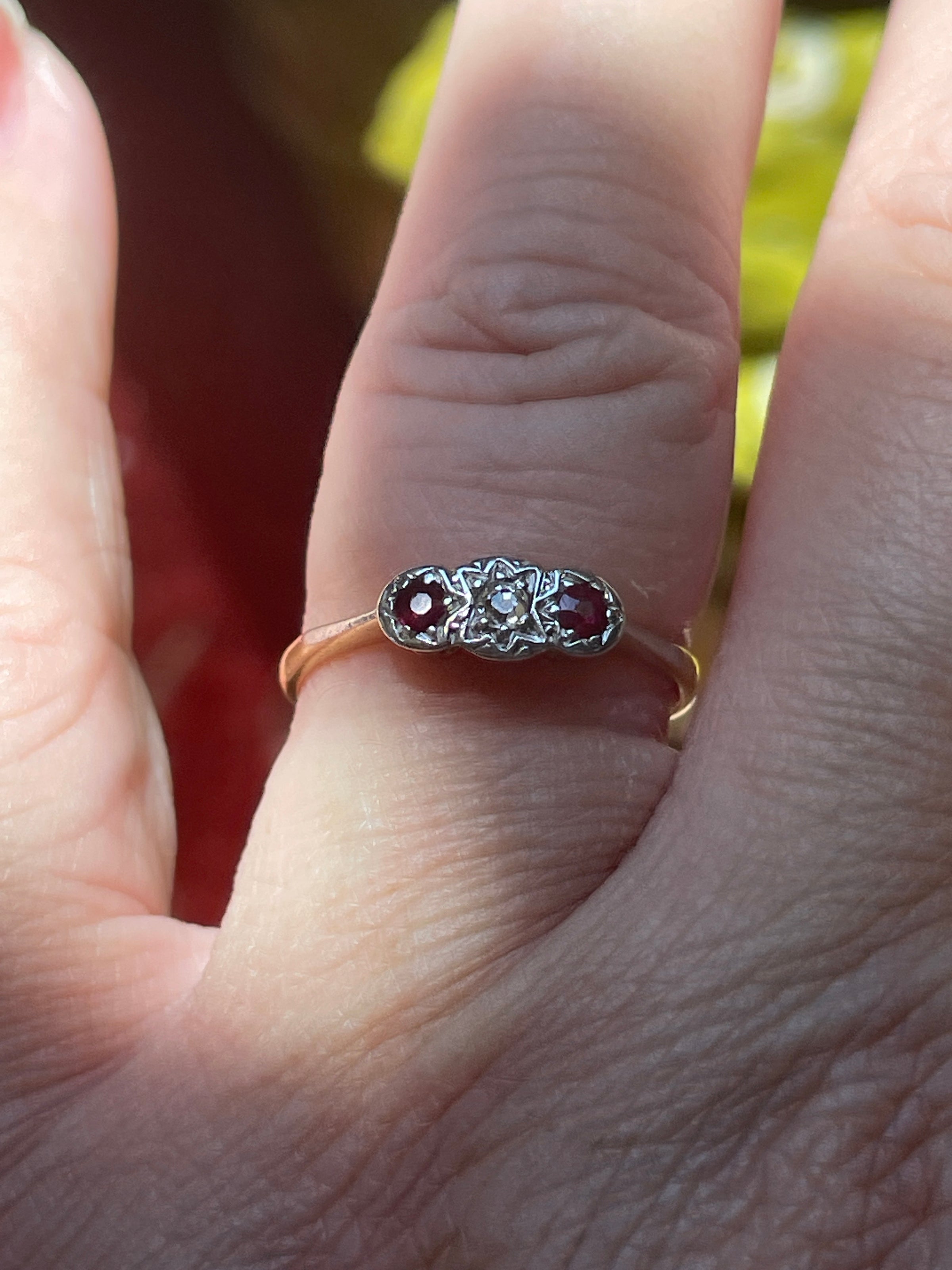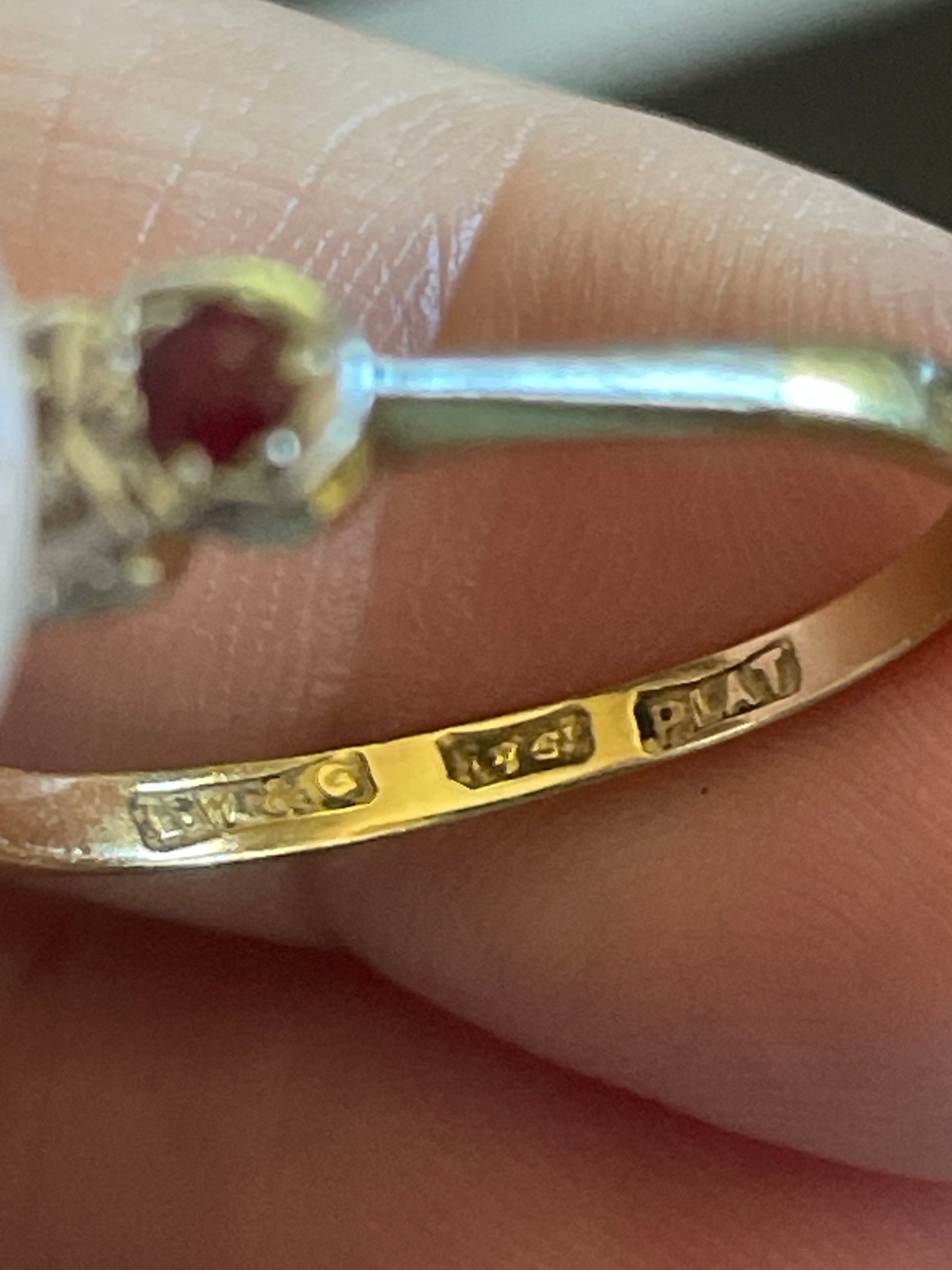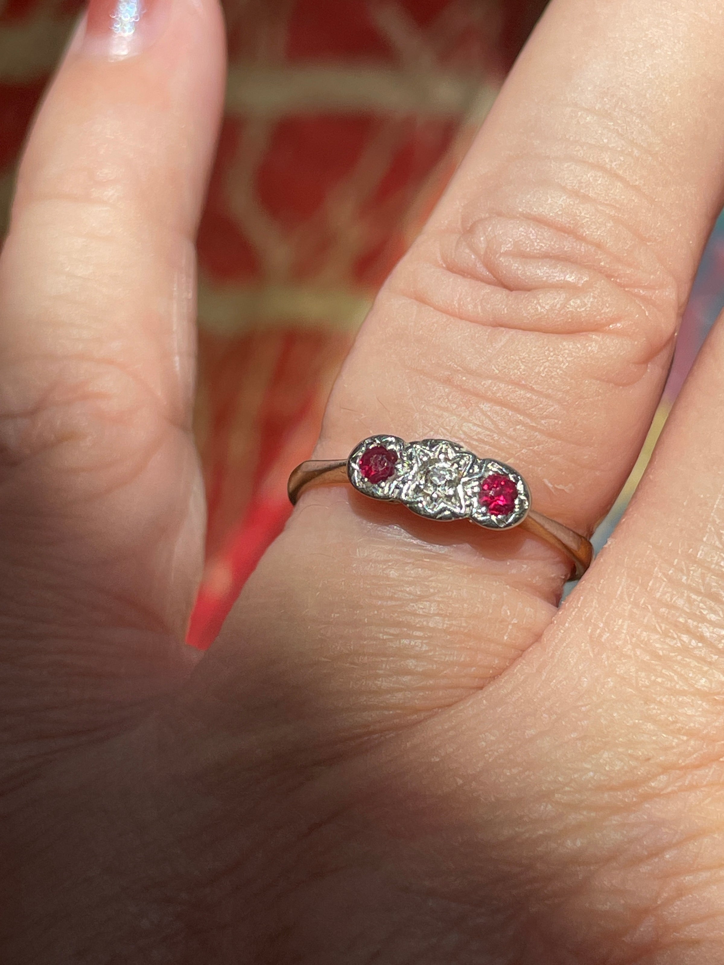Beautiful vintage Ruby and Diamond ring in 18k gold and platinum. Stones are approx 2mm each. Ring size = 7.25. Ring is a bit thinner at back but comfortable to wear. Stamped “LWG” and also “18c” and “plat”.