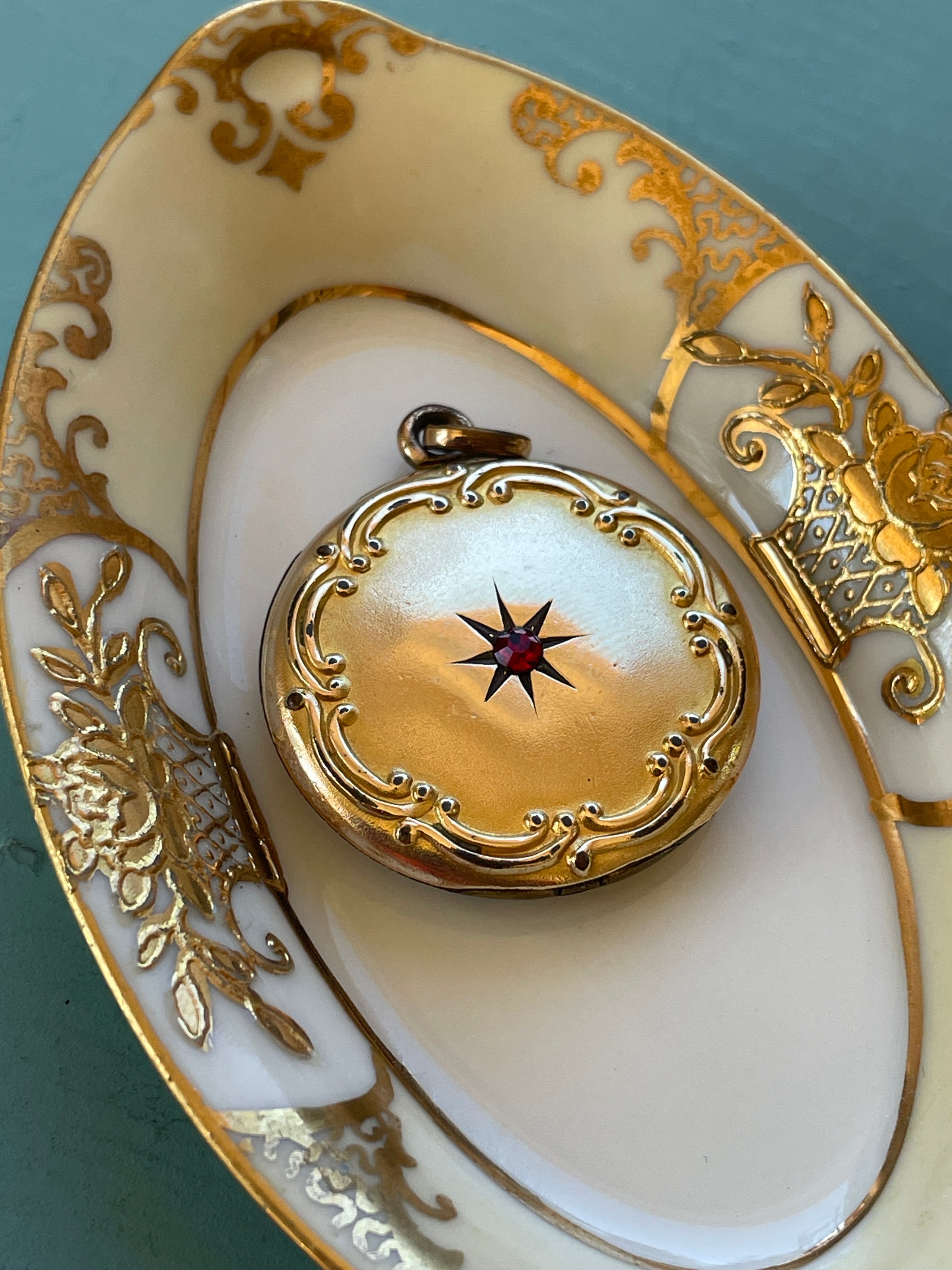 Ruby Paste Star Locket - Ornate Edges - Gold Filled - Antique
