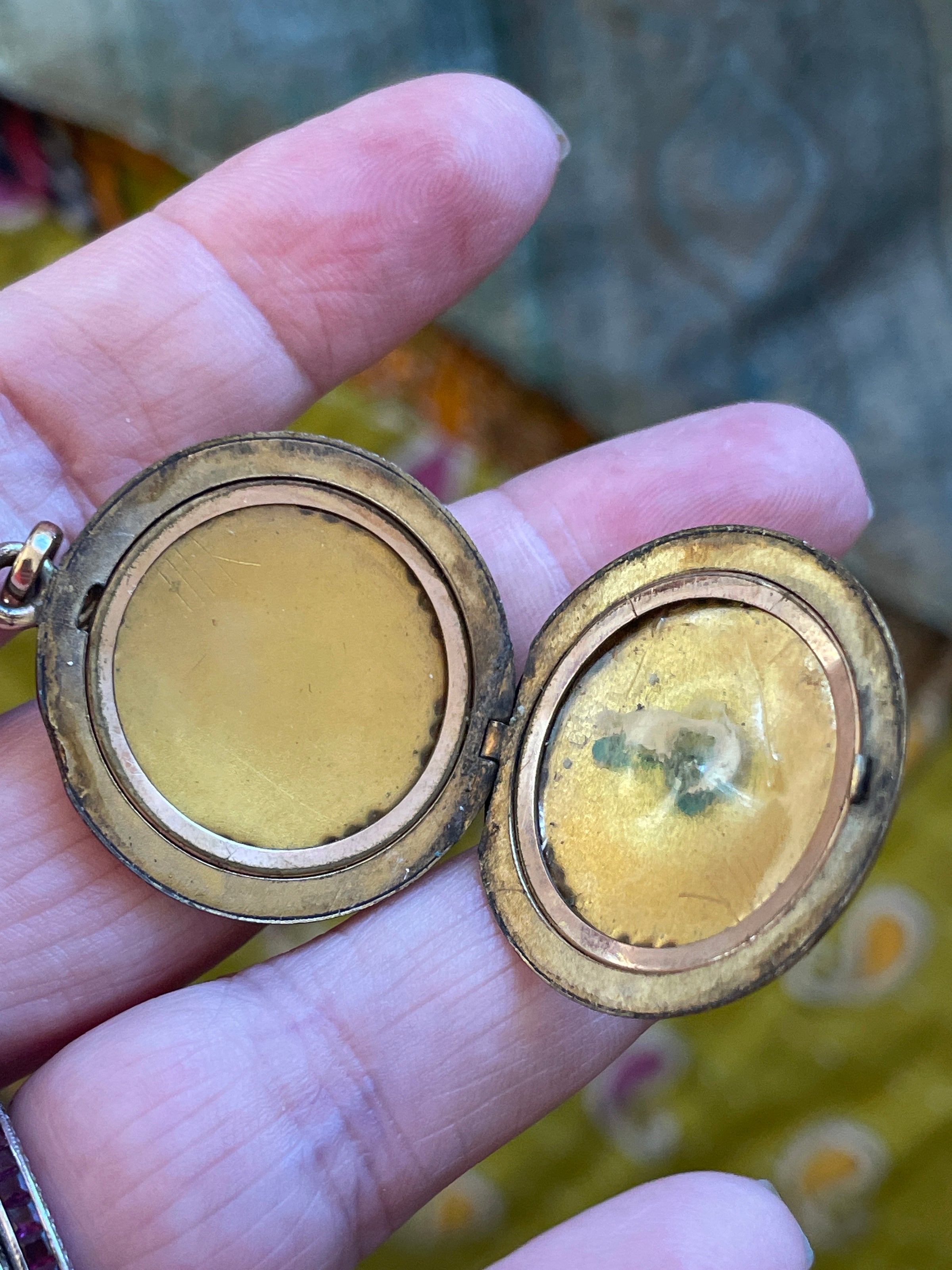Stunning Ruby paste locket with star cut center.  Measures just over 1.25 inches x 1 inch.  Two frames and acetate present.  Inside has some wear.  Front and back have ornate edging.  No markings but likely gold filled.  Circa early 1900s.