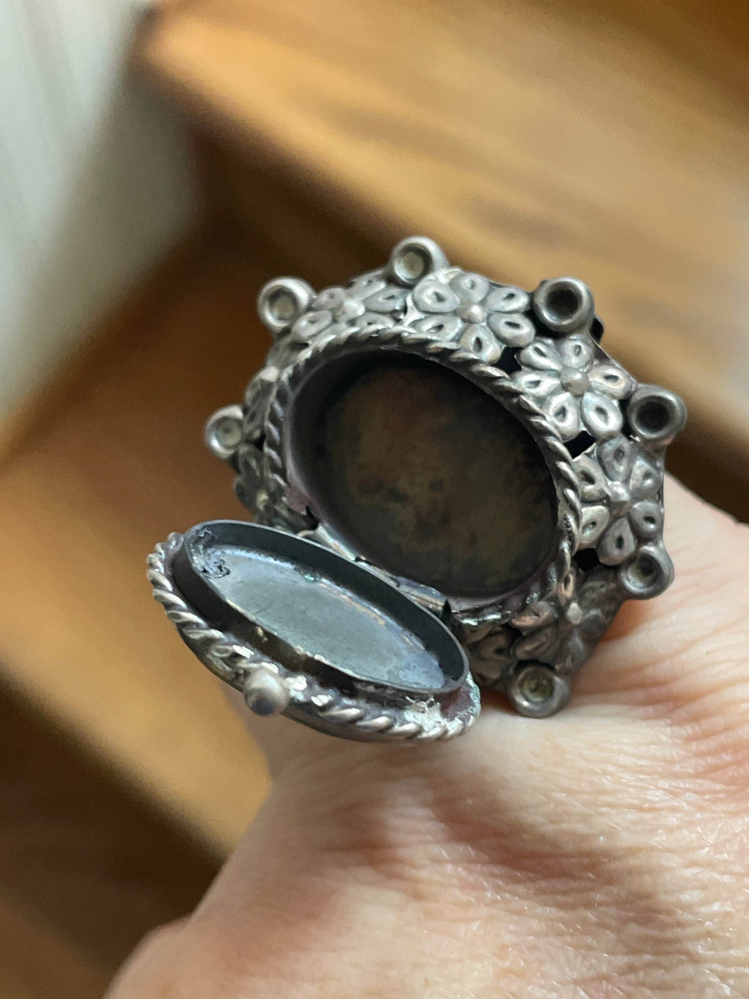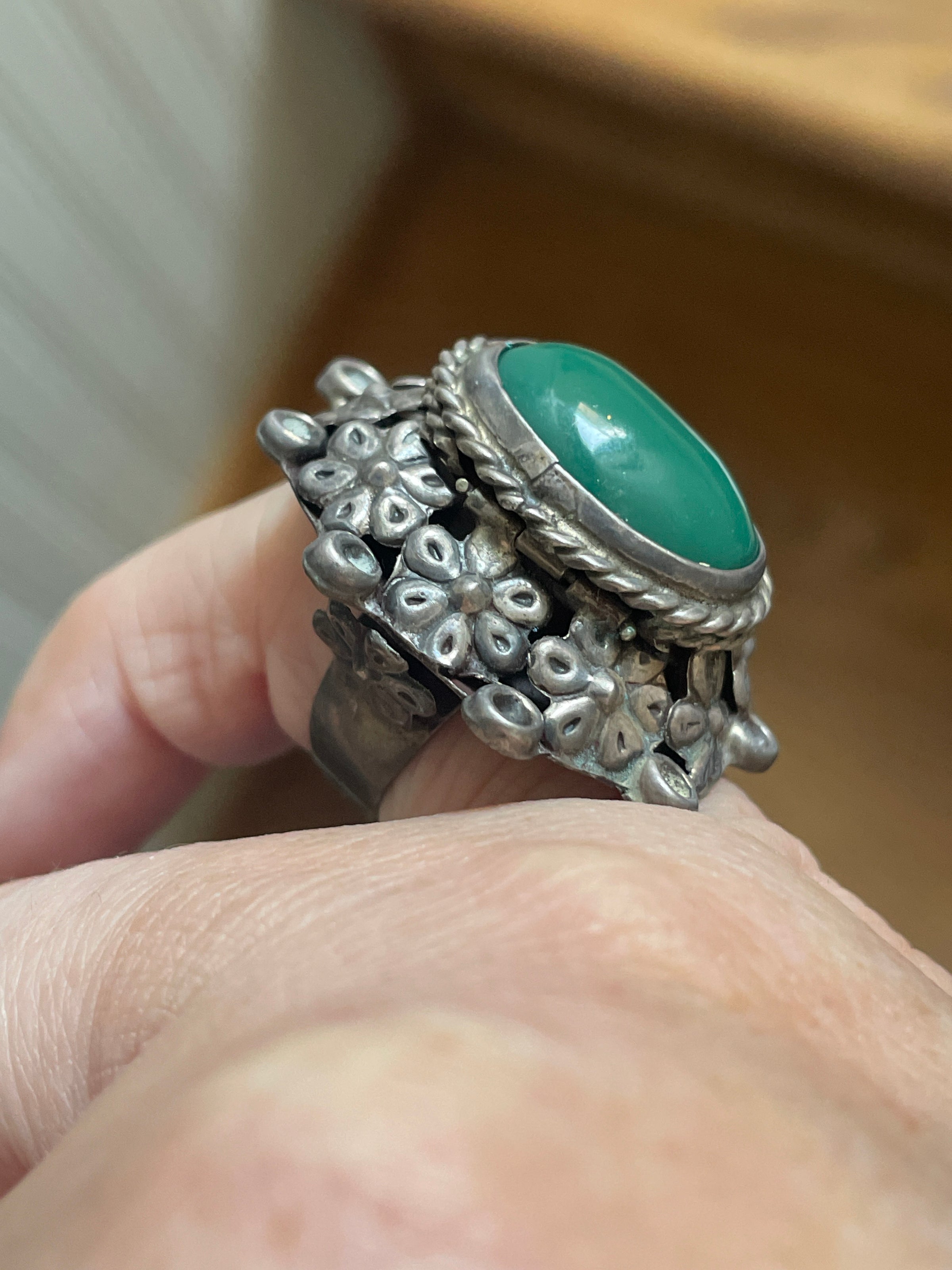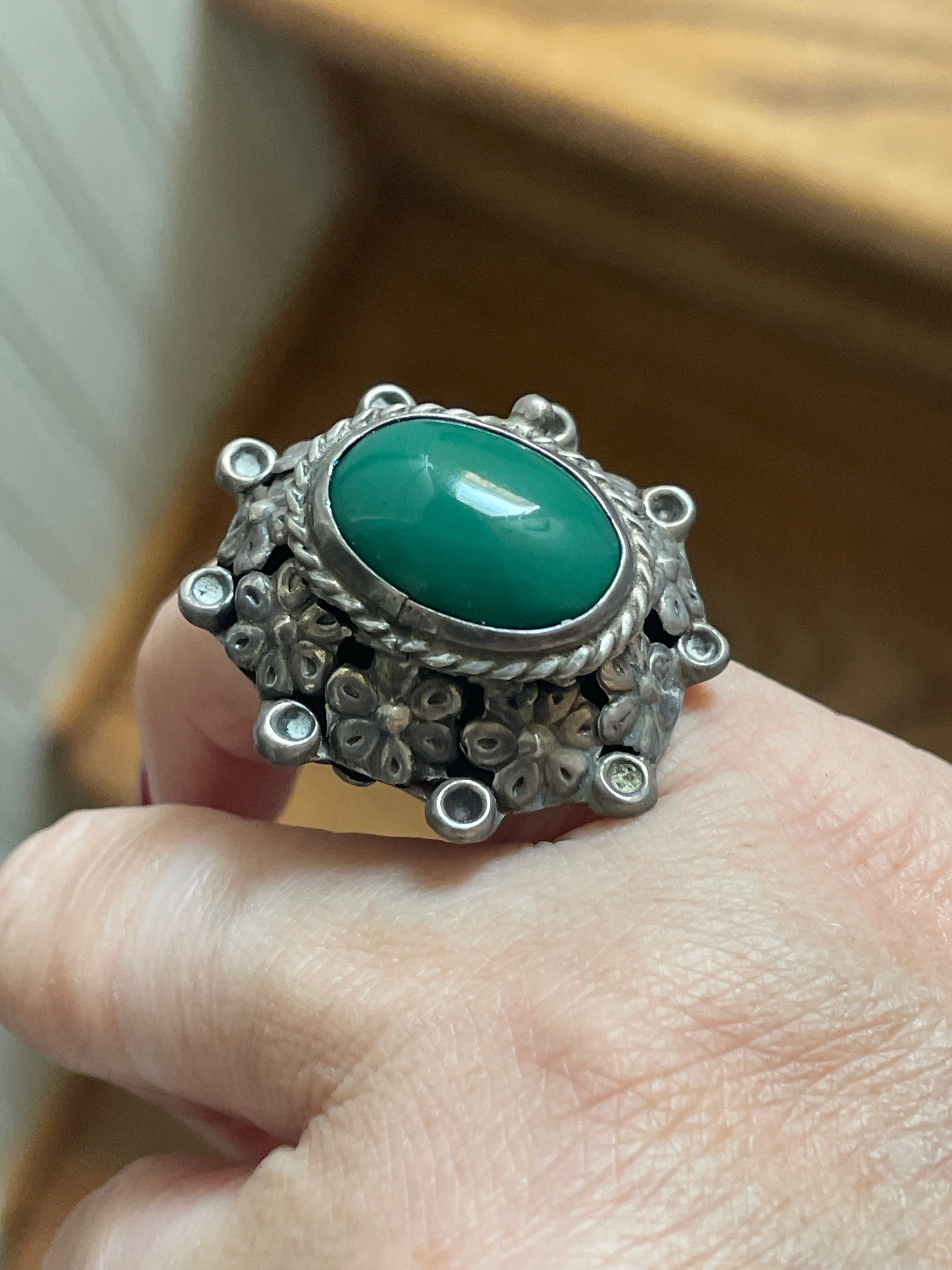 Statements vintage Turquoise floral ring with secret hidden compartment below stone. Beautiful floral details. Stamped for Mexico and sterling. Currently size = 5.25 but is adjustable within reason.
