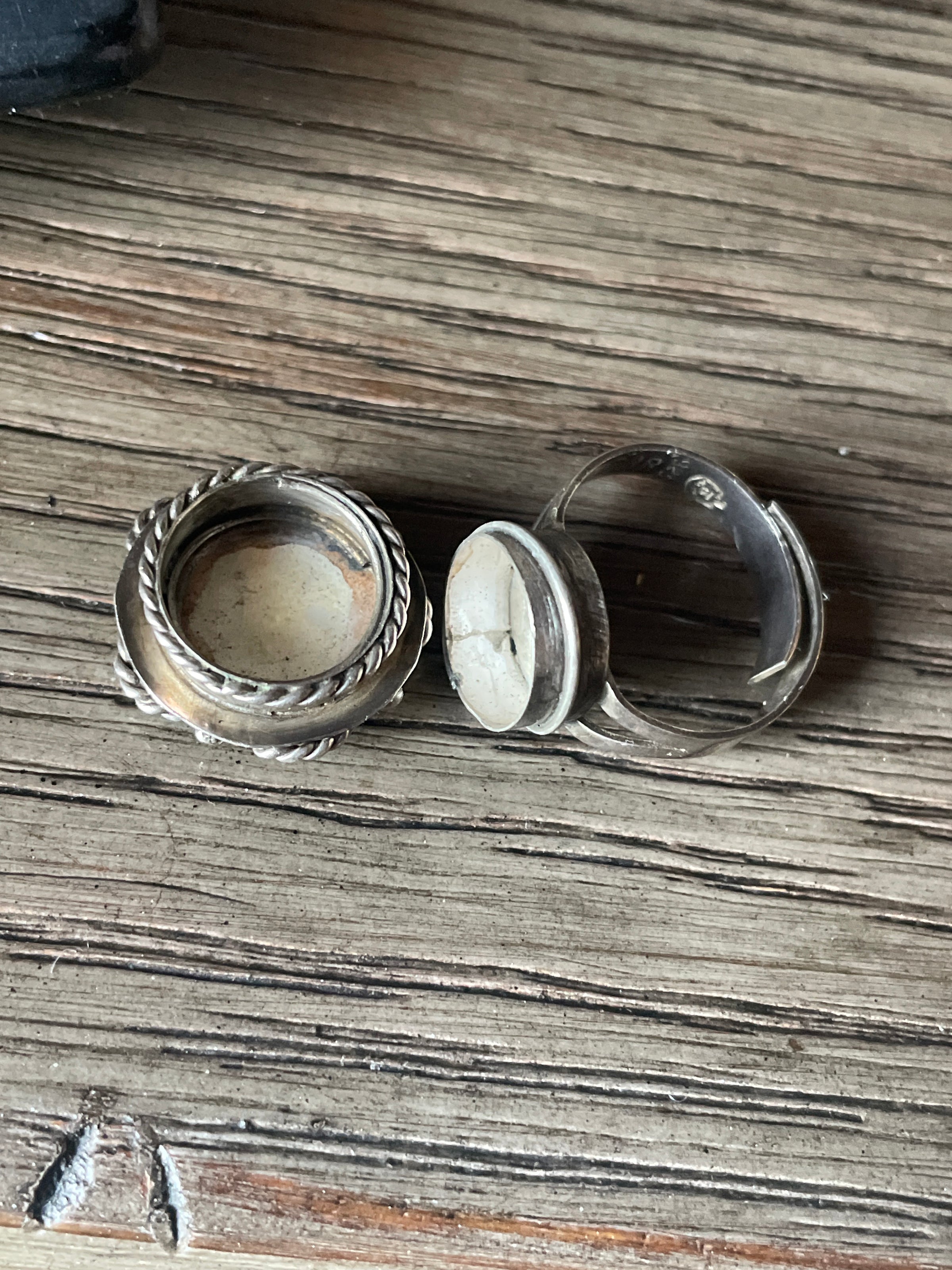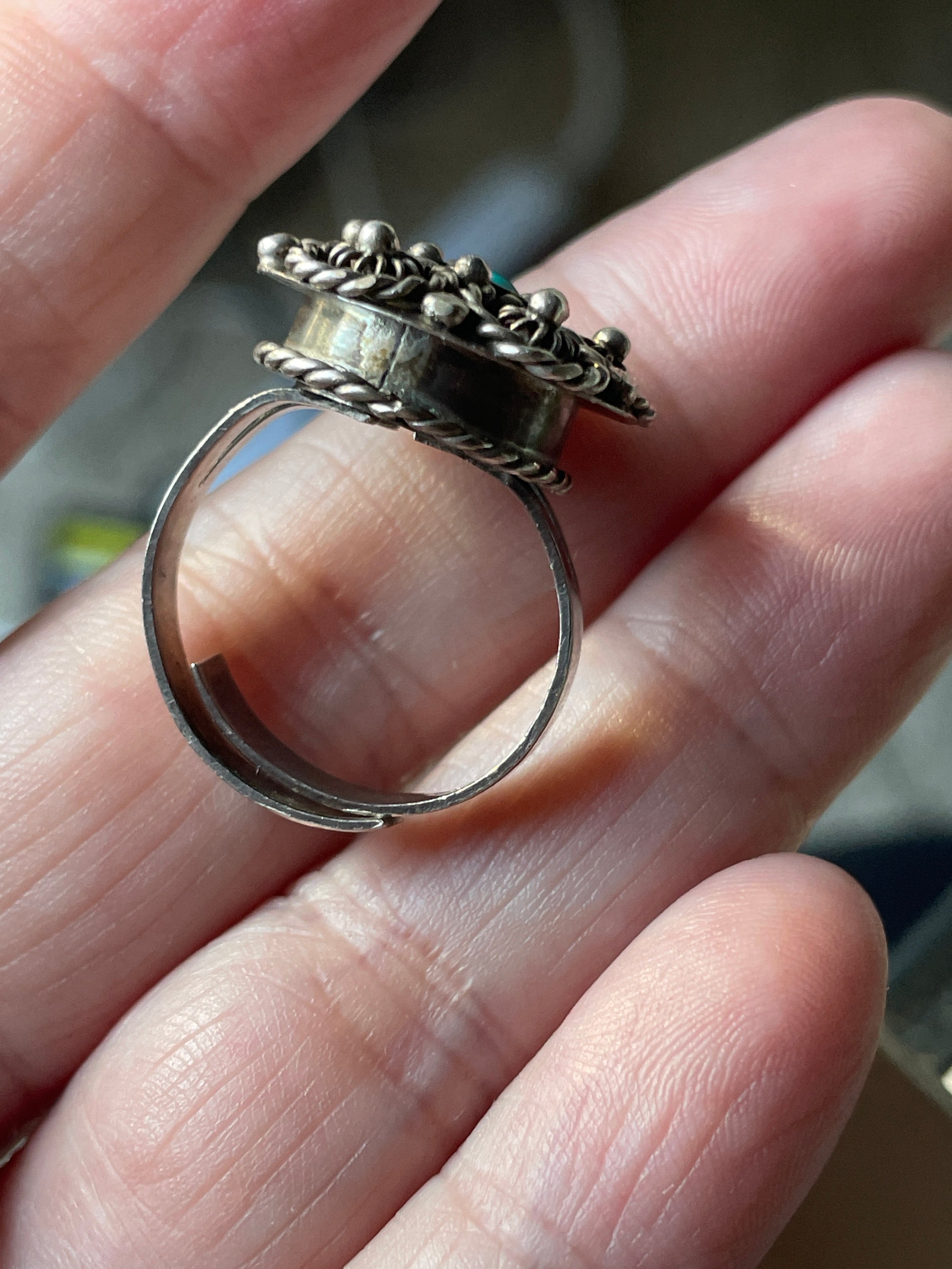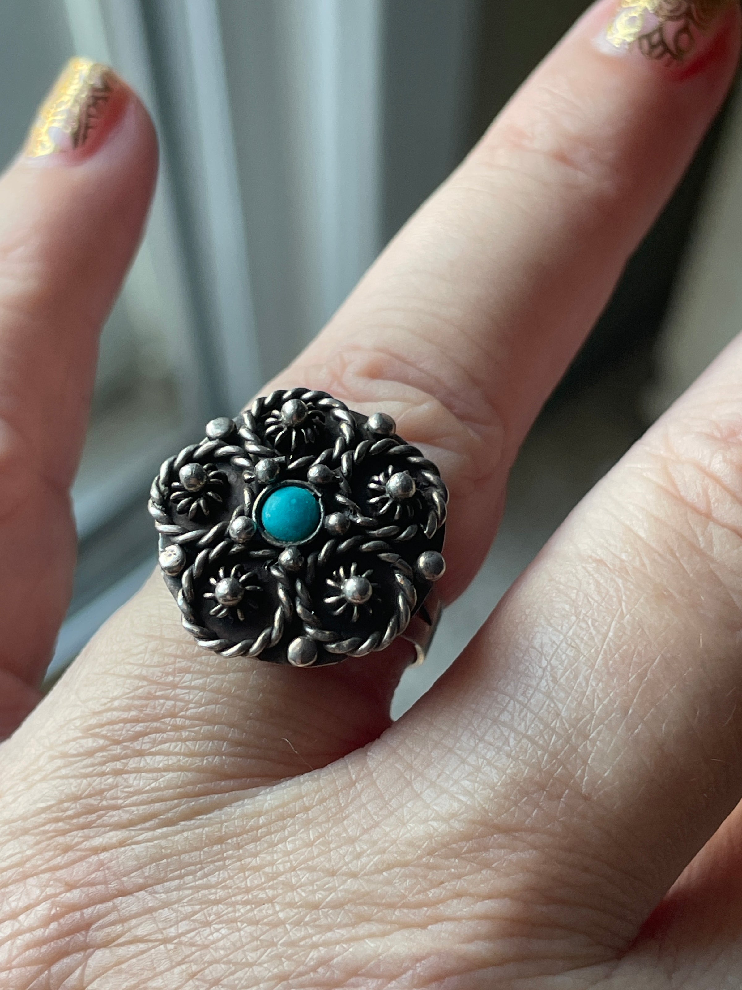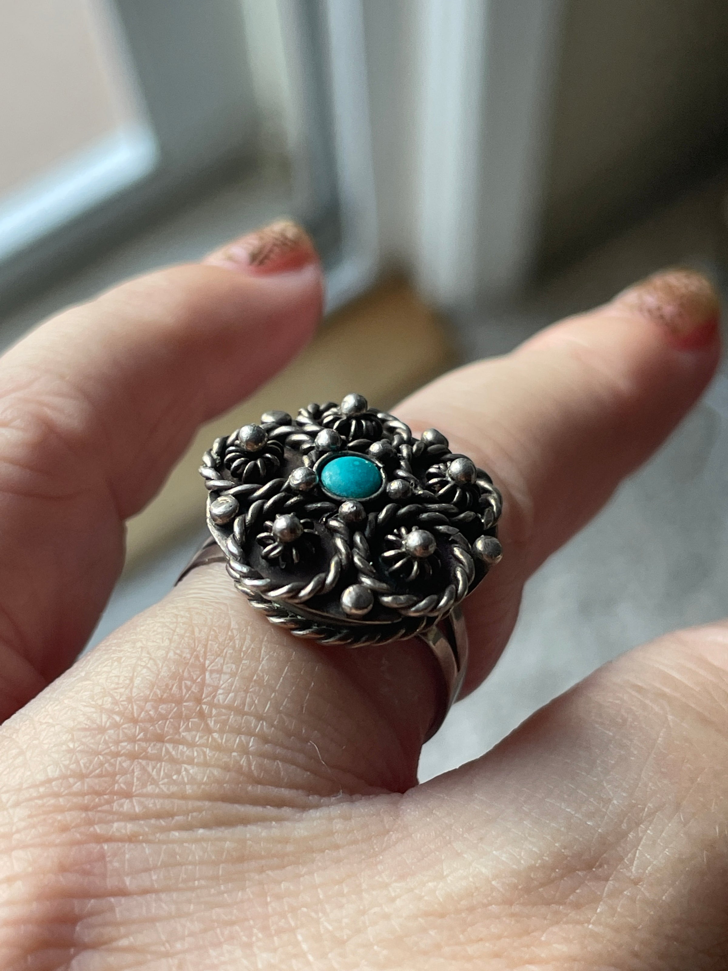 Ornate unique Turquoise ring with secret compartment. Top screws off. Band is adjustable currently size = 6. Stamped 925 for sterling.