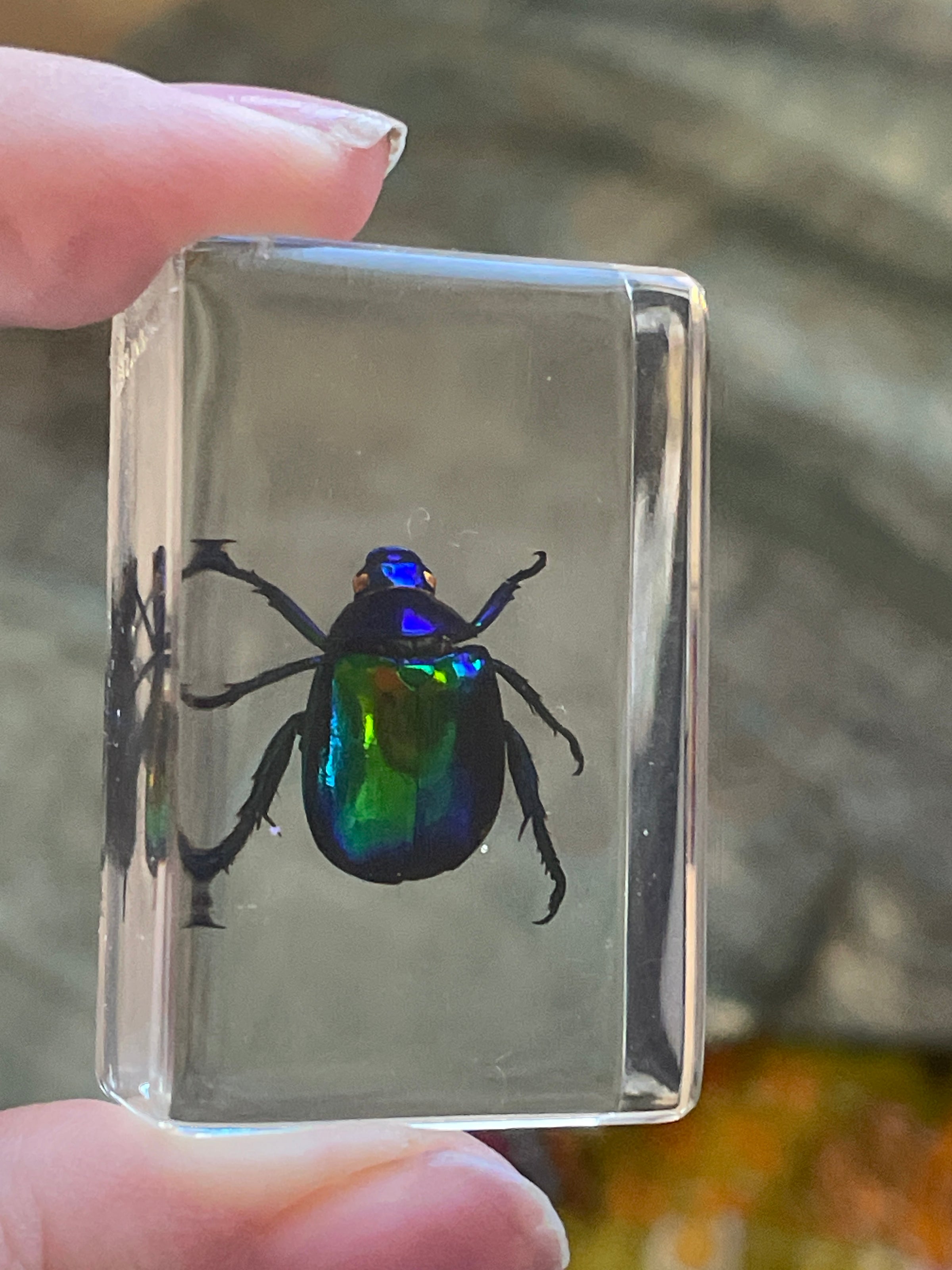 Fabulous real shimmery beetle encased in Acrylic block. Block measures just under 1.75 inches x 1.25 inches.