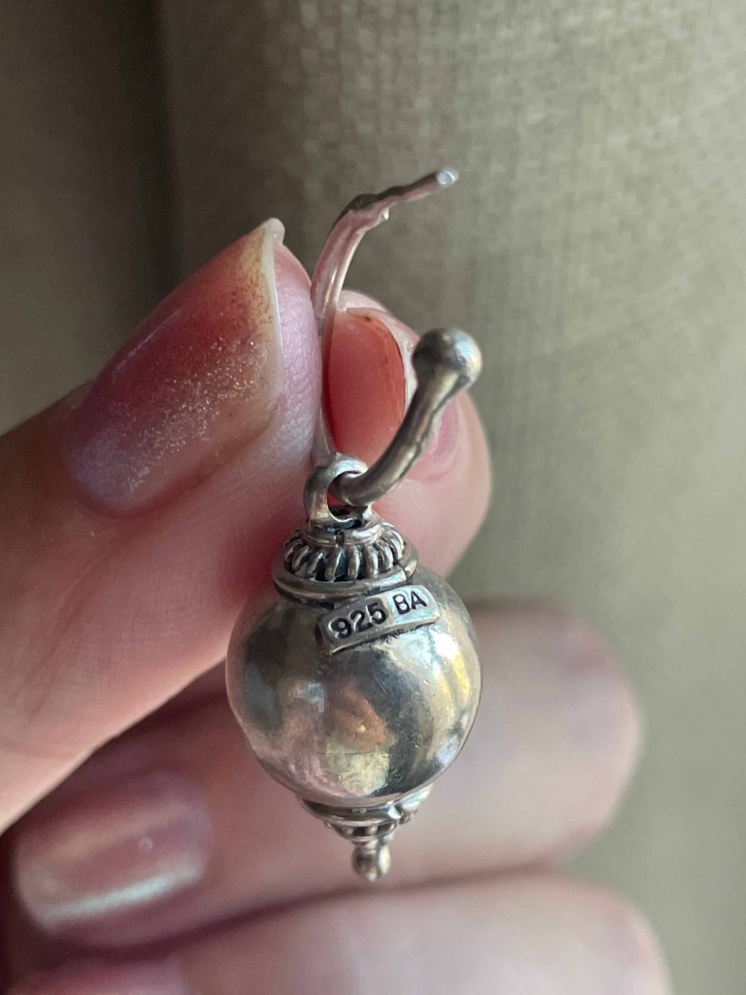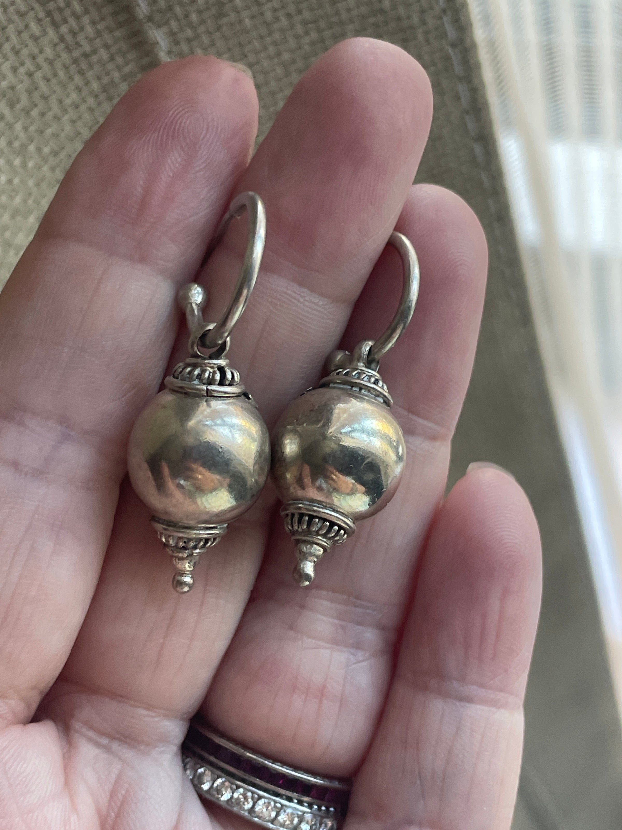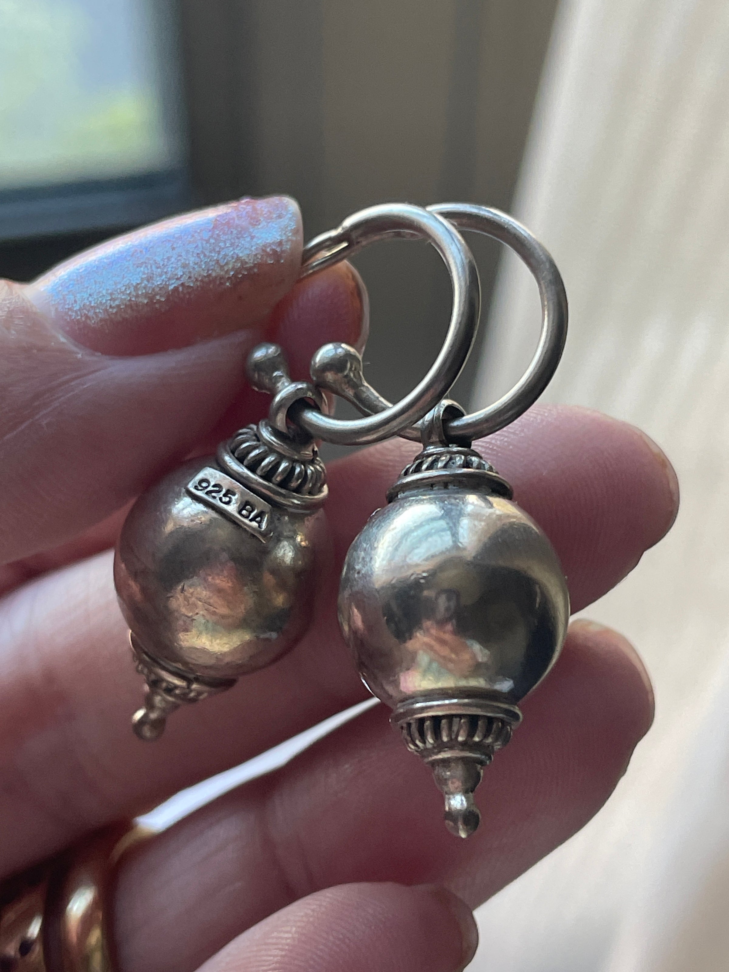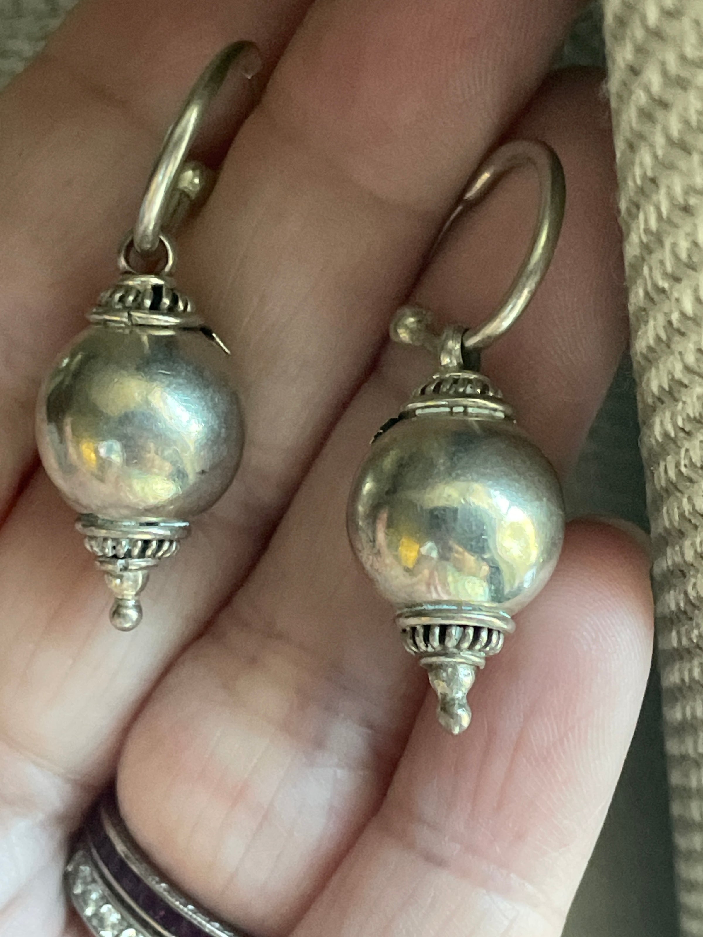 Fabulous silver drop earrings in sterling silver. These have hoops with ornate drops. Drops come off and are stamped “925”. These measure approx 1.25 inches. There are a few small dings but adds to the charming feel of these.