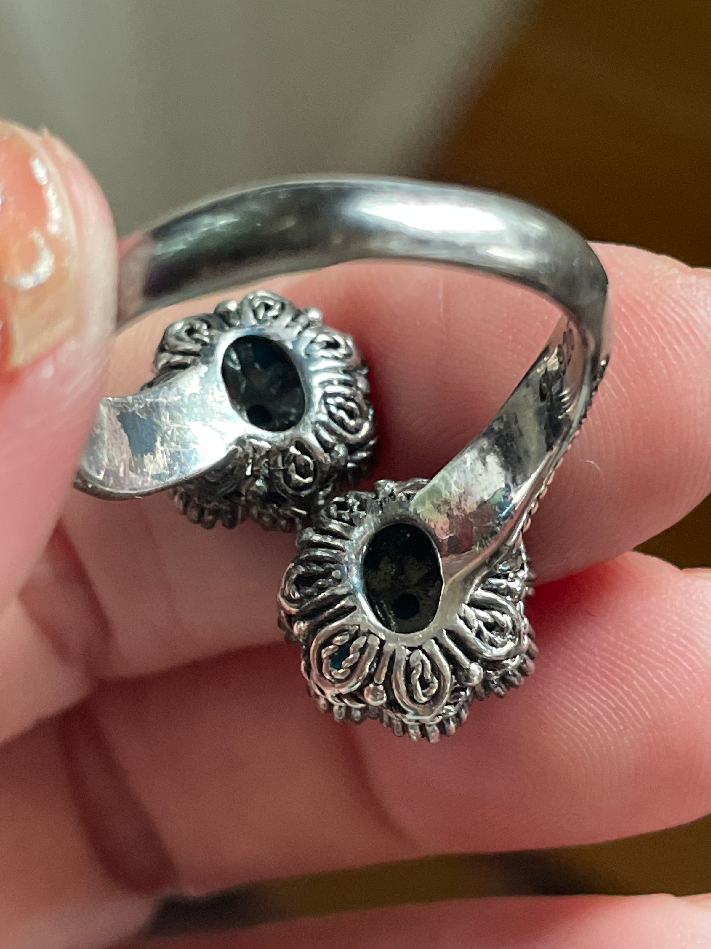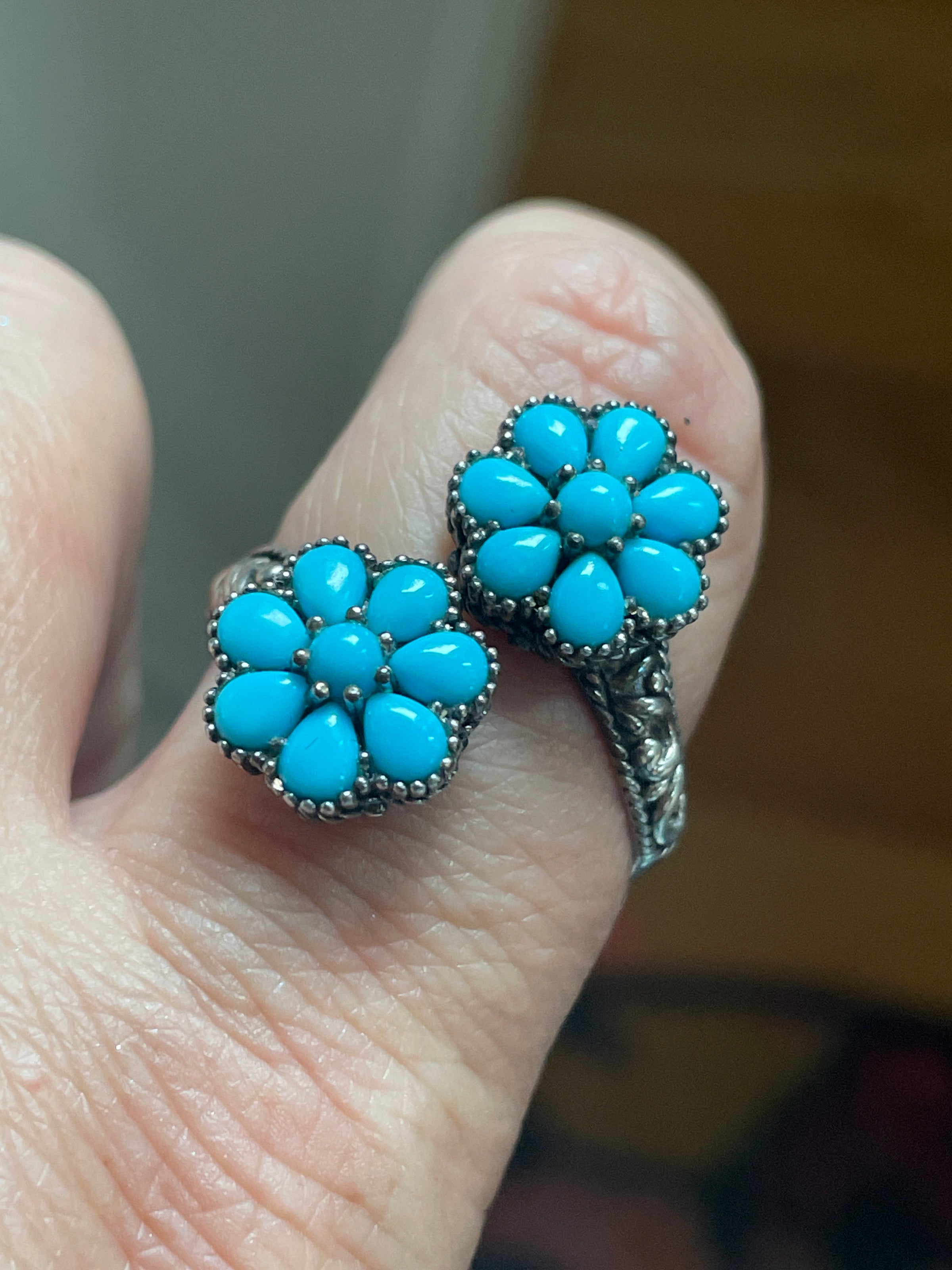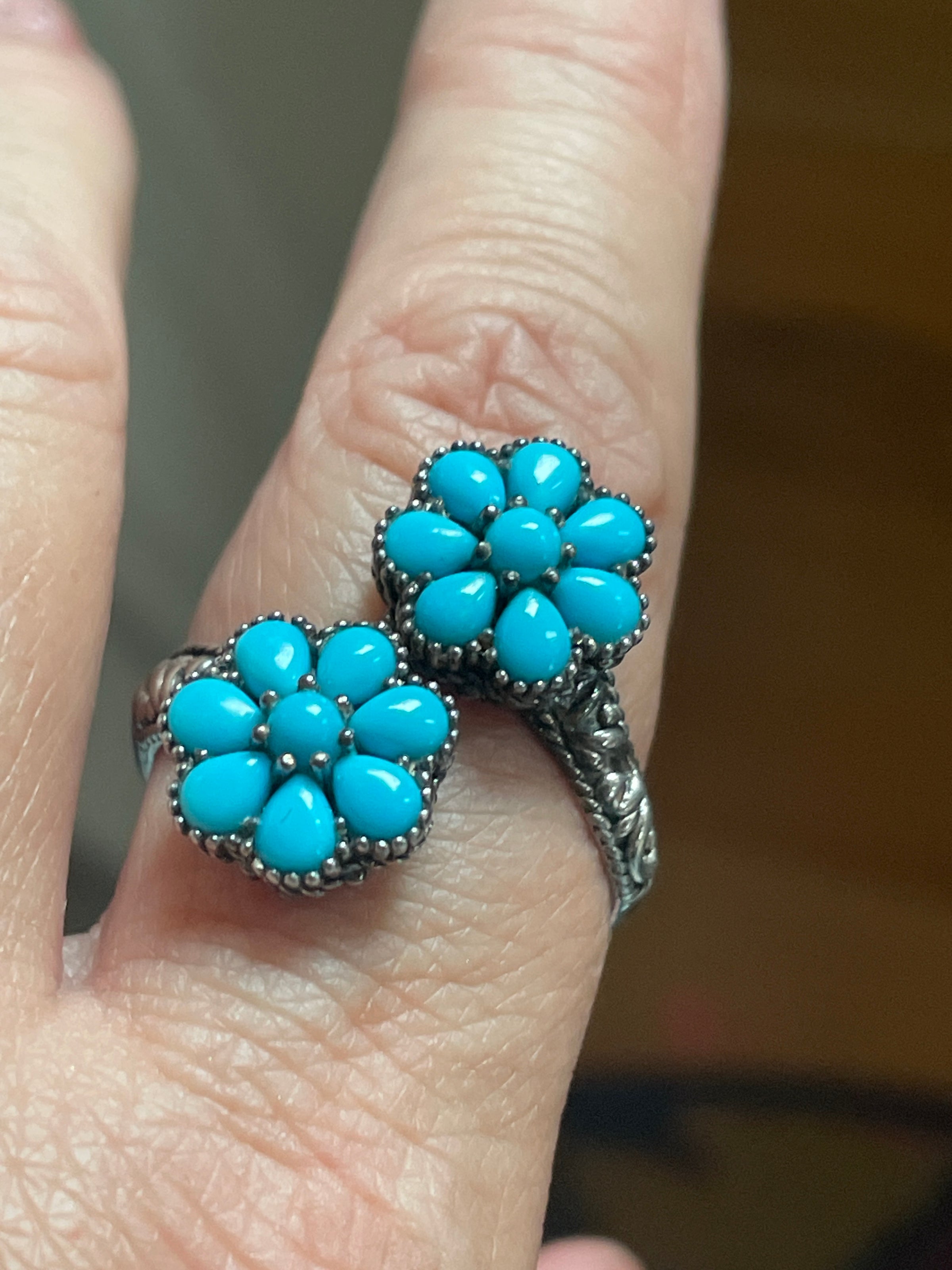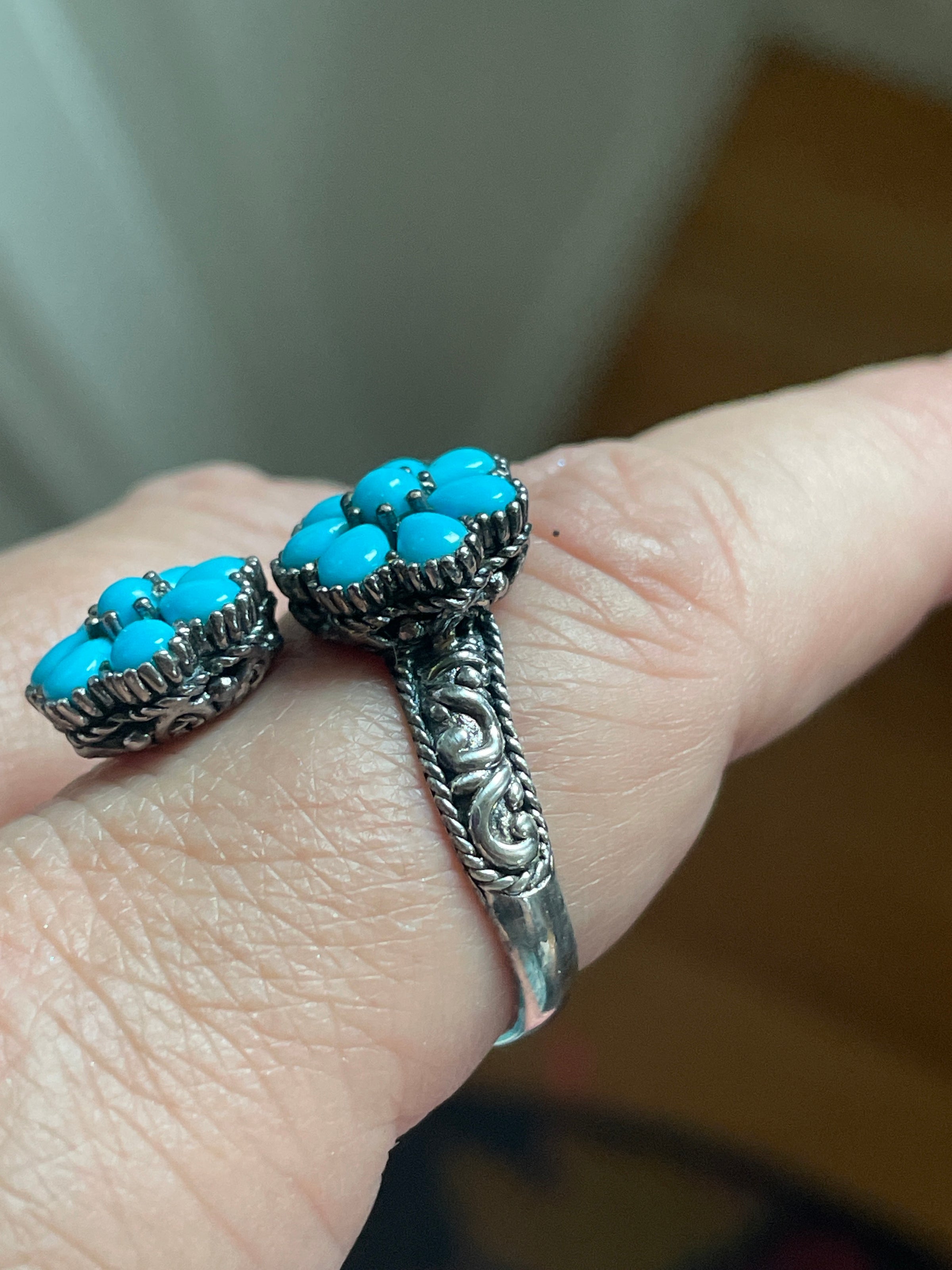 Gorgeous Turquoise flower ring with Sleeping Beauty Turquoise set in a bypass design with ornate shoulders. Stamped 925. Ring size = 10.