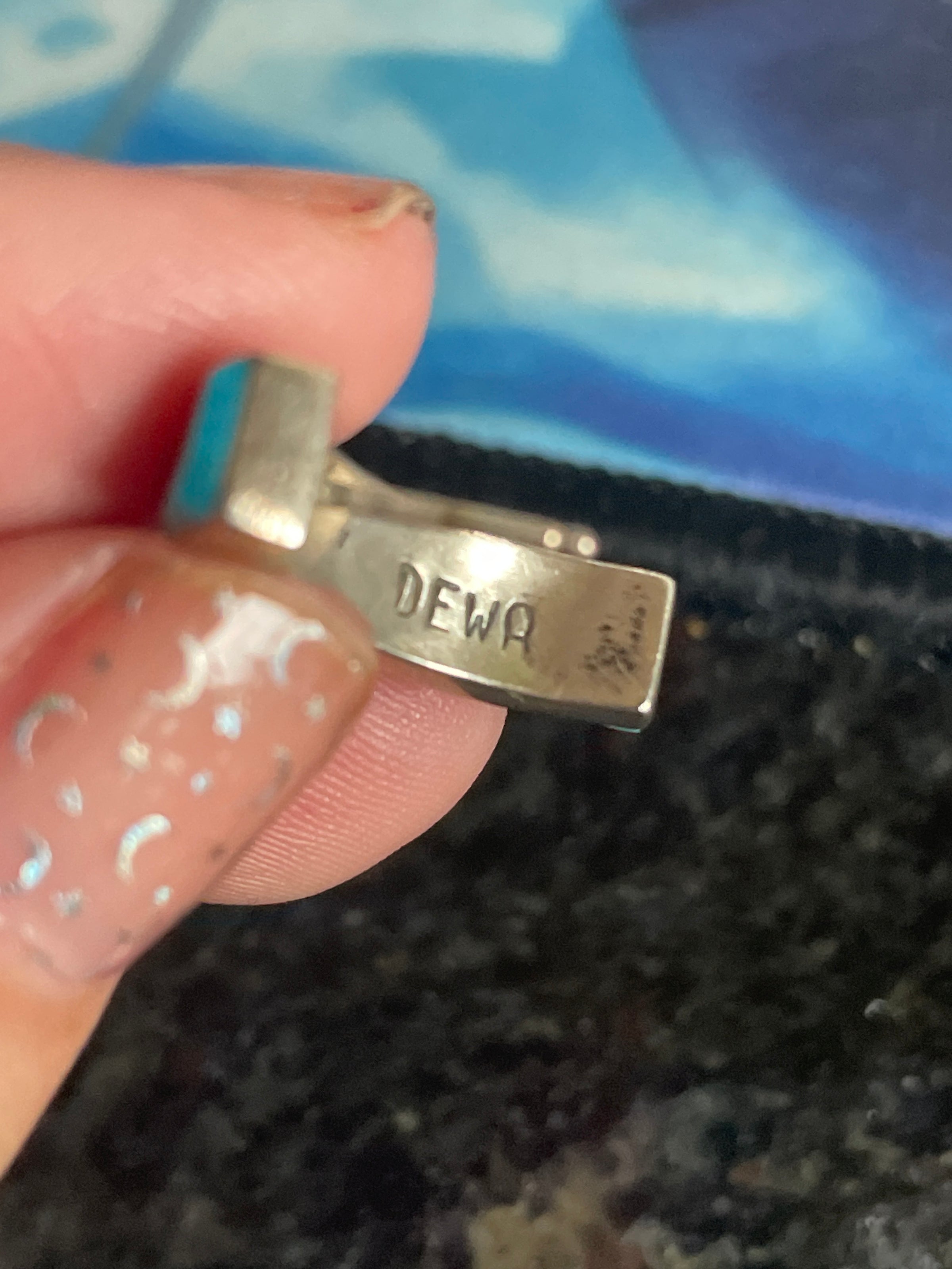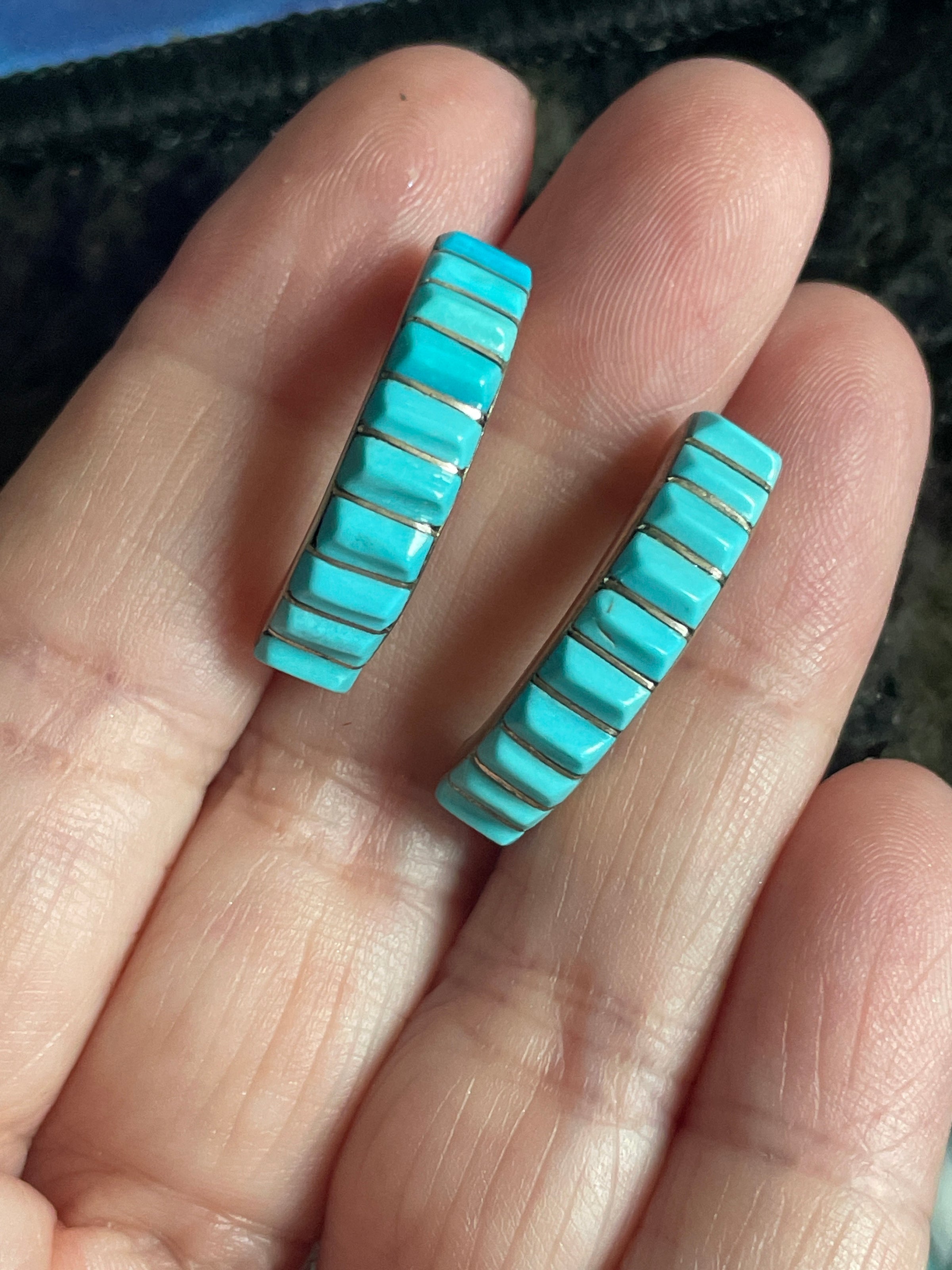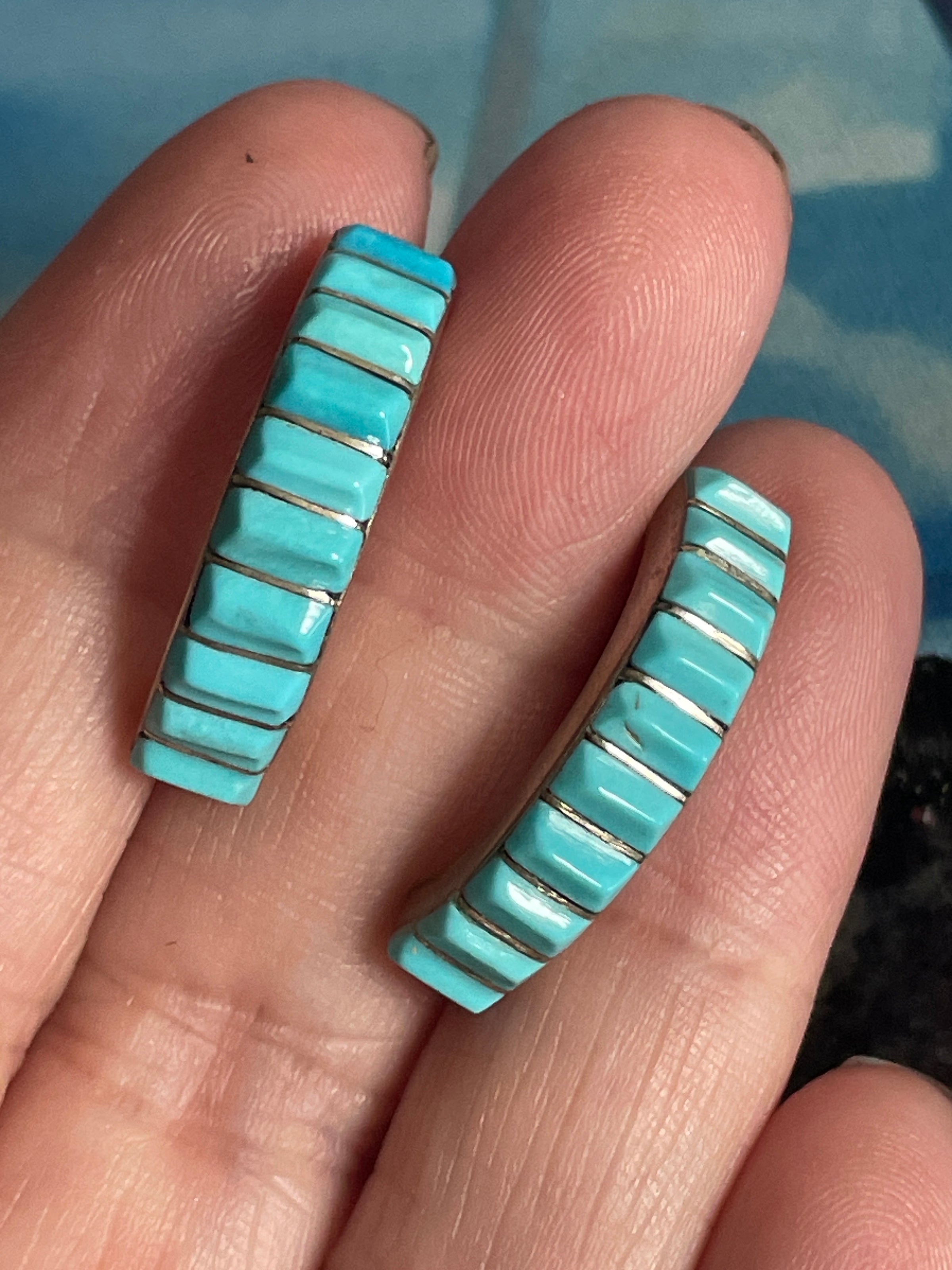 Fabulous Turquoise half hoop earrings in sterling silver. These measure just under 1 inch. Stamped “Dewa” which is the Native American maker on back. Unmarked as to silver content but tested sterling. Backs stamped 925 on backs.