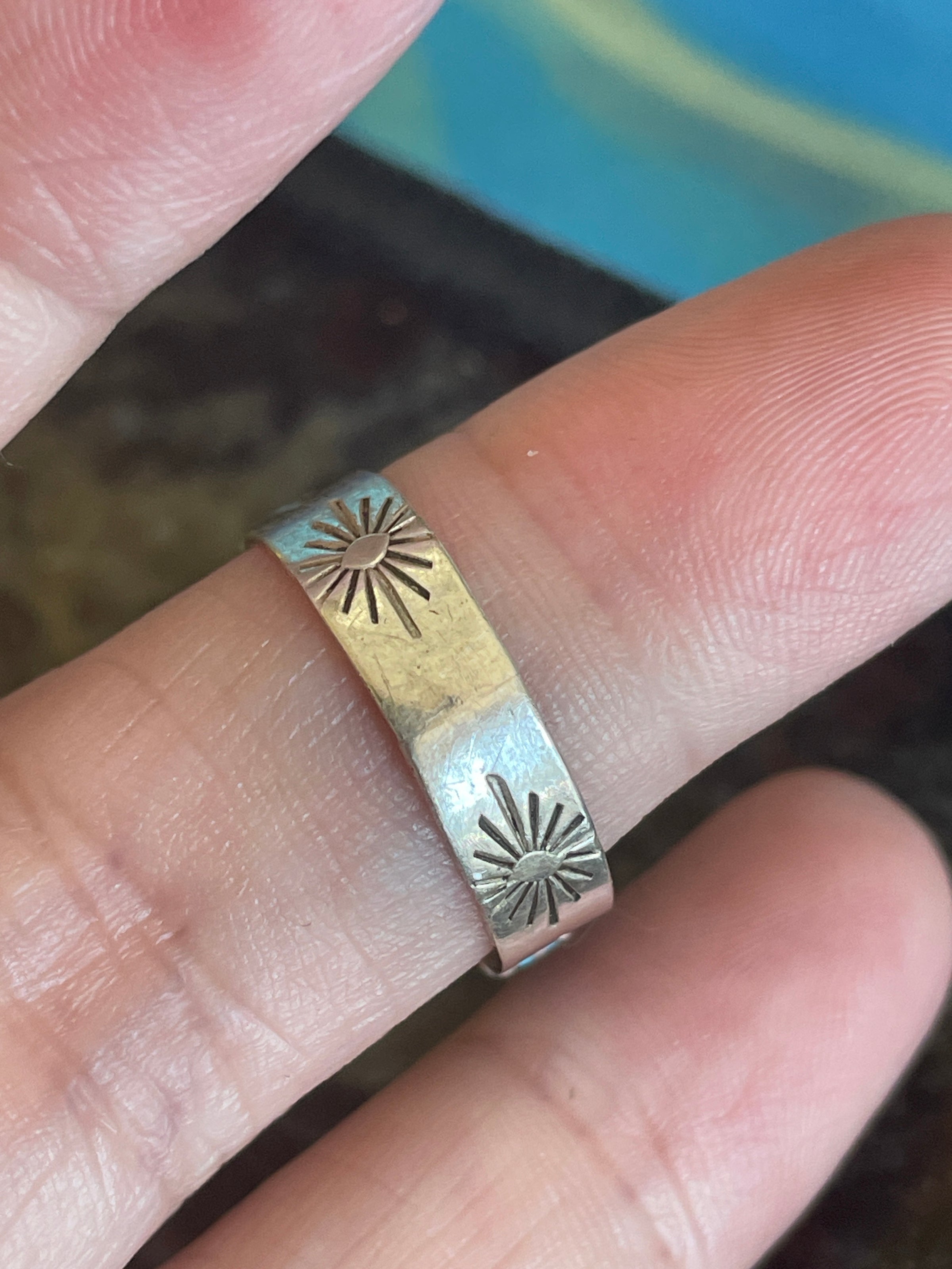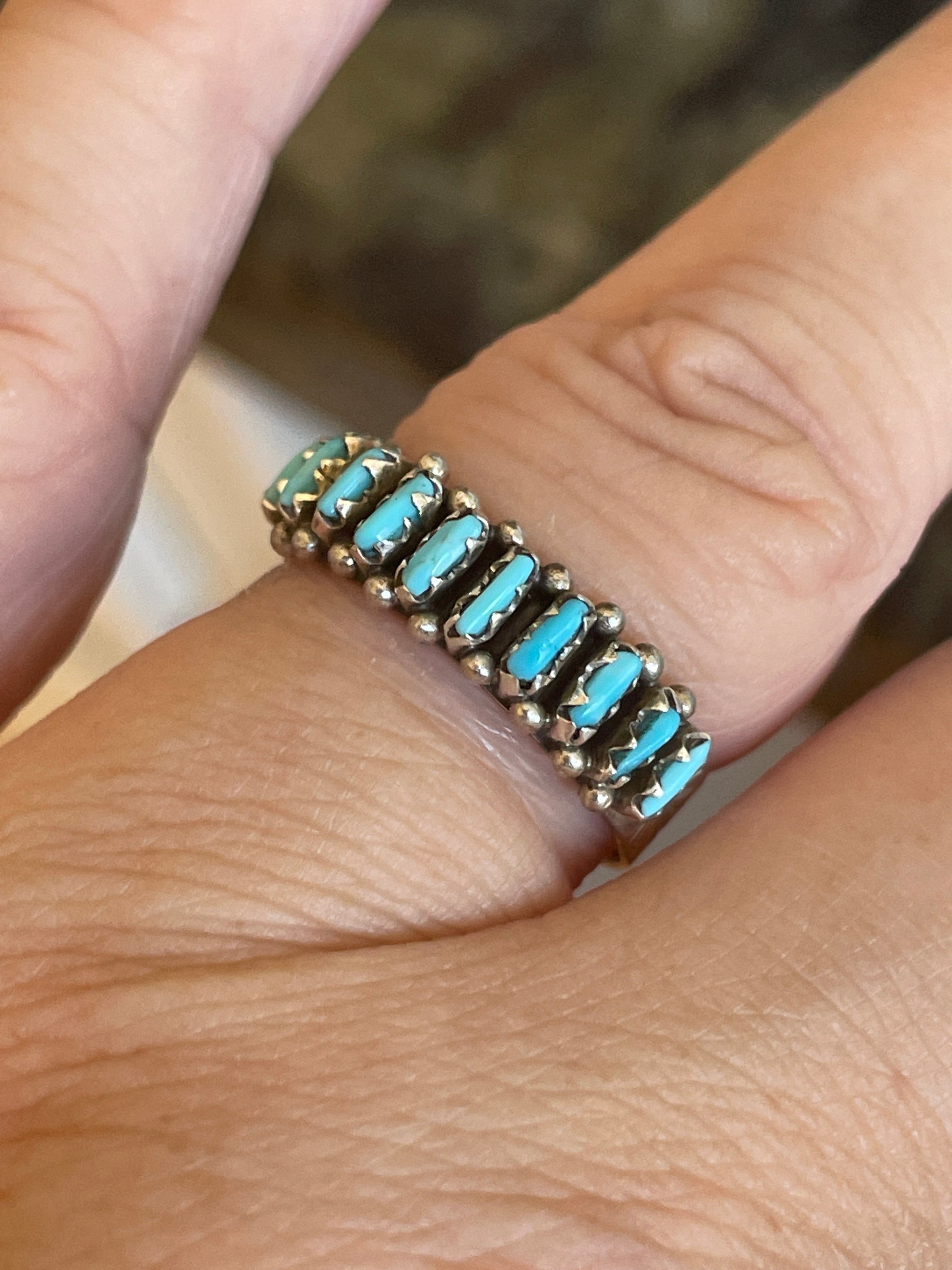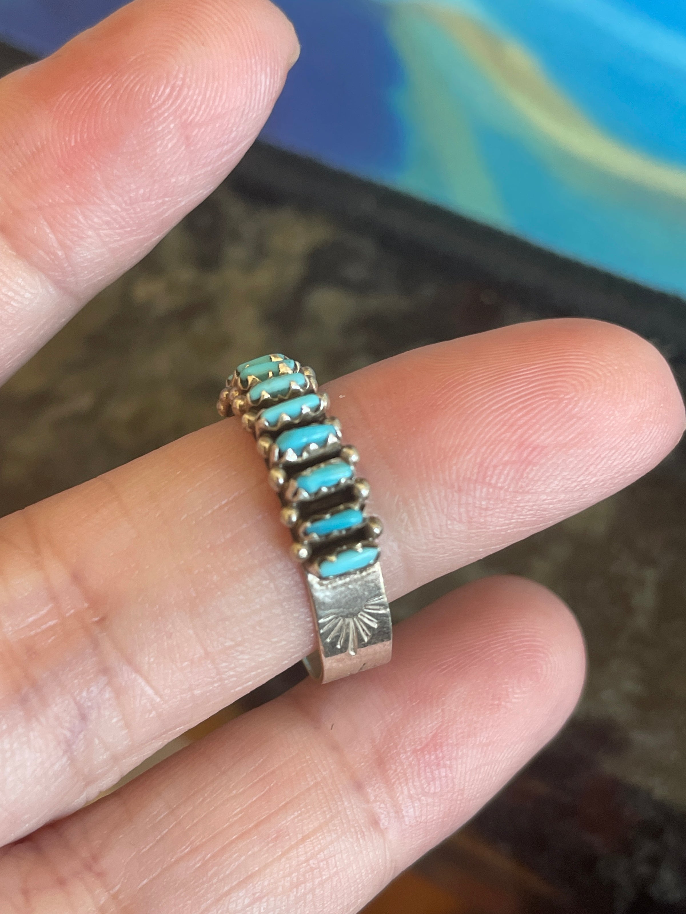Incredible vintage Turquoise petit point ring with sun pattern on band. Ring size = 7.25. Stamped “OURM” and “Sterling”. Lightweight and comfortable for daily wear.