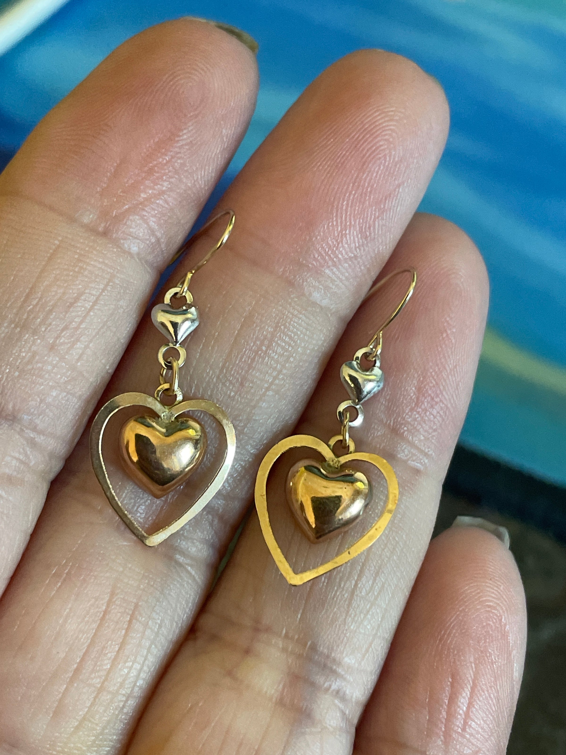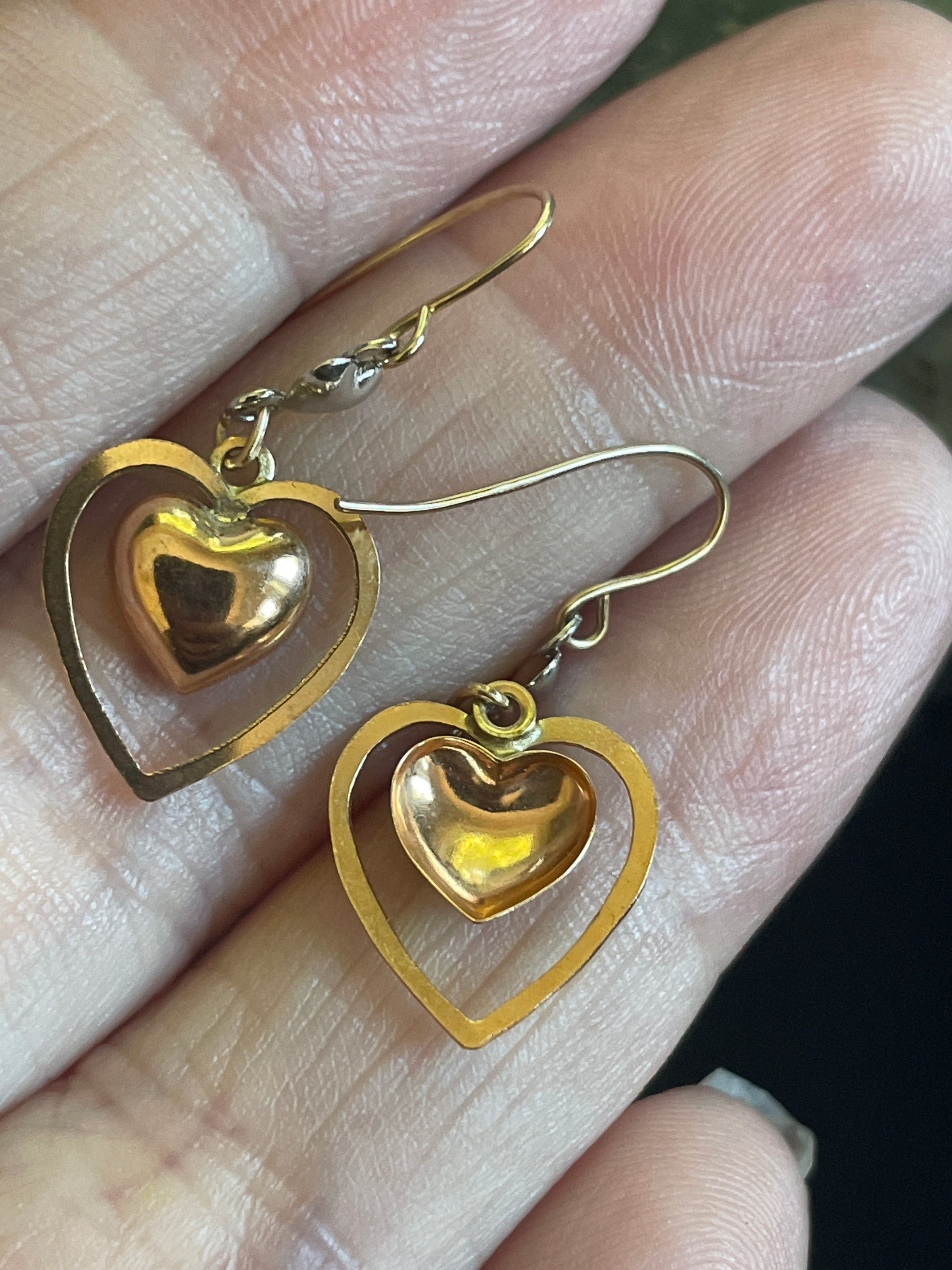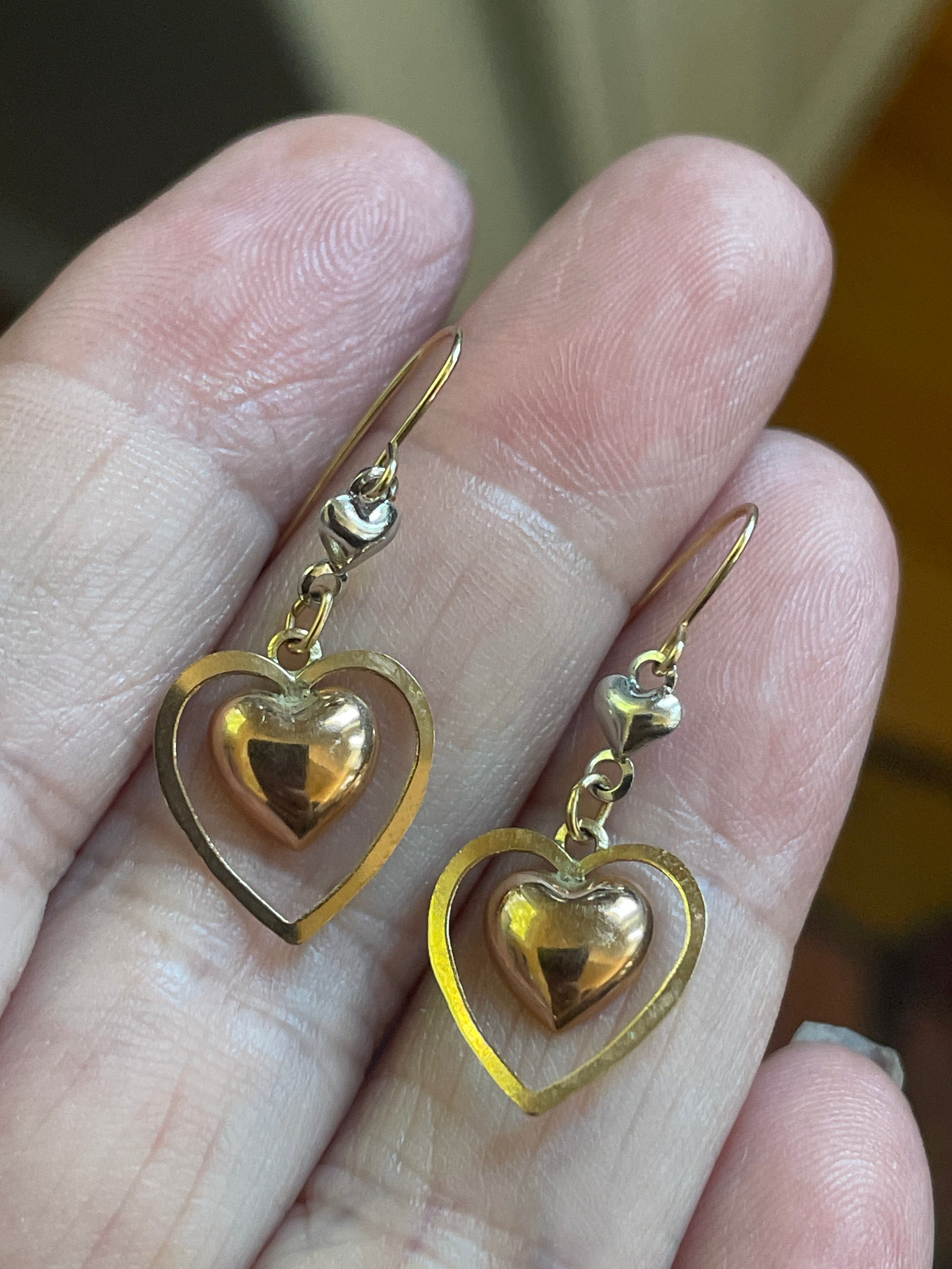 Fabulous Heart drop earrings in Yellow, White and Rose gold. These measure approx 1 inches. Earrings stamped 14k. Also tested. Lightweight and comfortable for daily wear.