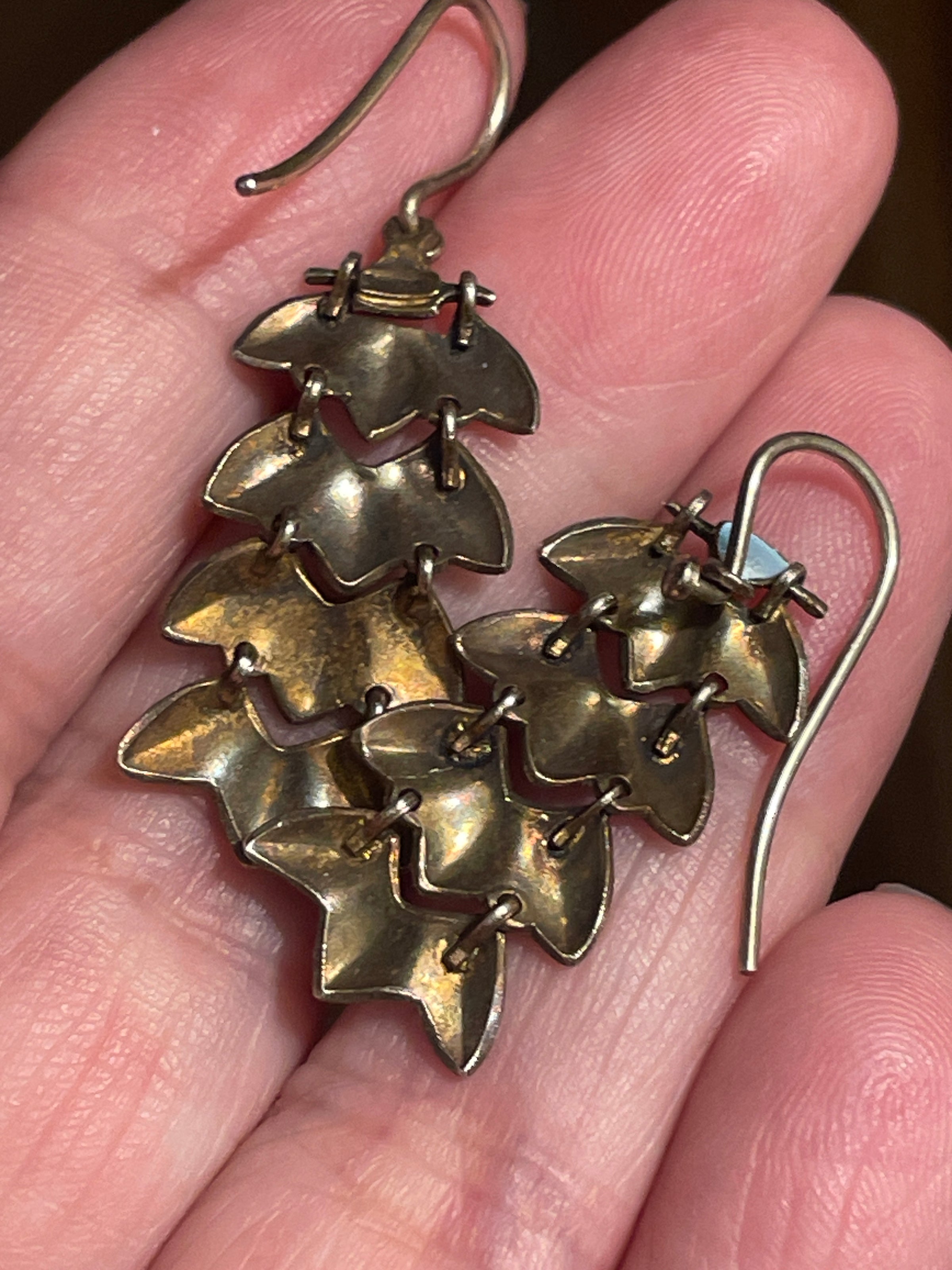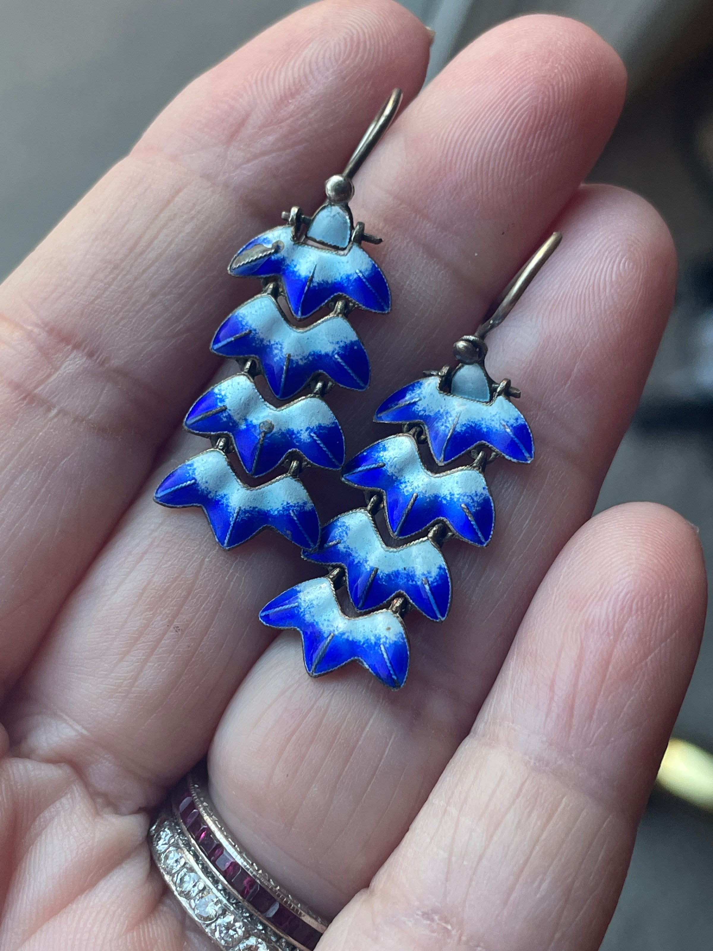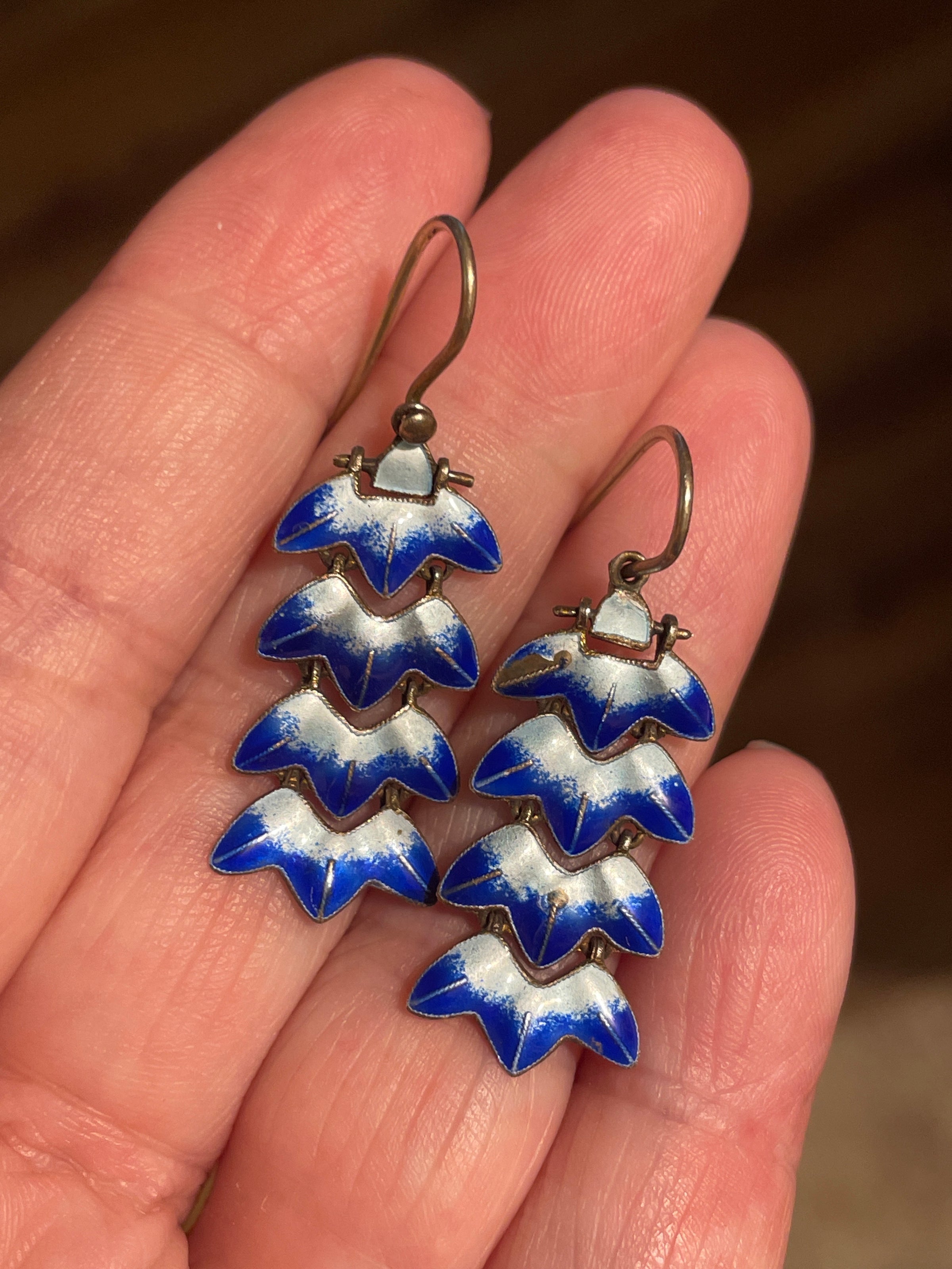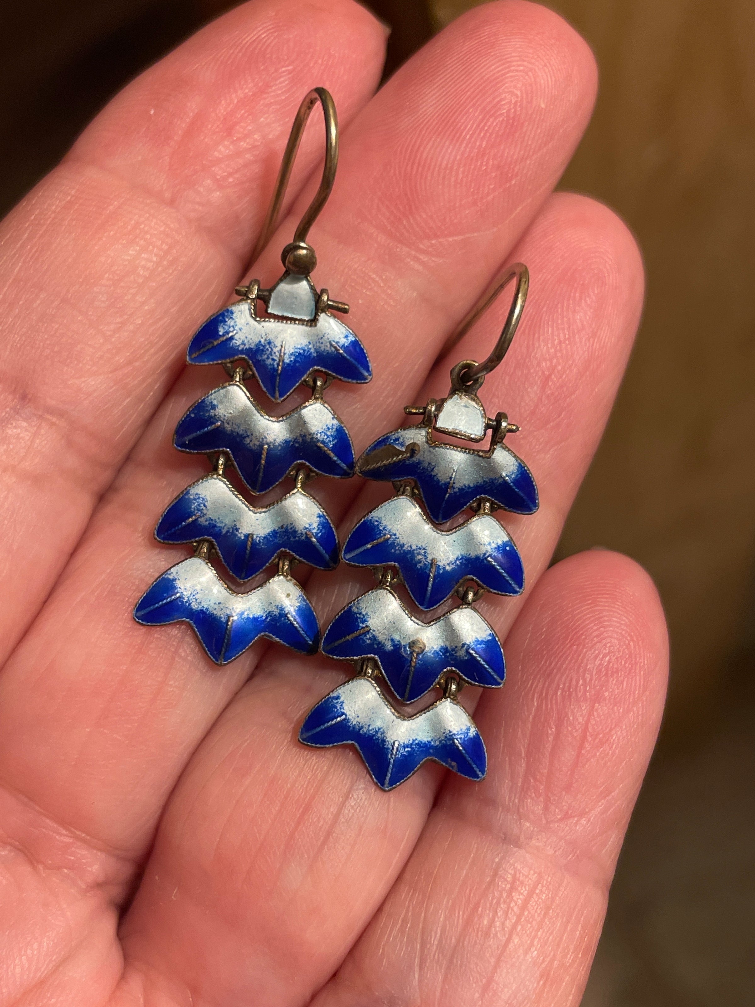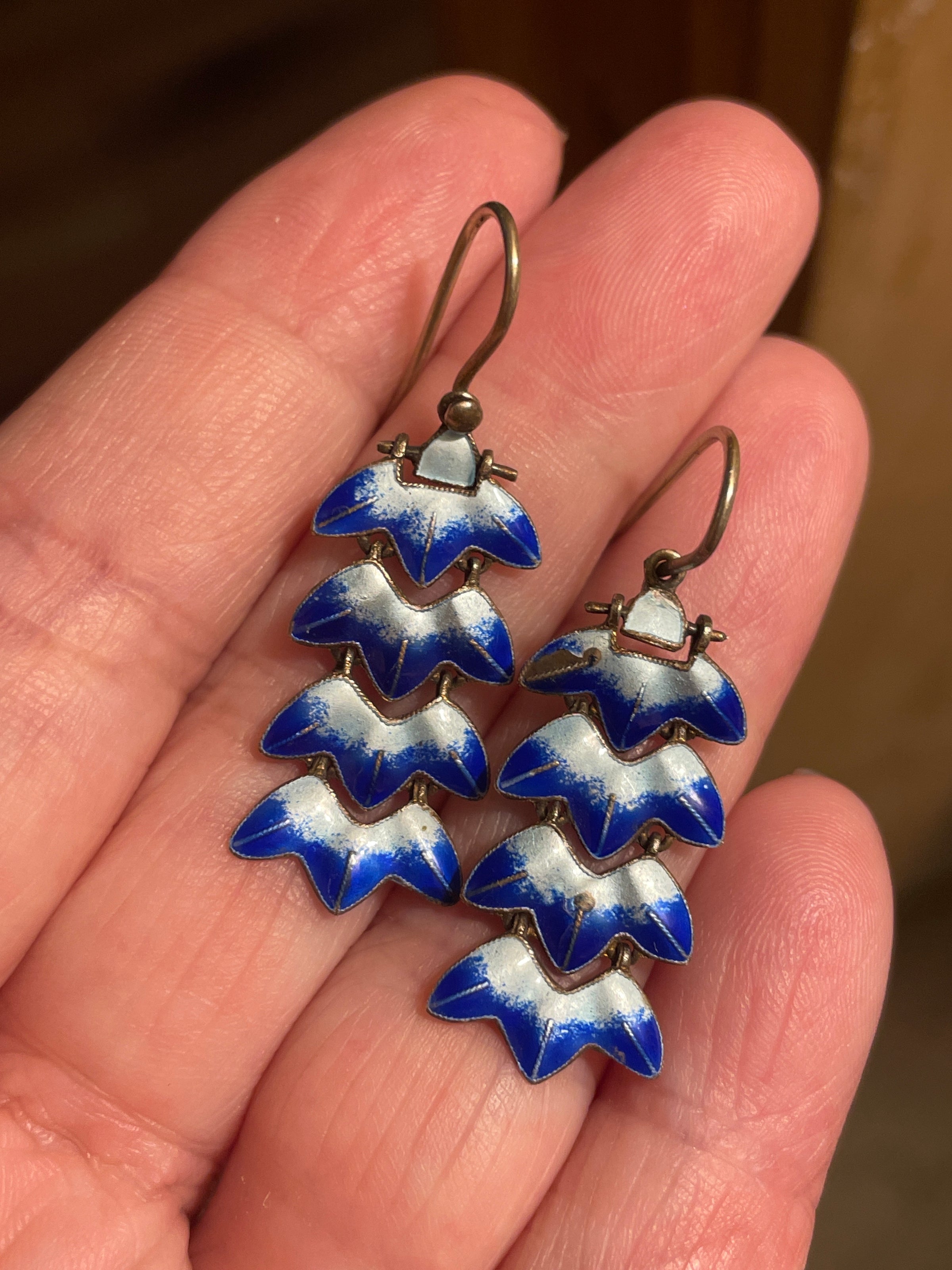 Vintage Enamel earrings in sterling silver.  These measure just over 1 inch.  They are tiered and have beautiful drape.  Stamped “Silver” on the earrings.  Likely circa 1930s.
