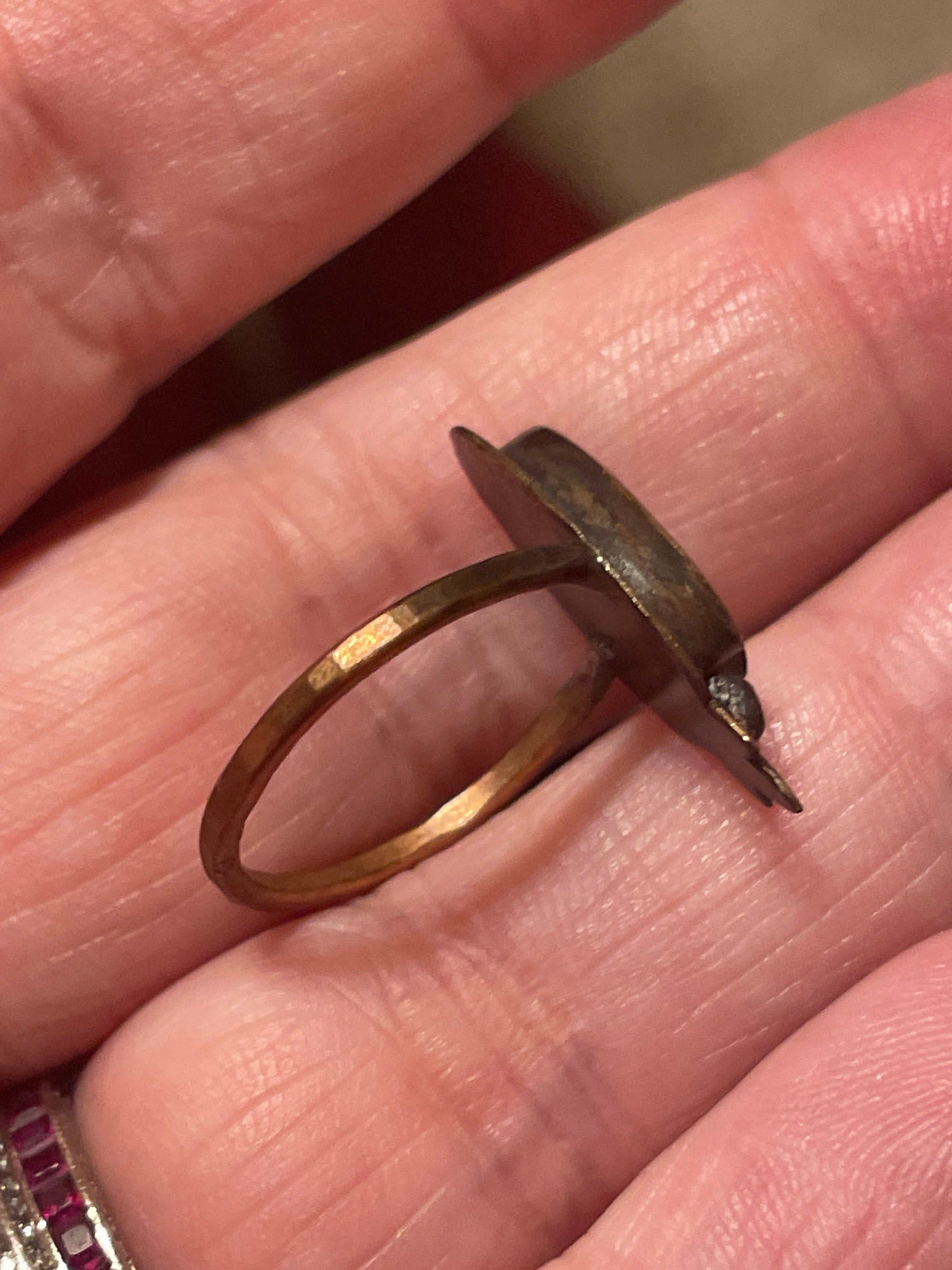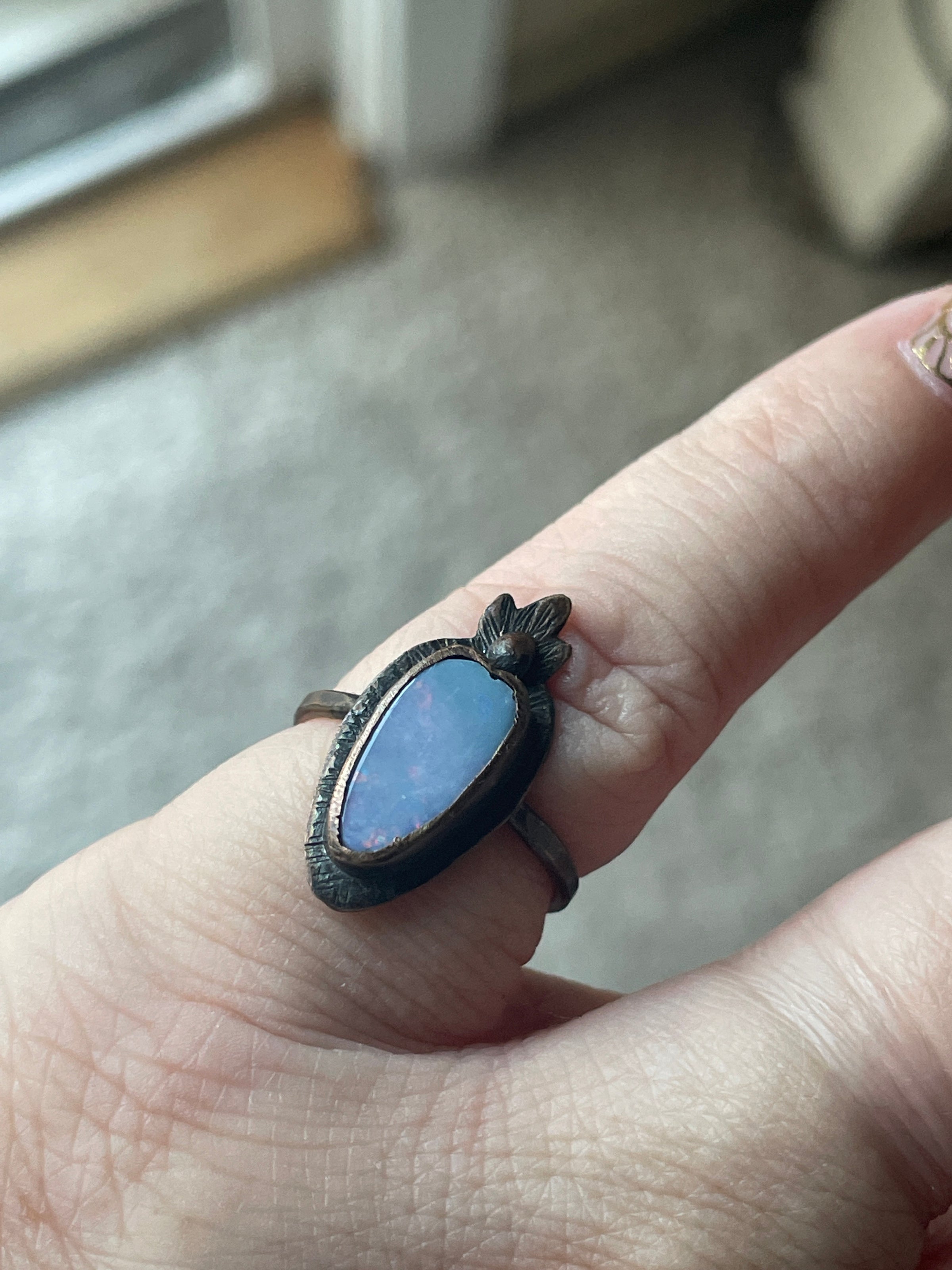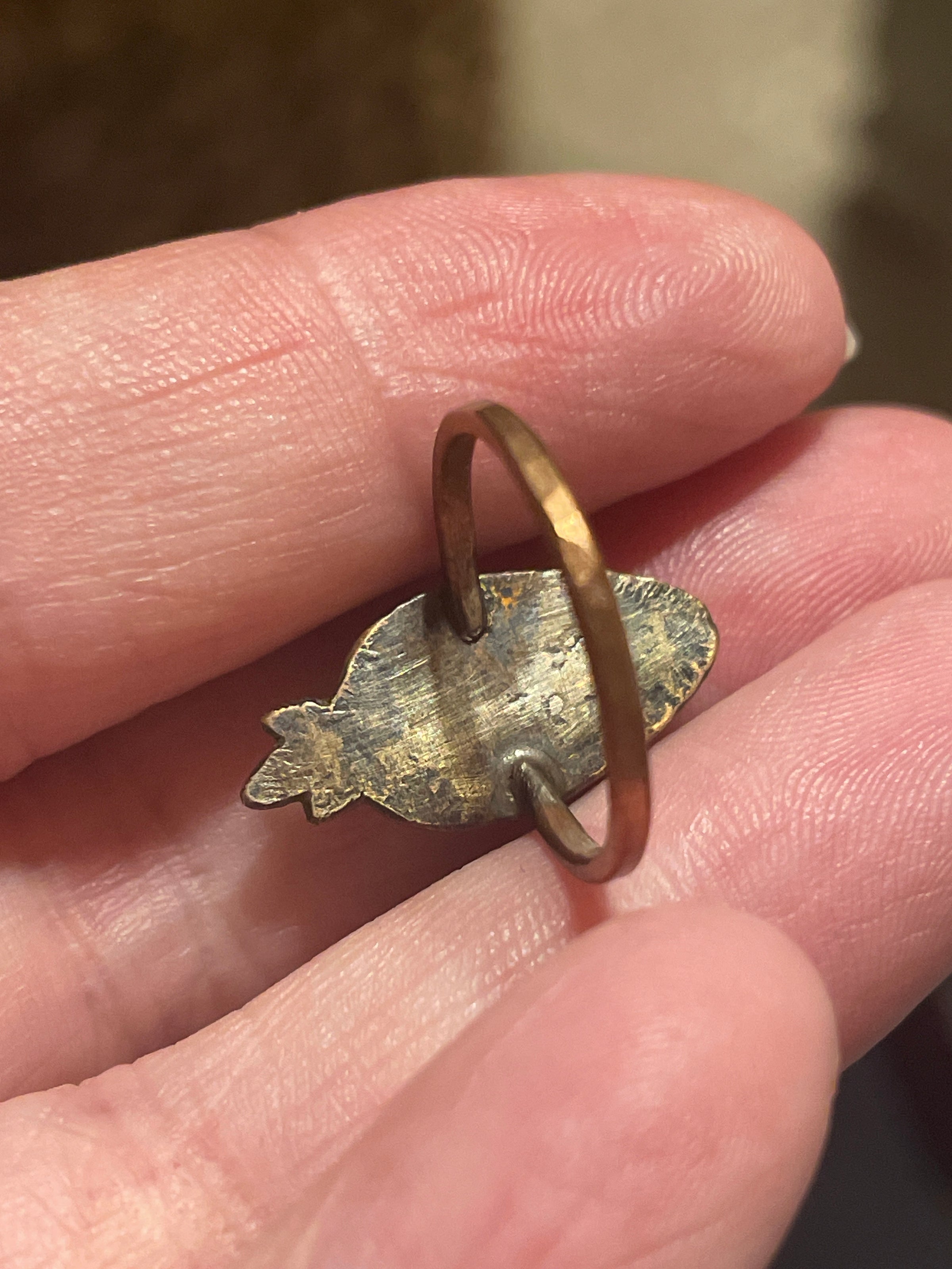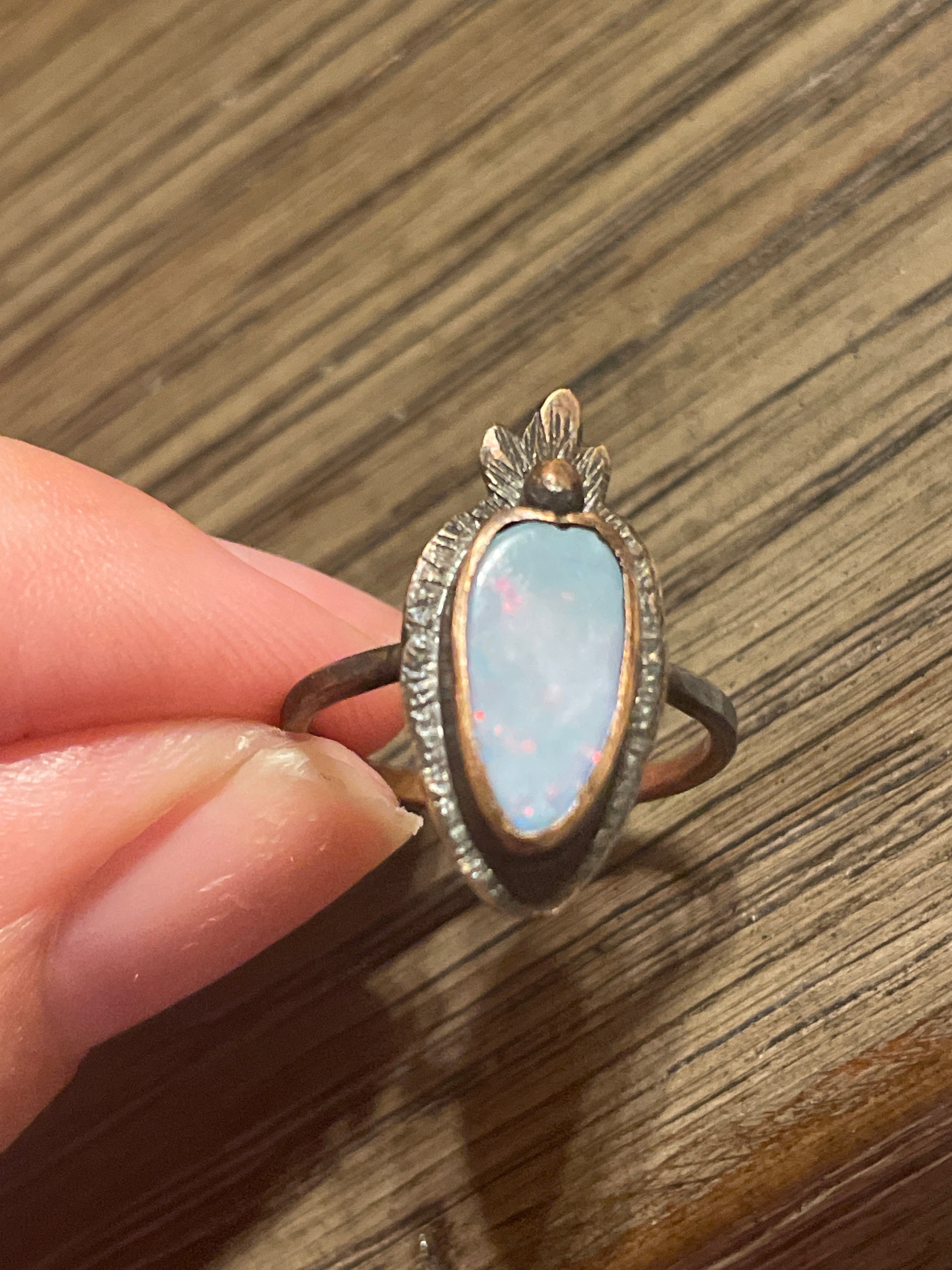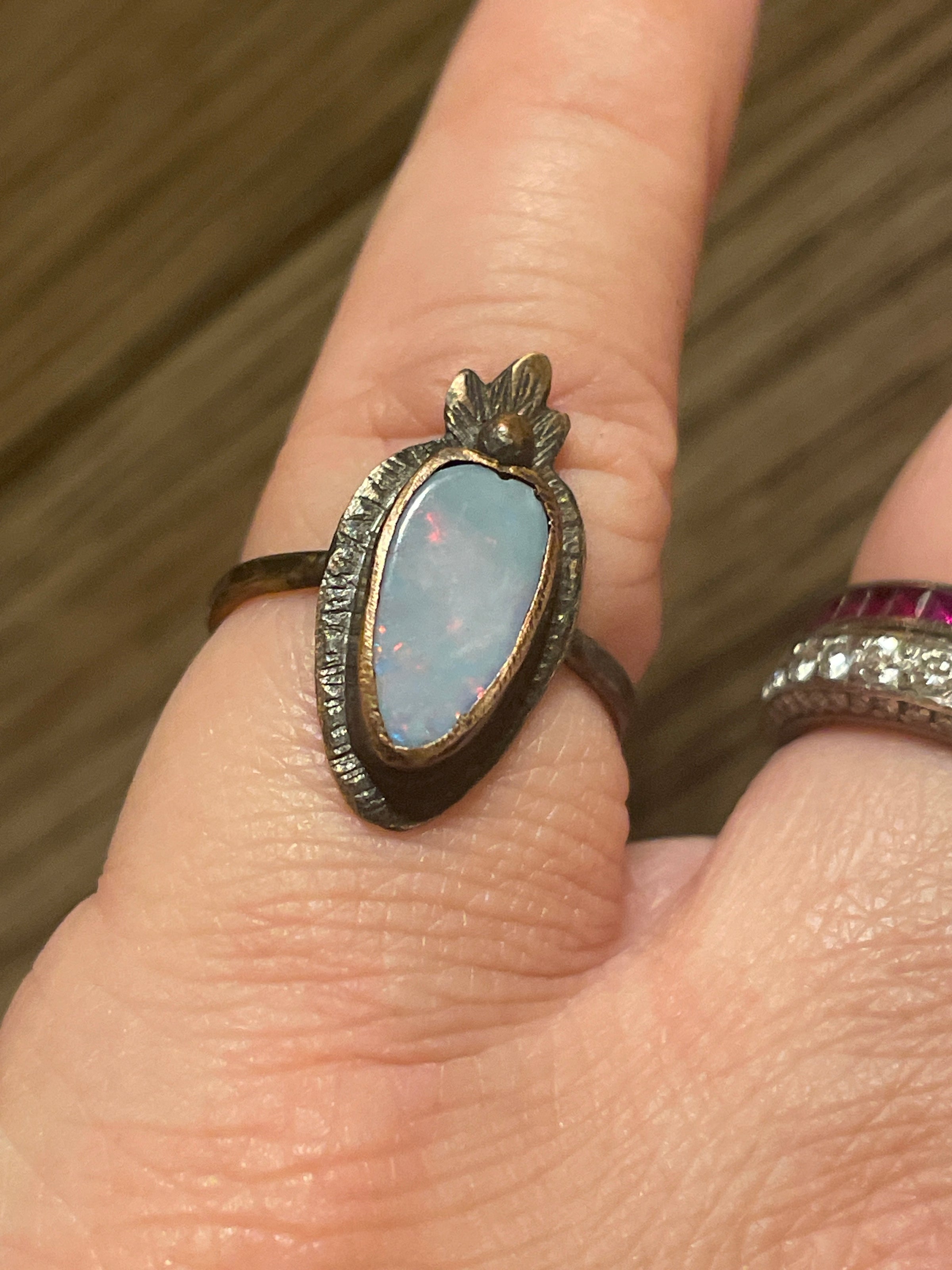 Unusual Opal elongated heart ring with decorative leaf-like design at top.  Looks to be Copper and Bronze.  Ring approx size = 5.  No markings.