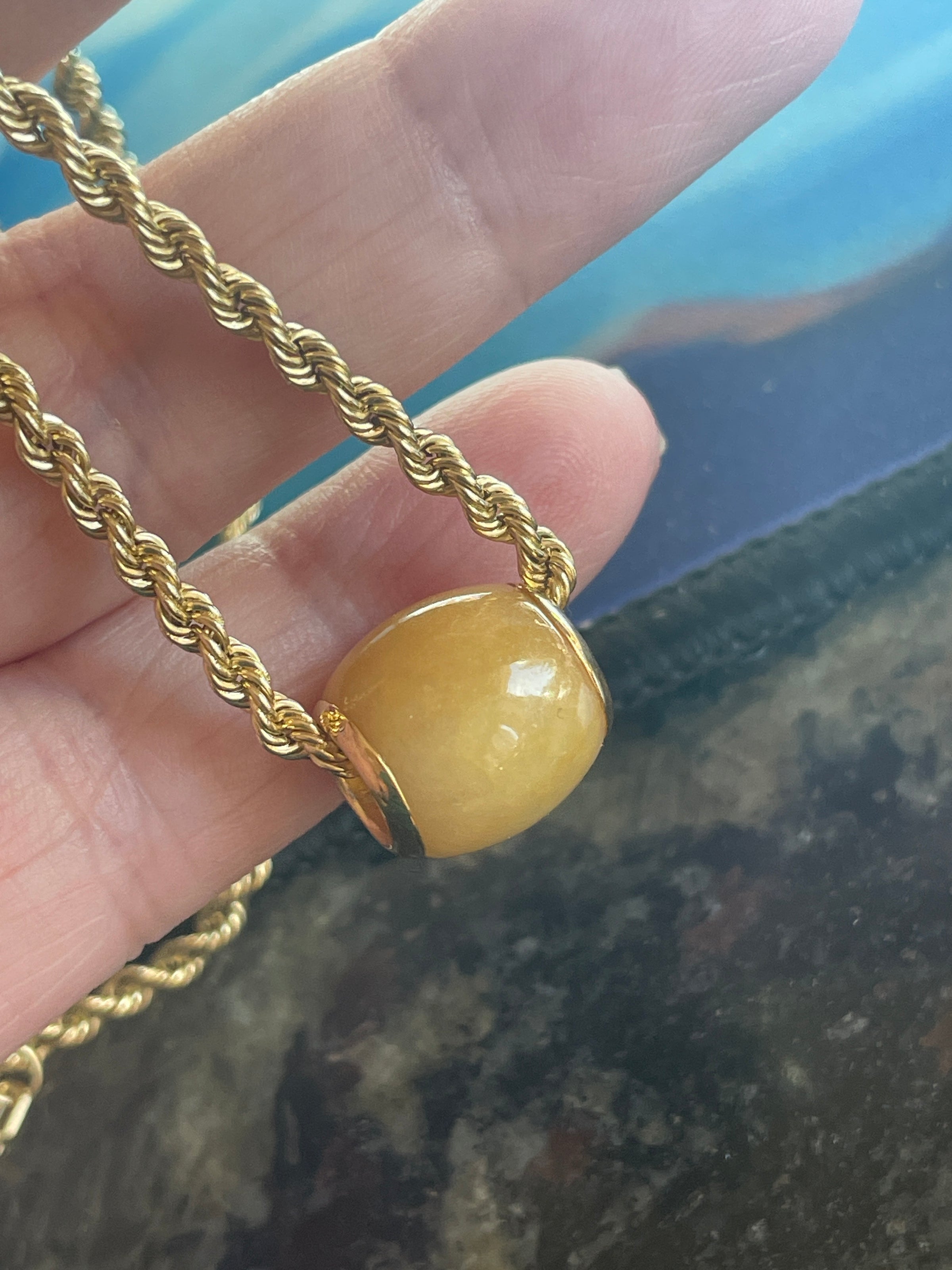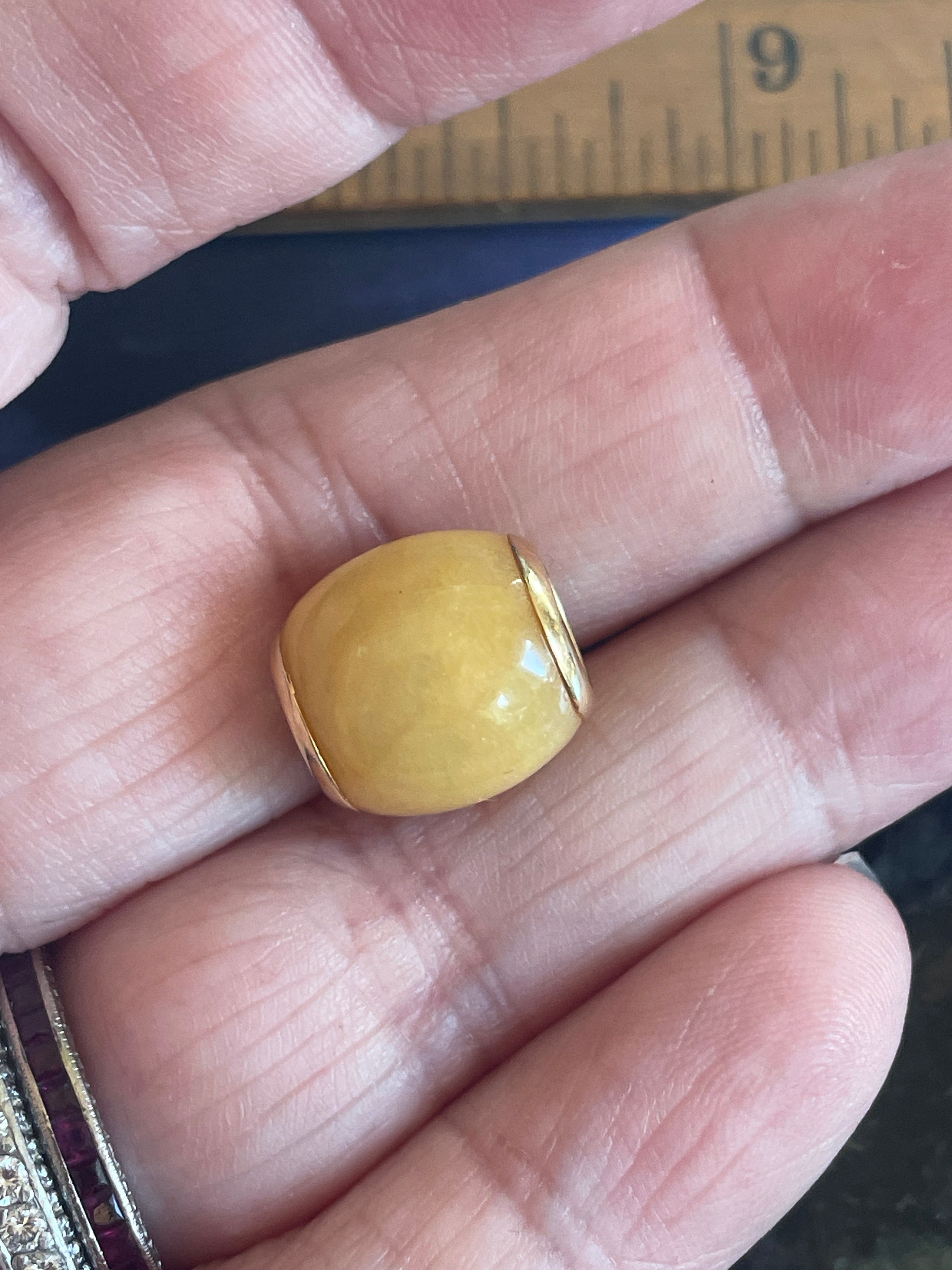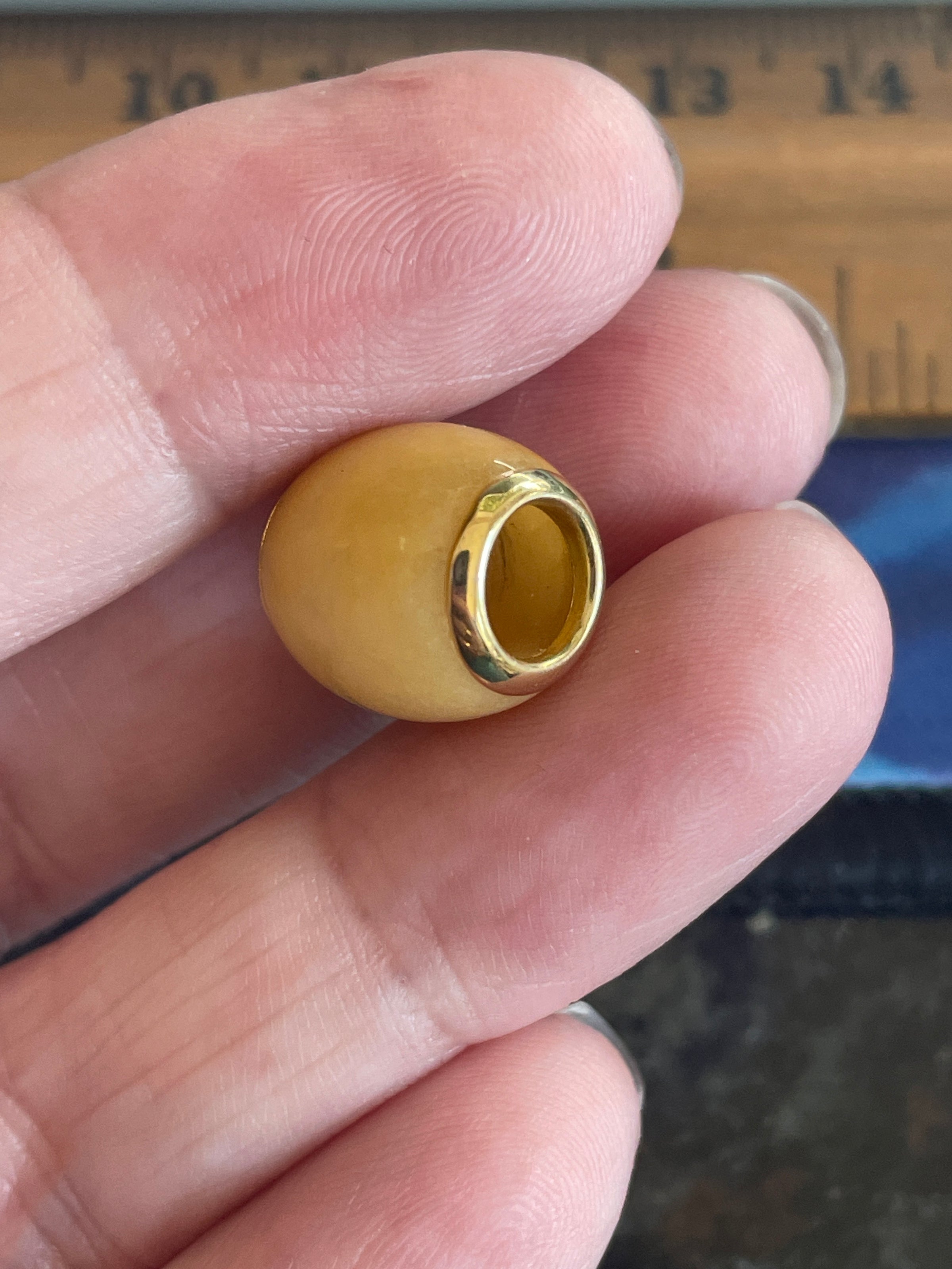 Stunning vintage Jade bead pendant with gold edges. Gorgeous rare yellow Jade color. Pendant measures just under 0.5 inches. Tested 14k. Large hole measures 6mm across. Chain shown for photos (sold separately).