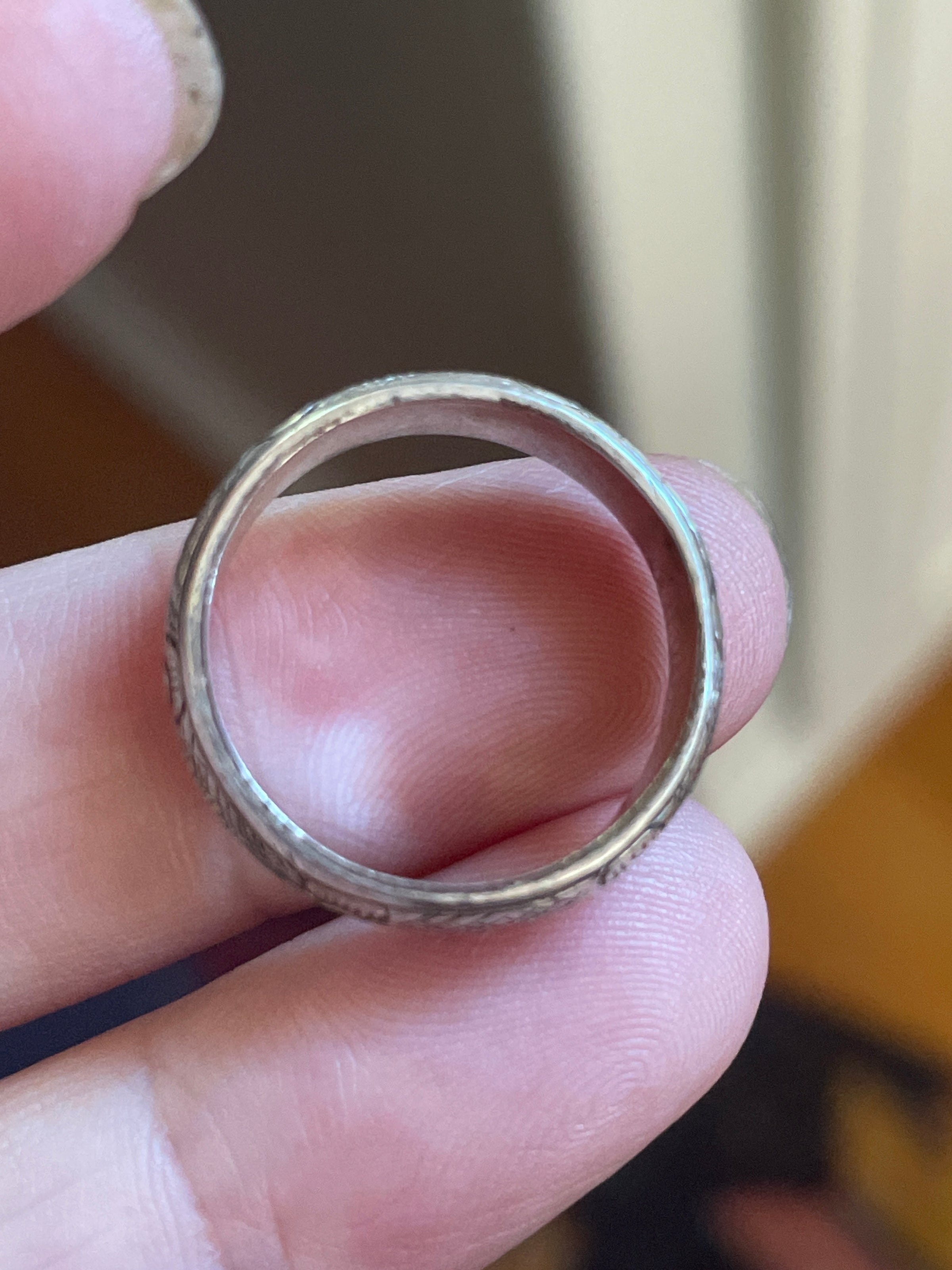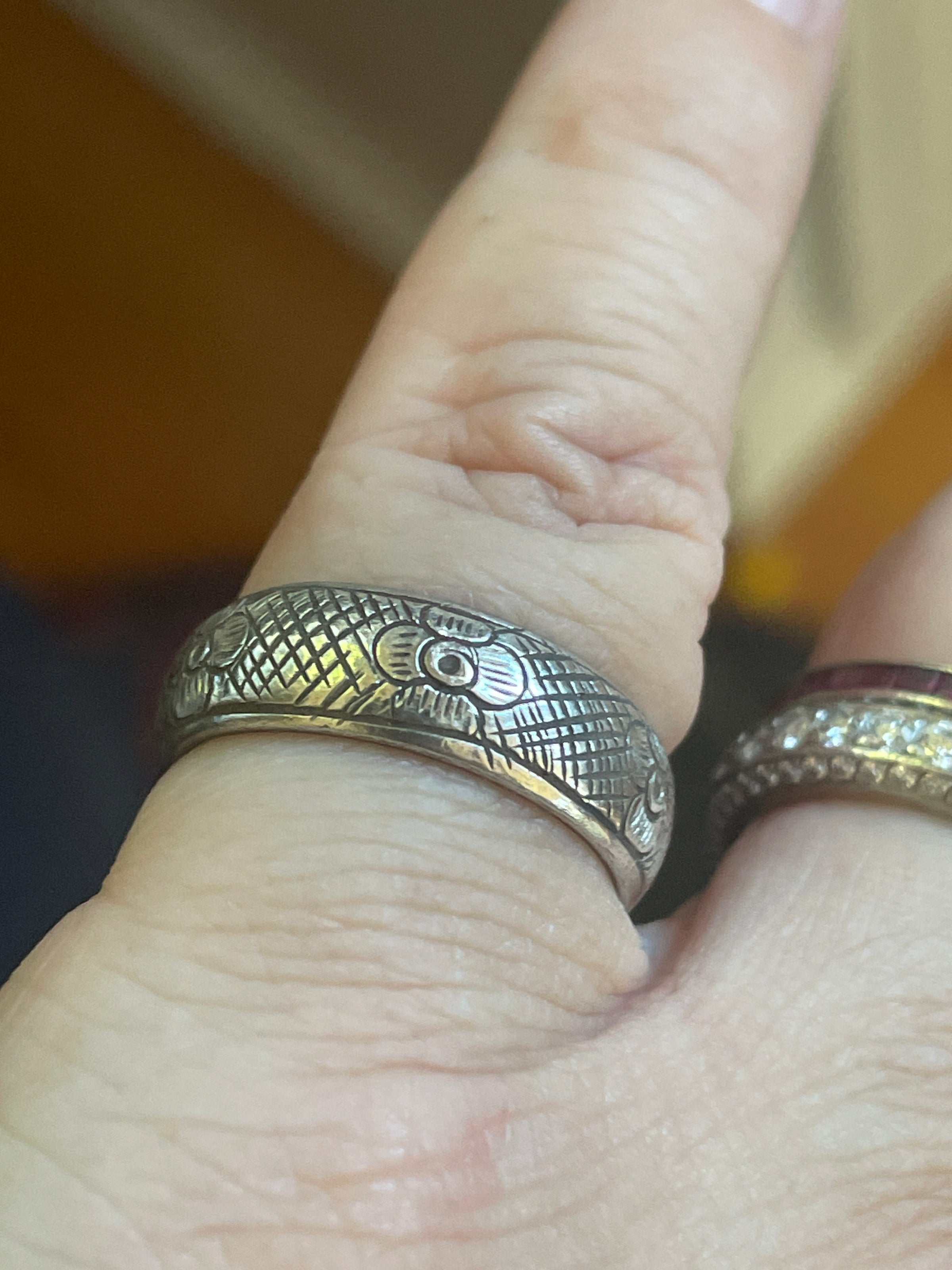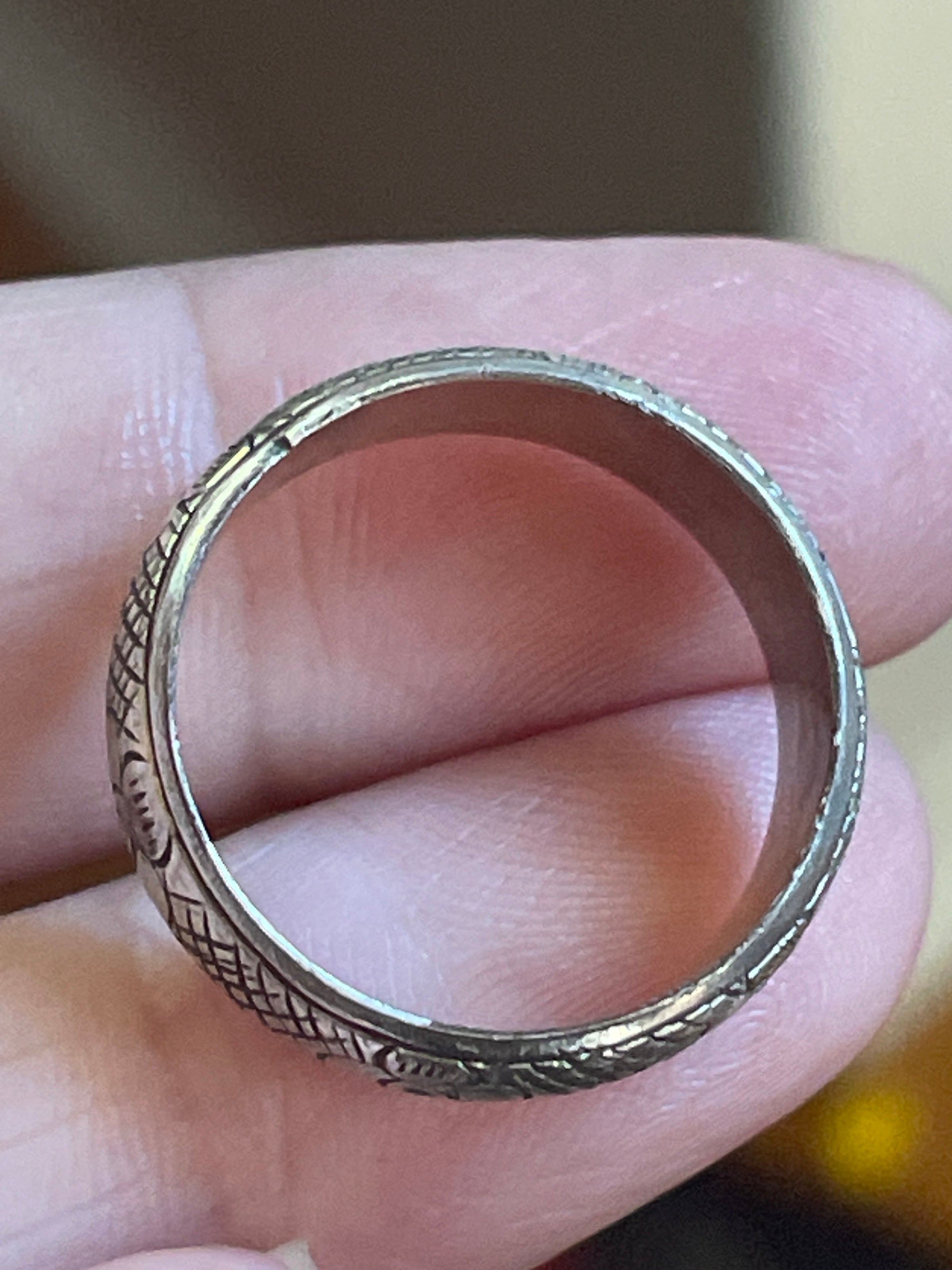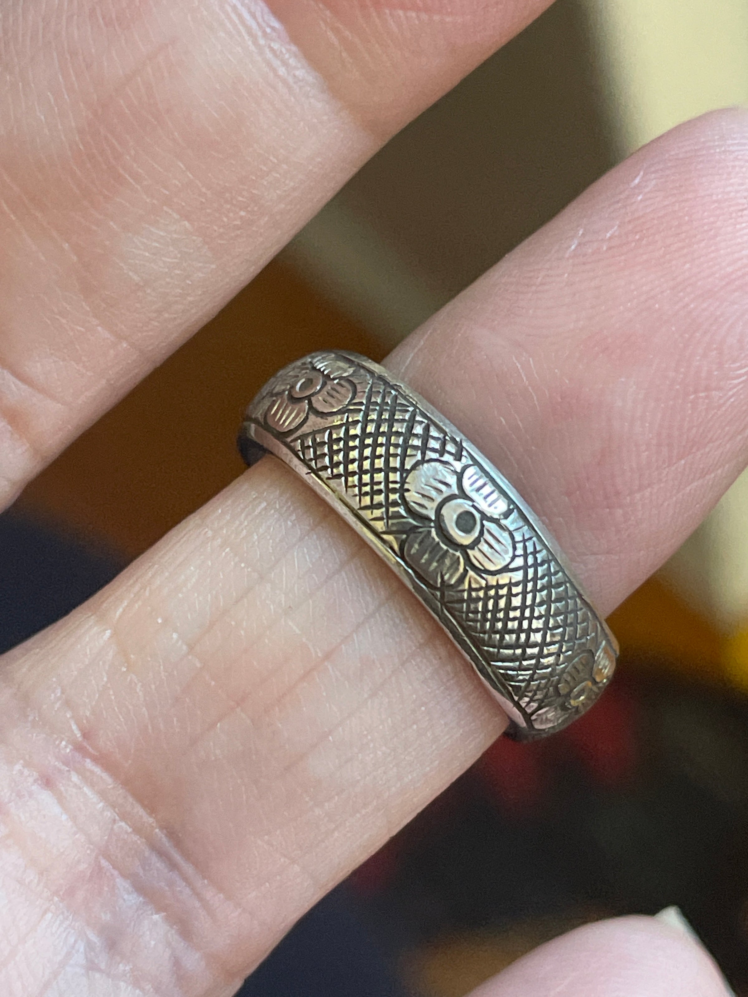 Fabulous vintage engraved flower band in sterling silver.  Band has continuous design.  Measures approx 6mm across.  Has tiny ding on one edge not noticeable when wearing.  Ring size = 6.  Unmarked but tested sterling.