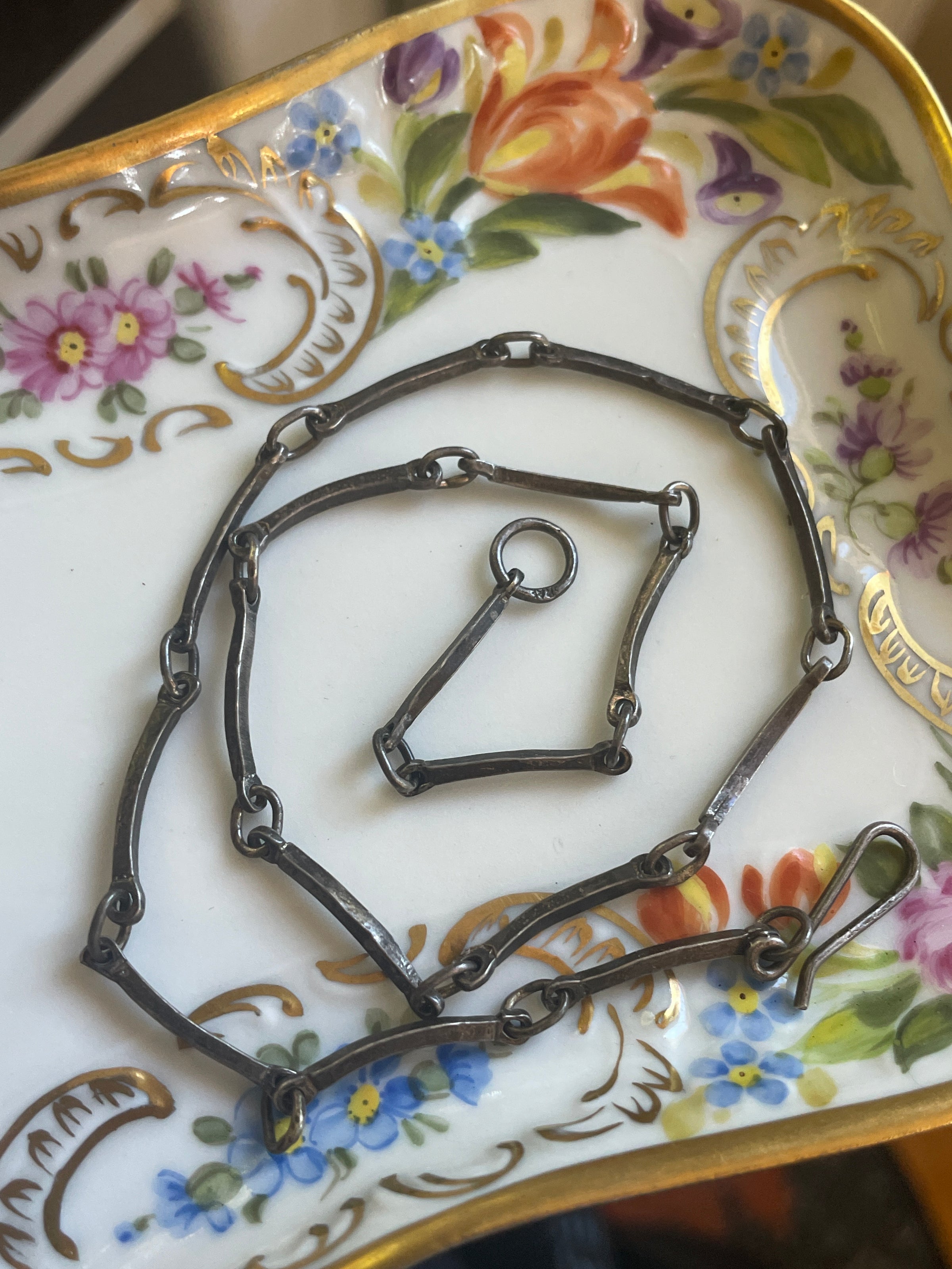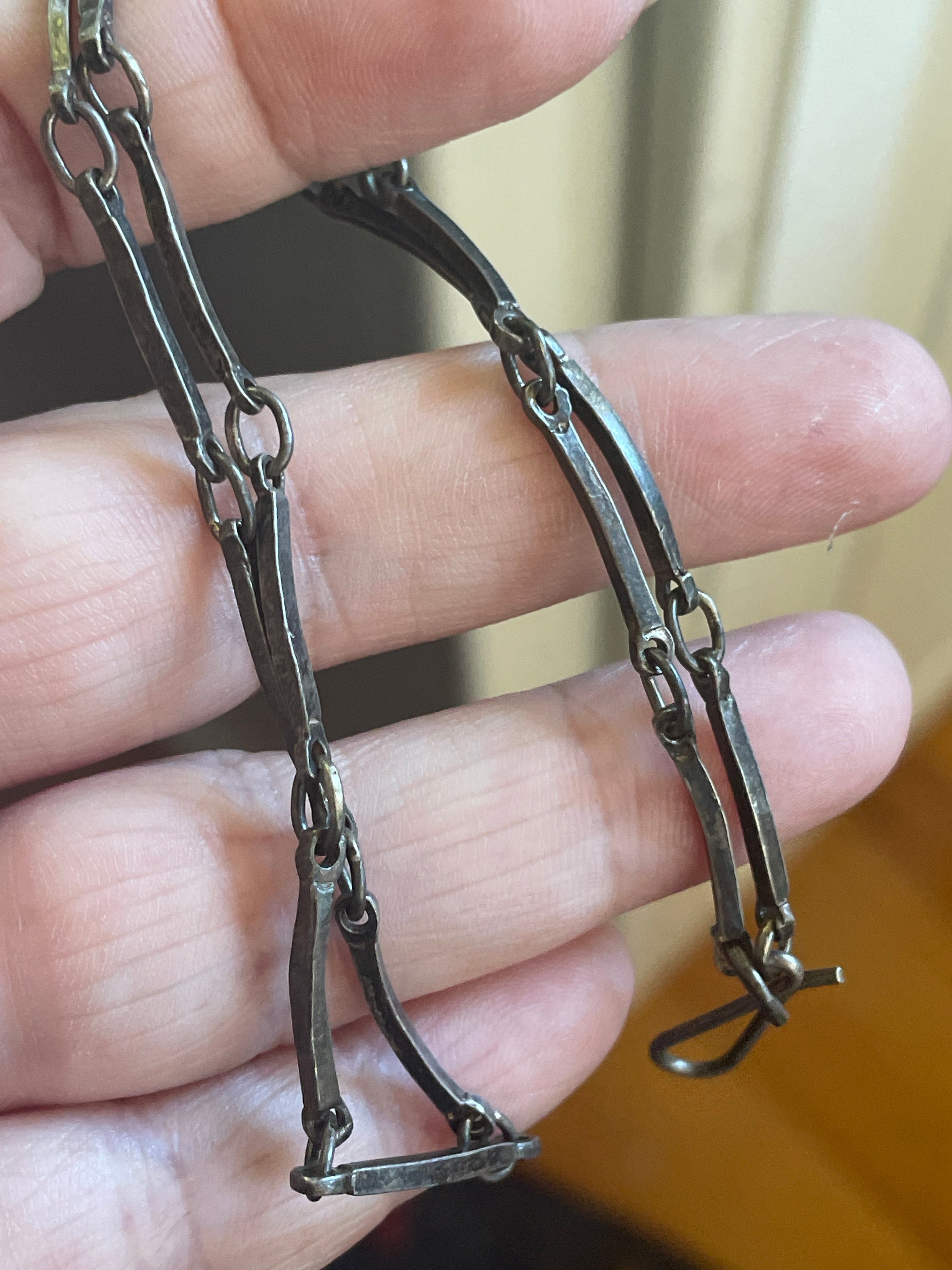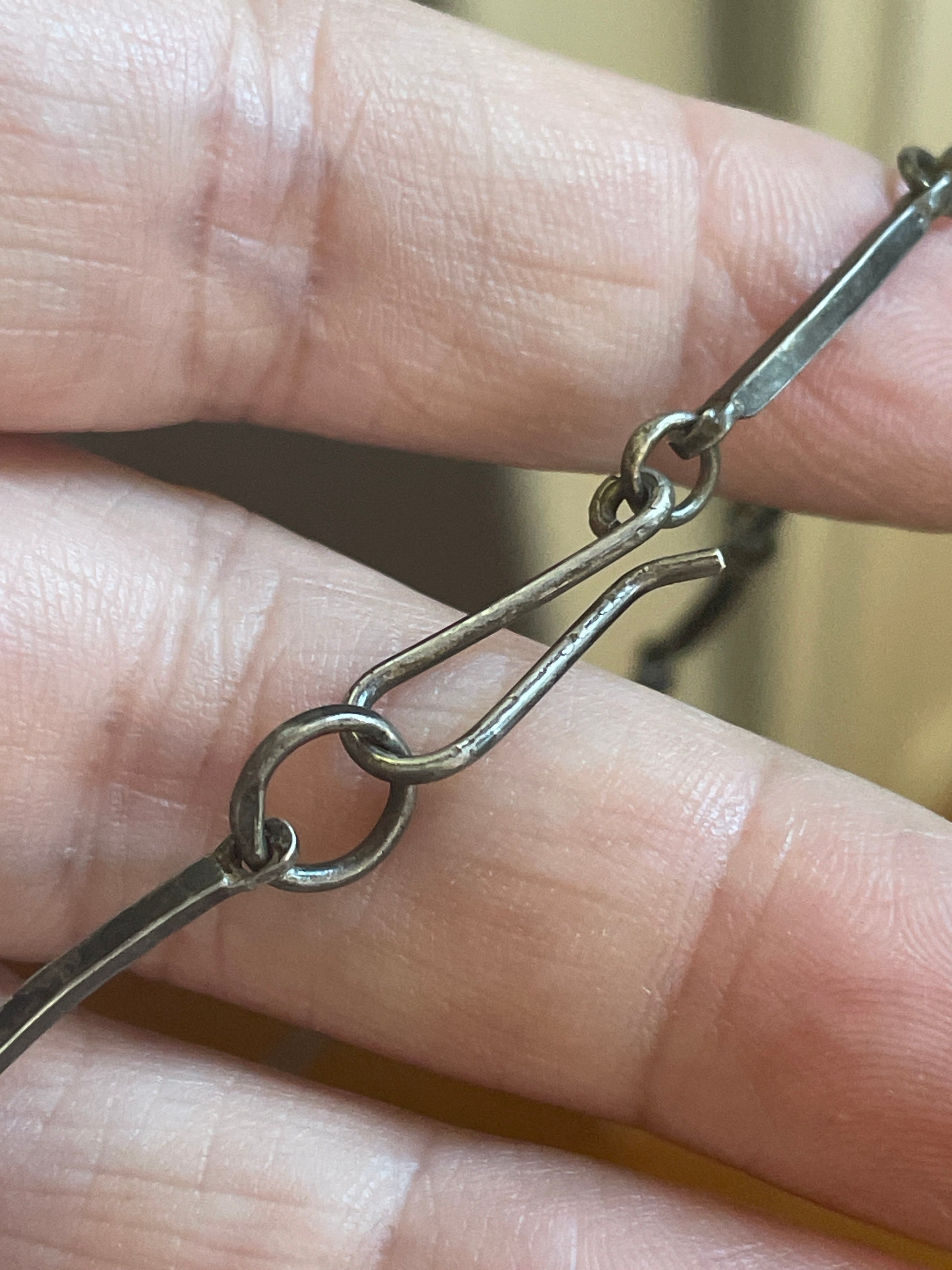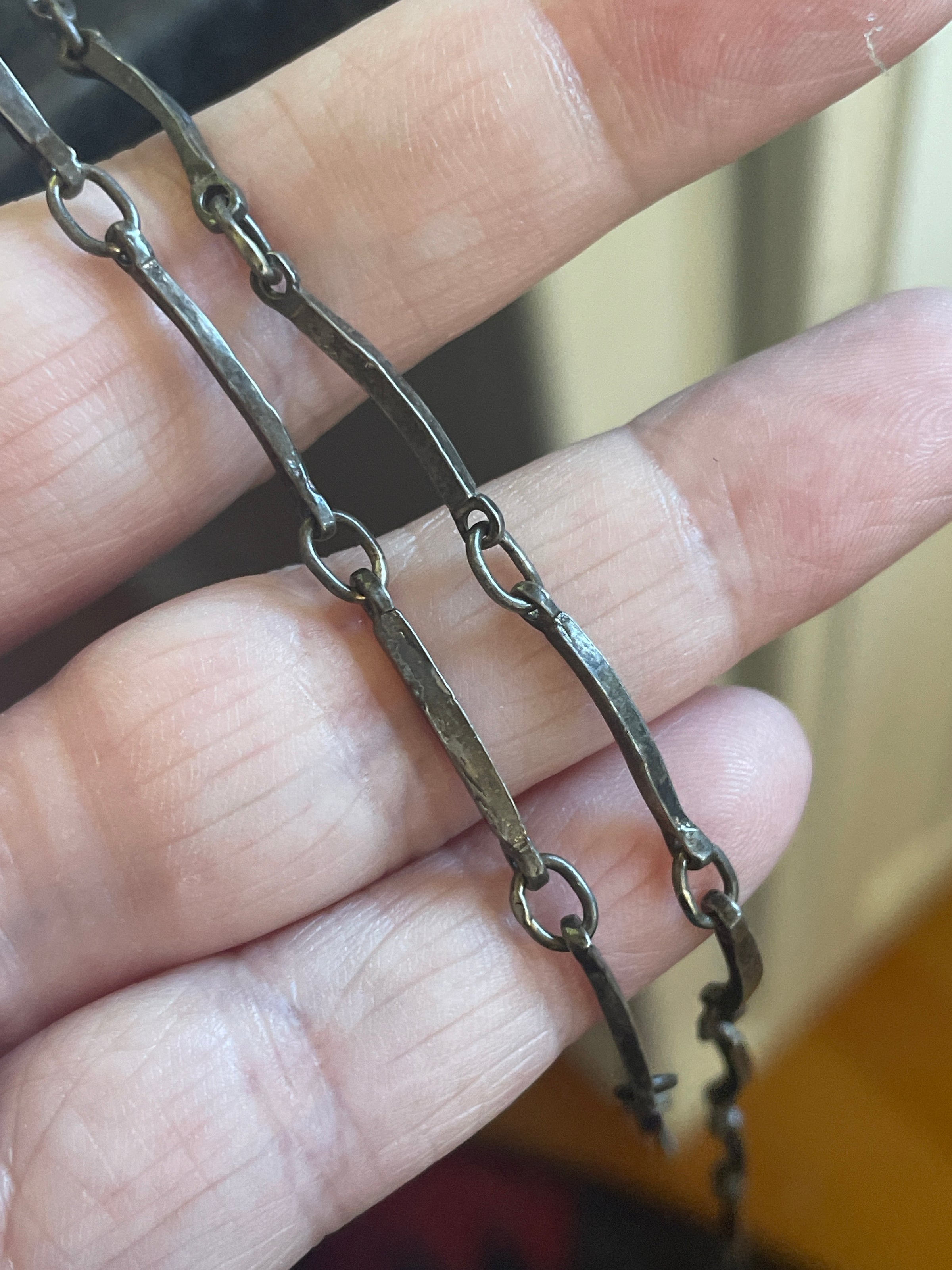 Fabulous vintage sterling link chains. Chain is handmade meaning each link is hand forged. Measures approx 14.5 inches. Has maker’s mark which us hard to make out. Tested sterling. Oxidized with age.
