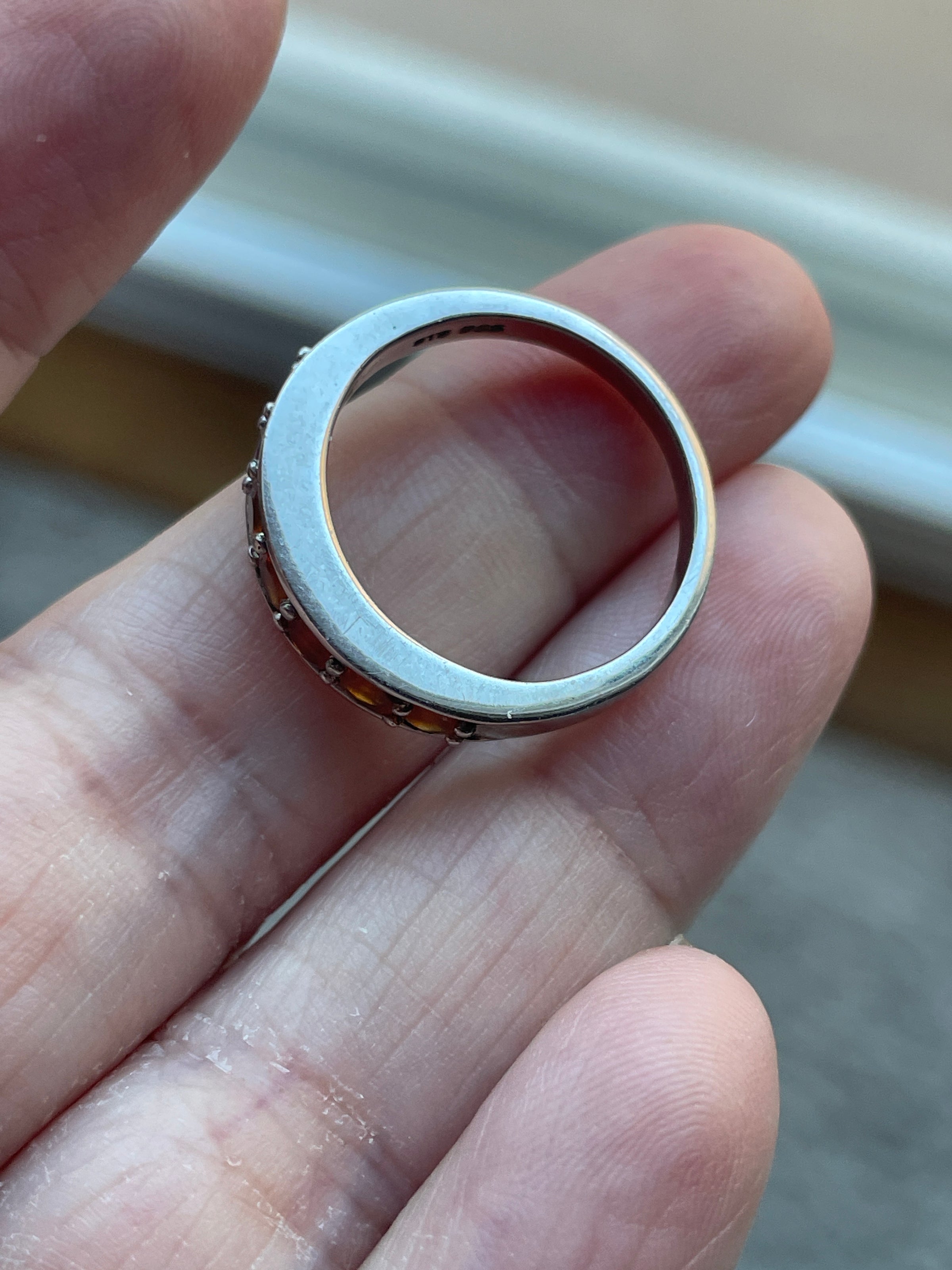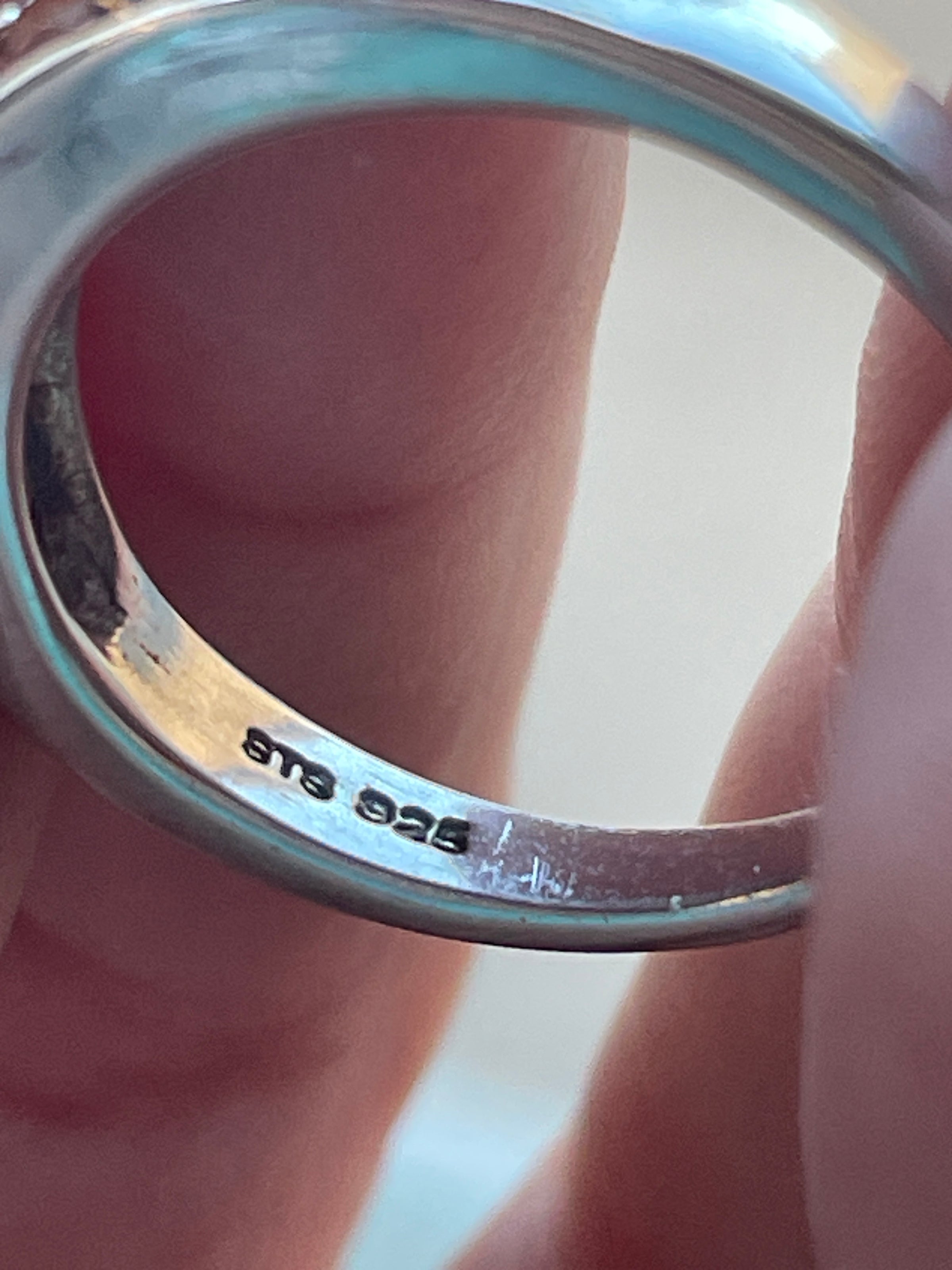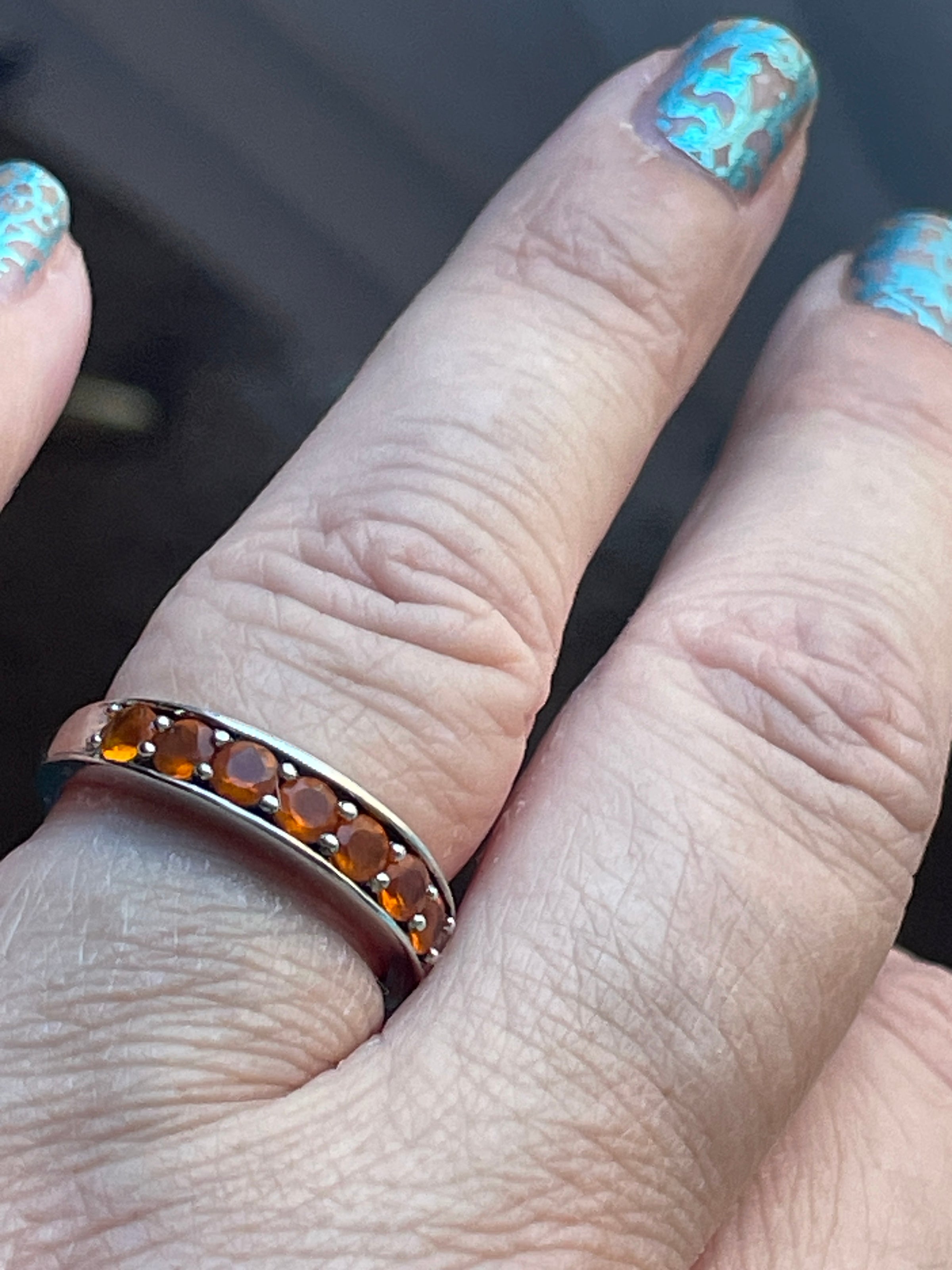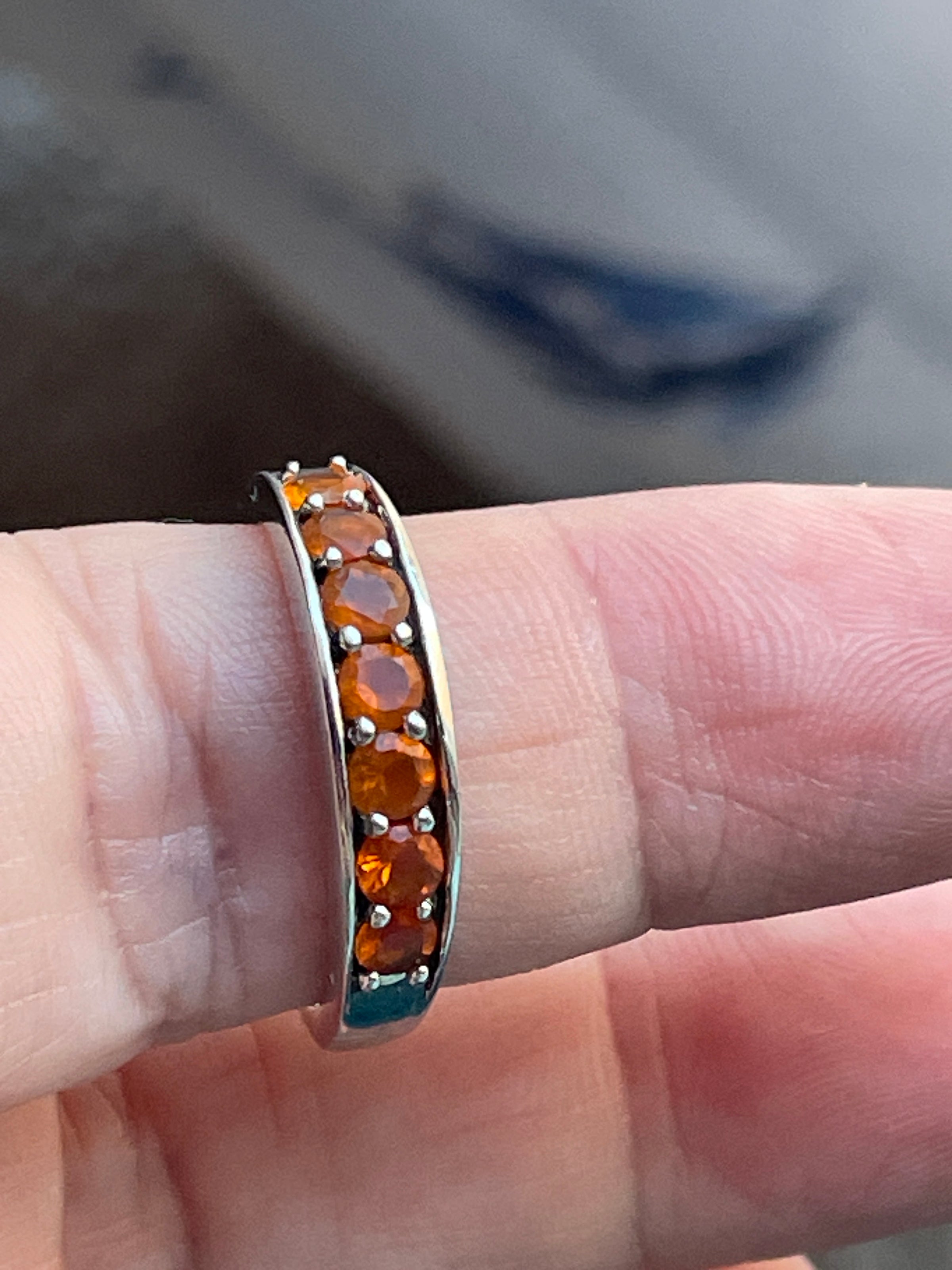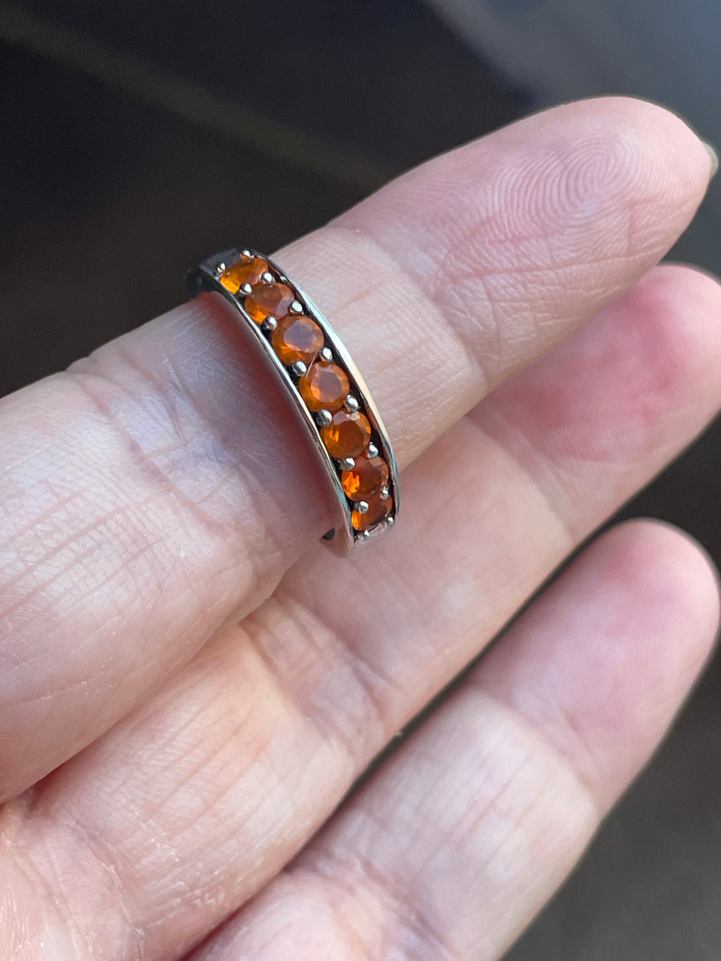 Beautiful vintage Mexican fire Opal band with a lovely orange hue. Ring size = 7.25. Stamped “India” and “925”.