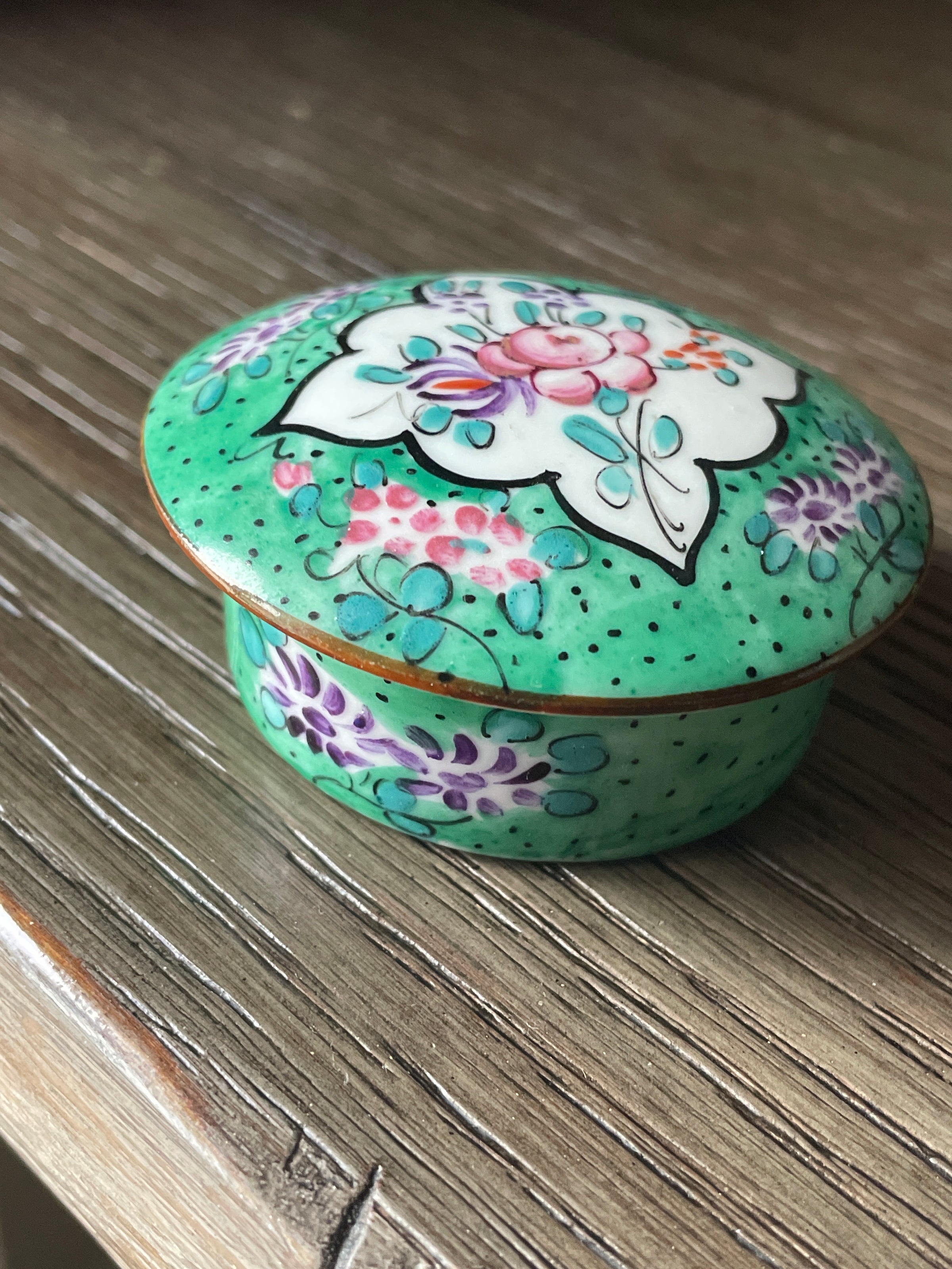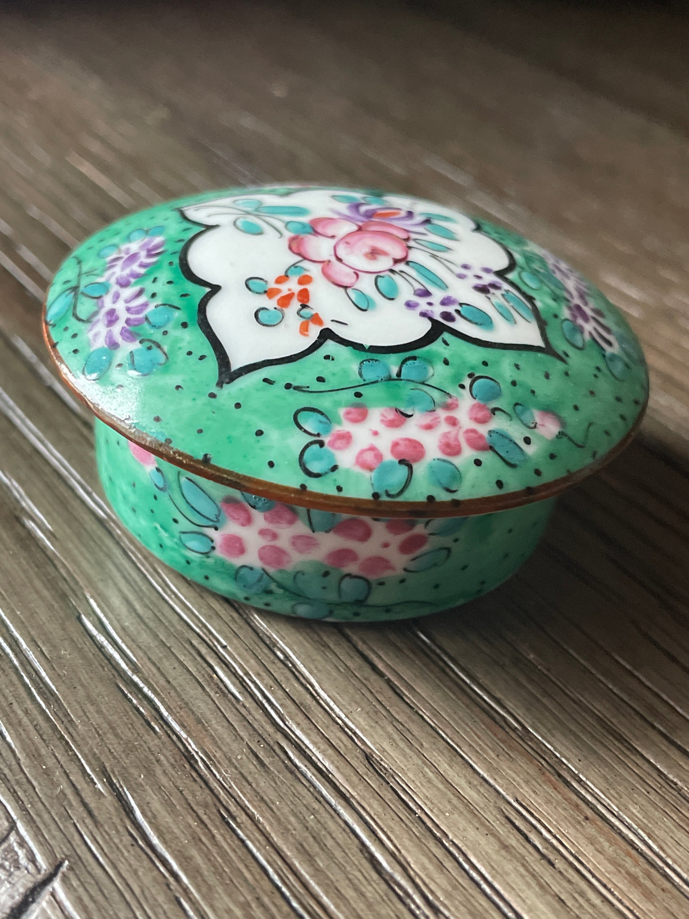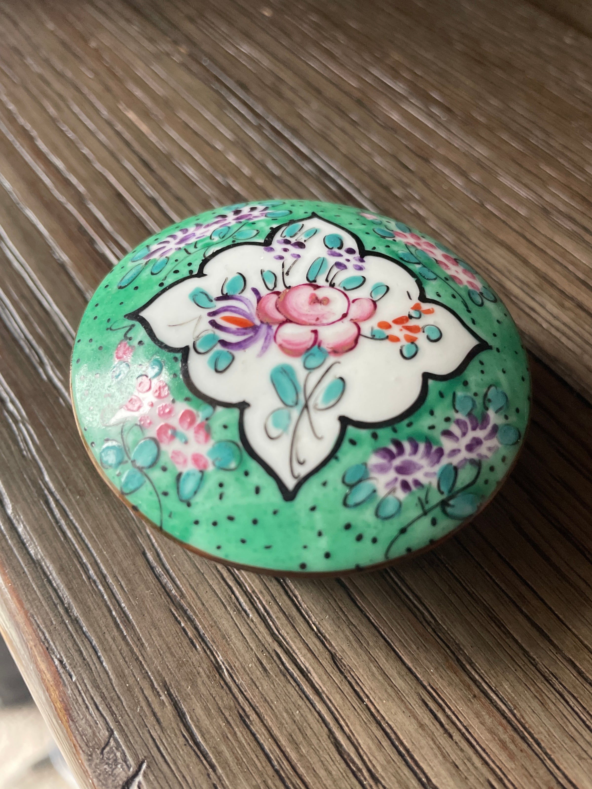 Sweet hand painted trinket box perfect for dainty treasures. Beautiful shades of Green, Pink and Purple. Box measures jusy under 2.5 inches across and just over 0.75 inches tall. Has a few chips inside lid I didn’t even notice initially. Can’t tell when closed. Maker’s mark on bottom.