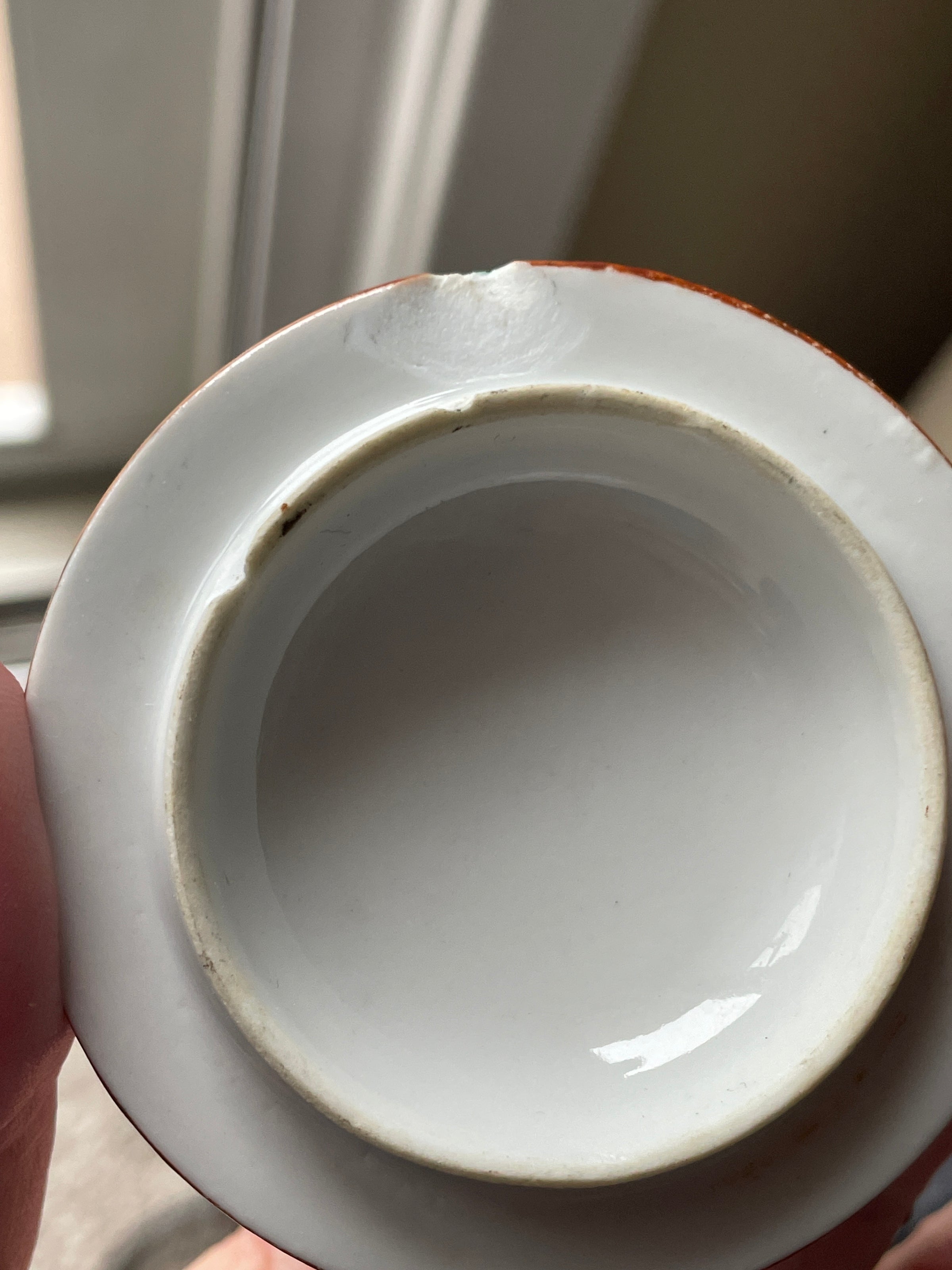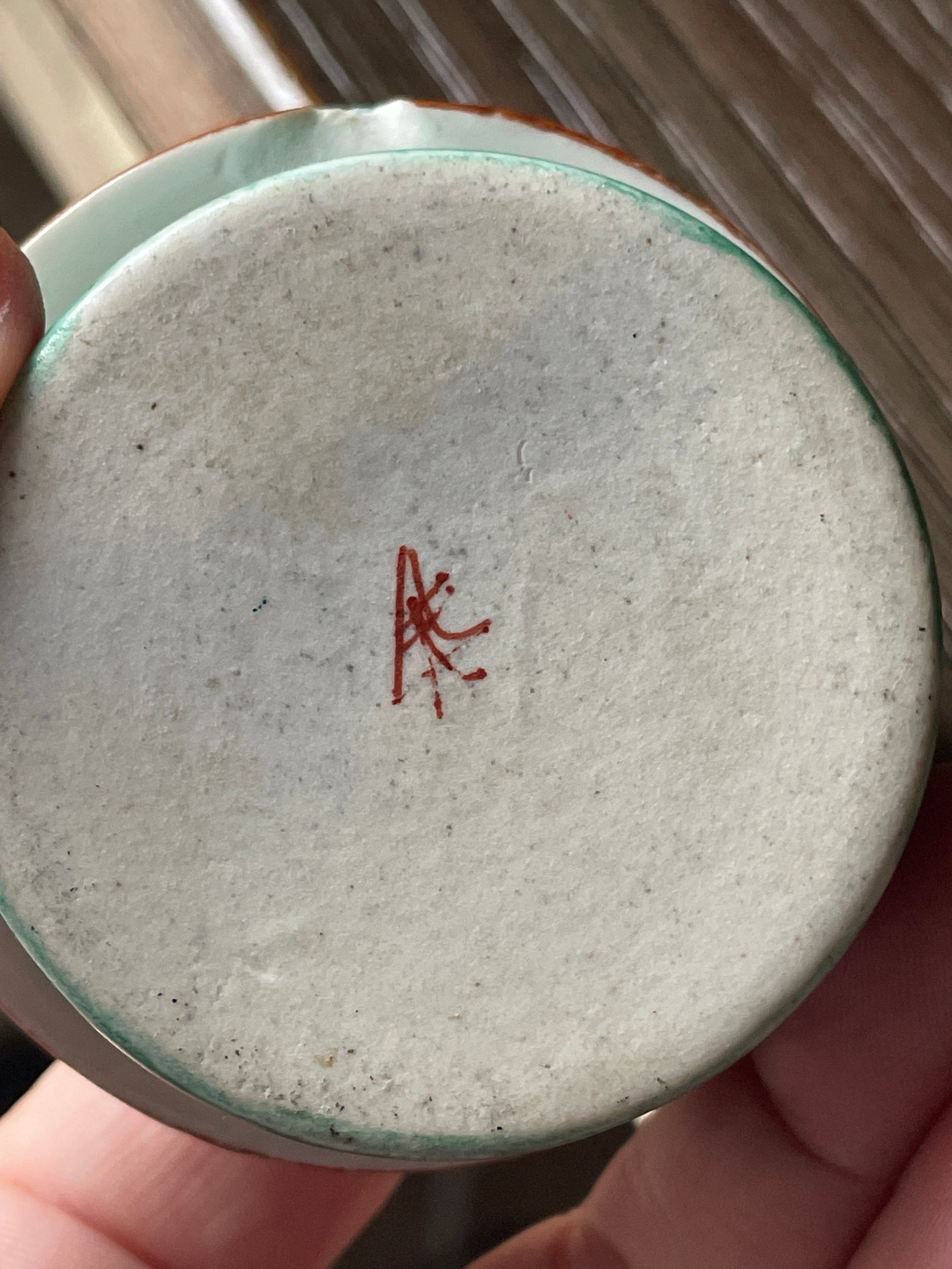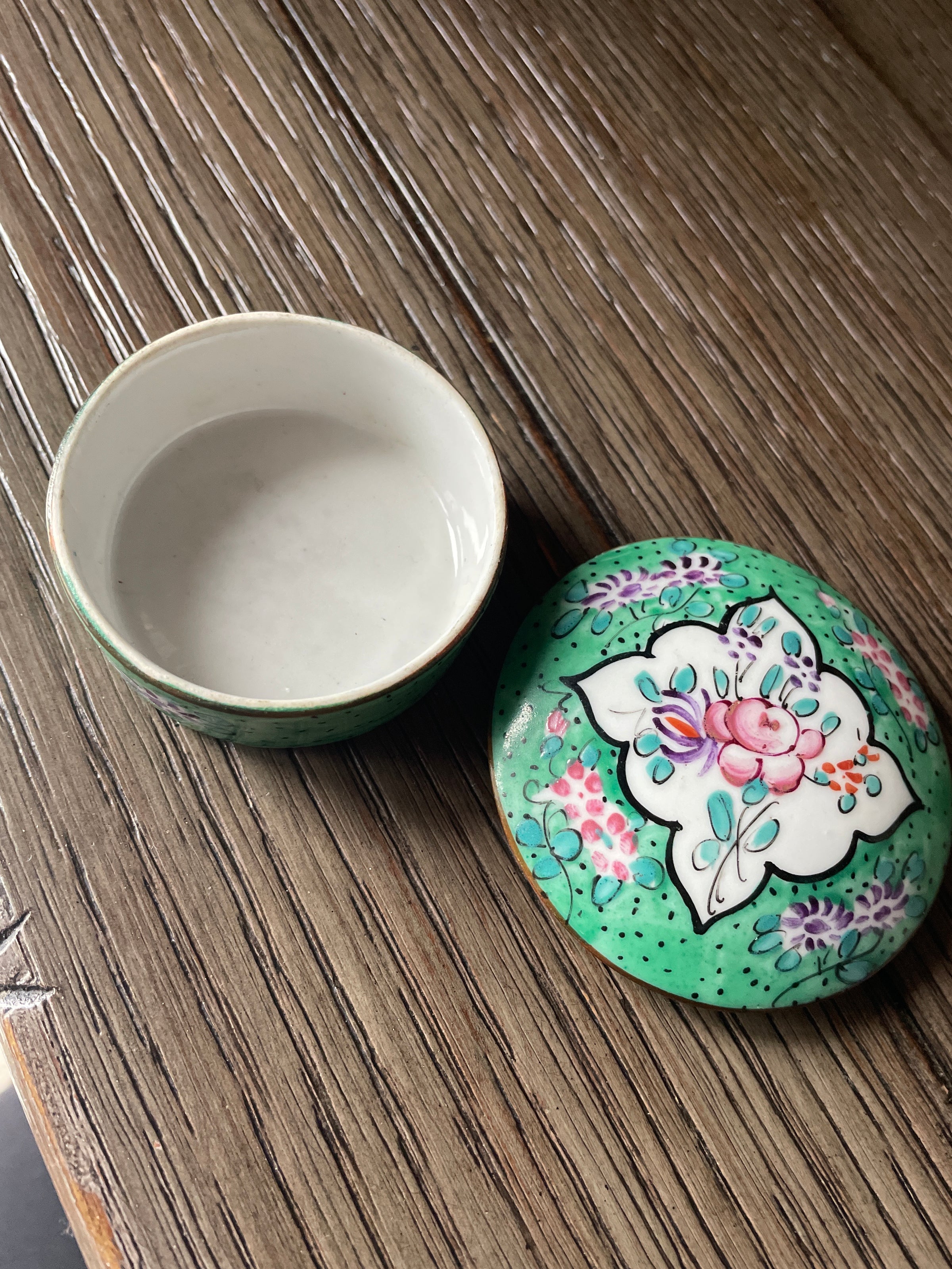 Sweet hand painted trinket box perfect for dainty treasures. Beautiful shades of Green, Pink and Purple. Box measures jusy under 2.5 inches across and just over 0.75 inches tall. Has a few chips inside lid I didn’t even notice initially. Can’t tell when closed. Maker’s mark on bottom.