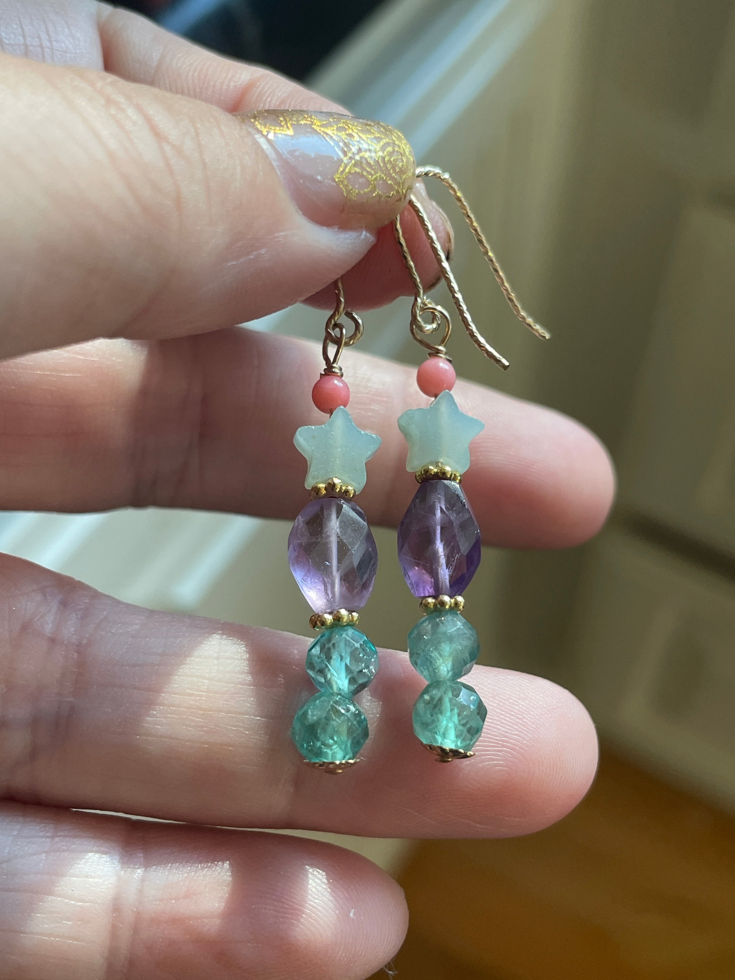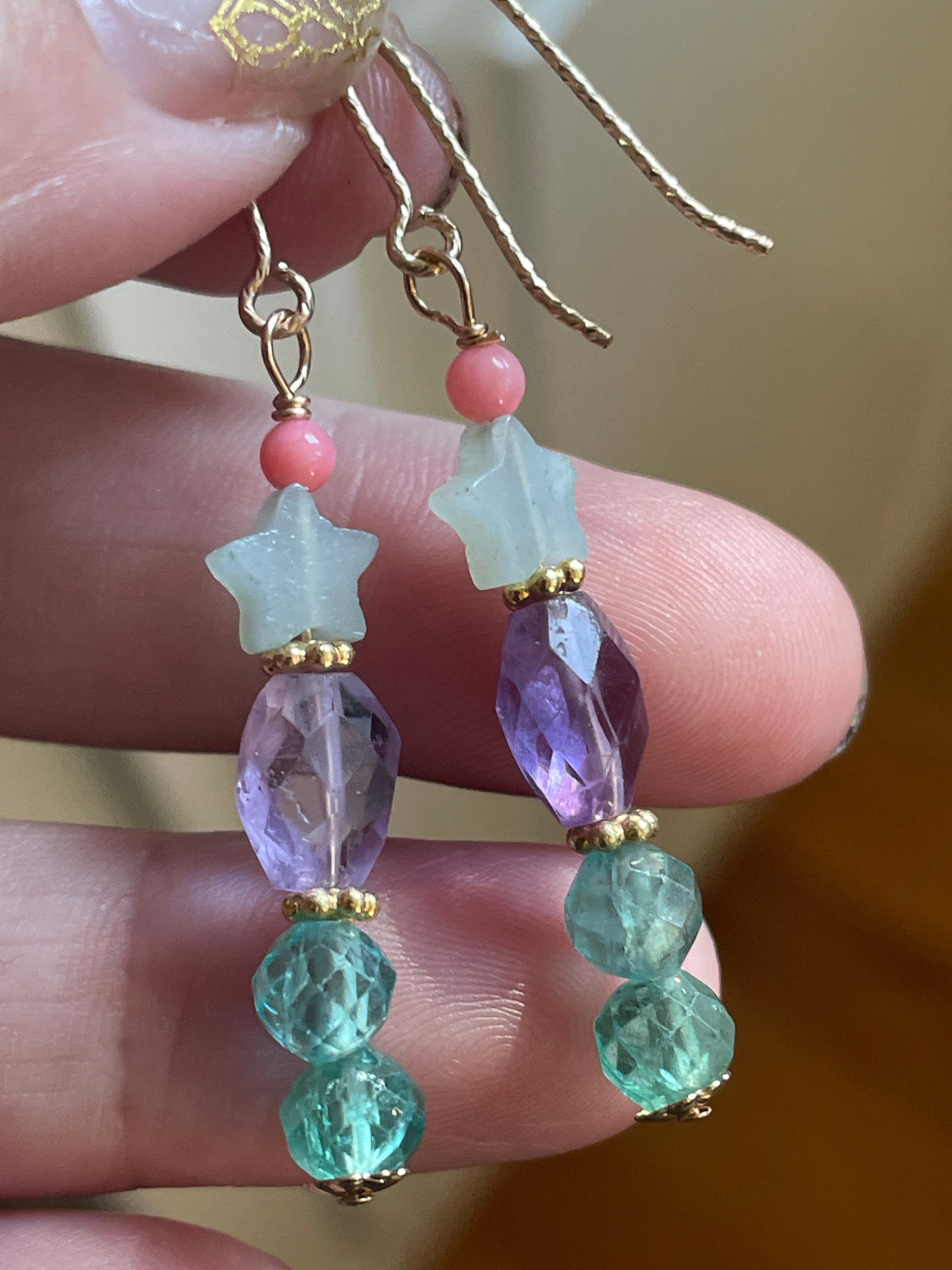 Gorgeous Starry earrings with Amazonite Stars, Amethyst, Apatite and Coral. All findings are gold filled. Earrings measure 1.75 inches.