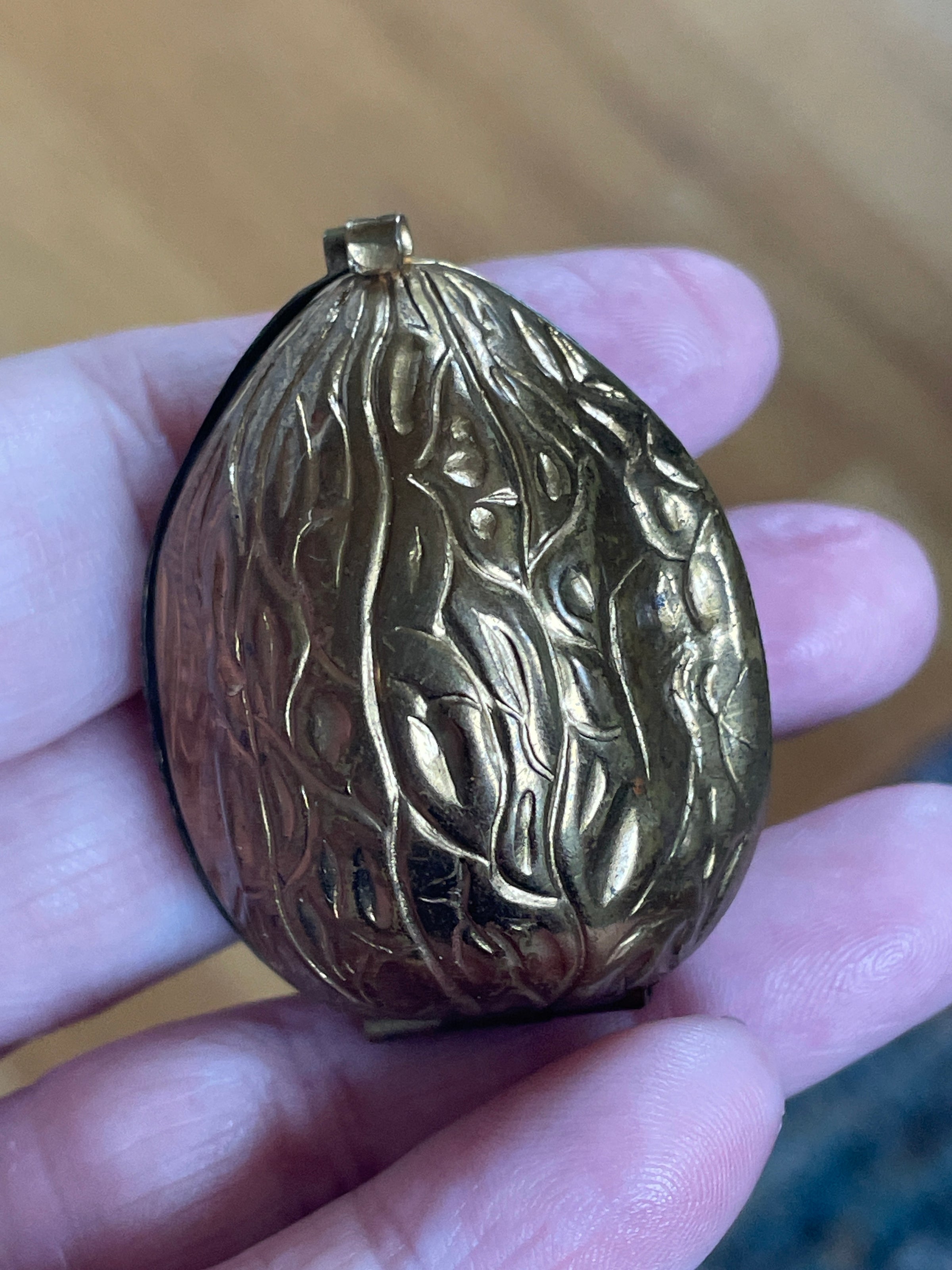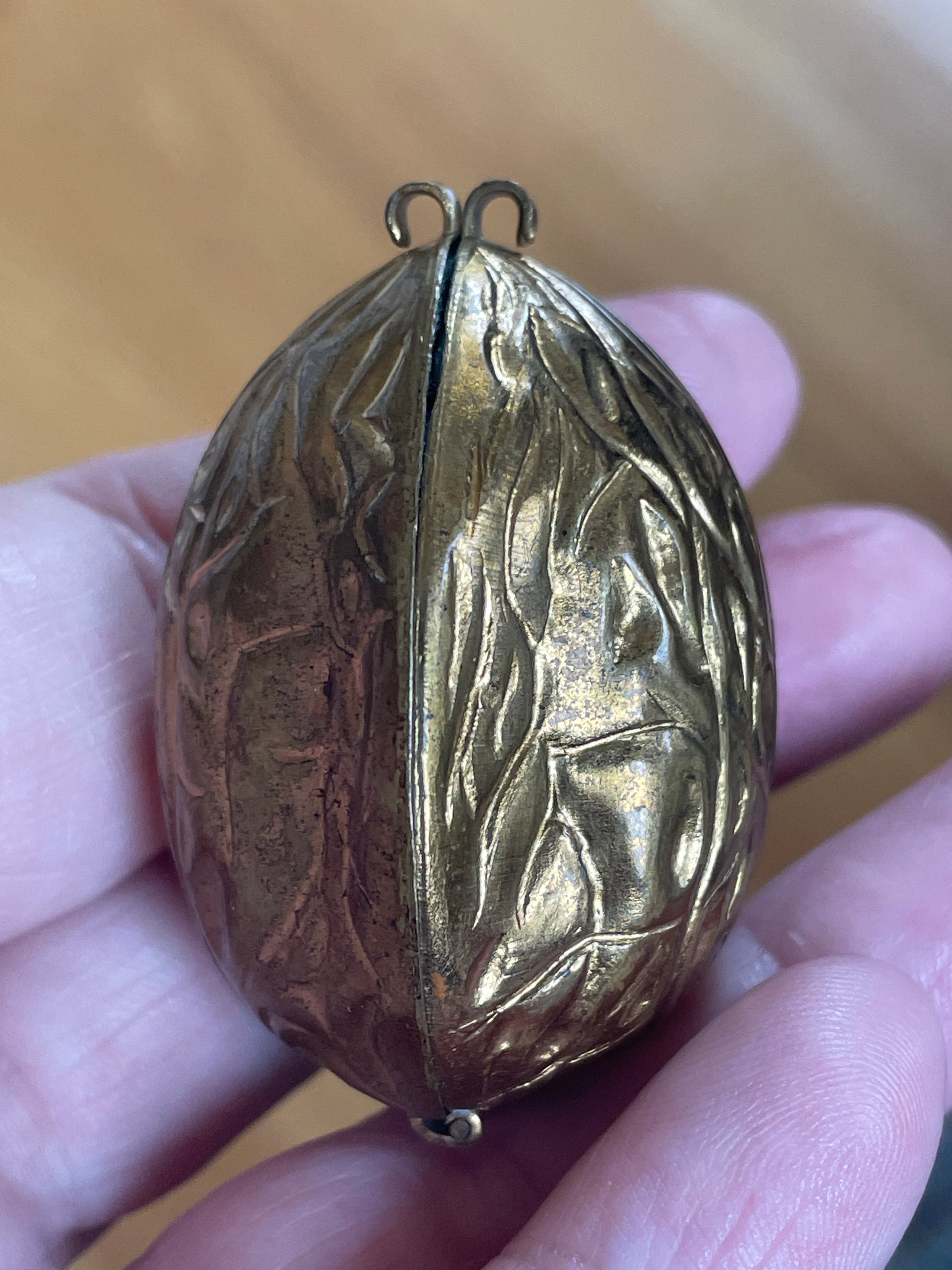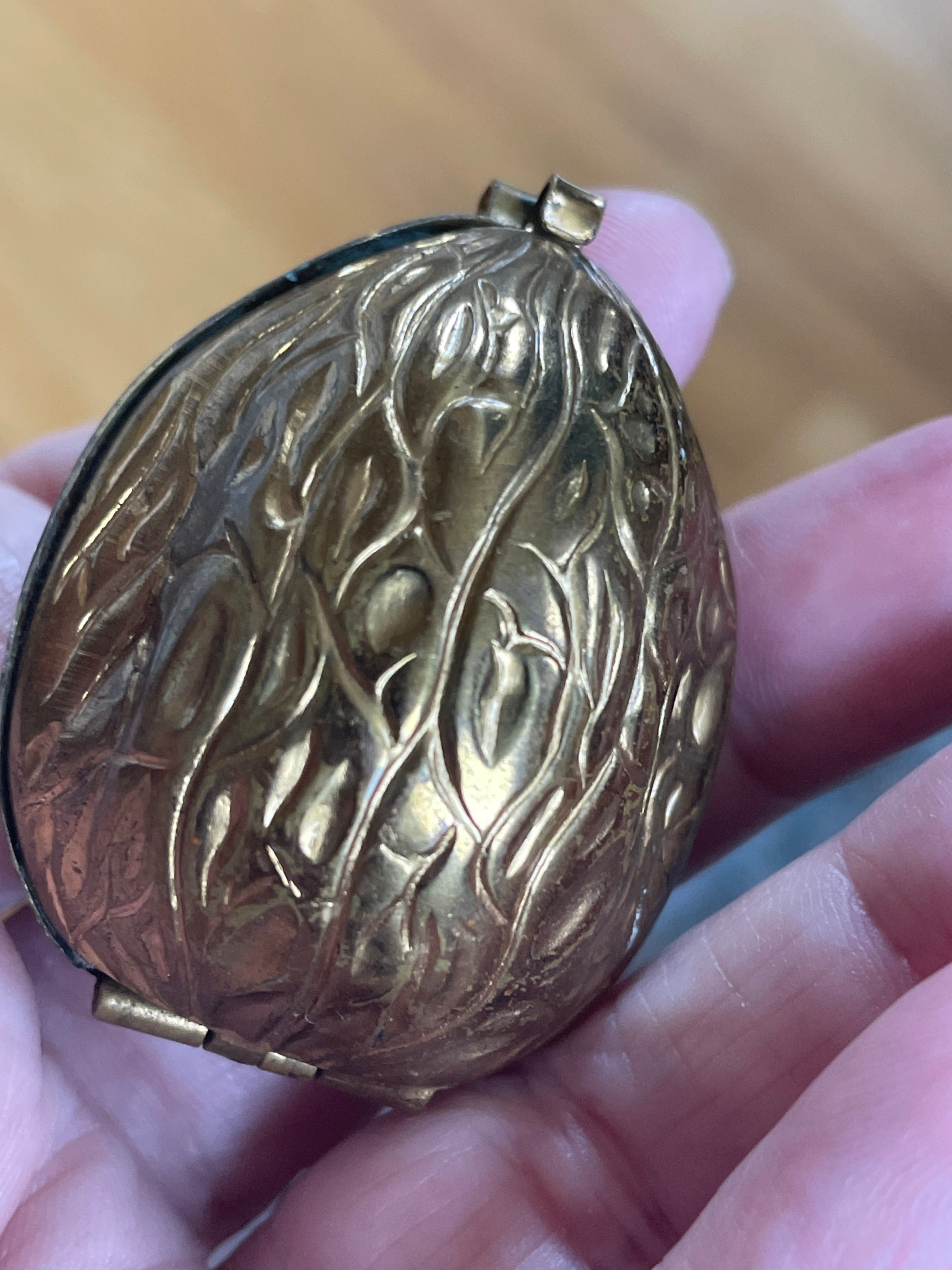 Adorable vintage Walnut opening box. Likely previously had sewing materials inside. Measures approx 1.75 inches x just over 1 inch. Blue felt interior. Closes and has loops at top so could be worn as larger locket. Does not snap closed but likely never intended to. So adorable!