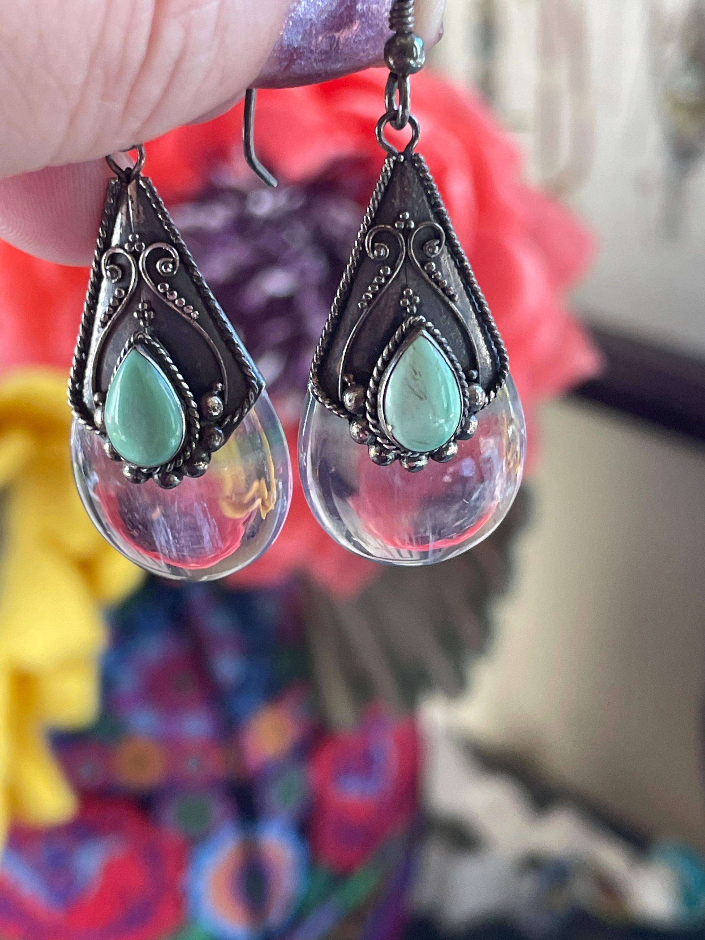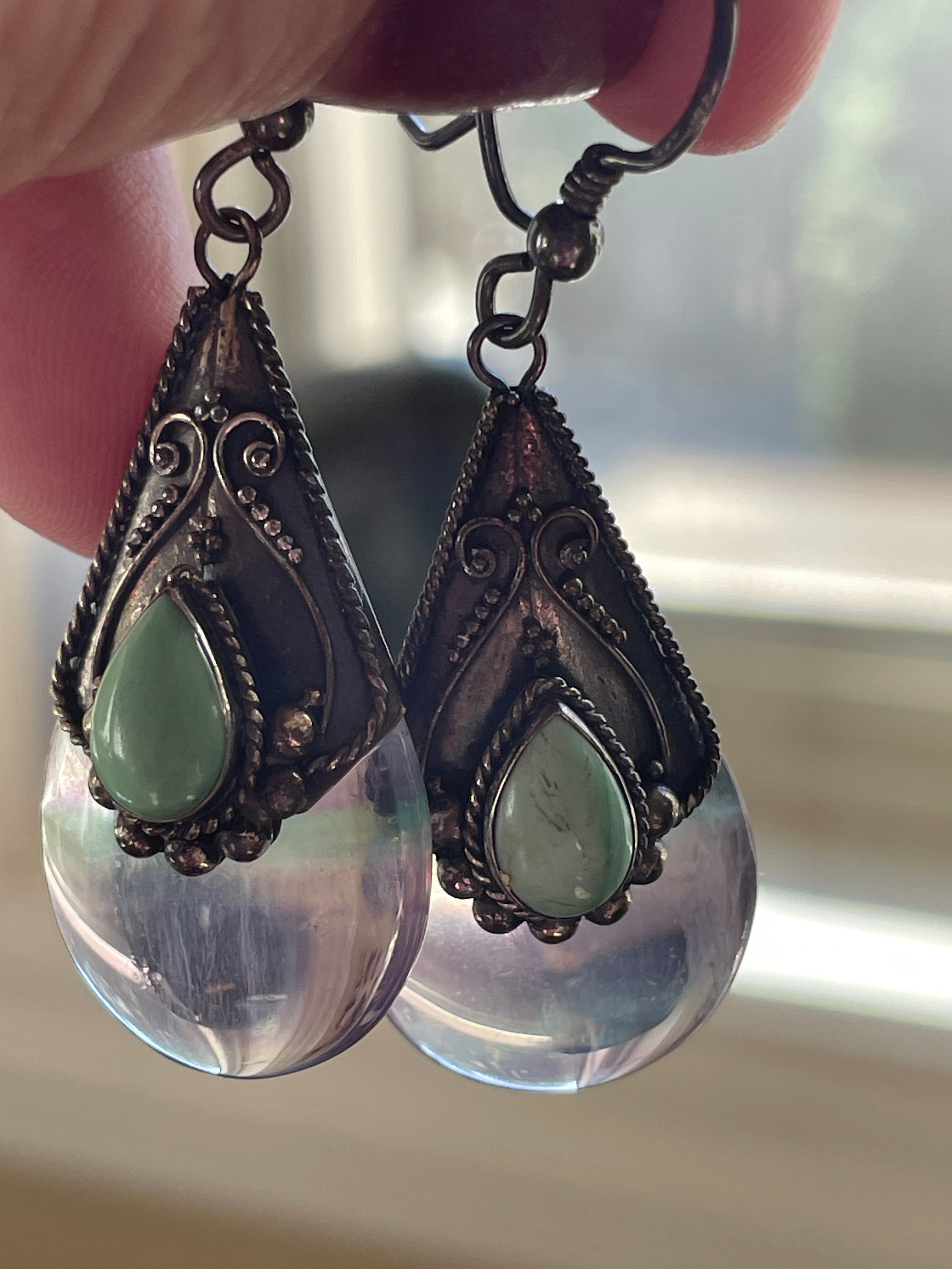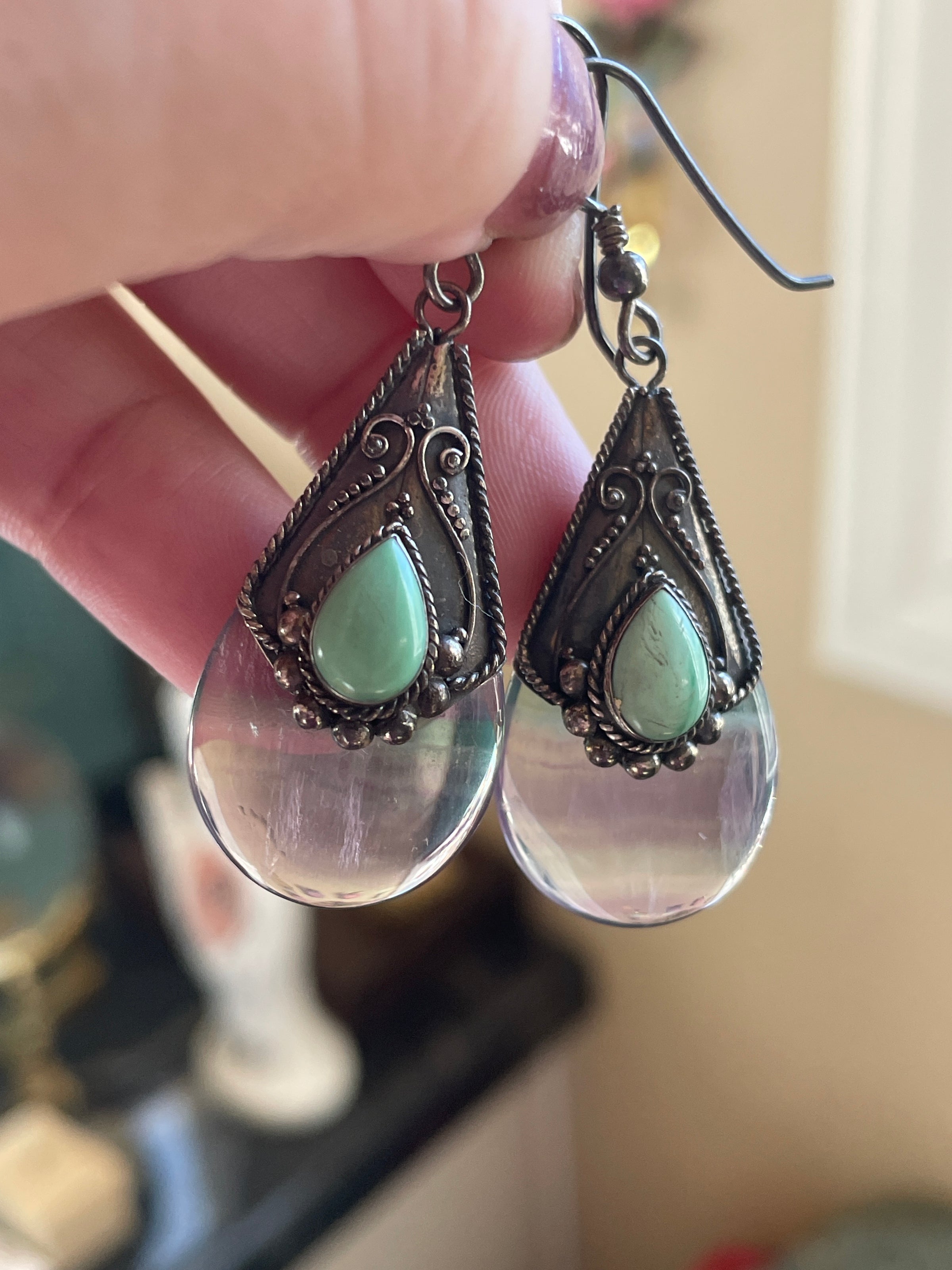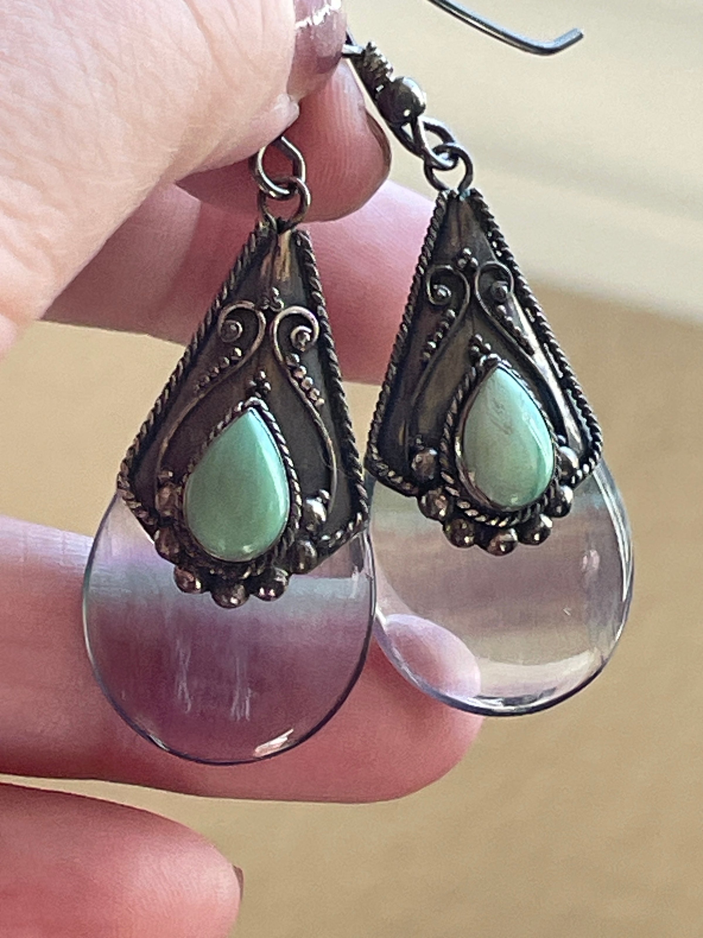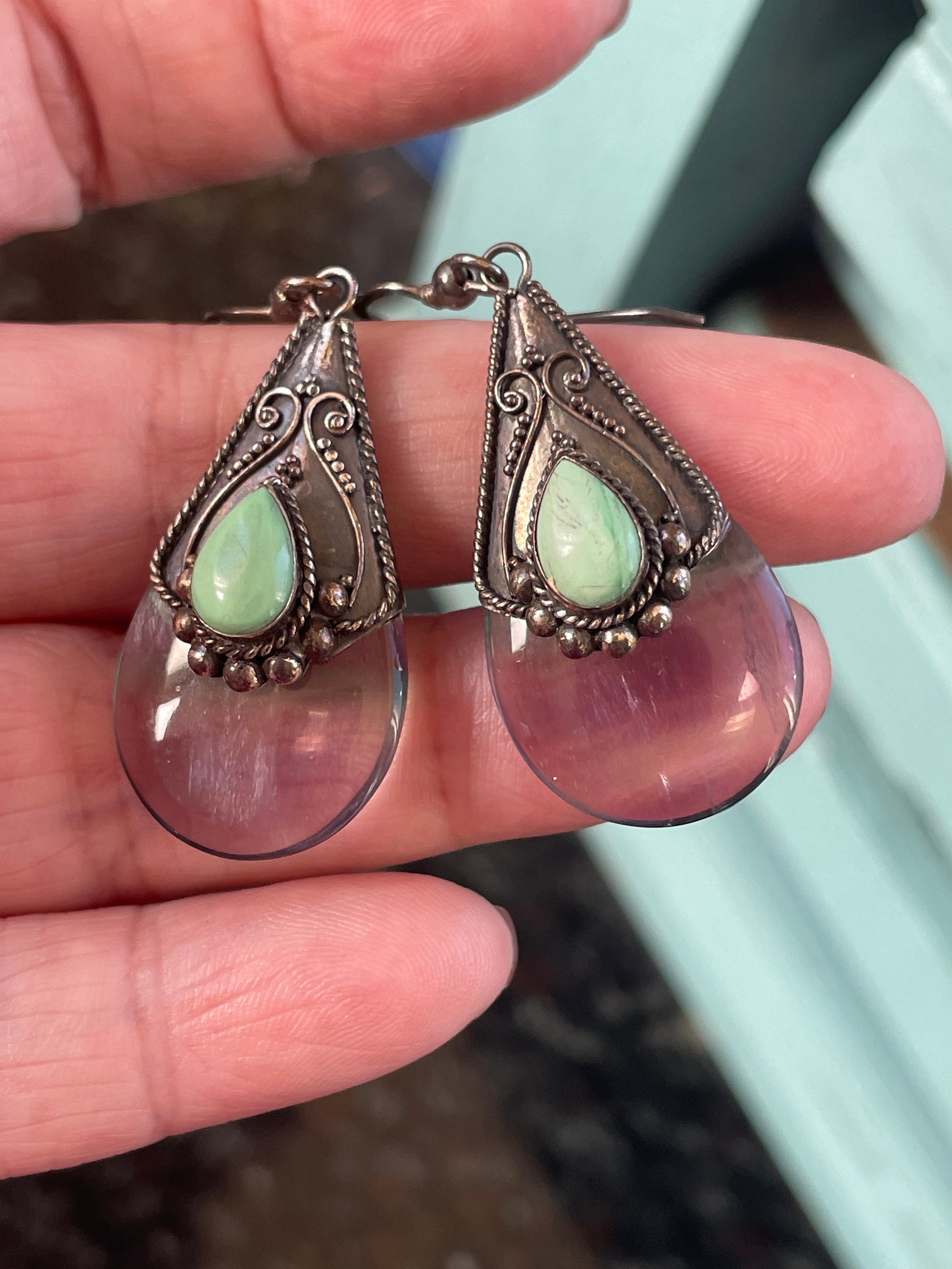 Stunning large luminous Fluorite earrings with Turquoise accents in sterling silver. These measure just under 2 inches. Stamped for sterling on back of earrings.