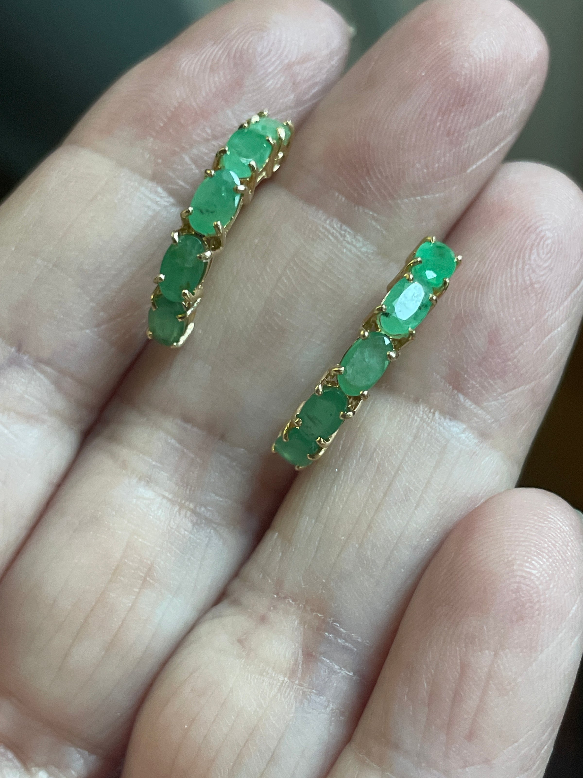 Stunning rare Emerald 1/2 hoop earrings in 14k gold.  Luminous stones with natural inclusions.  These measure just over 0.75 inches.  Stones are approximately 4mm x 2mm.  Stamped 14k on posts and backs.