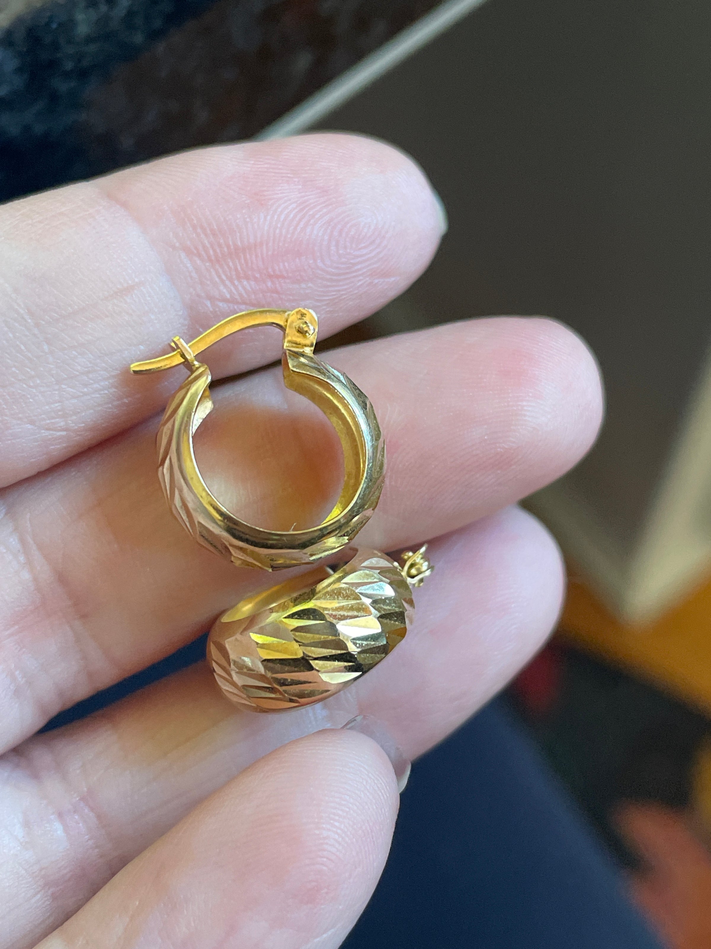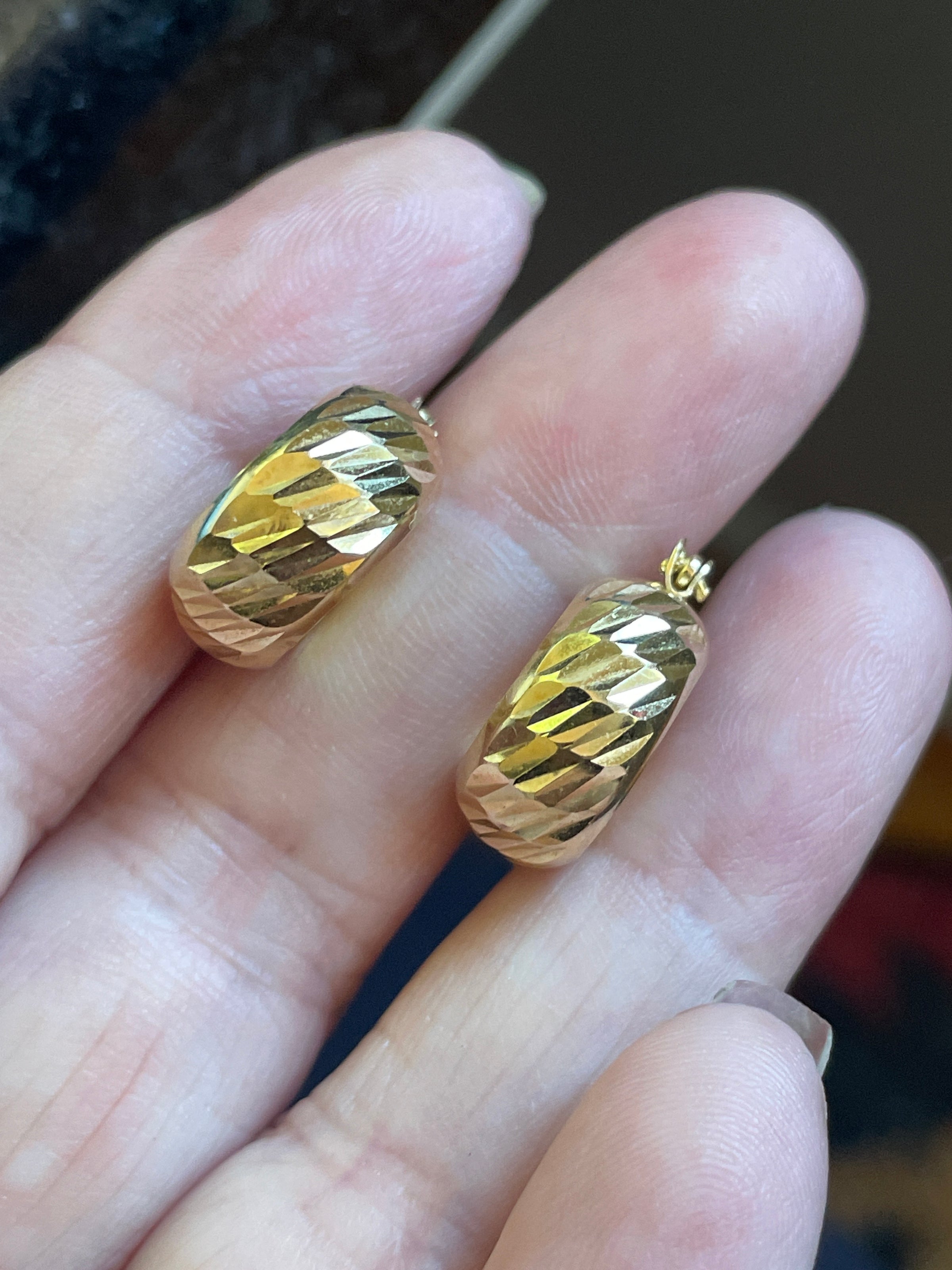 Fabulous chunky engraved gold hoops with shimmery pattern. These measure approx 15mm. Lightweight and comfortable for daily wear. Stamped 14k inside hoops.