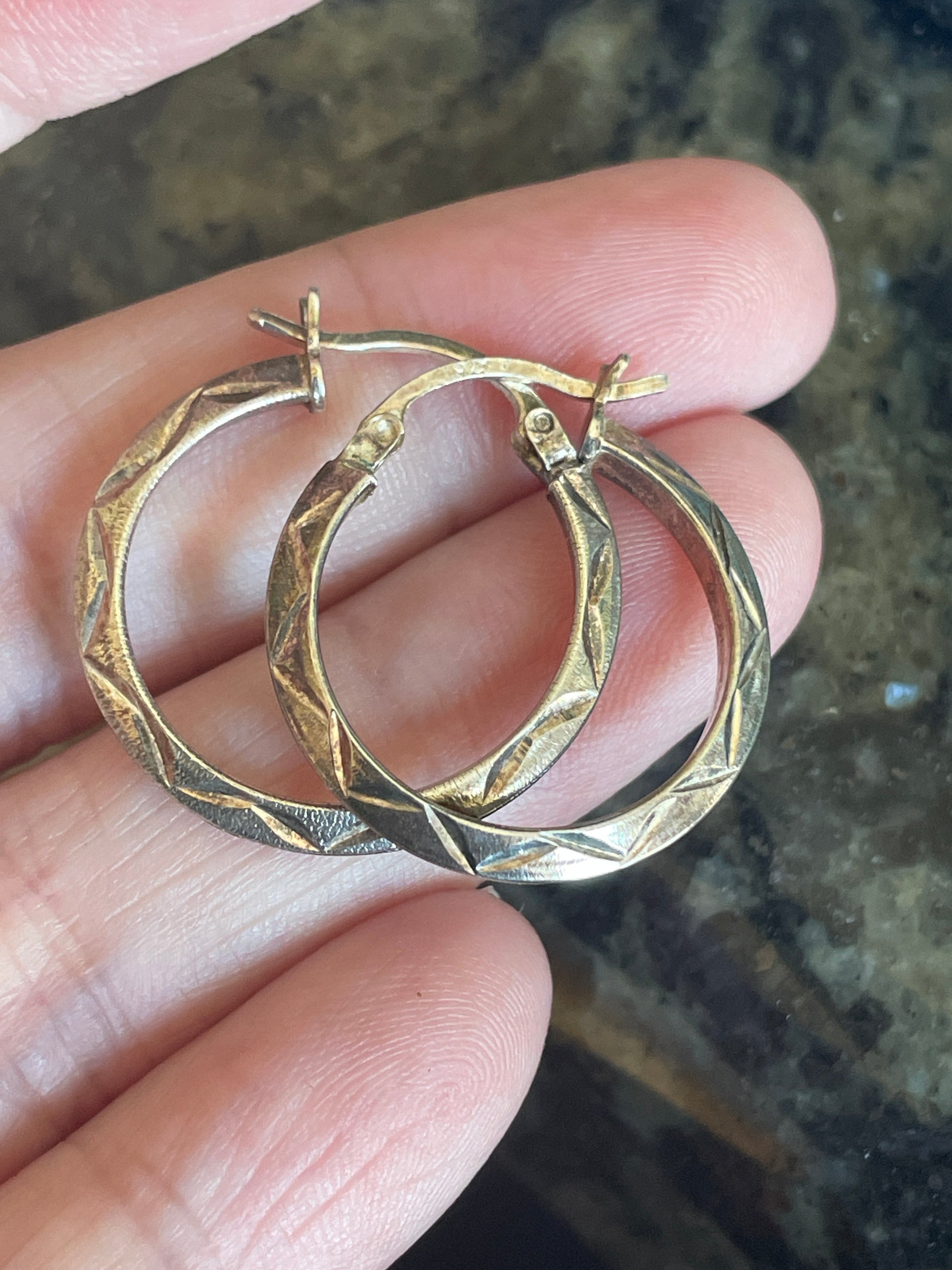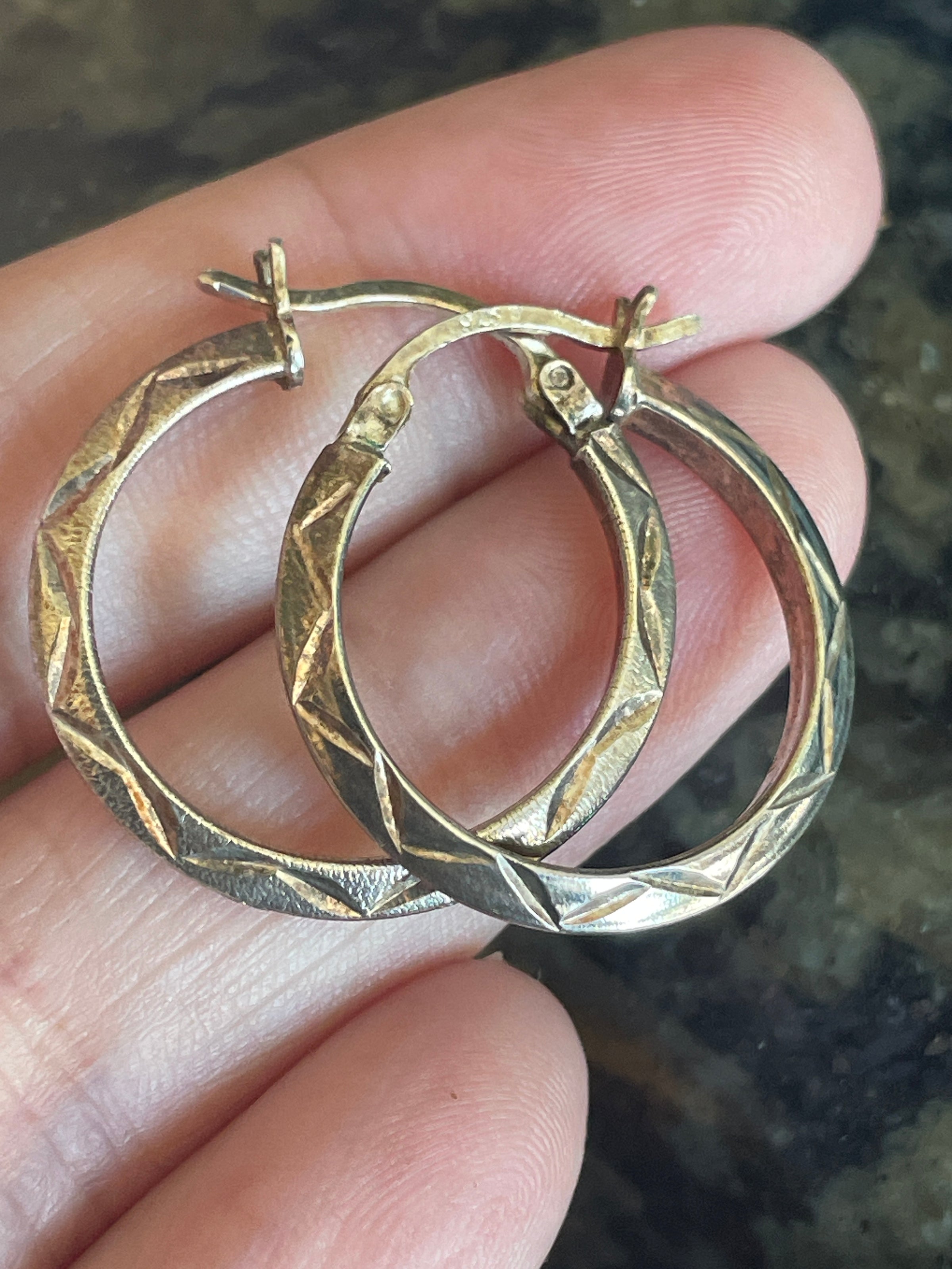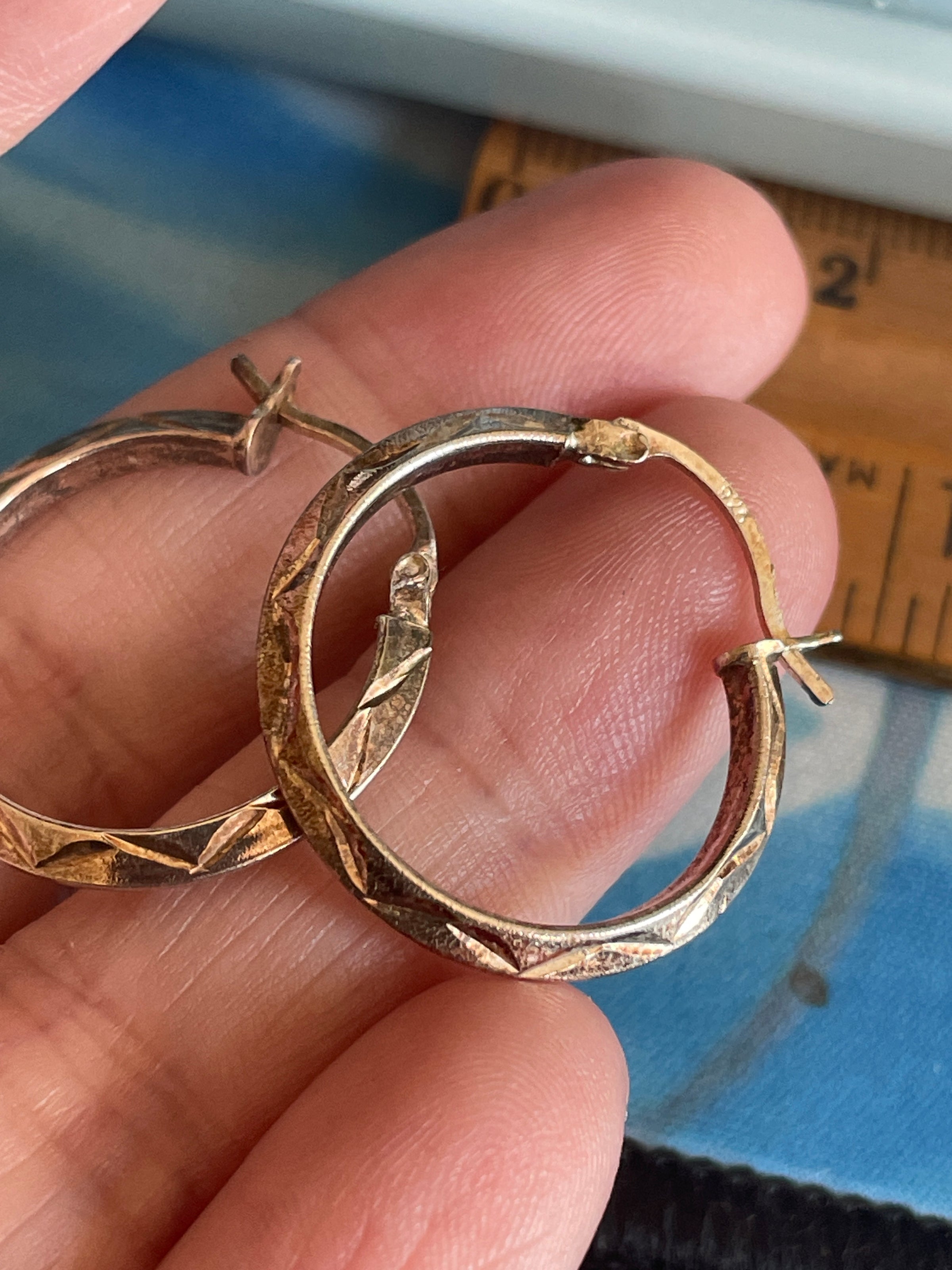 Lovely engraved hoop earrings in sterling silver. These measure just under 1 inches. Patterned on both sides. Stamped 925 on both sides