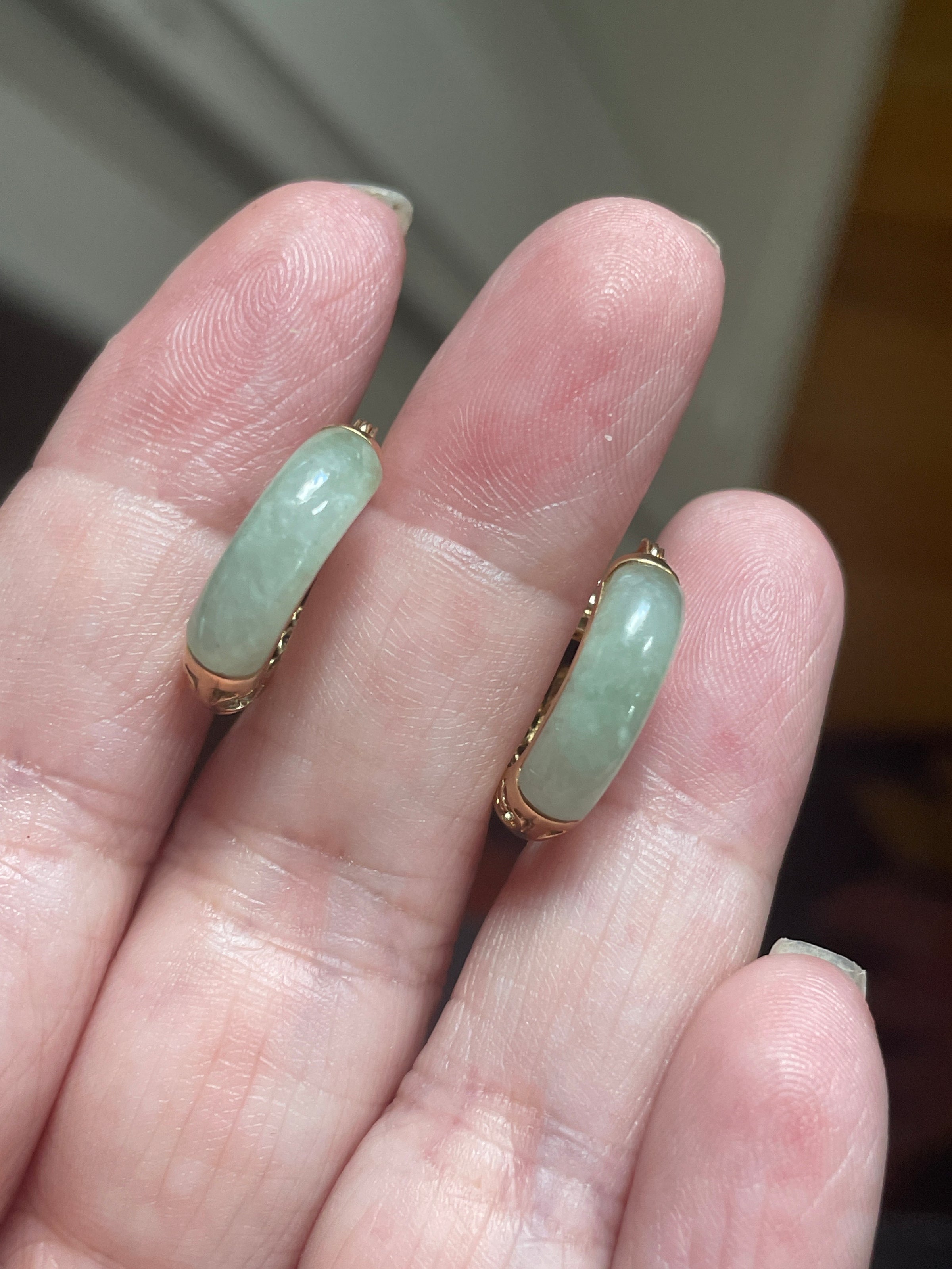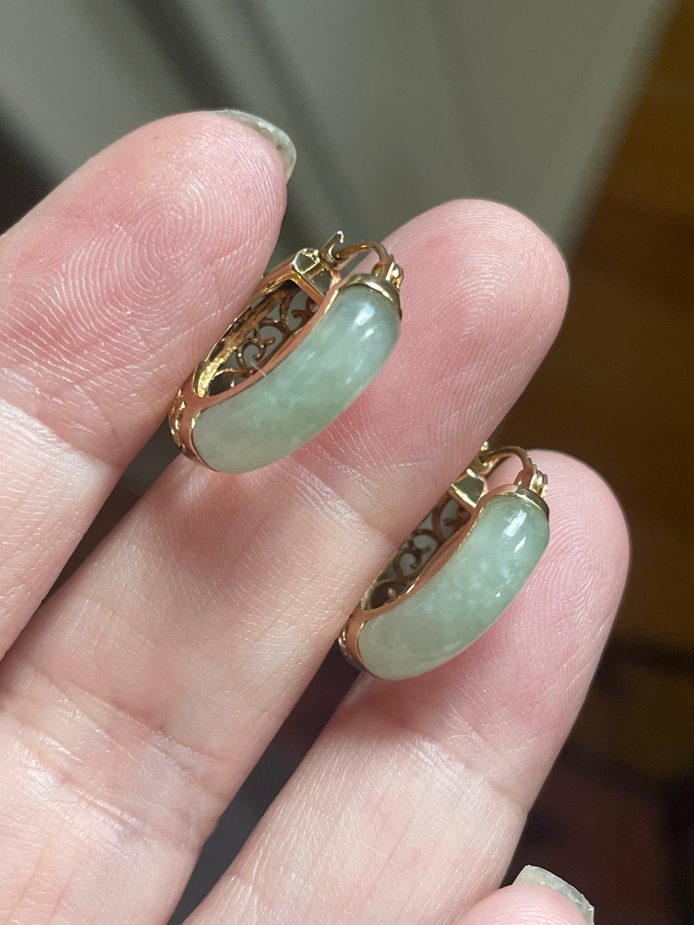Fabulous super well made Jade hoop earrings with filigree on the back side. These look stunning from every angle. They measure just under 0.75 inches. Stamped 14k on earwires.
