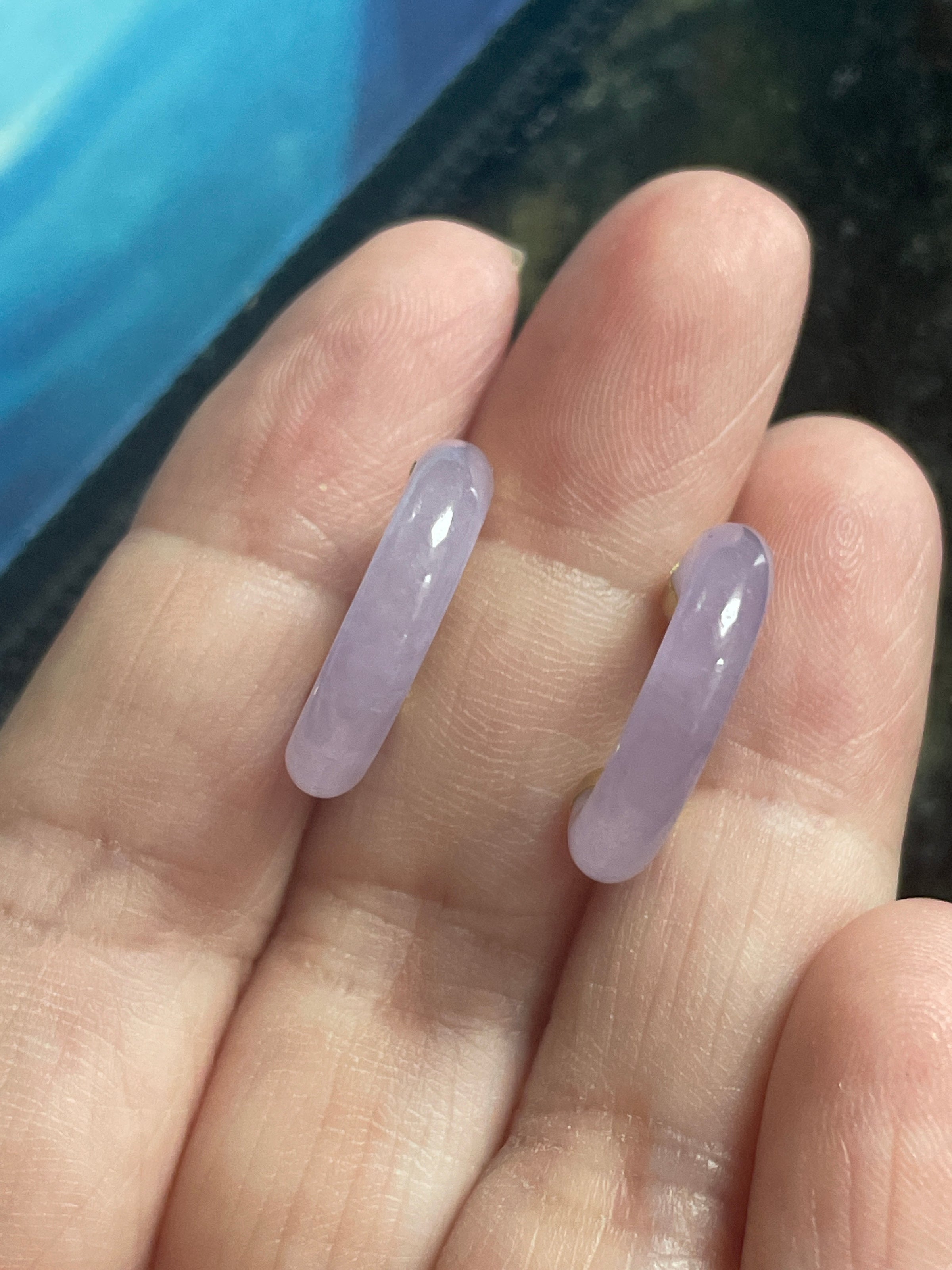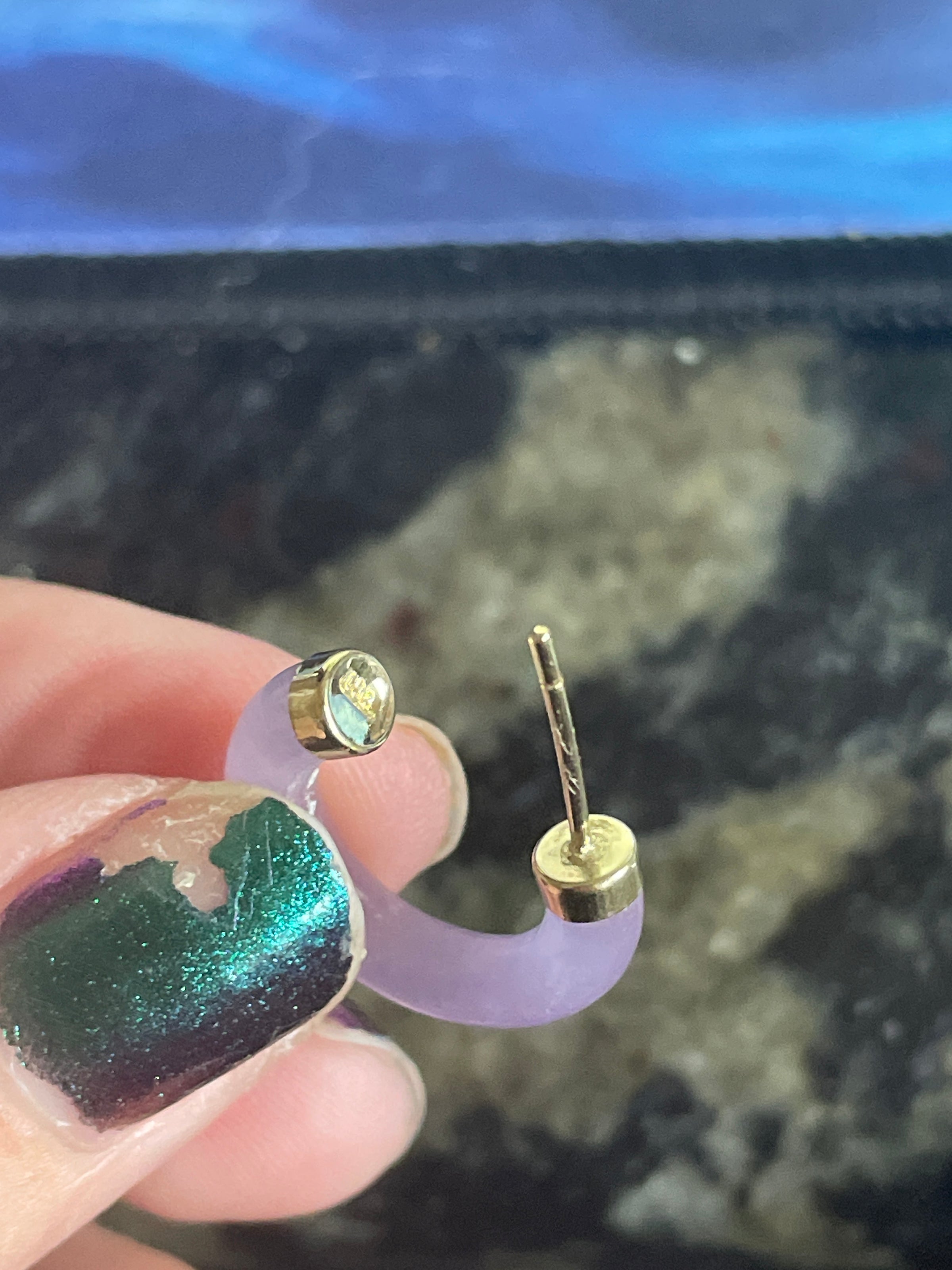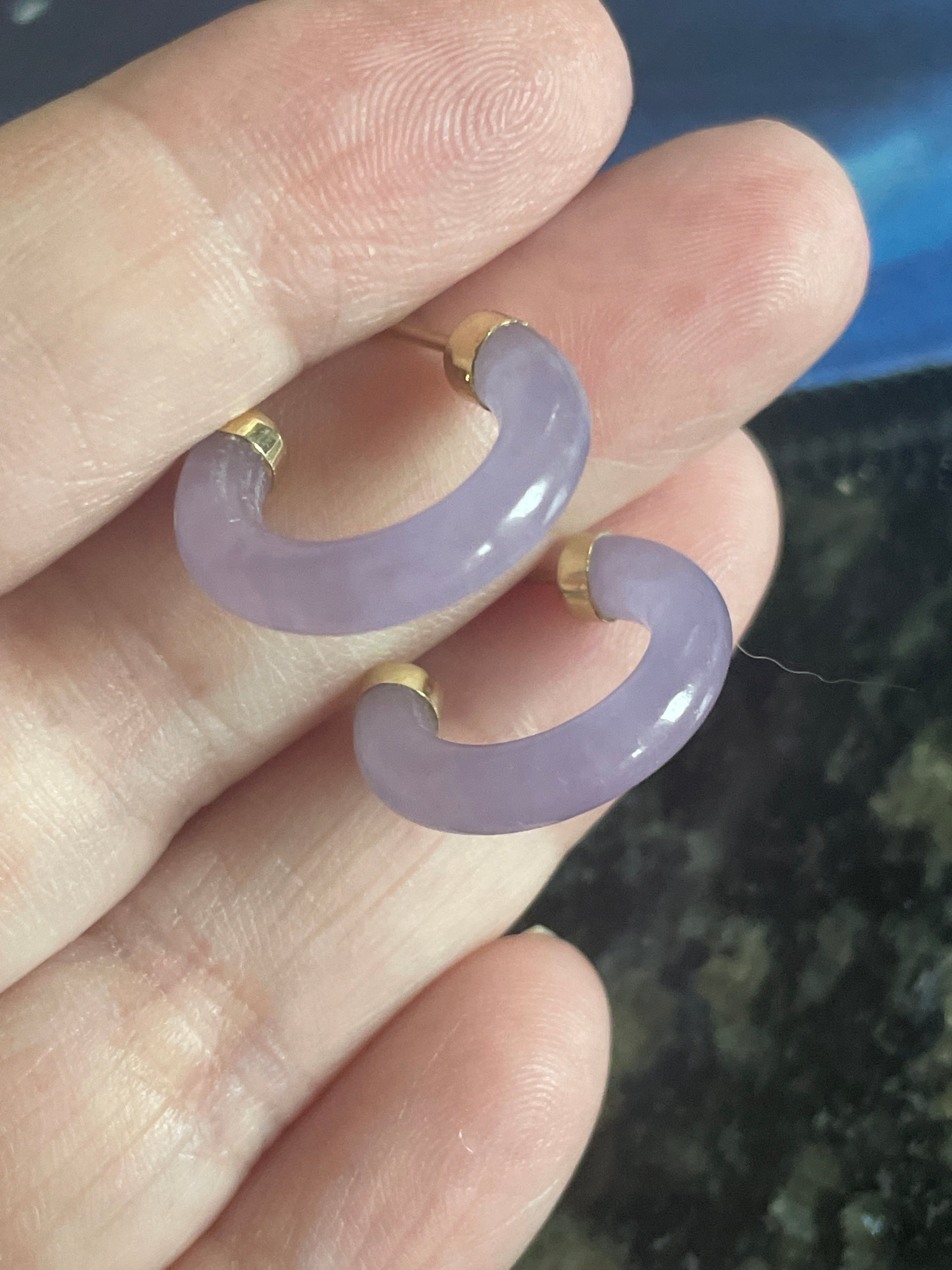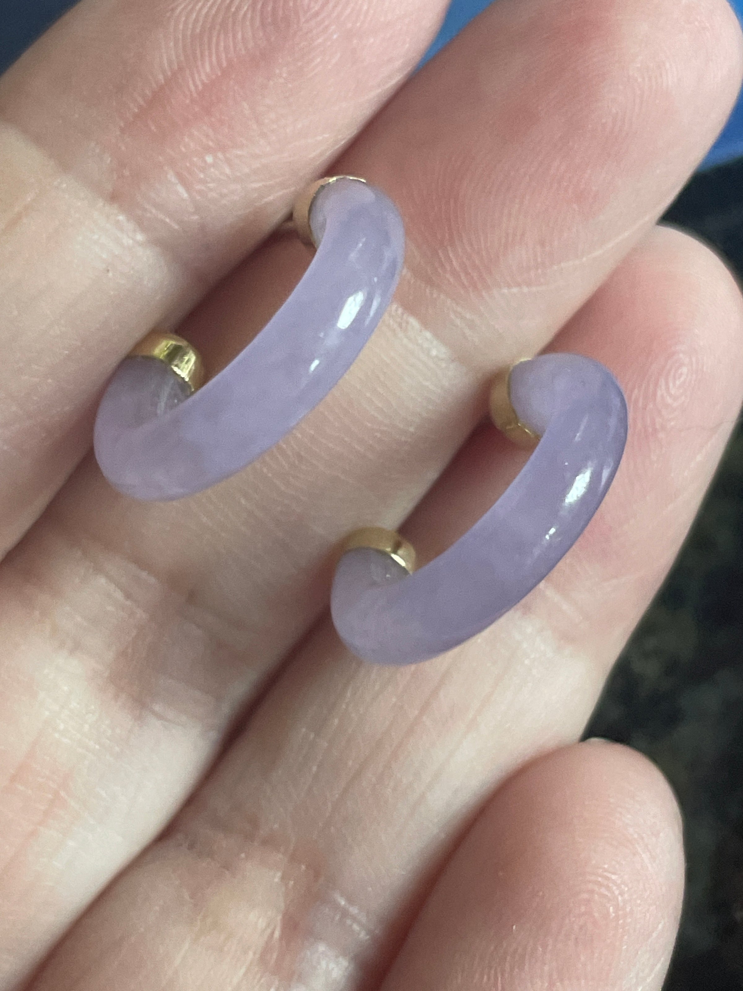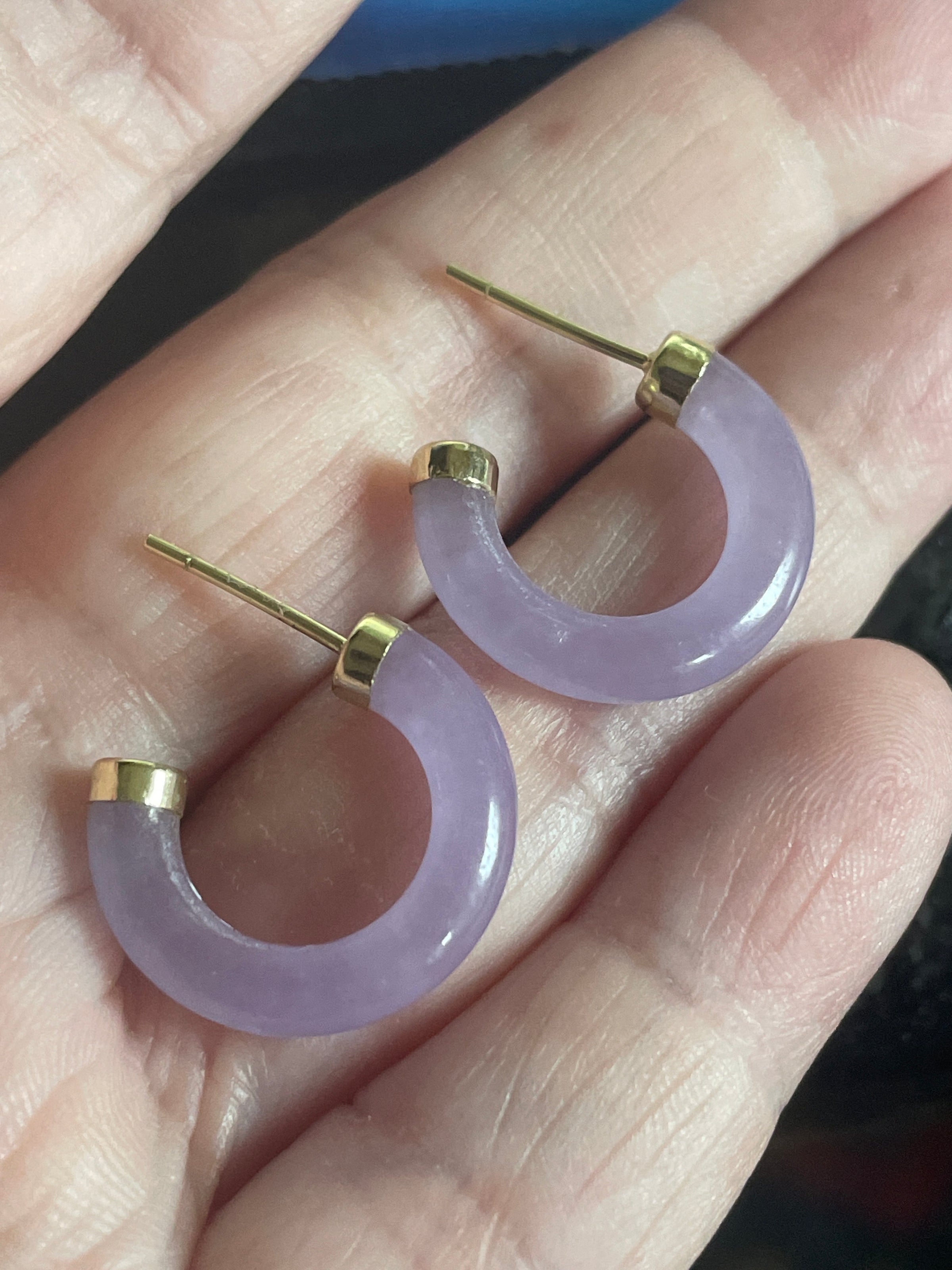 Luminous vintage Lavender Jade hoop earrings with 14k gold. They are stamped 14k and 585. They measure around 0.75 inches.