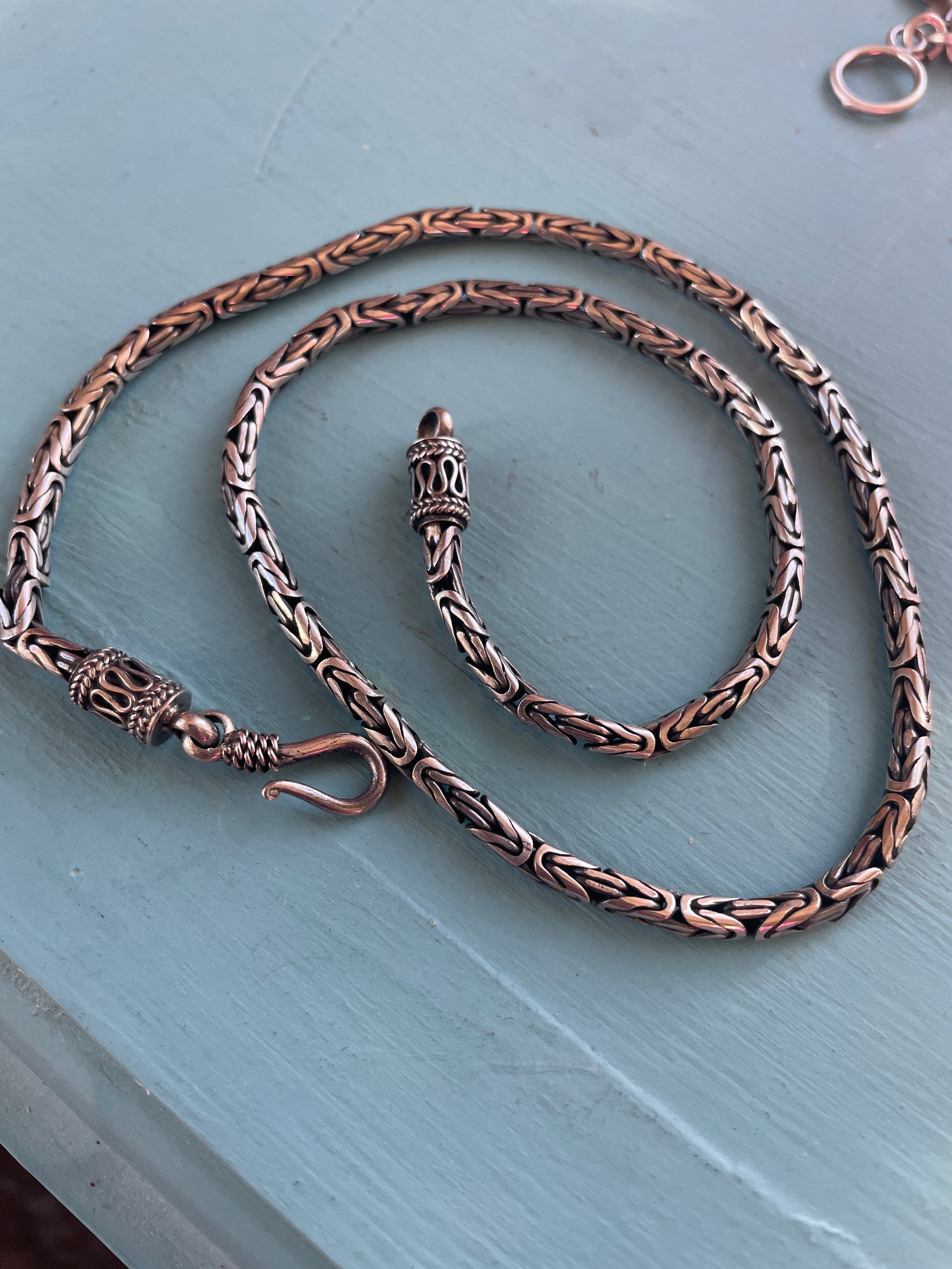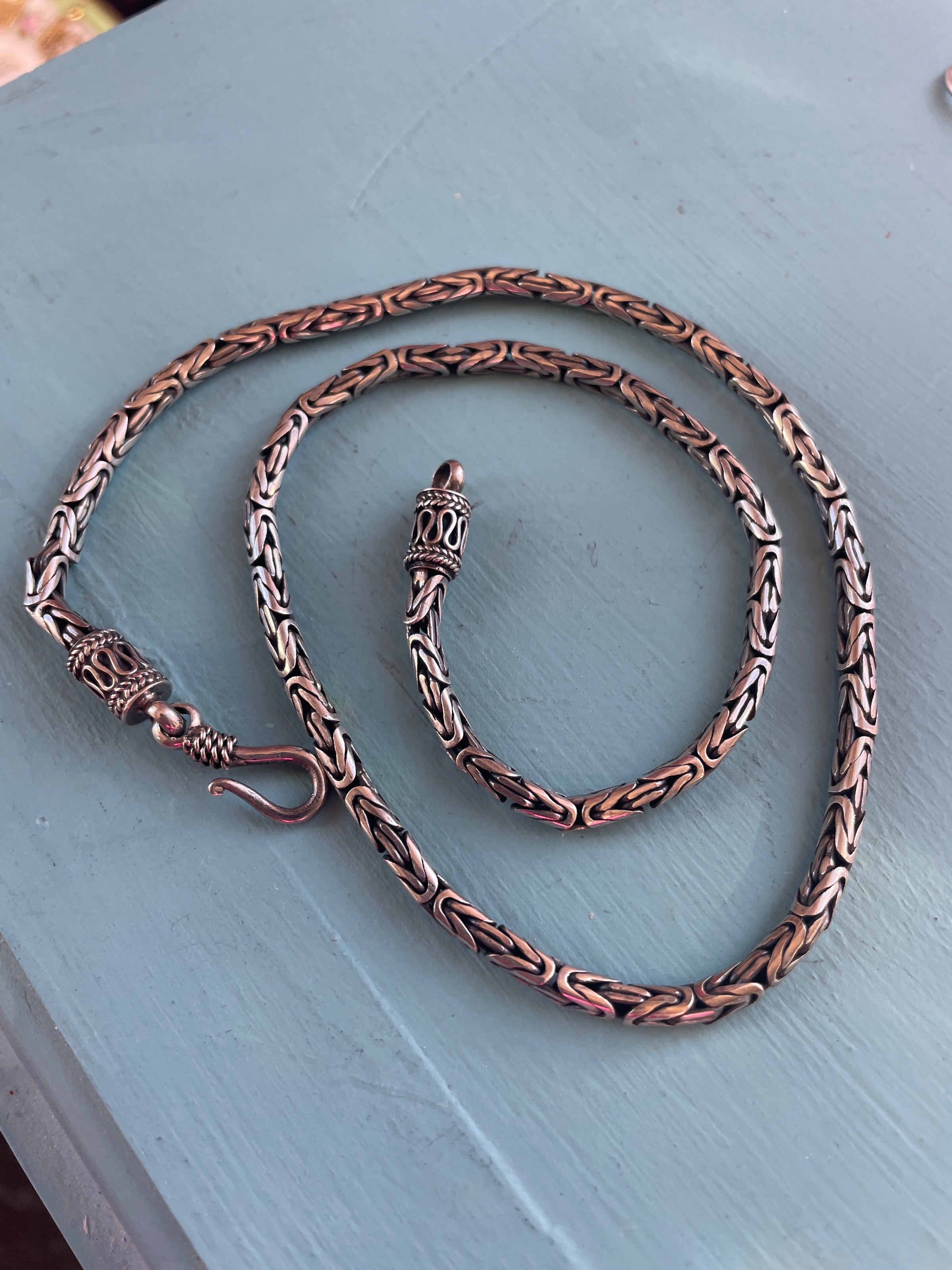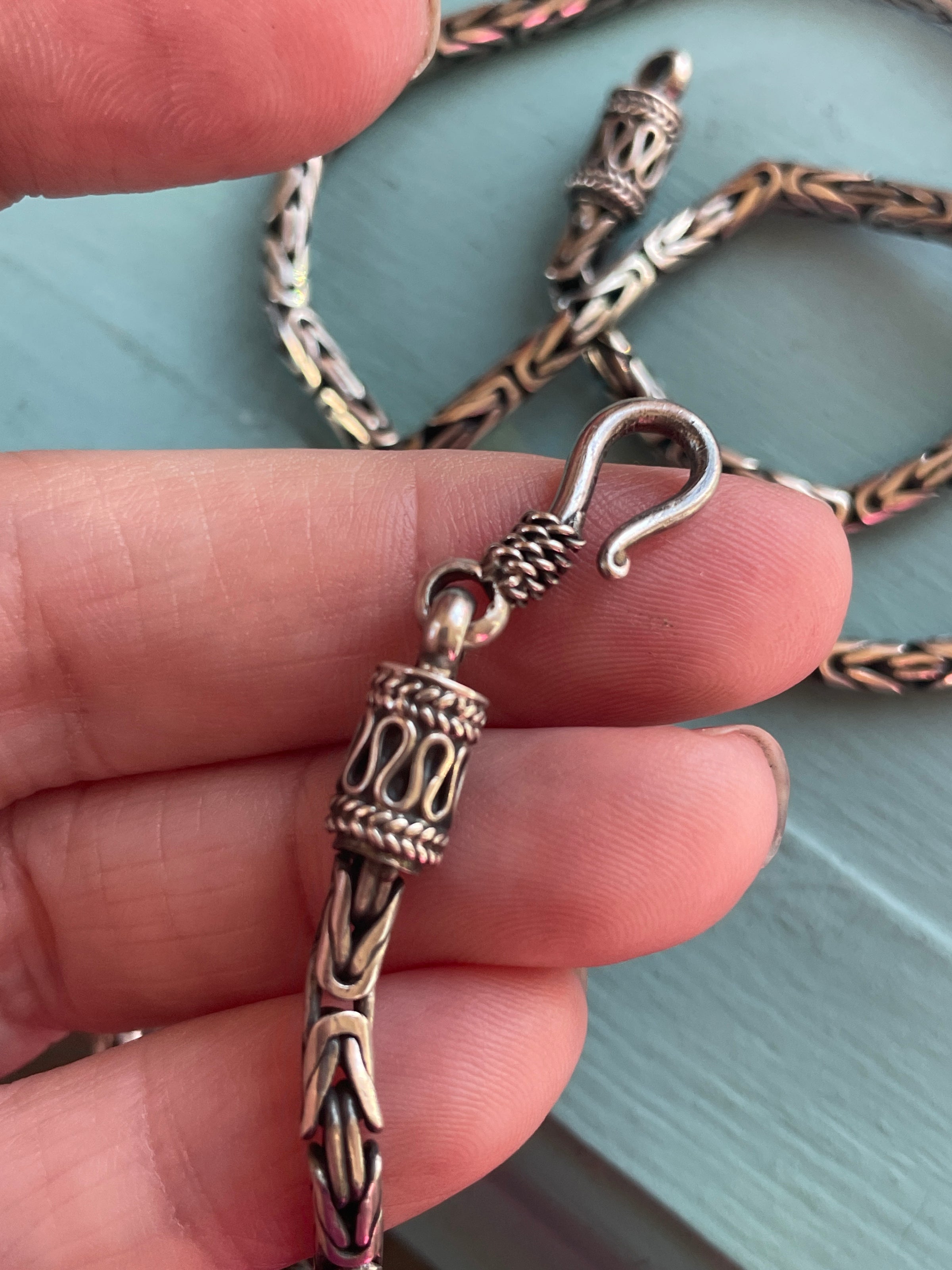 Fabulous vintage Byzantine chain in sterling silver.  Chain measures 18 inches.  Gorgeous design on links and near clasp.  Faded 925 mark on clasp.  Weighs 29 grams.