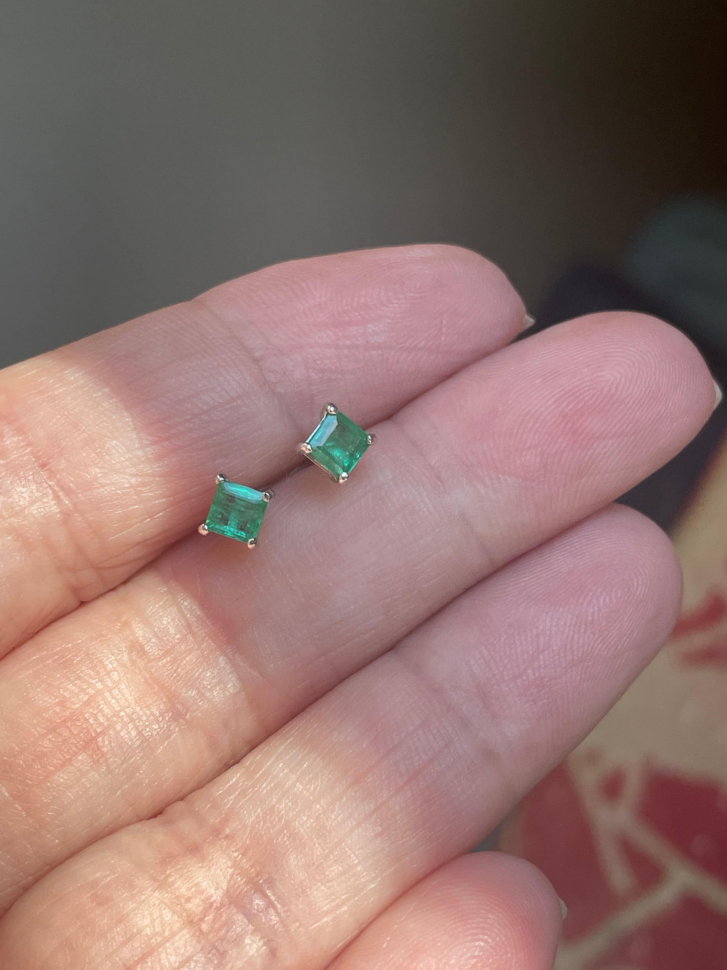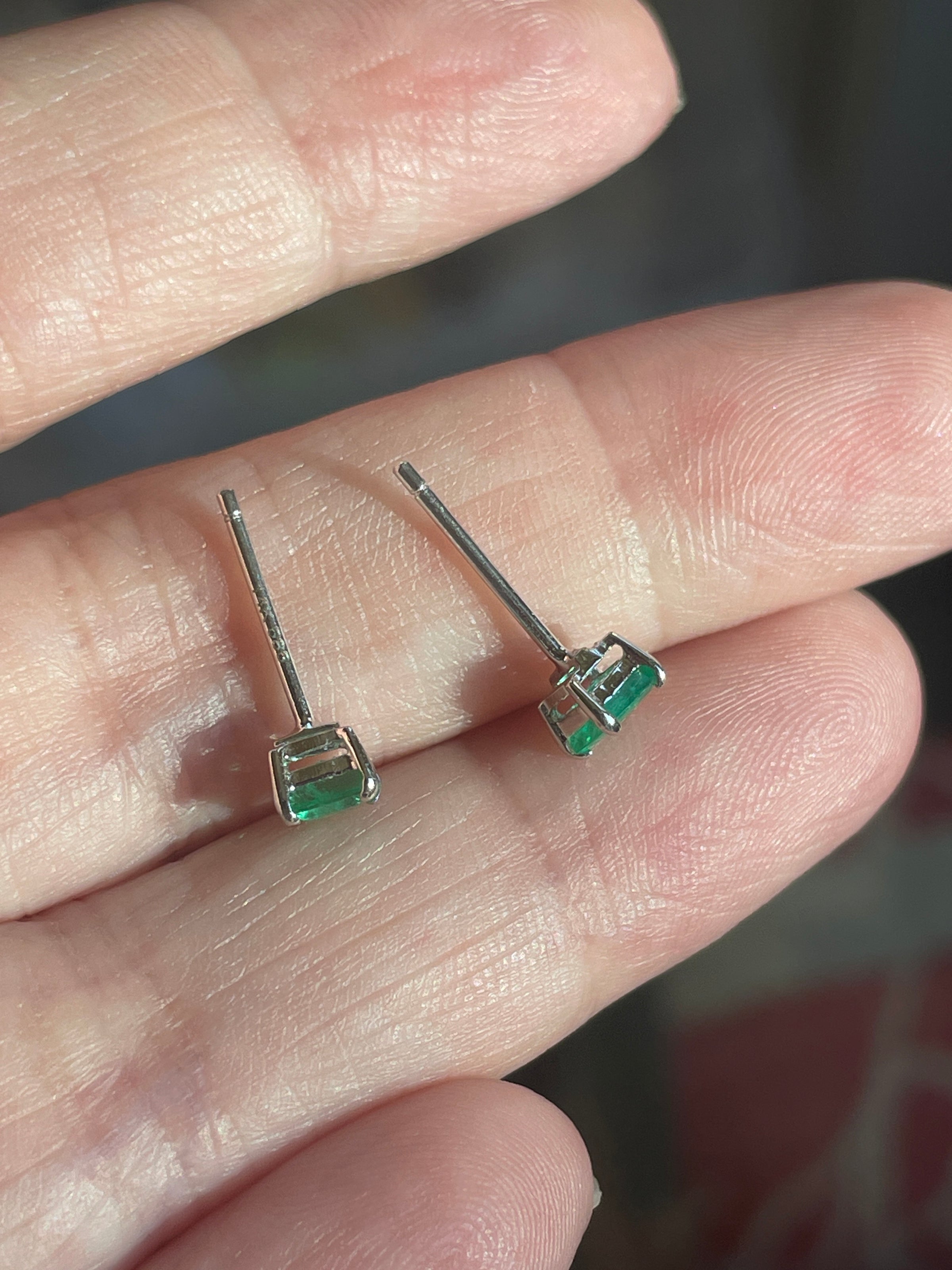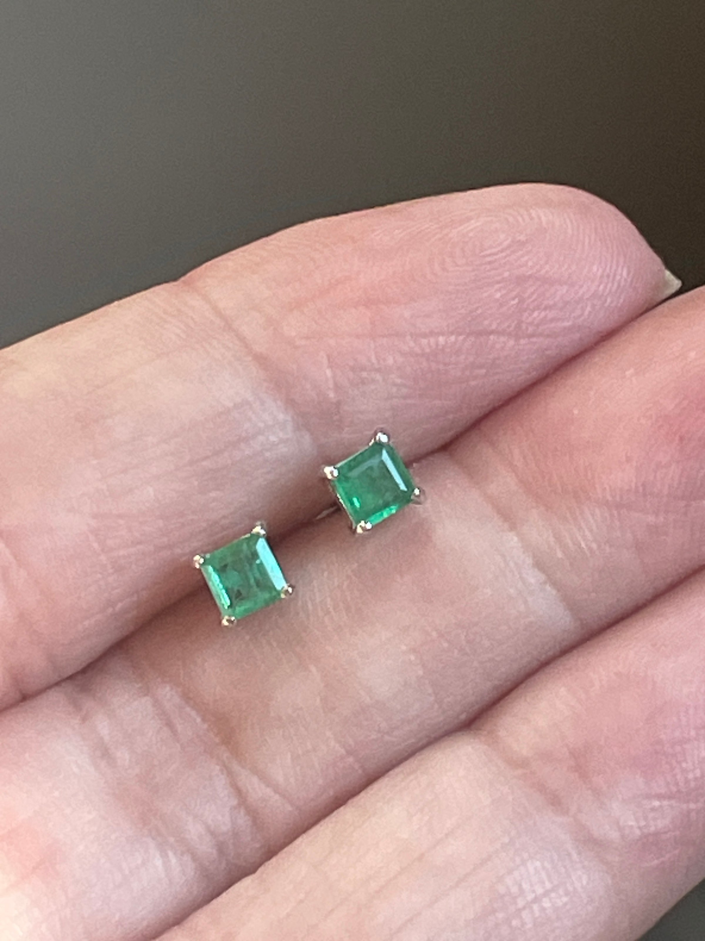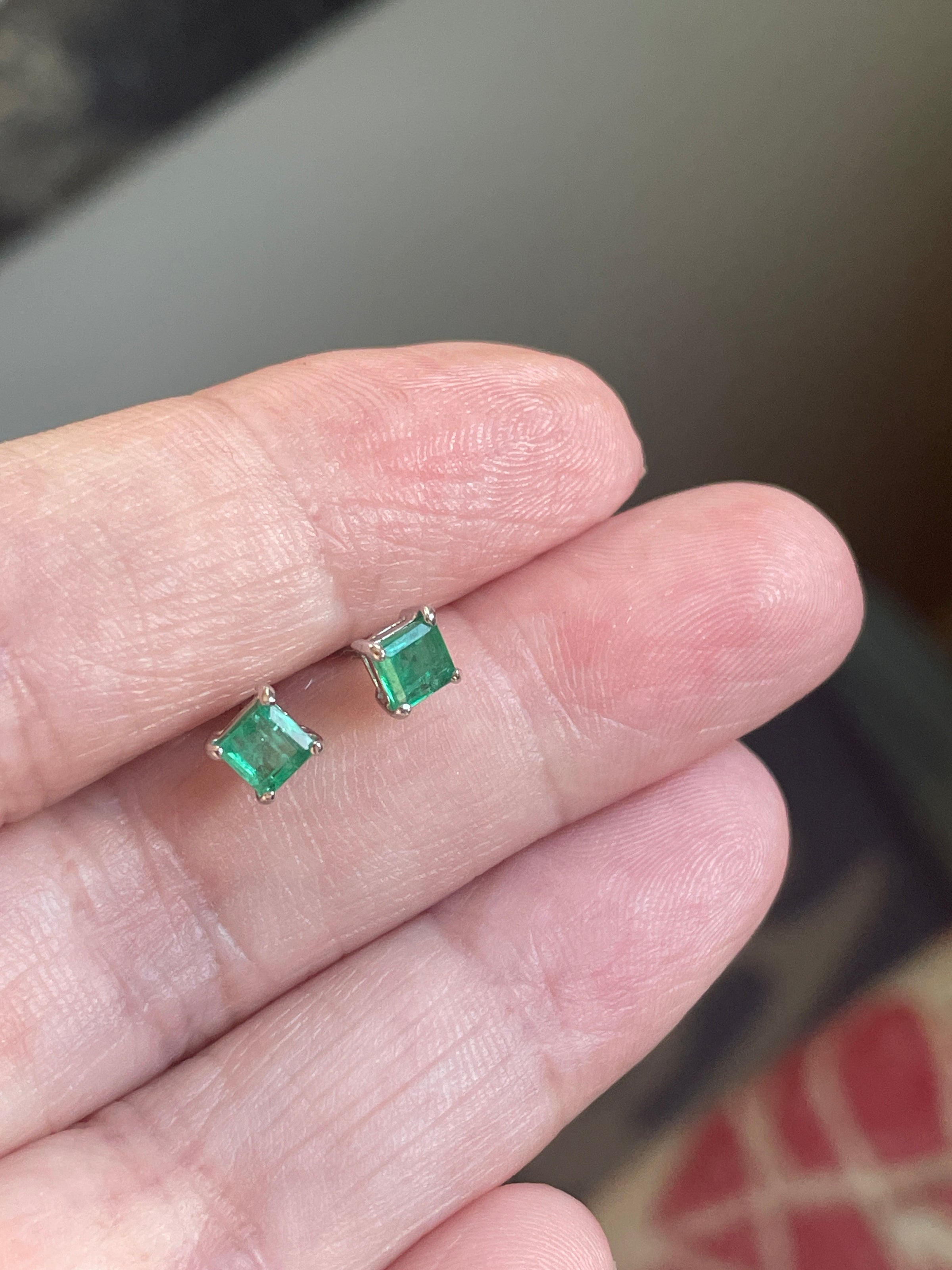 Stunning vintage square cut Emerald earrings in 14k white gold. Stones are natural with inclusions. Color is gorgeous. These come with plastic backs. Stamped 585 and 14k on posts.