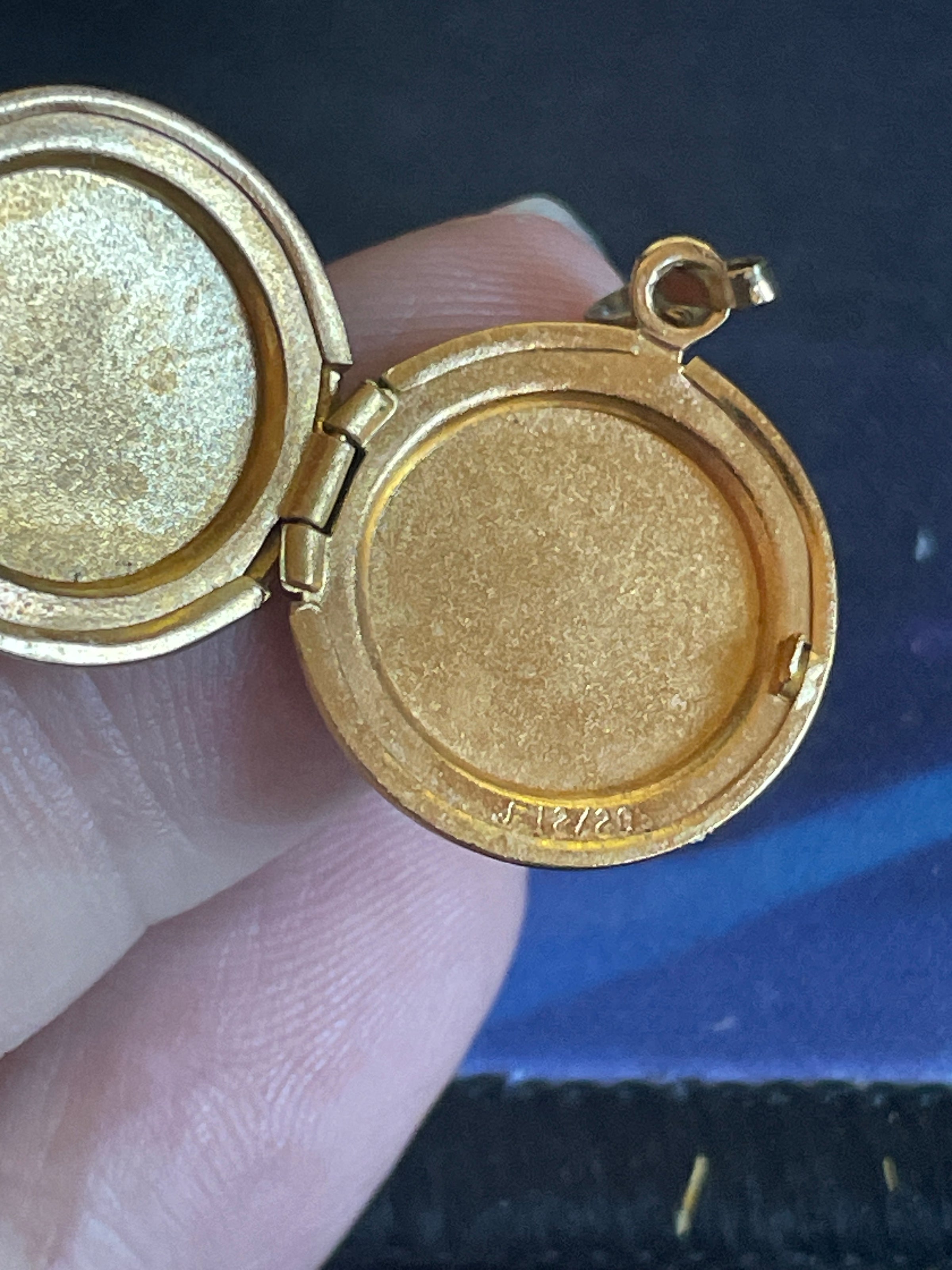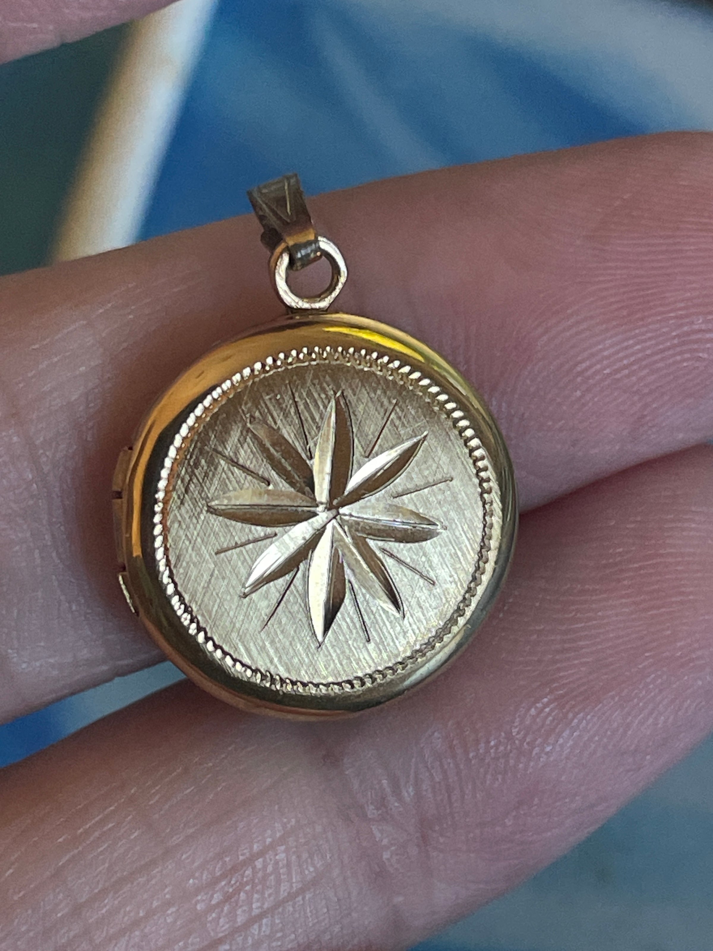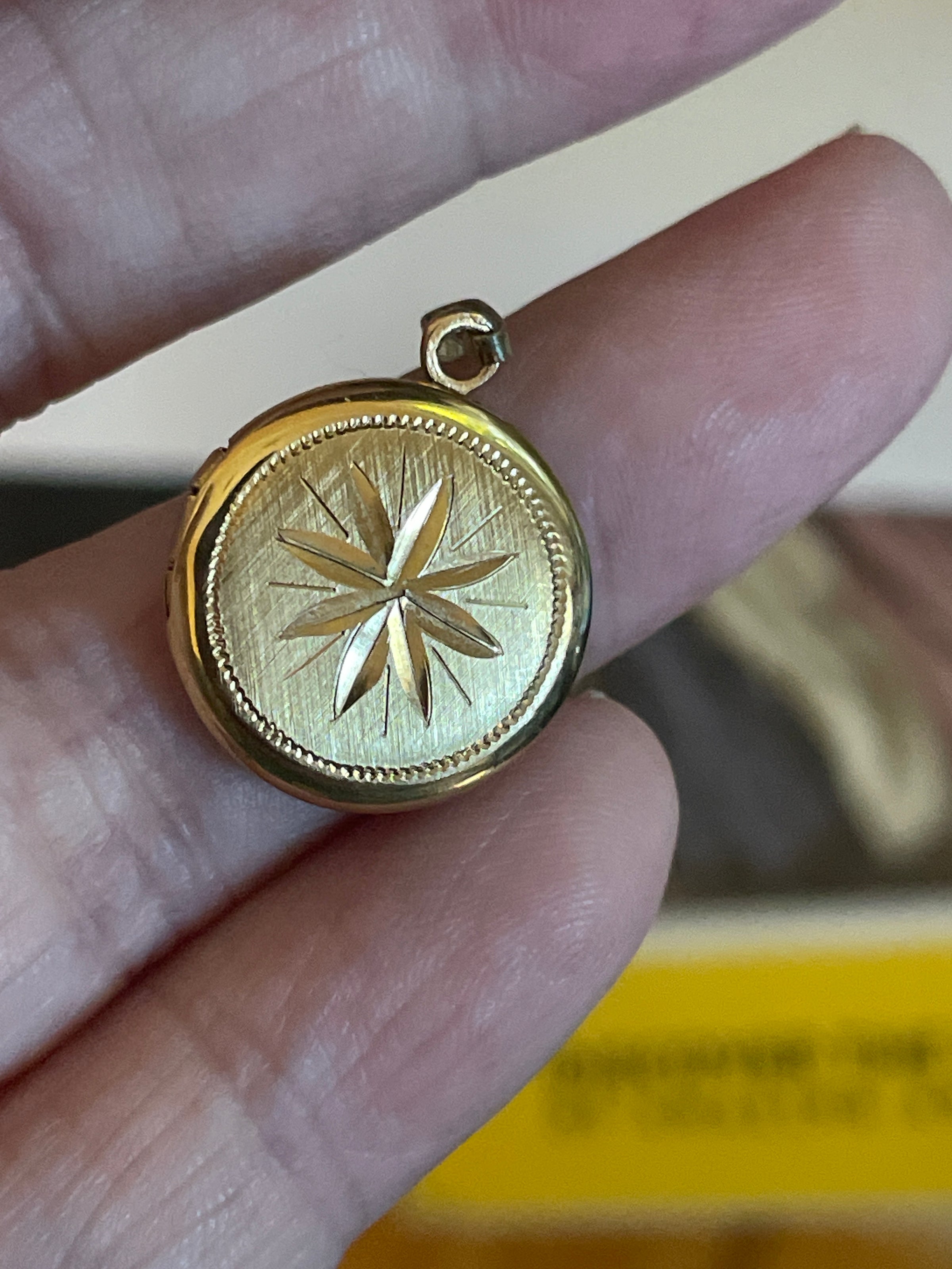 Beautiful vintage engraved star locket in gold filled metal. Locket measures approx 0.75 inches with bail x 16mm. Stamped 12/20 for gold filled.