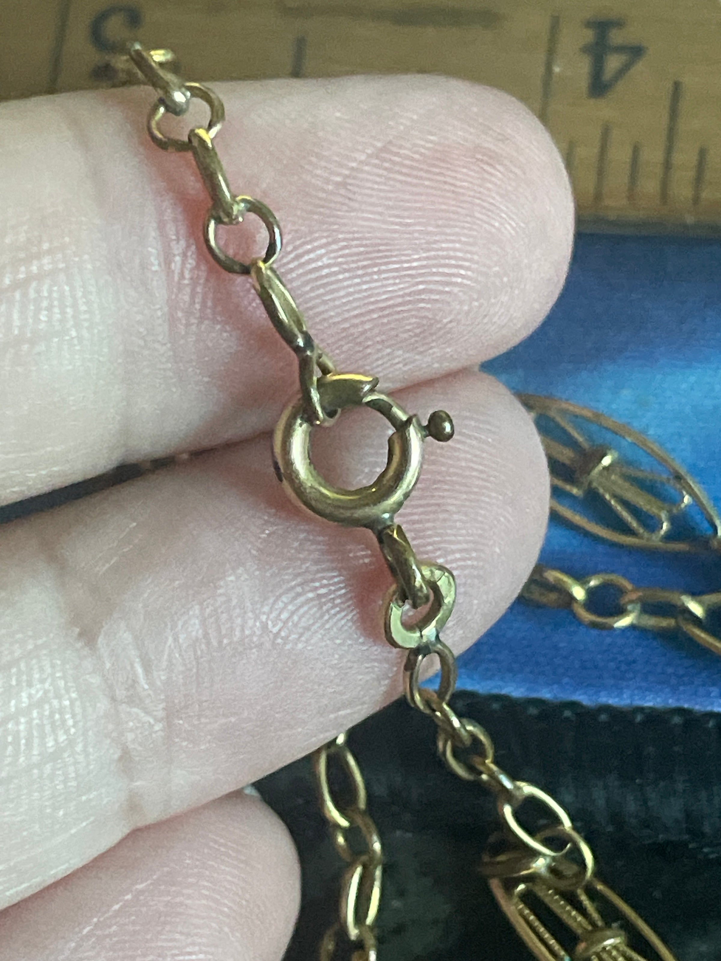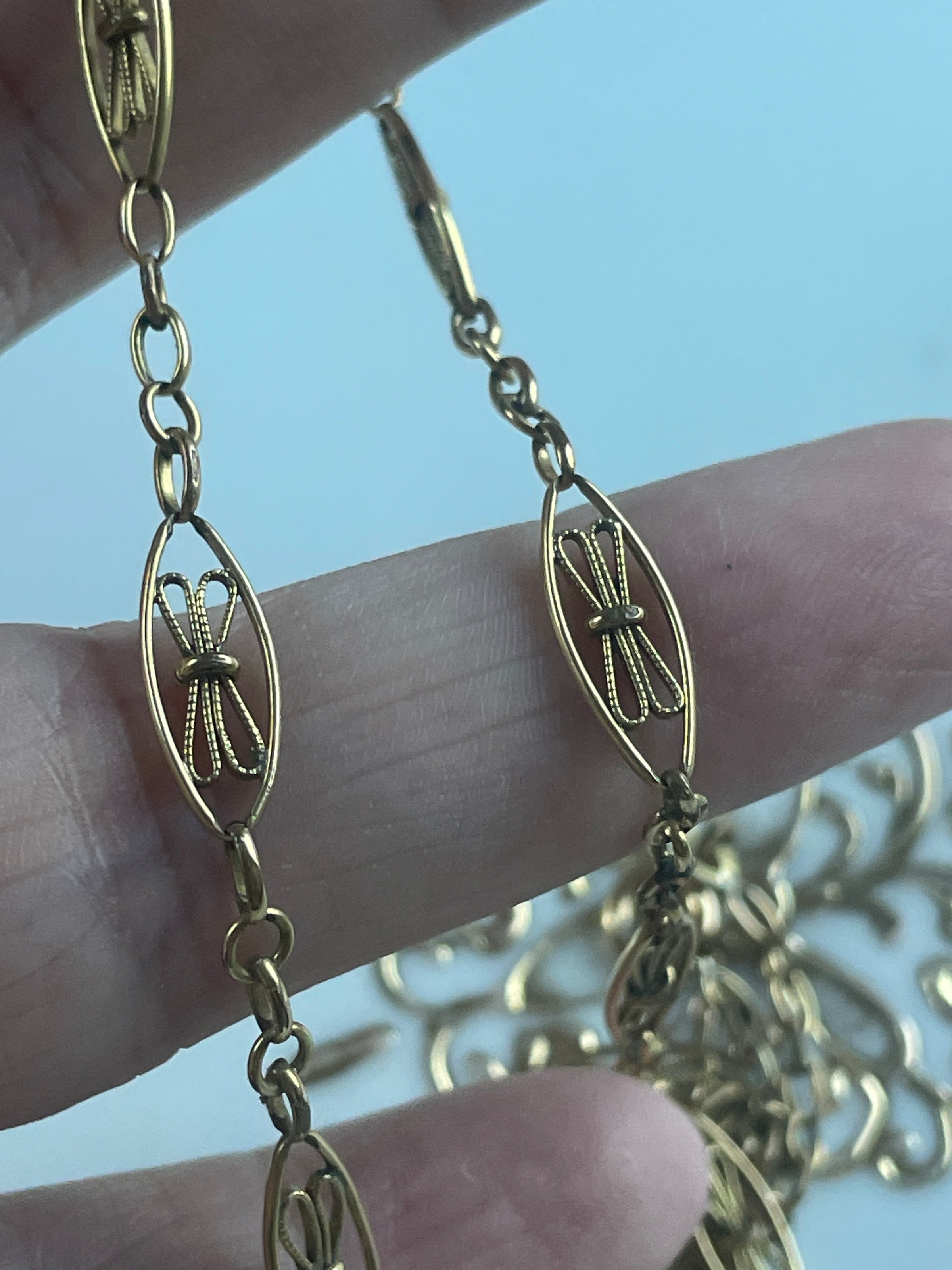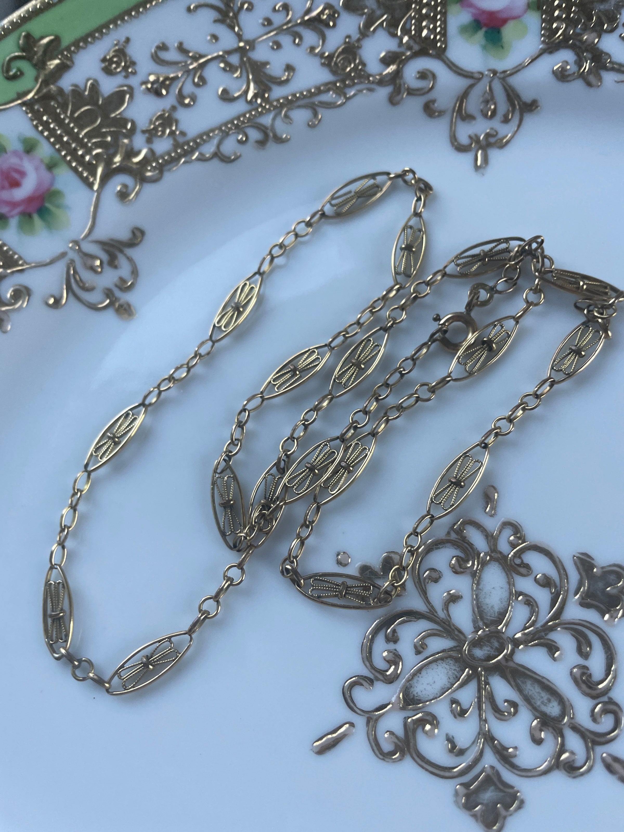 Beautiful vintage filigree chain with ornate links. Measures approx 20 inches. Unmarked but likely gold filled. Can see a little wear of the metal on clasp. There is some kind of stamp near clasp but I cannot make it out. Chain looks similar to French fix chains purchased previously.