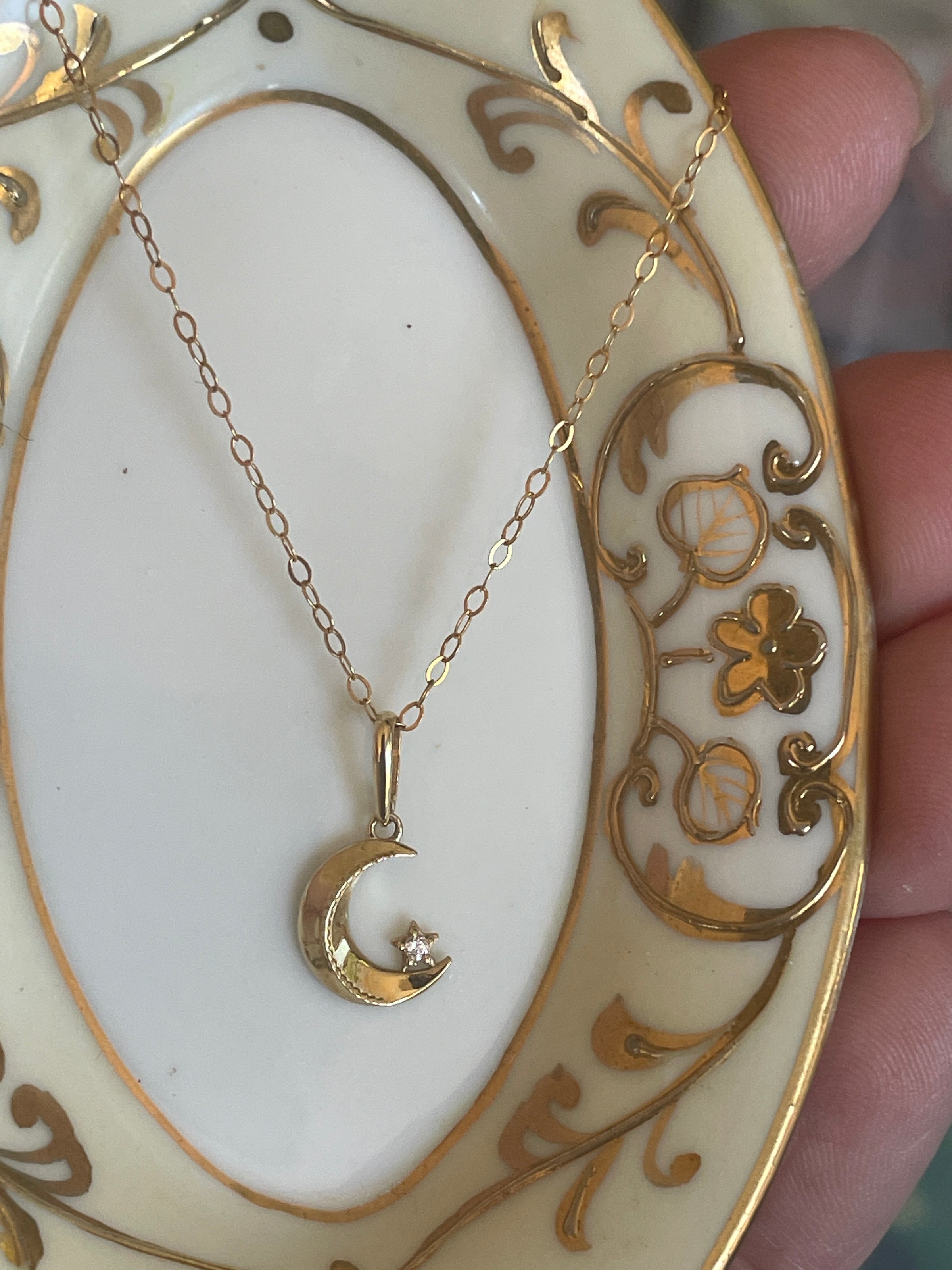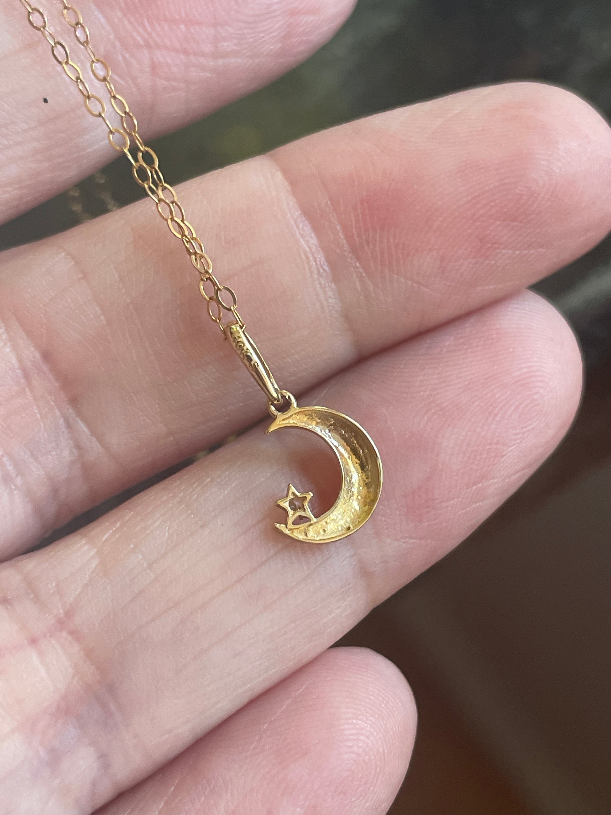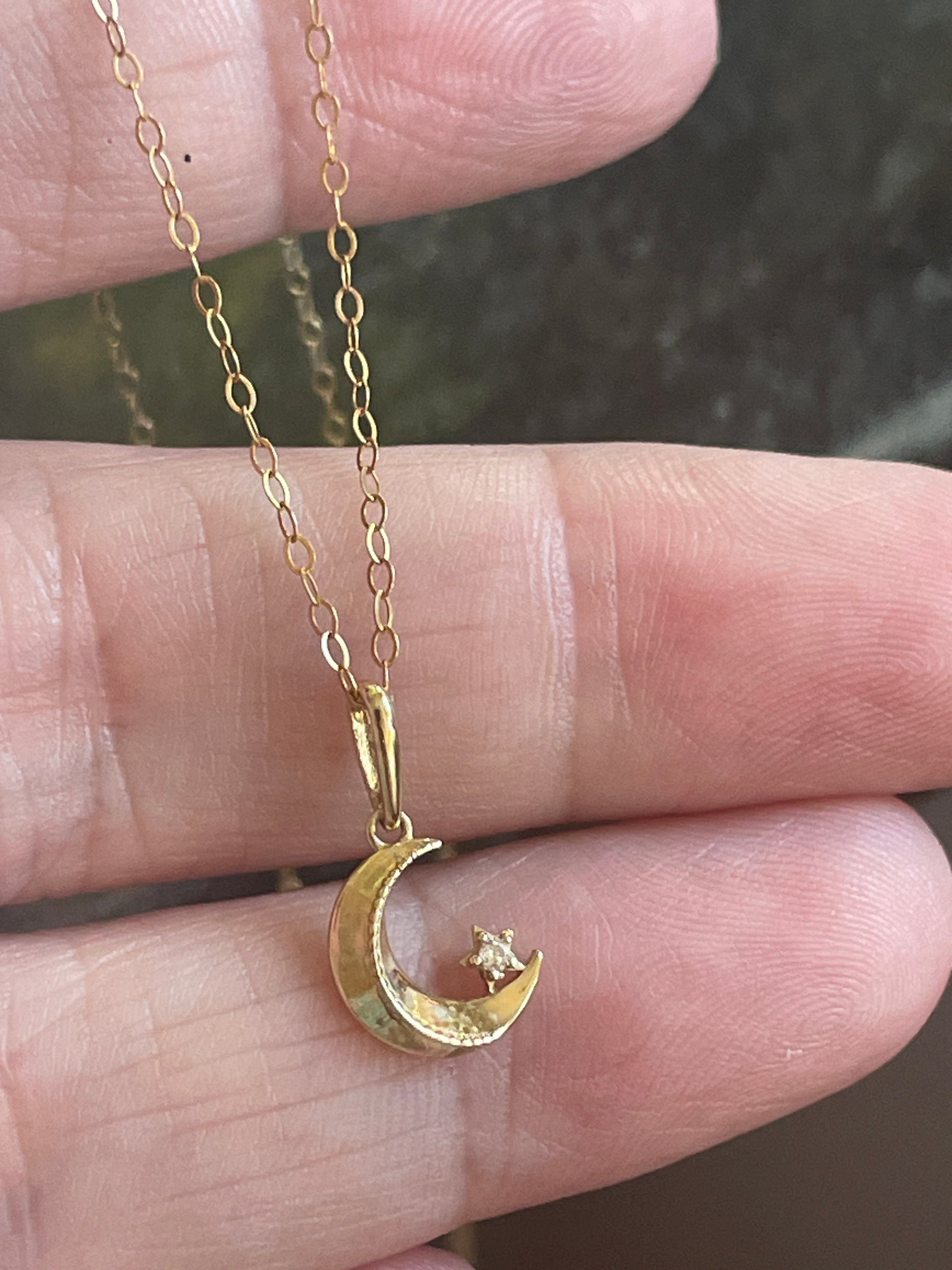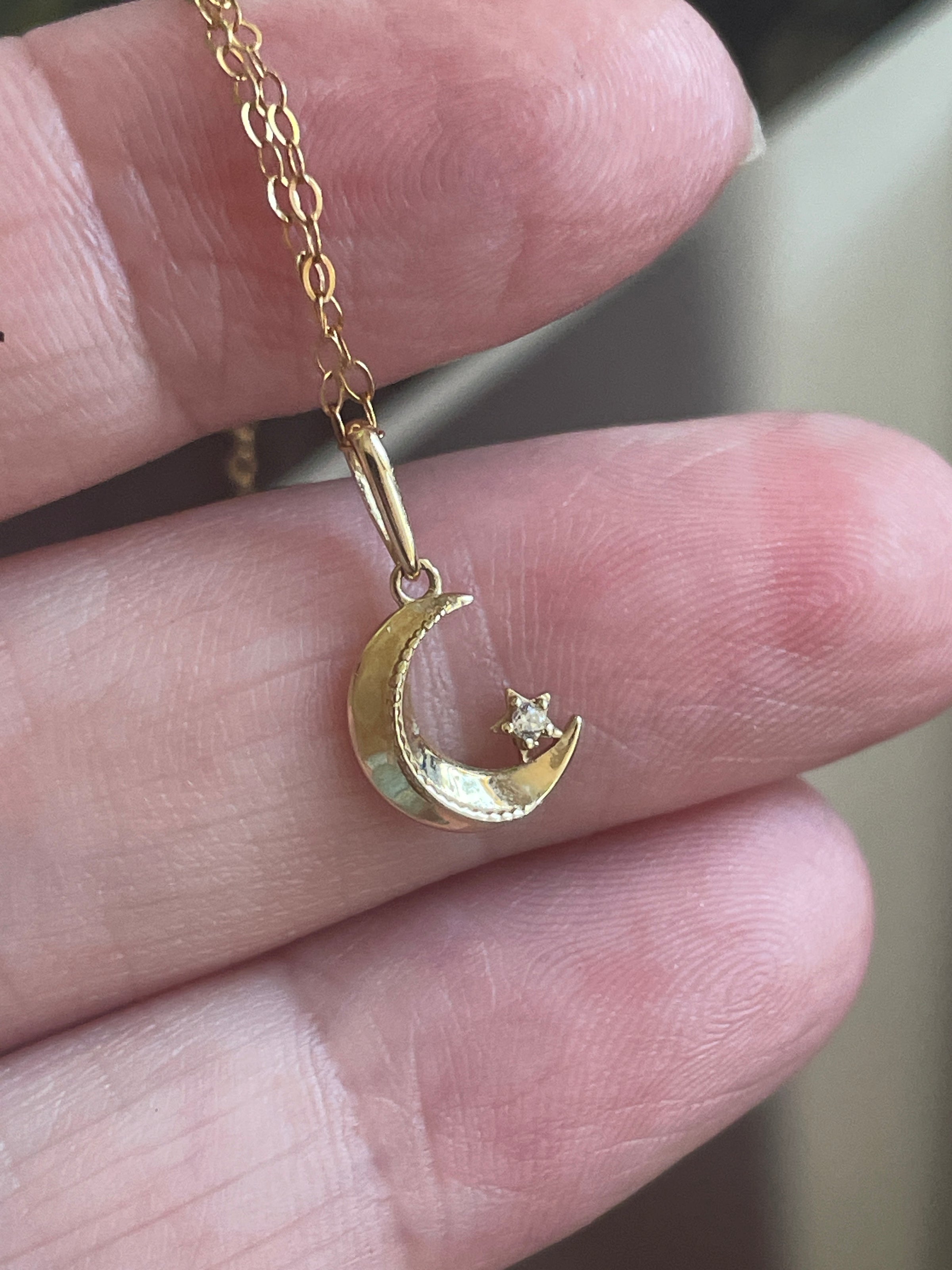 Dainty Moon Star necklace in 10k gold.  Moon has a tiny CZ star at the base.  Pendant measures approx 13mm with bail and approx 9mm without.  Stamped 10k on pendant.  Comes on a fine 18 inch gold filled chain stamped 1/20 14k on clasp z