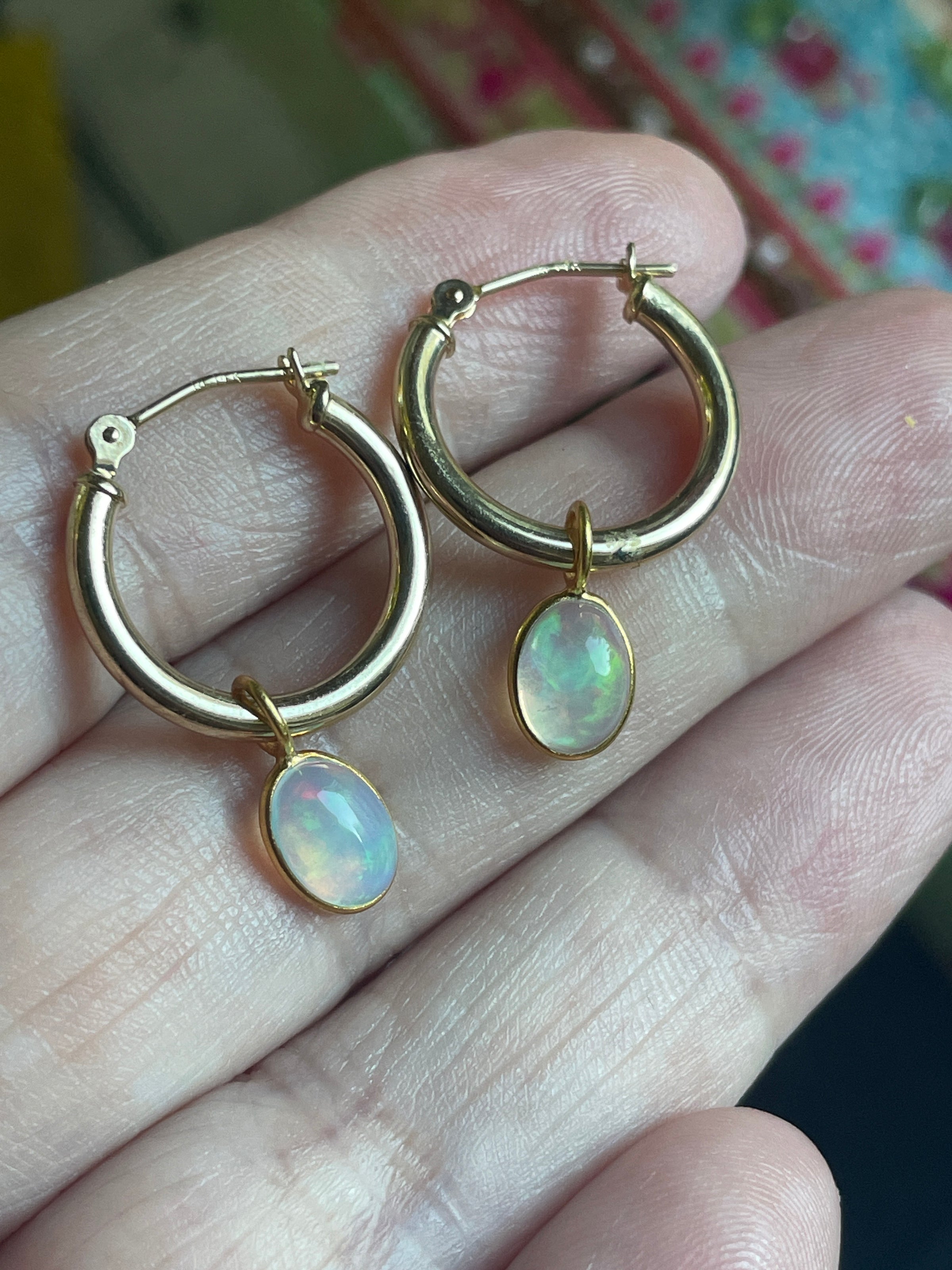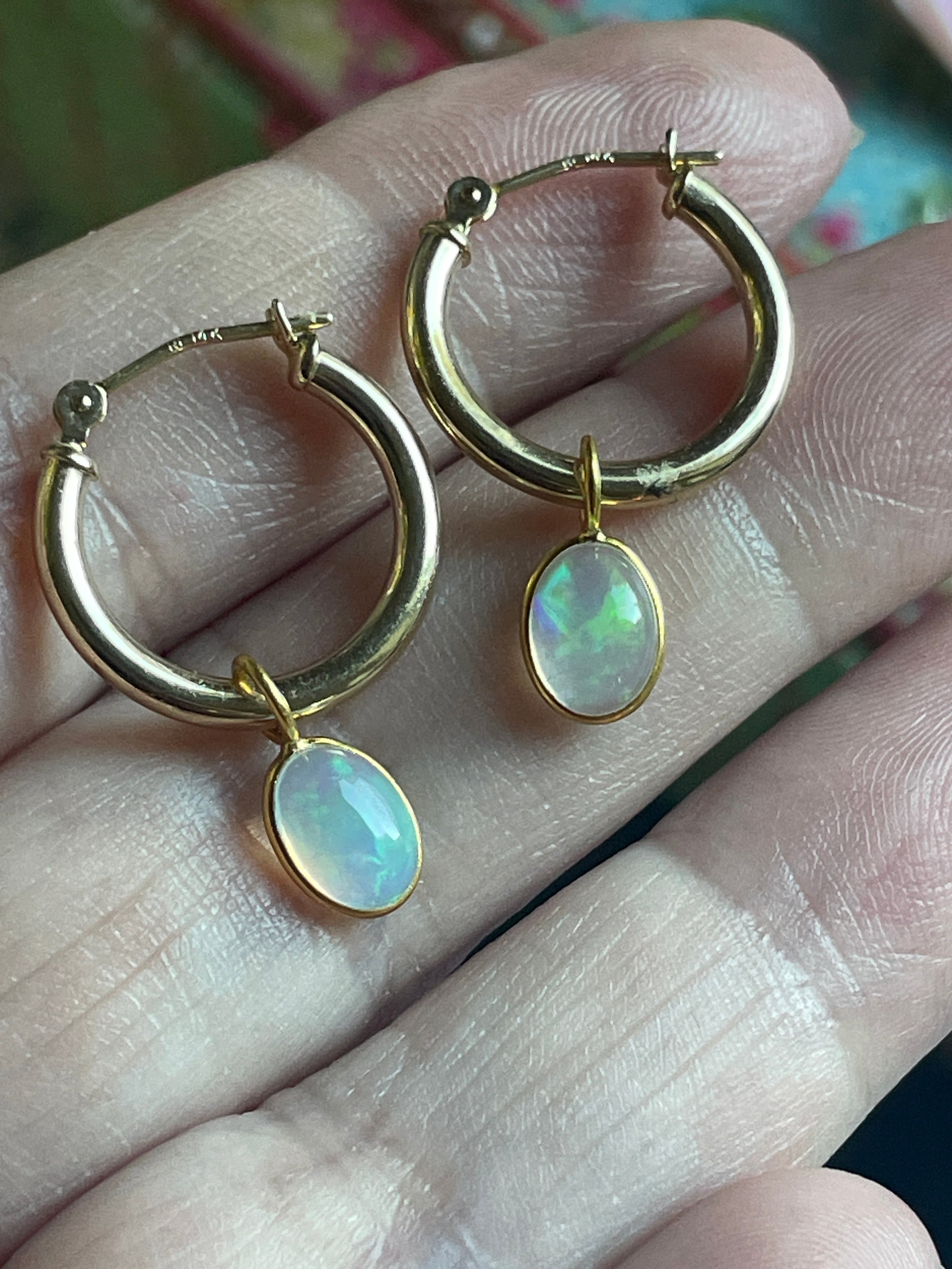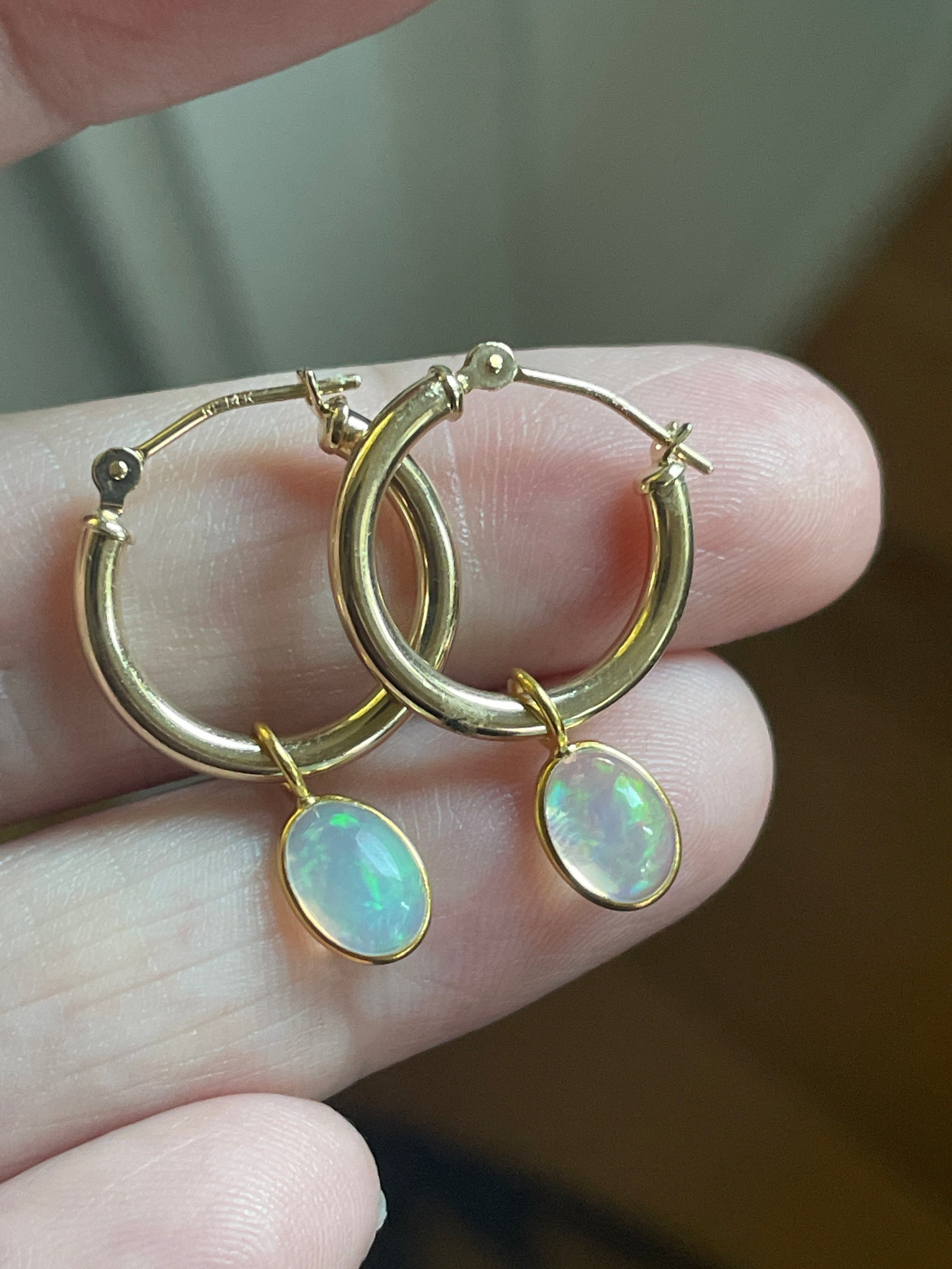 Stunning vintage 14k gold hoops have been paired with modern 18k Opal drops. Hoops are approx 14mm and 24mm with the drops. Hoops are stamped 14k. Note one hoop has a tiny area where slightly scratched where drop sits so hardly noticeable.