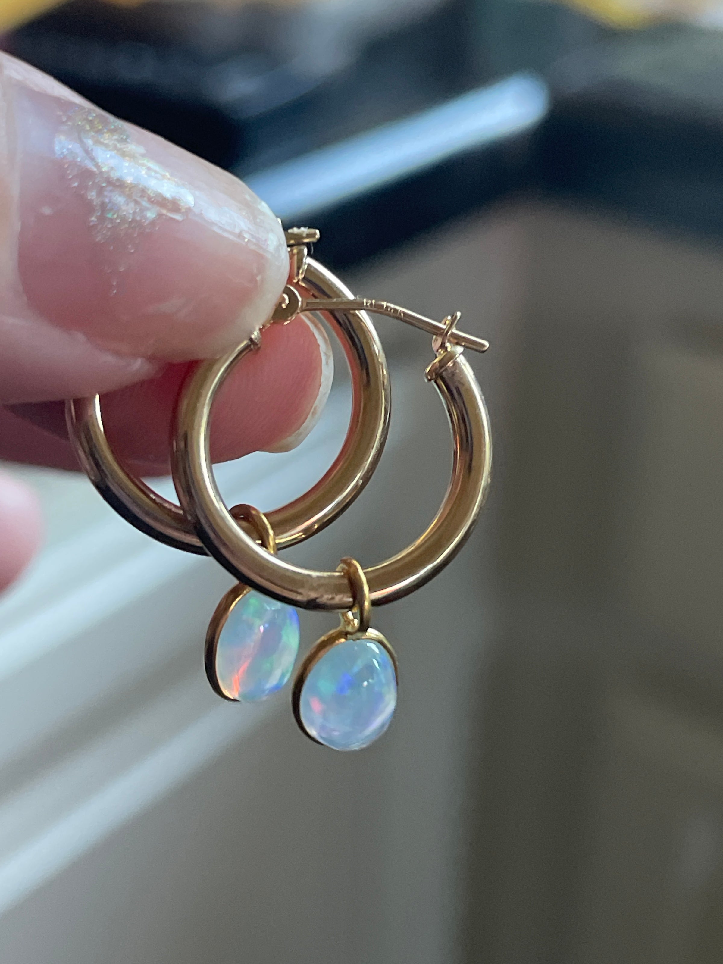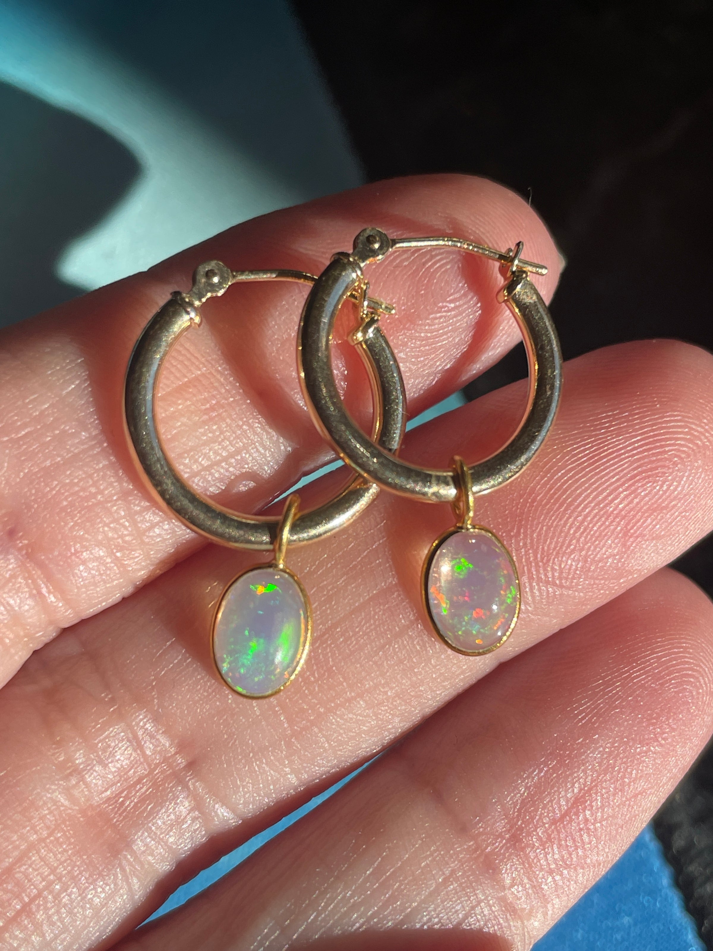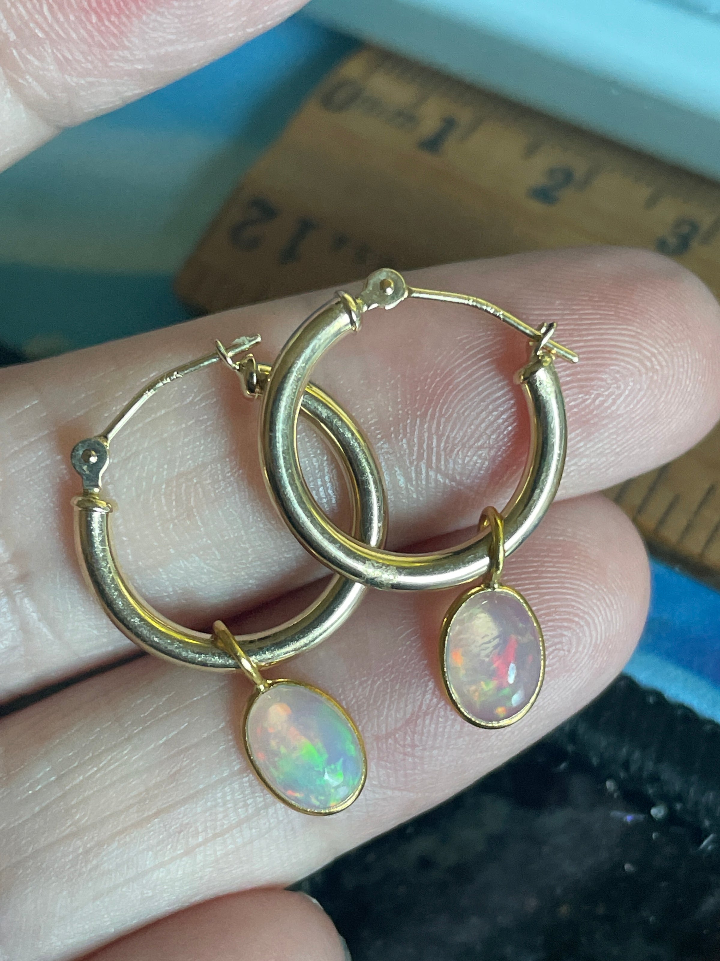 Stunning vintage 14k gold hoops have been paired with modern 18k Opal drops. Hoops are approx 14mm and 24mm with the drops. Hoops are stamped 14k. Note one hoop has a tiny area where slightly scratched where drop sits so hardly noticeable.