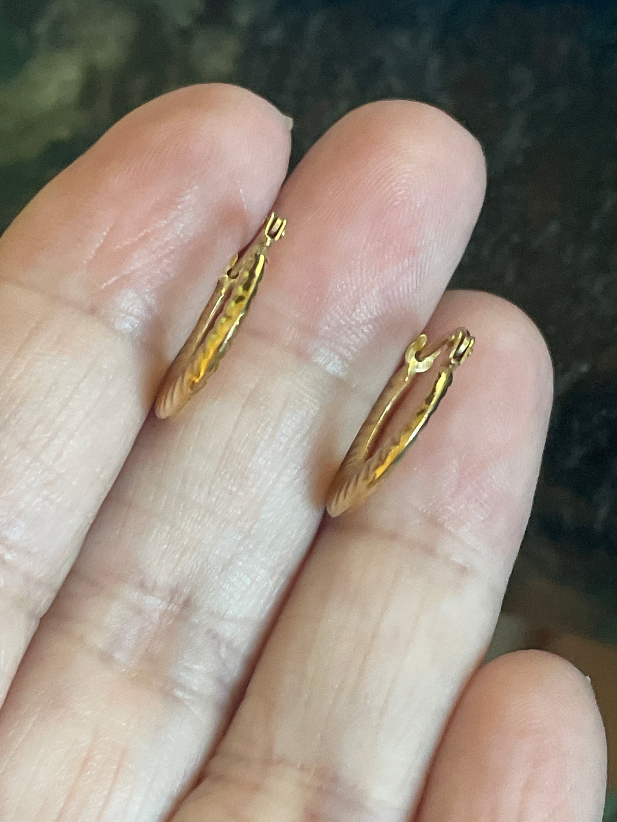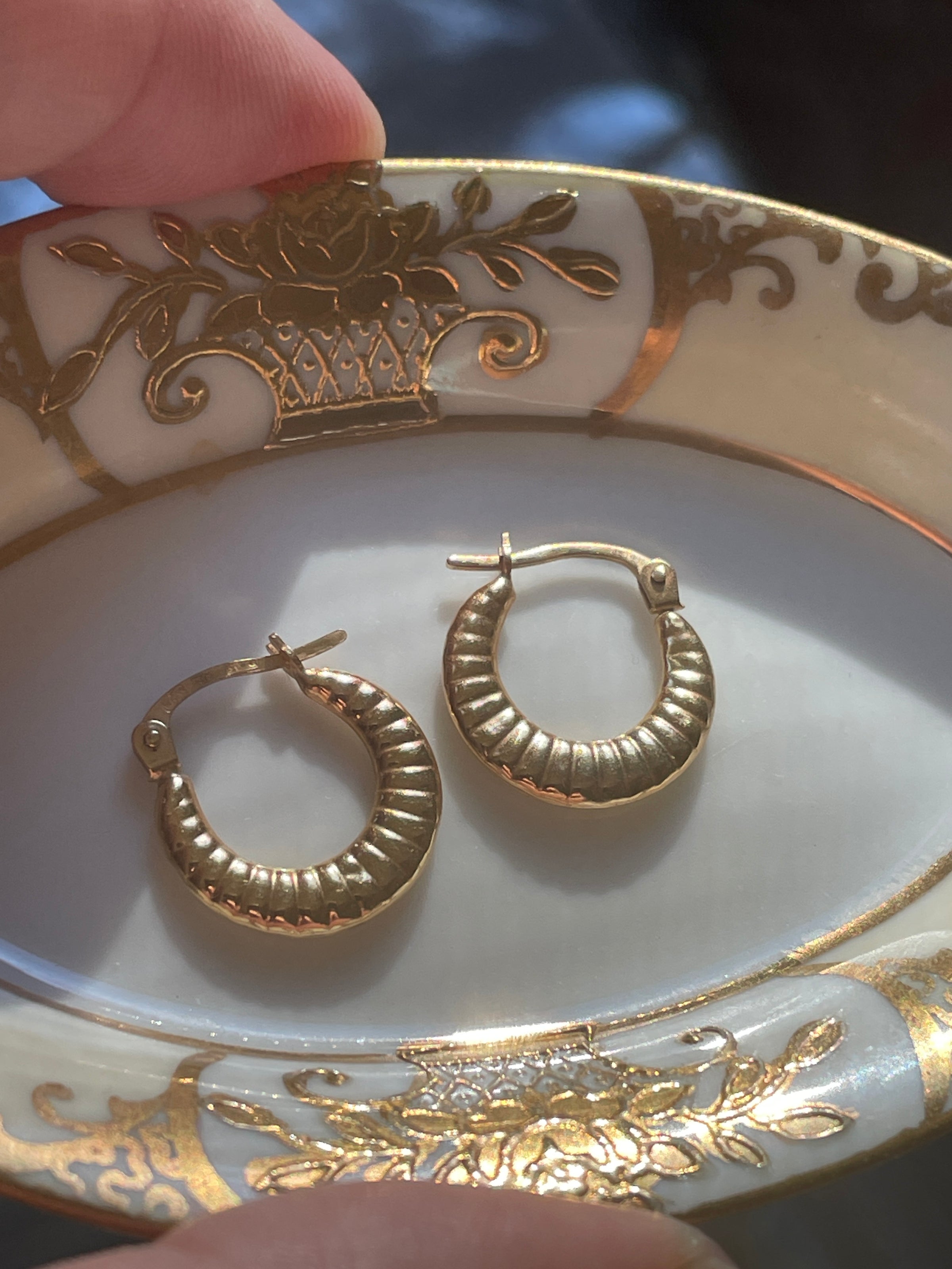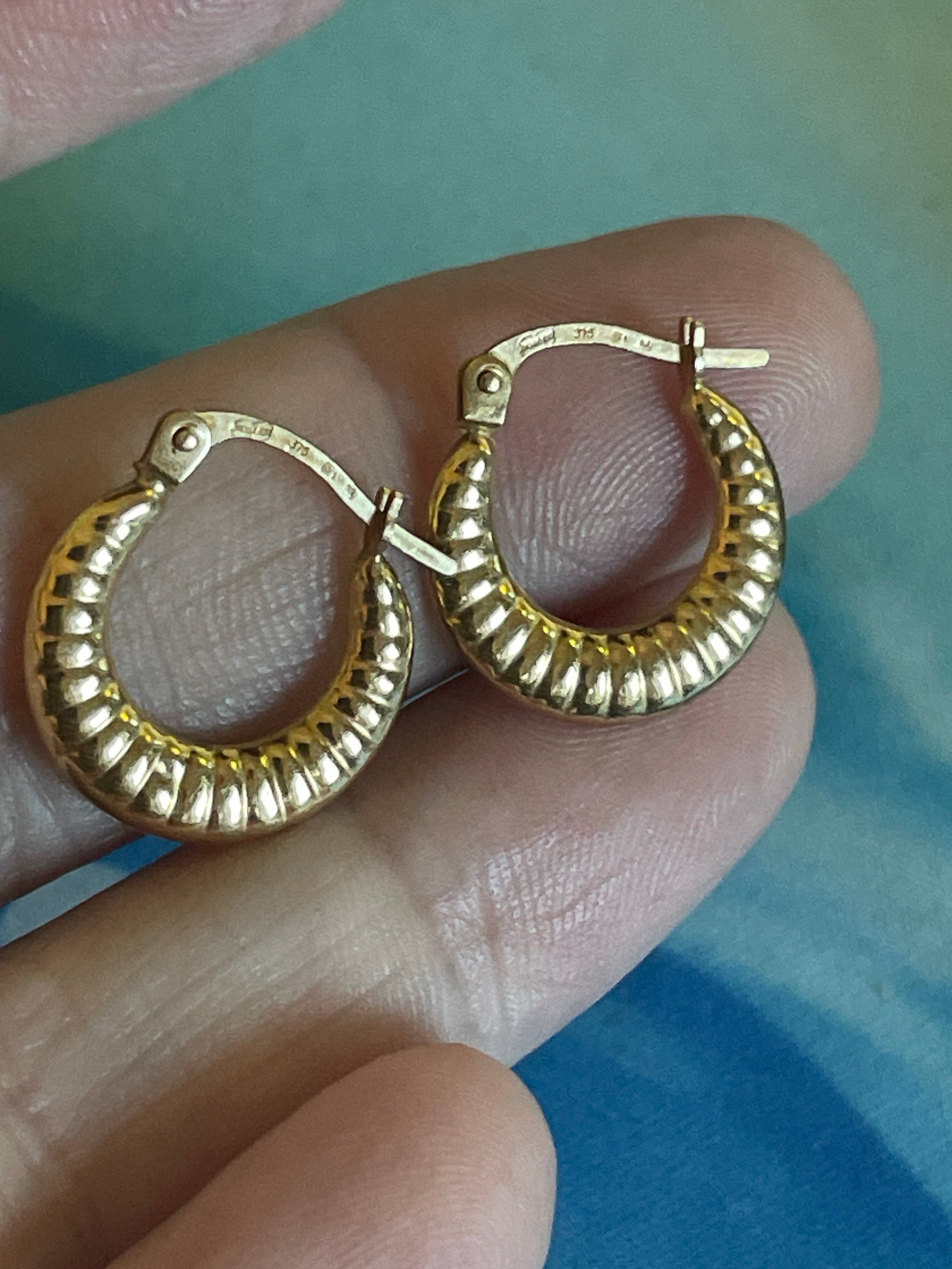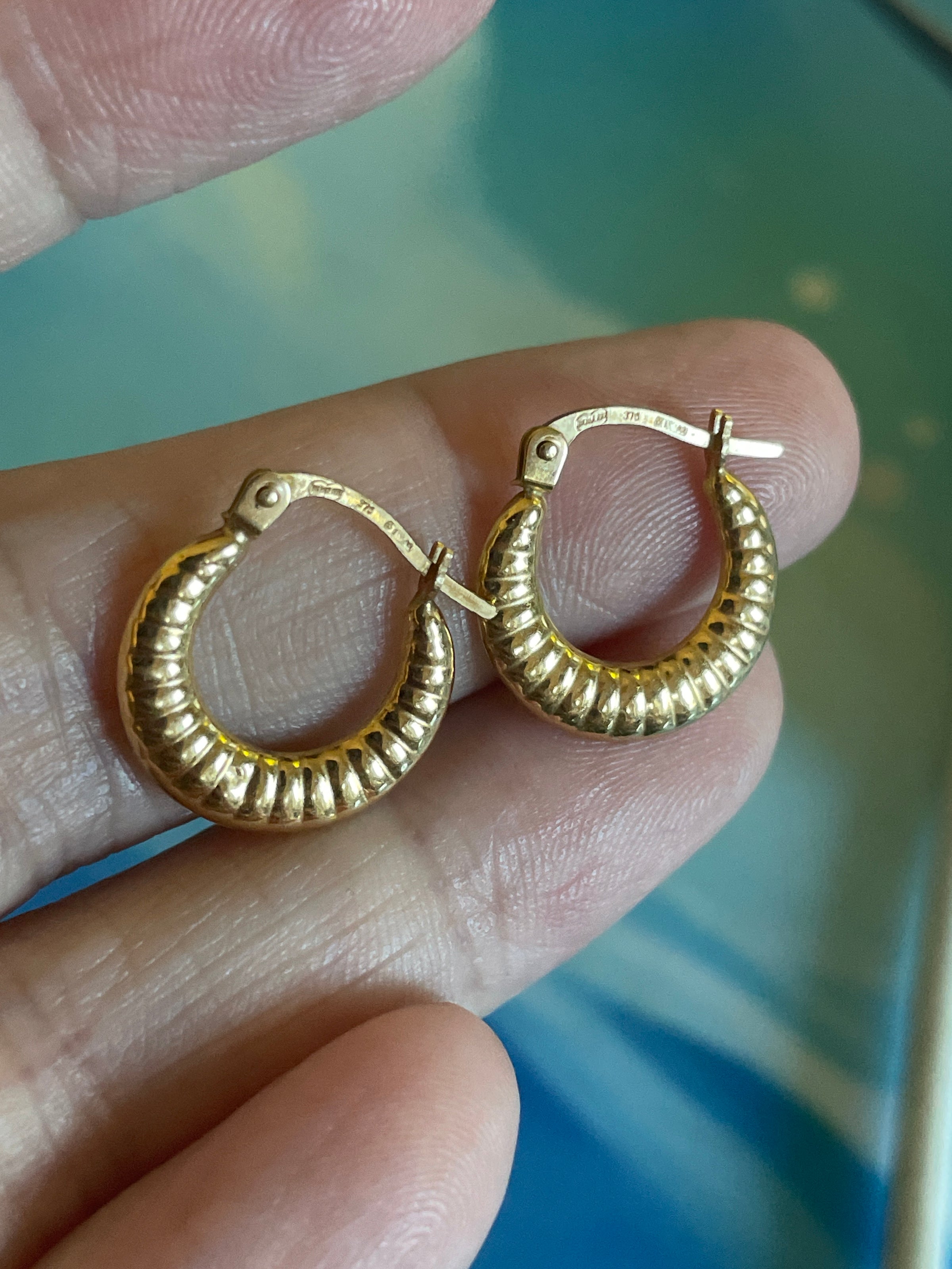 Fabulous ridged hoops in 9k gold. These measure approx 14mm. Ridged on both sides. Stamped 375 for 9k on earwires.