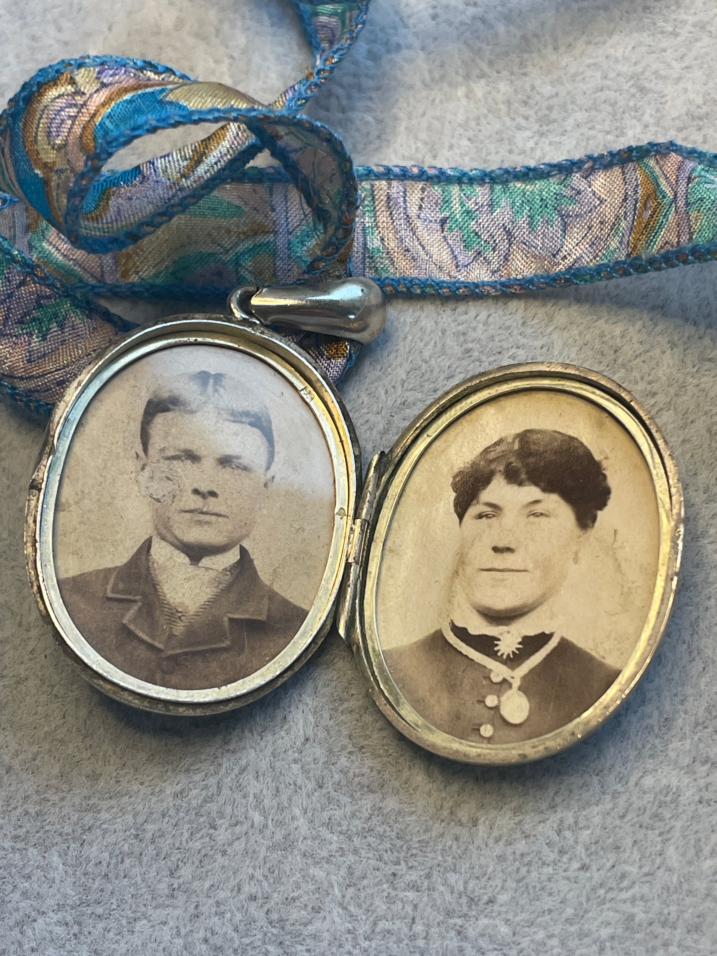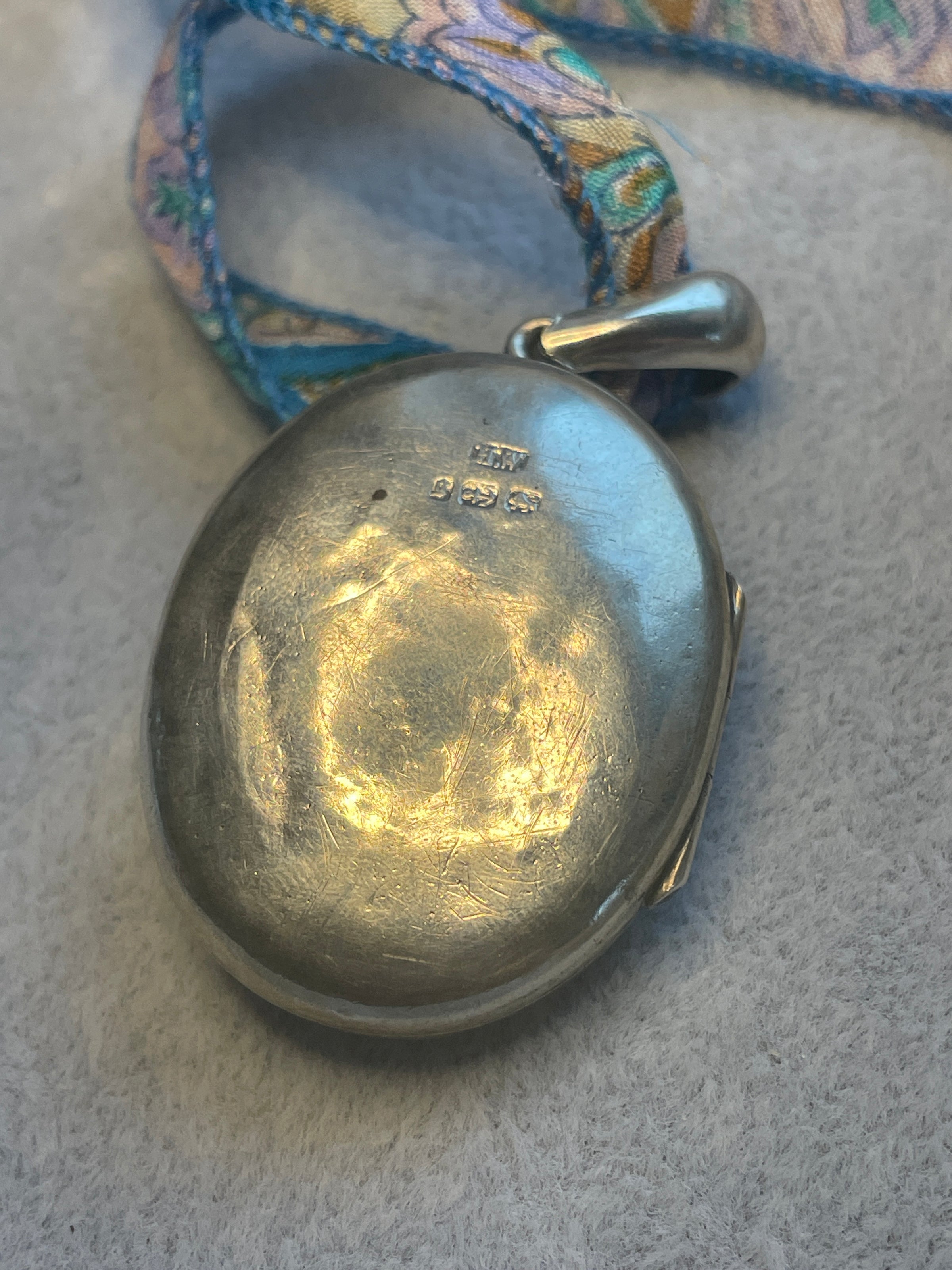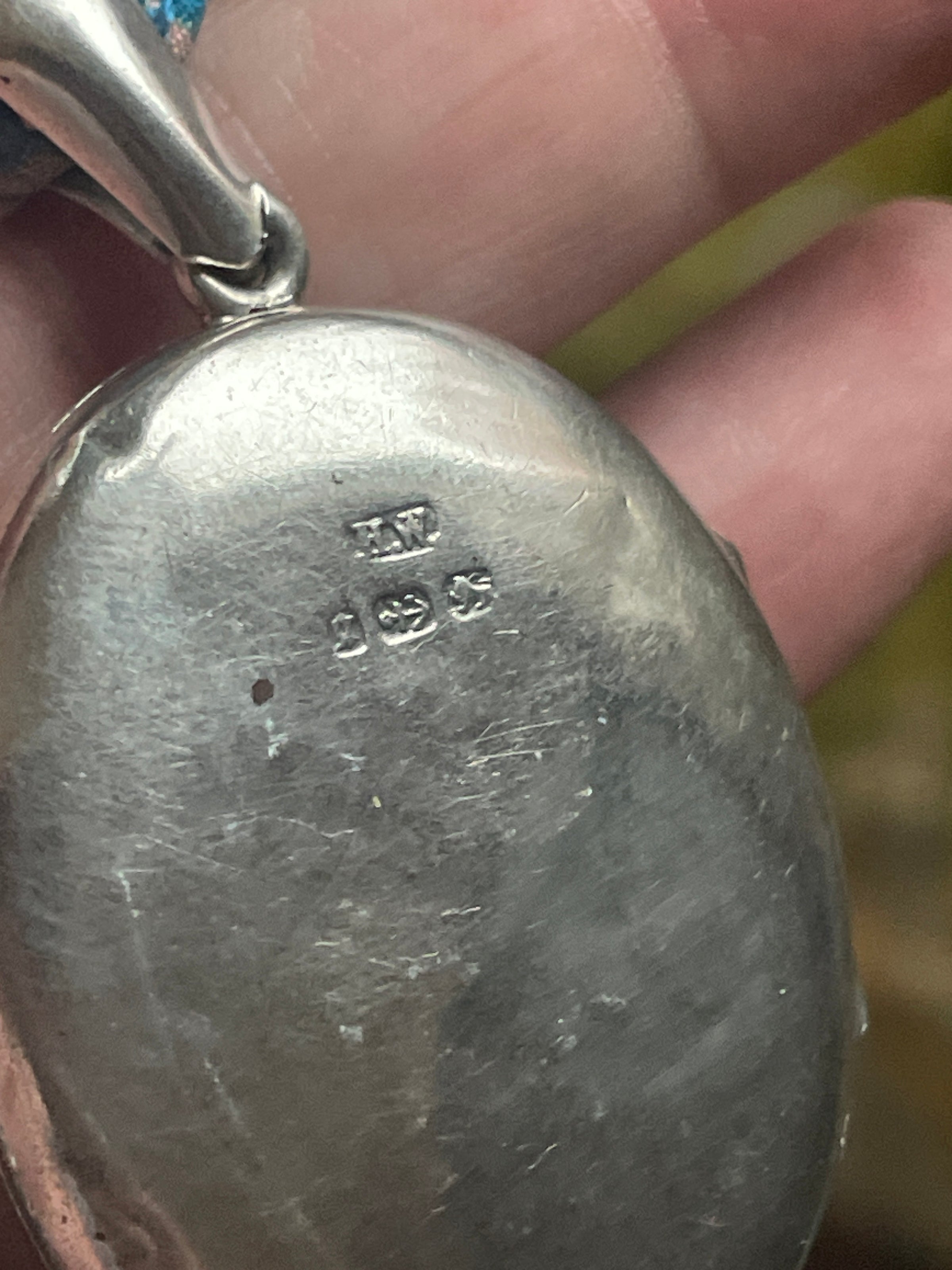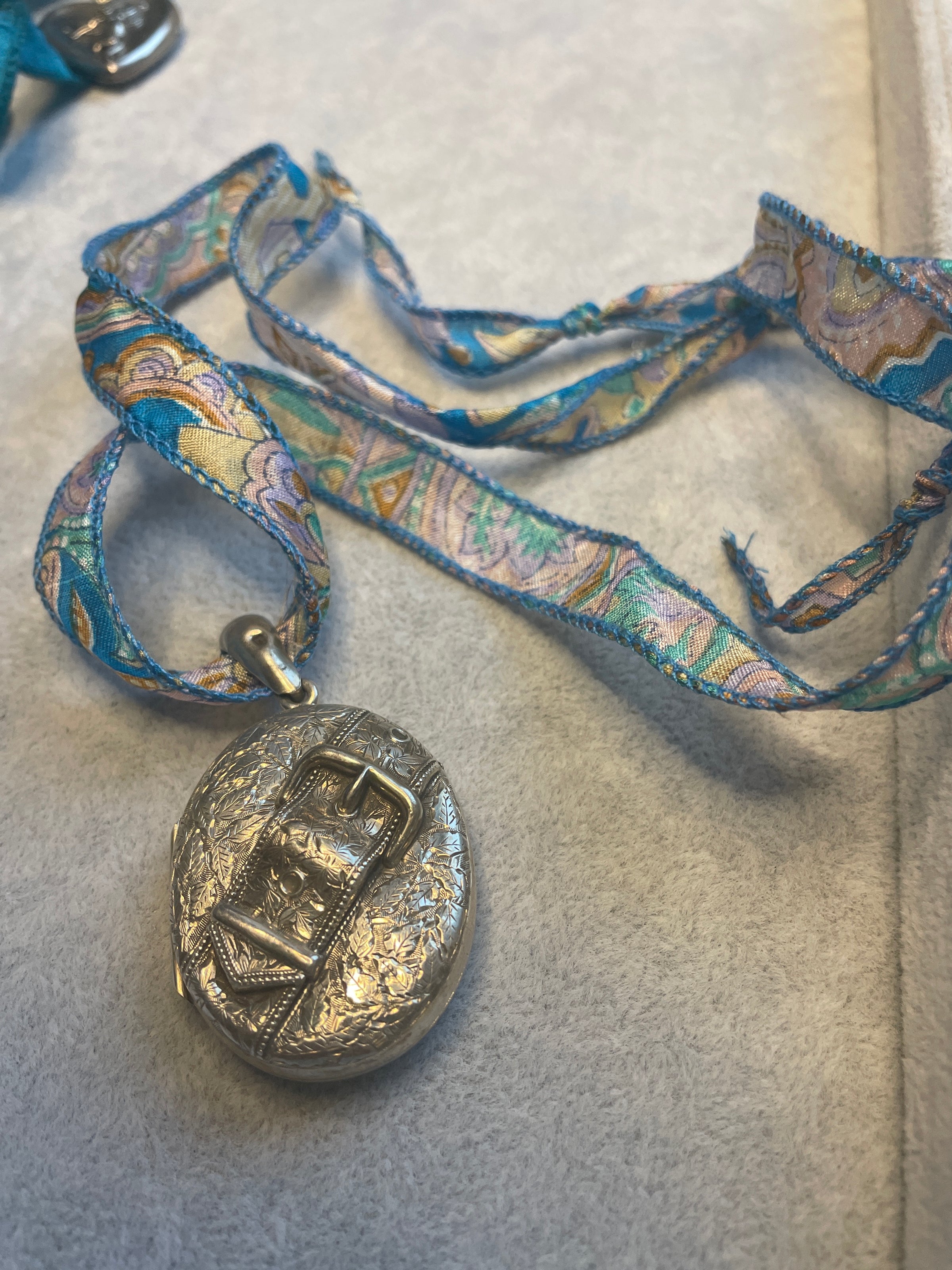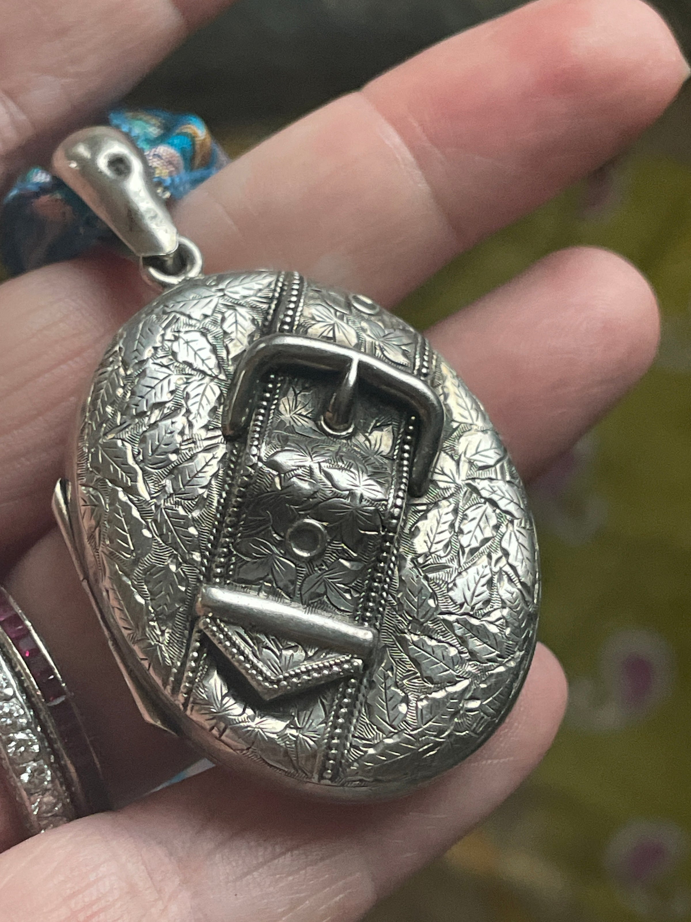 Fabulous huge antique buckle locket in sterling silver. Has stunning detail. Locket measures 2 inches with bail x 1.25 inches. Has maker’s mark on back including “HW” and anchor on the side and a lion. Inside has photos from late 1800s. One side has acetate and a frame. Comes on gorgeous Sari ribbon with sliding sterling bead so you can adjust length from approx 18-24 inches.