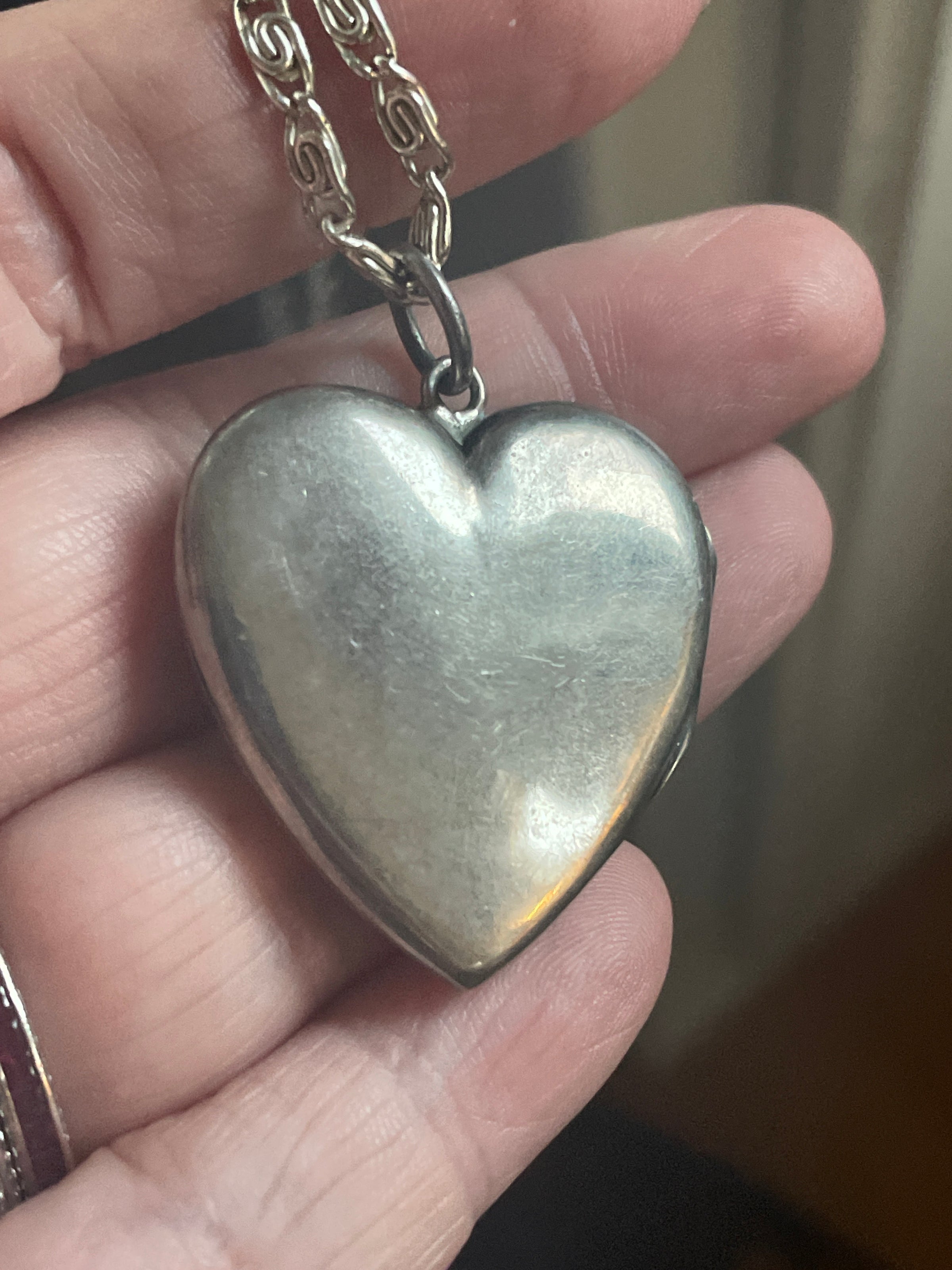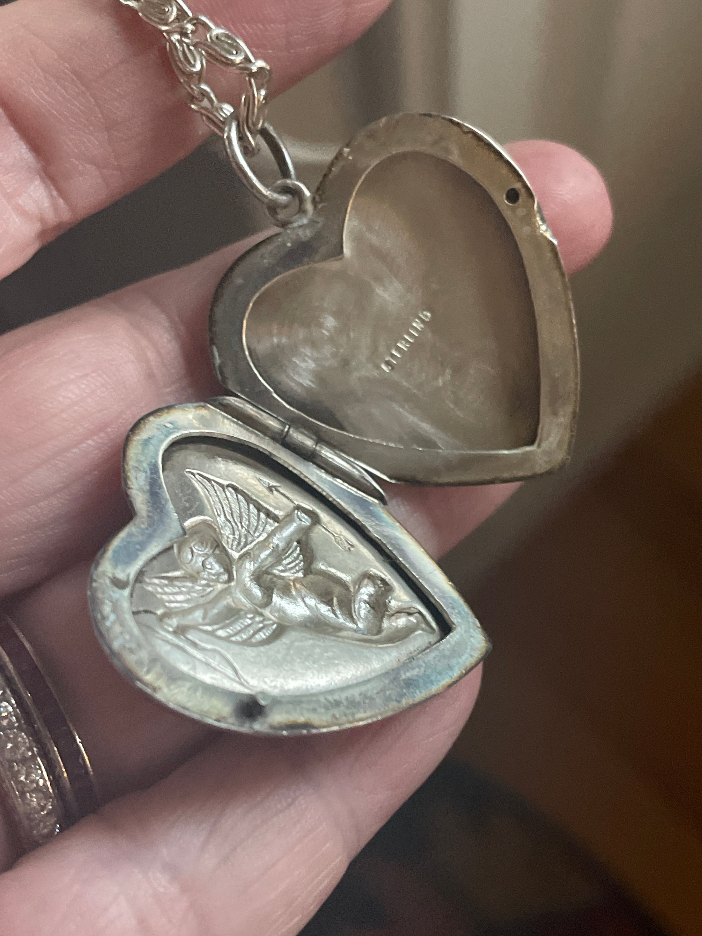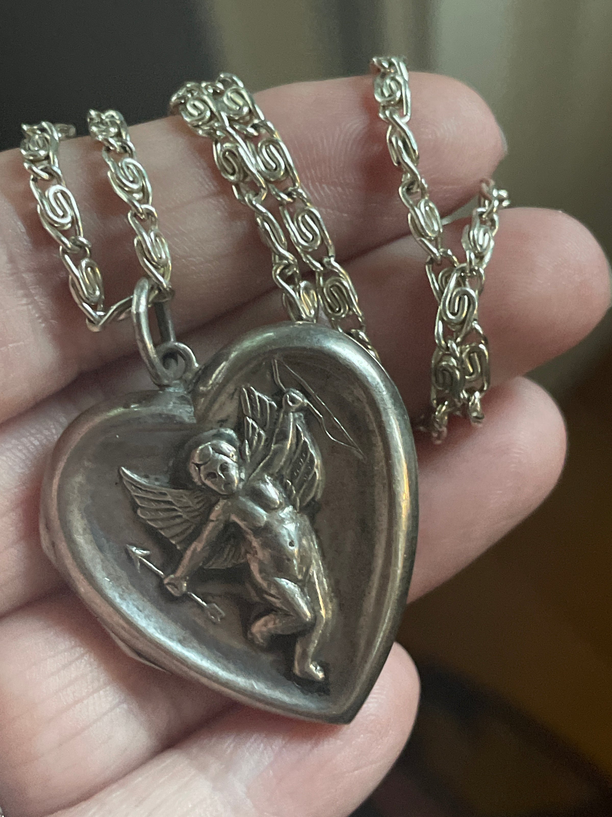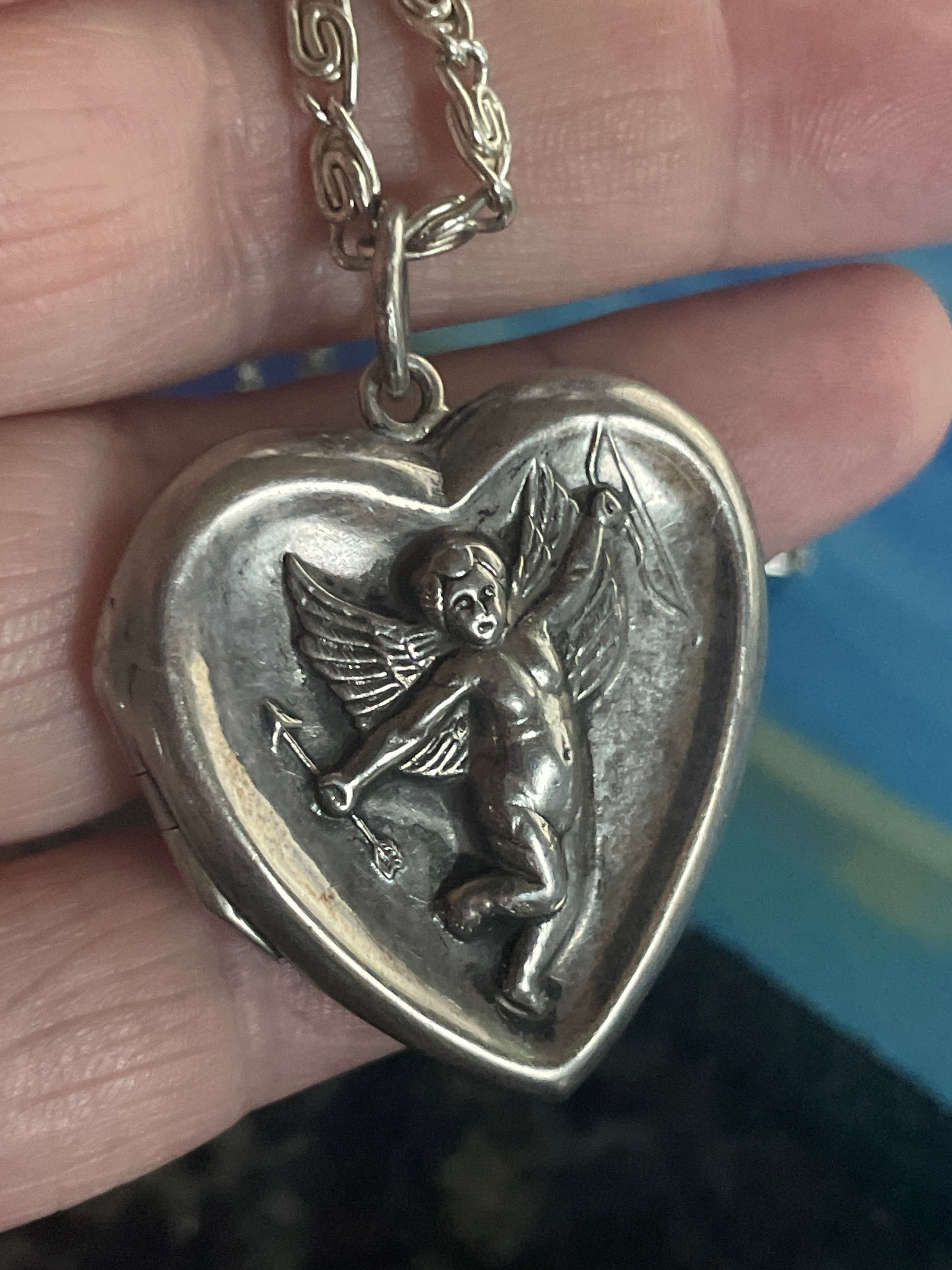 Fabulous vintage Cherub heart locket in sterling silver. Locket measures 1.5 inches x 1.25 inches. Comes on an ornate 18 inch sterling chain. Stamped “Sterling” inside. Box clasp on chain stamped “Germany “.