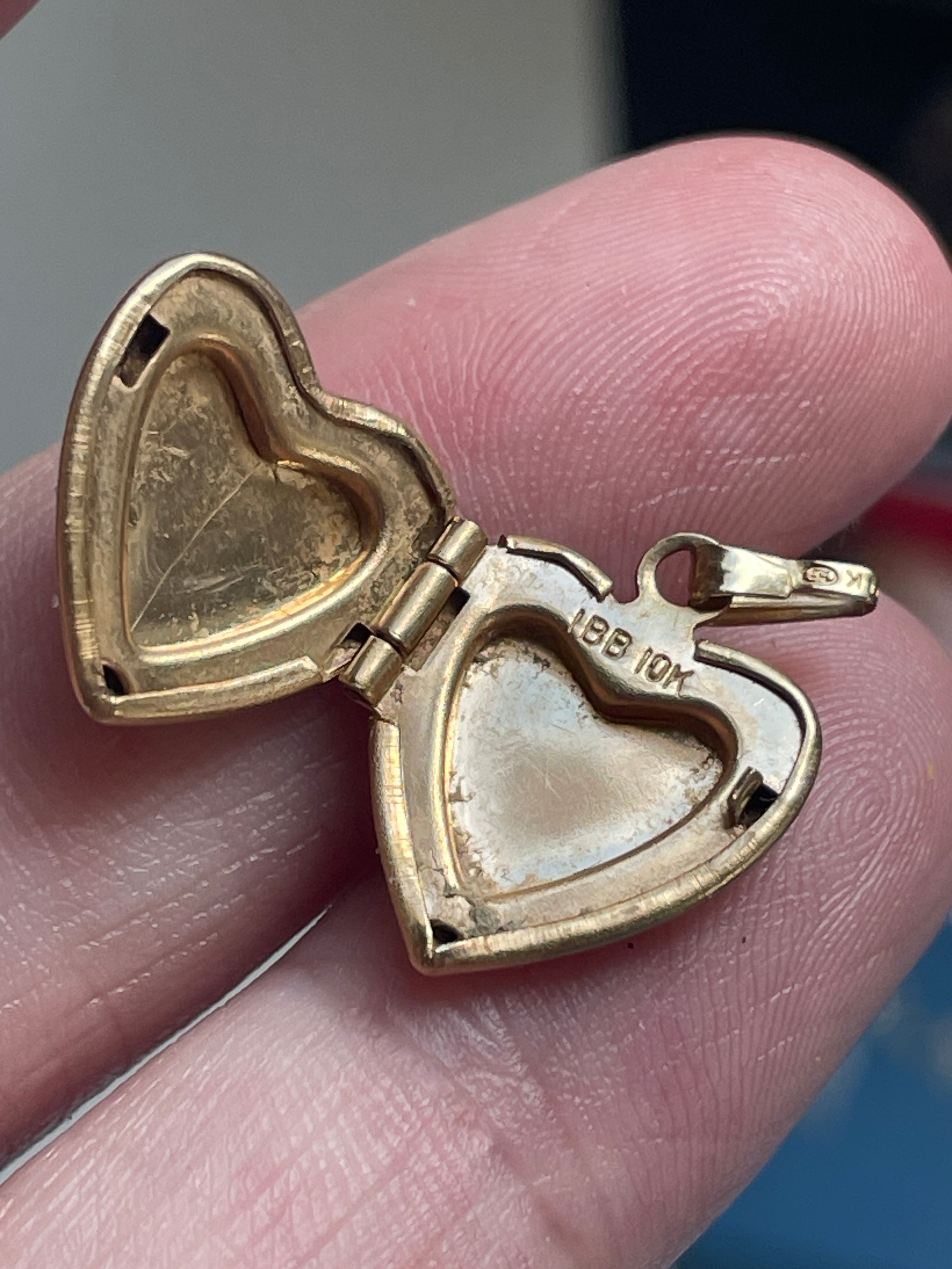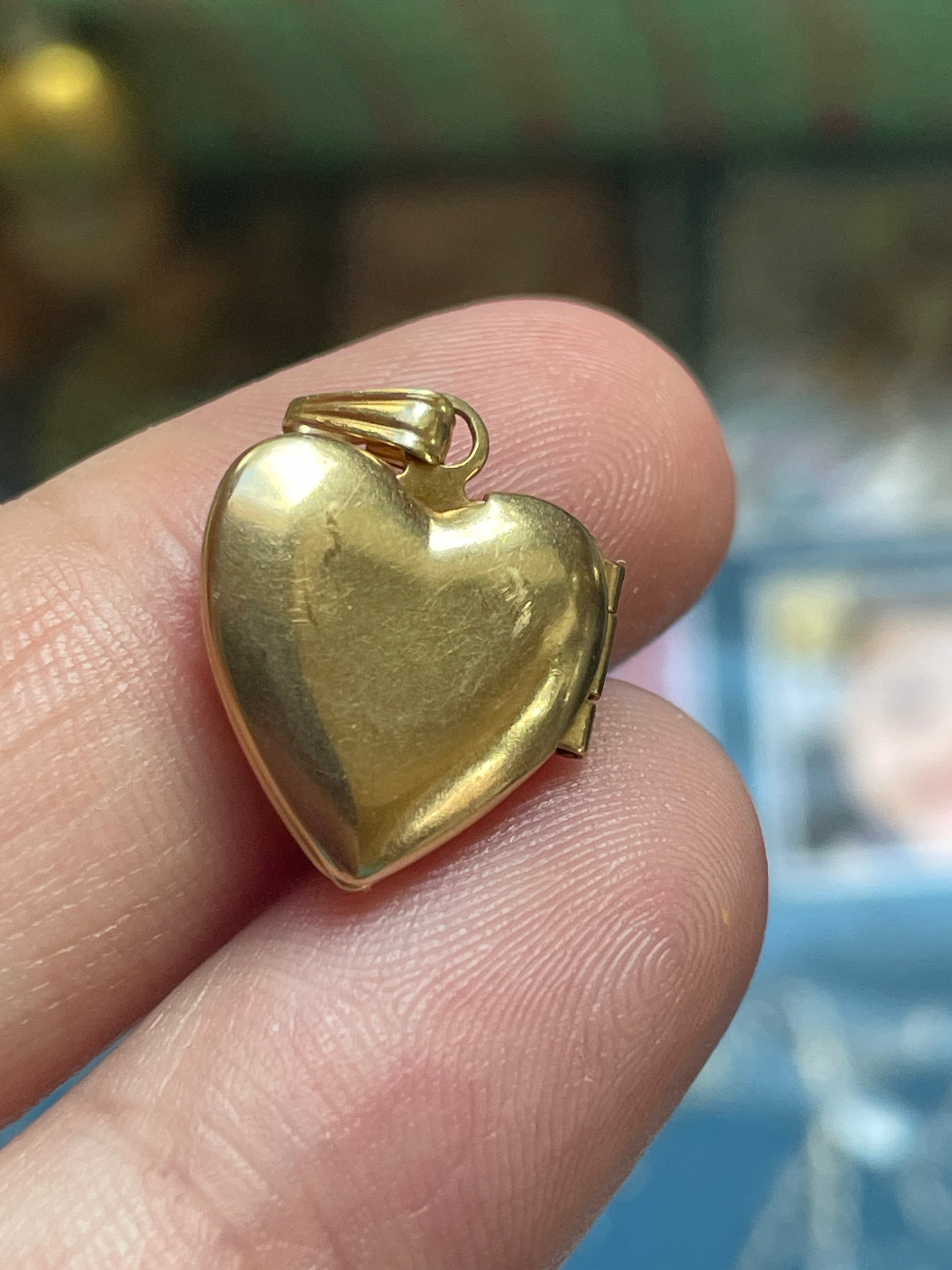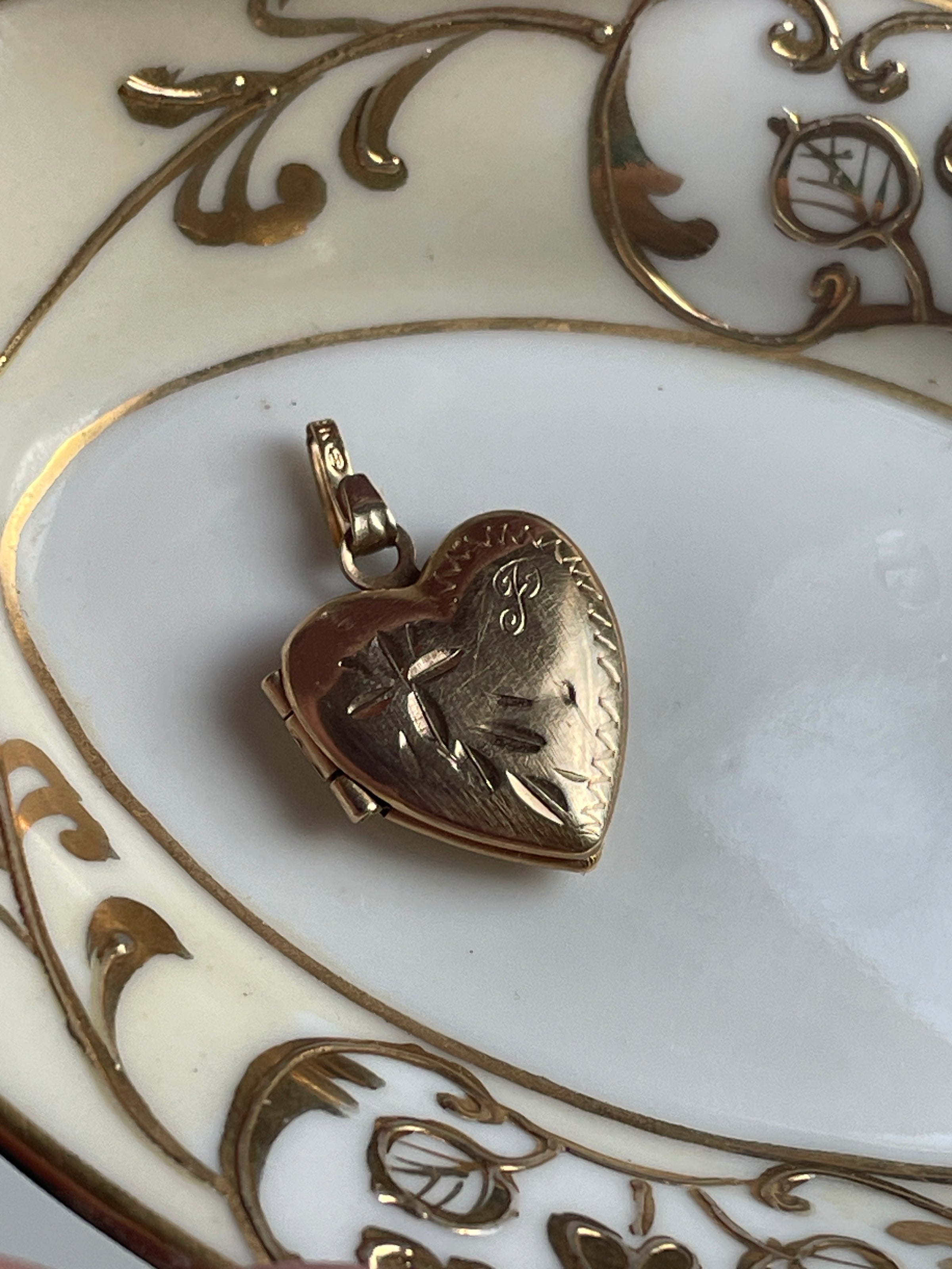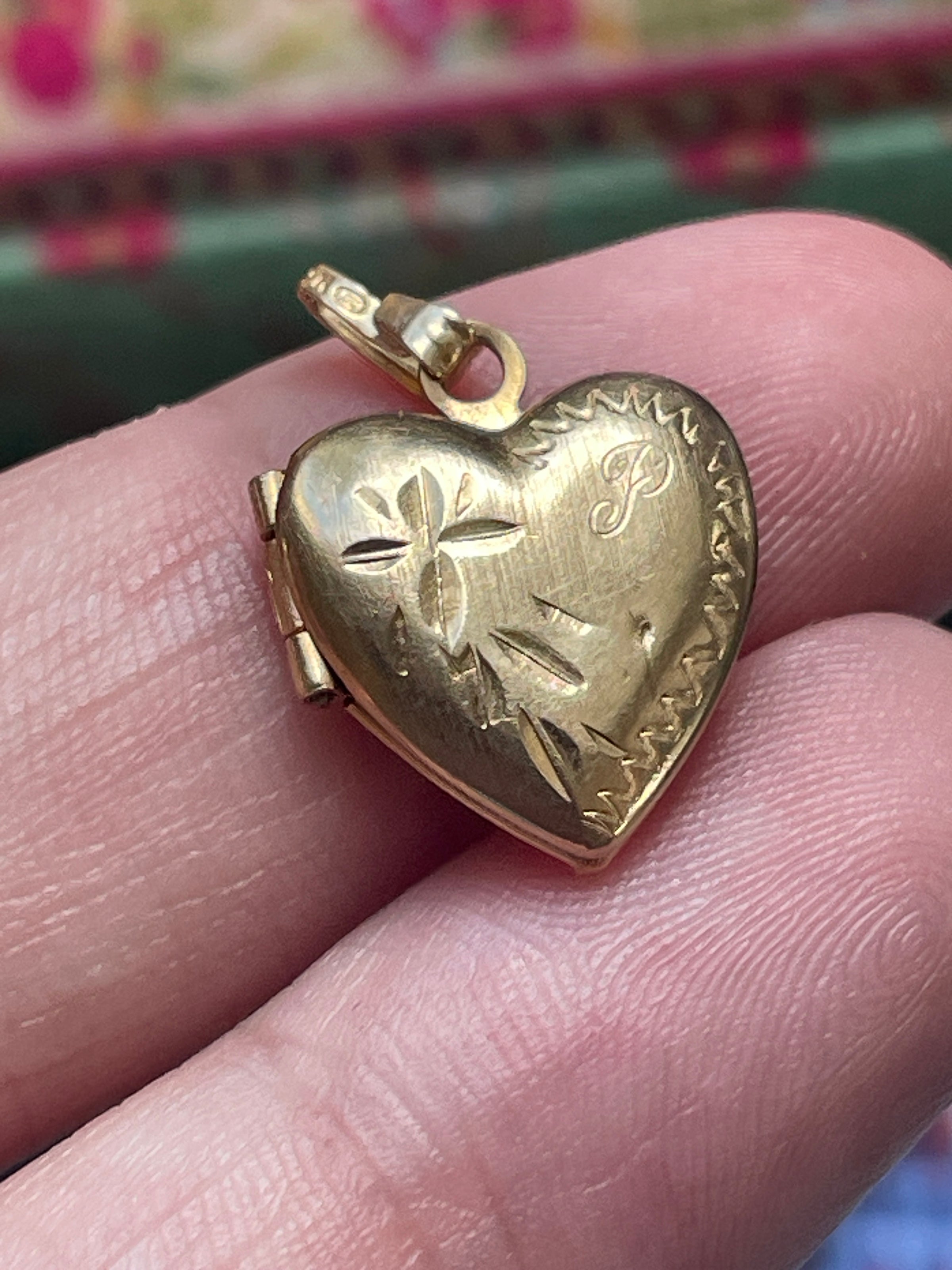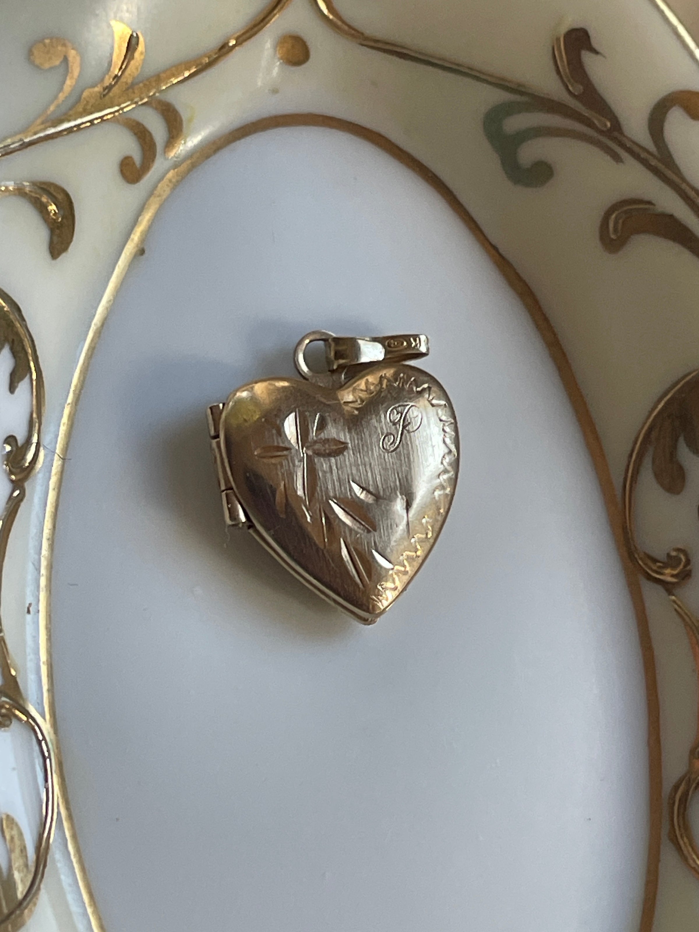Gorgeous vintage 10k gold heart locket with engraved design and also an engraved initial “P”. Locket measures approximately 15mm with bail x 12mm. Stamped 10k inside locket. Closes with a snap.