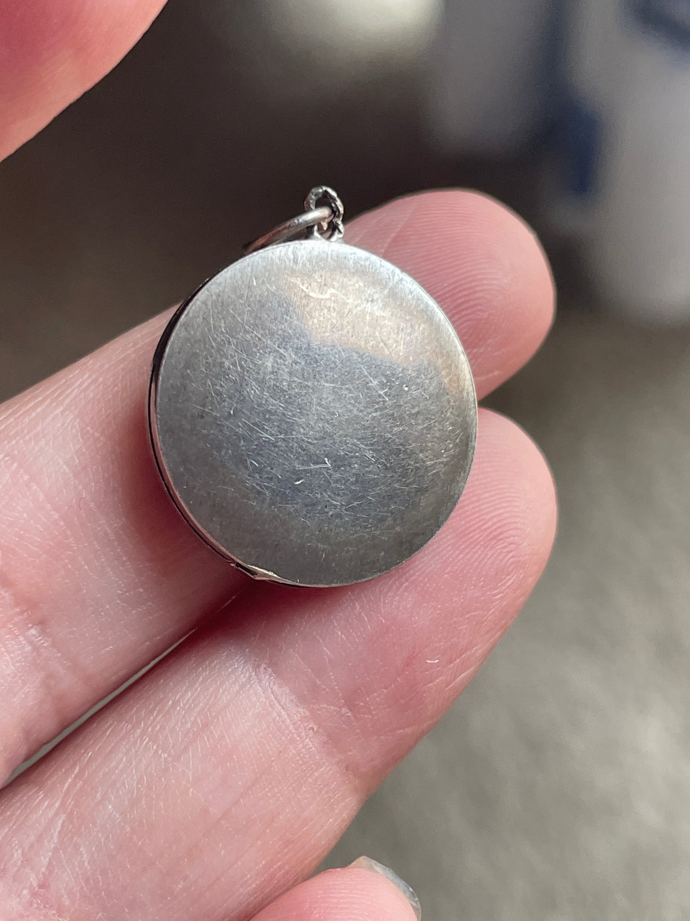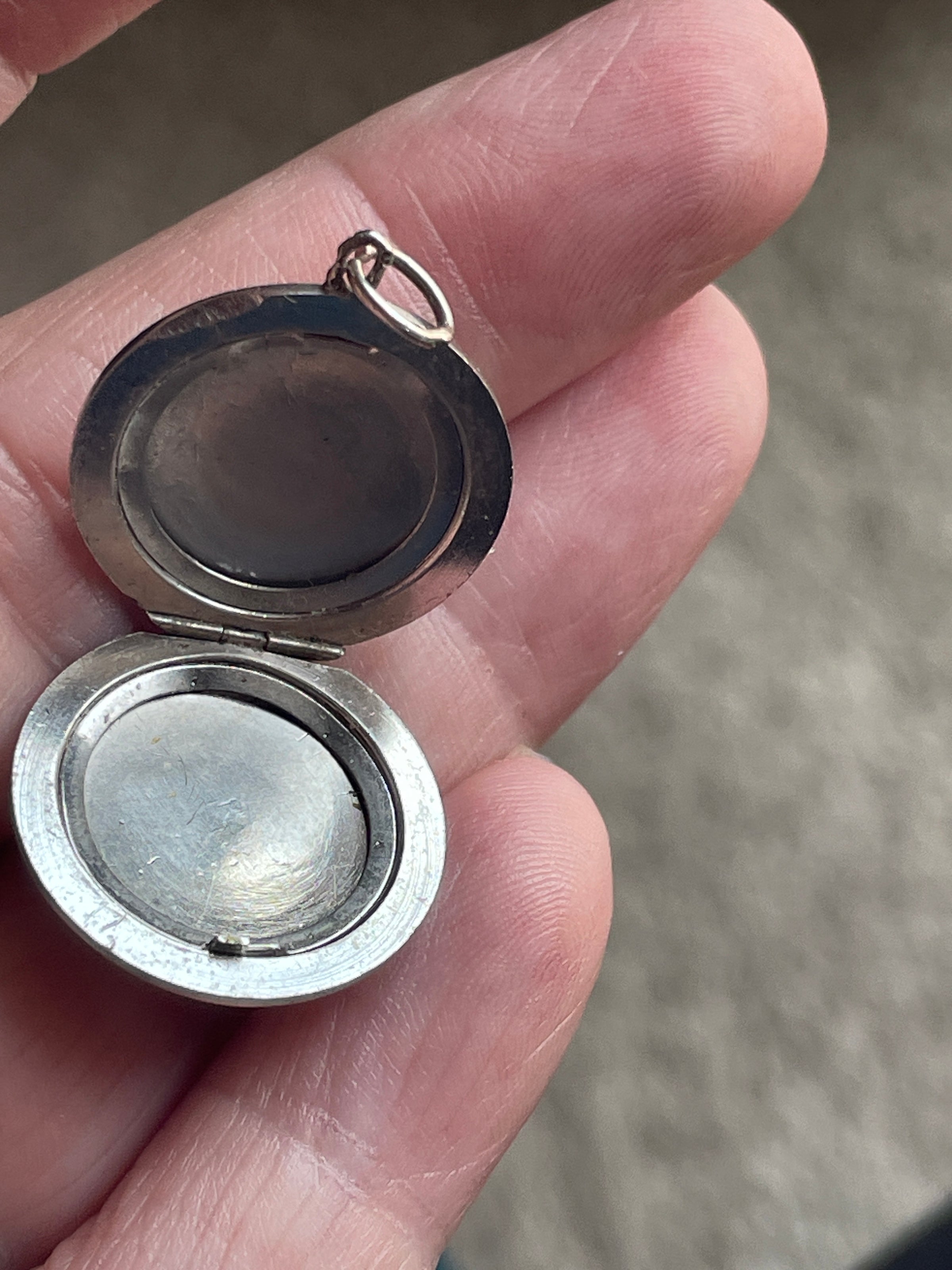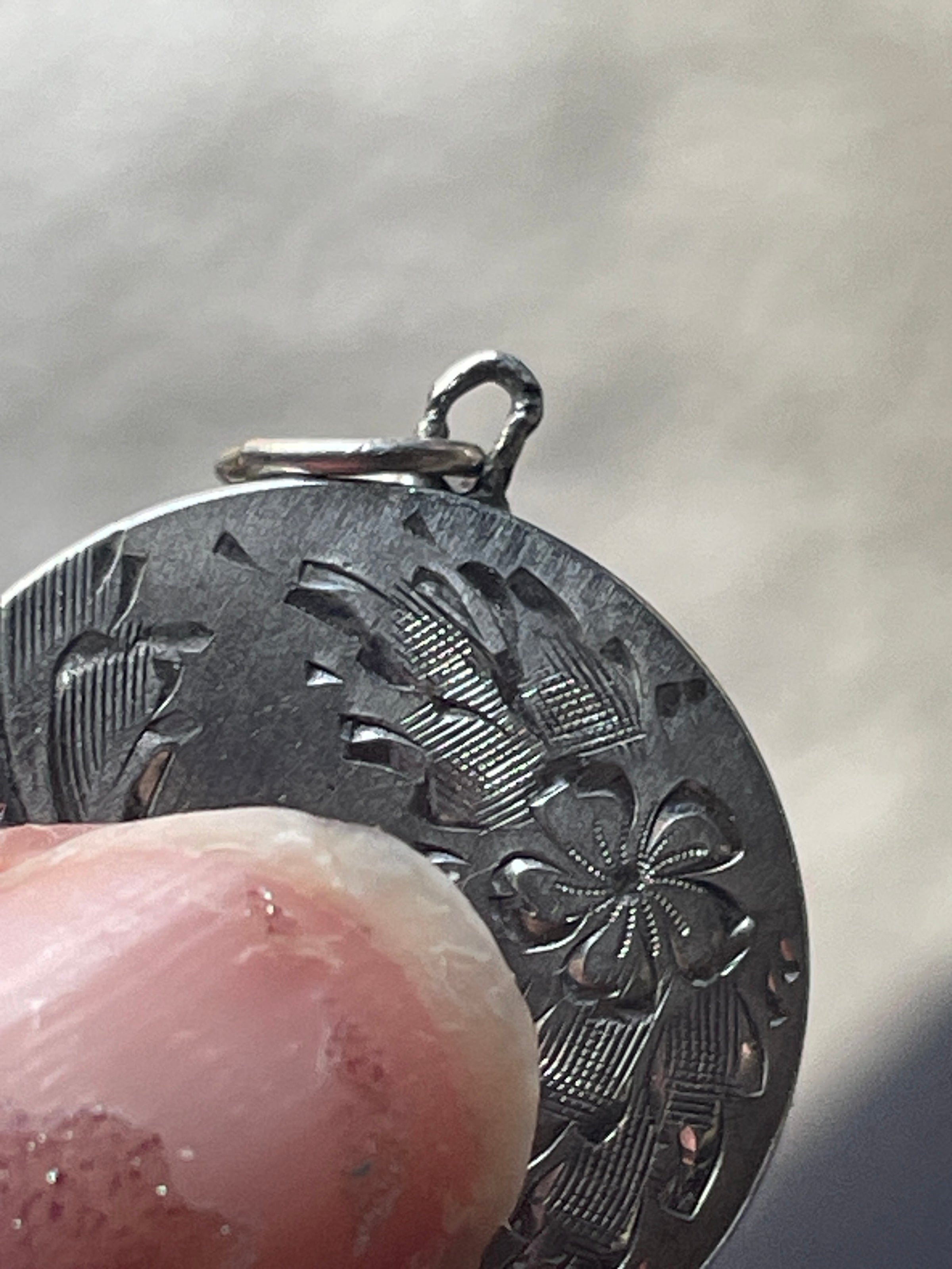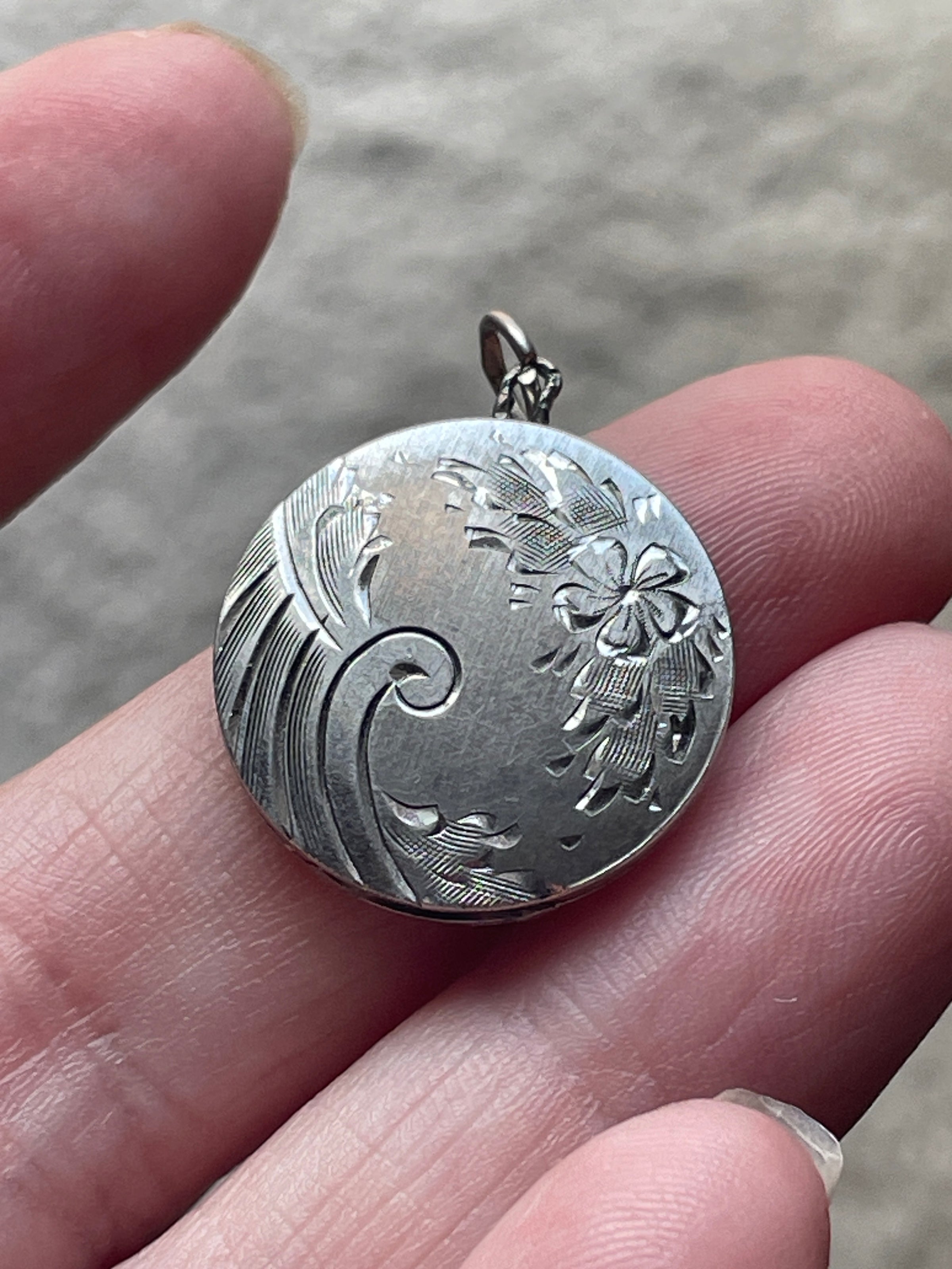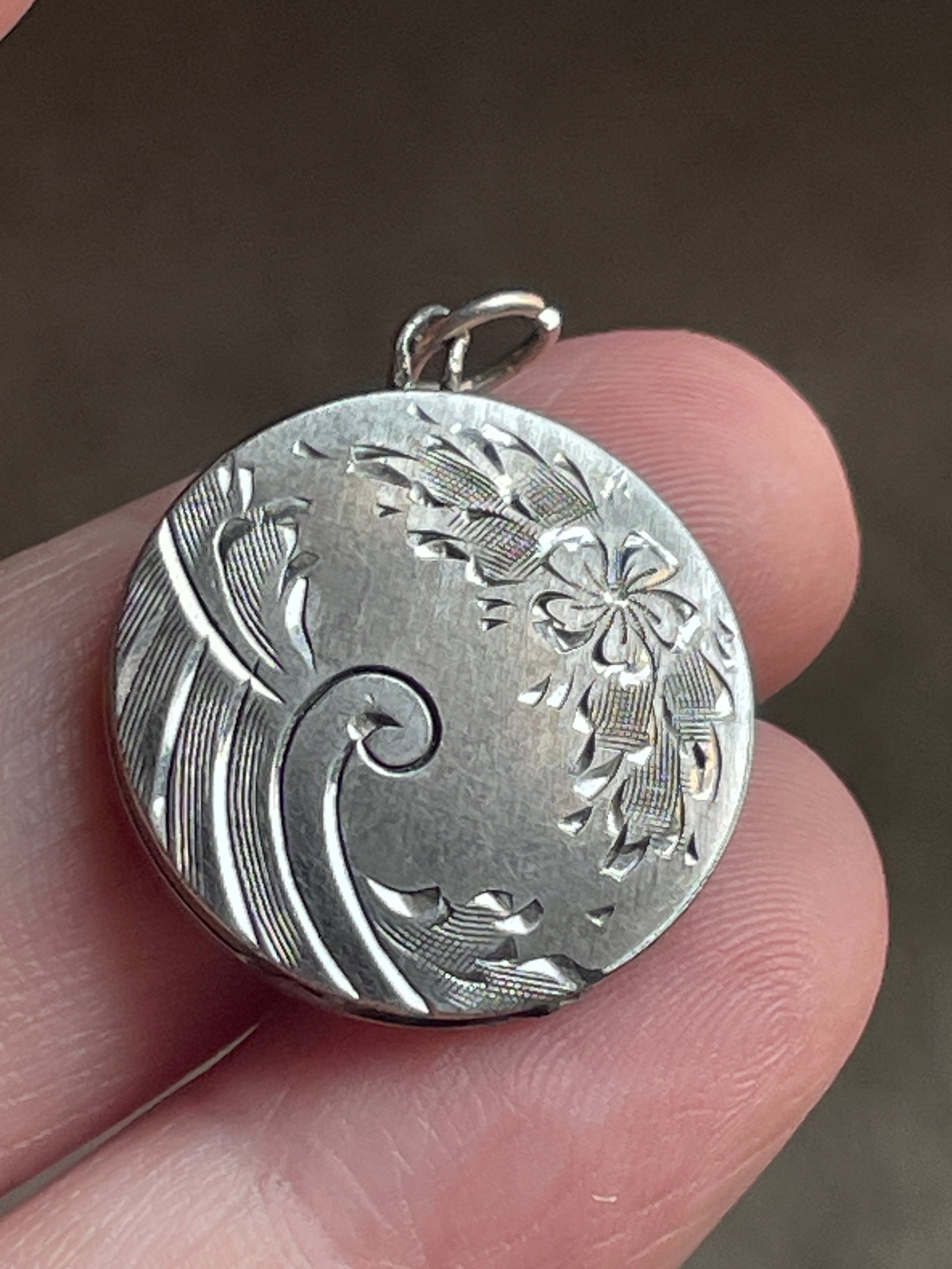 Beautiful vintage engraved flower locket in sterling silver. Gorgeous design that shimmers in the light. Locket measures just over 0.75 inches with top loop. Two frames present inside. Closes well though doesn’t make snapping sound. Top loop is worn (see photo).