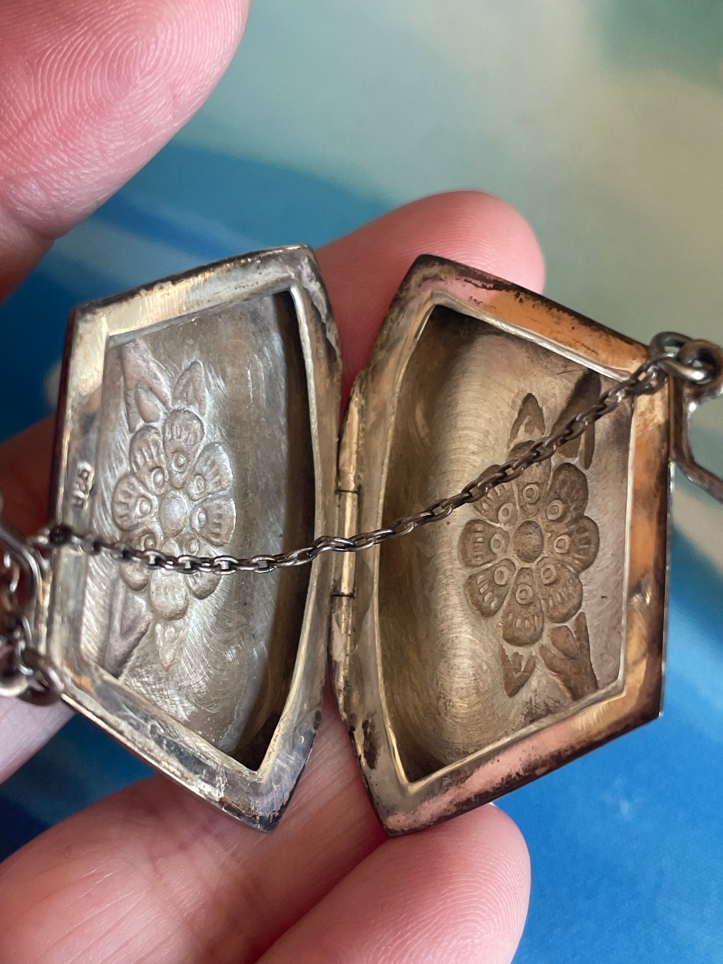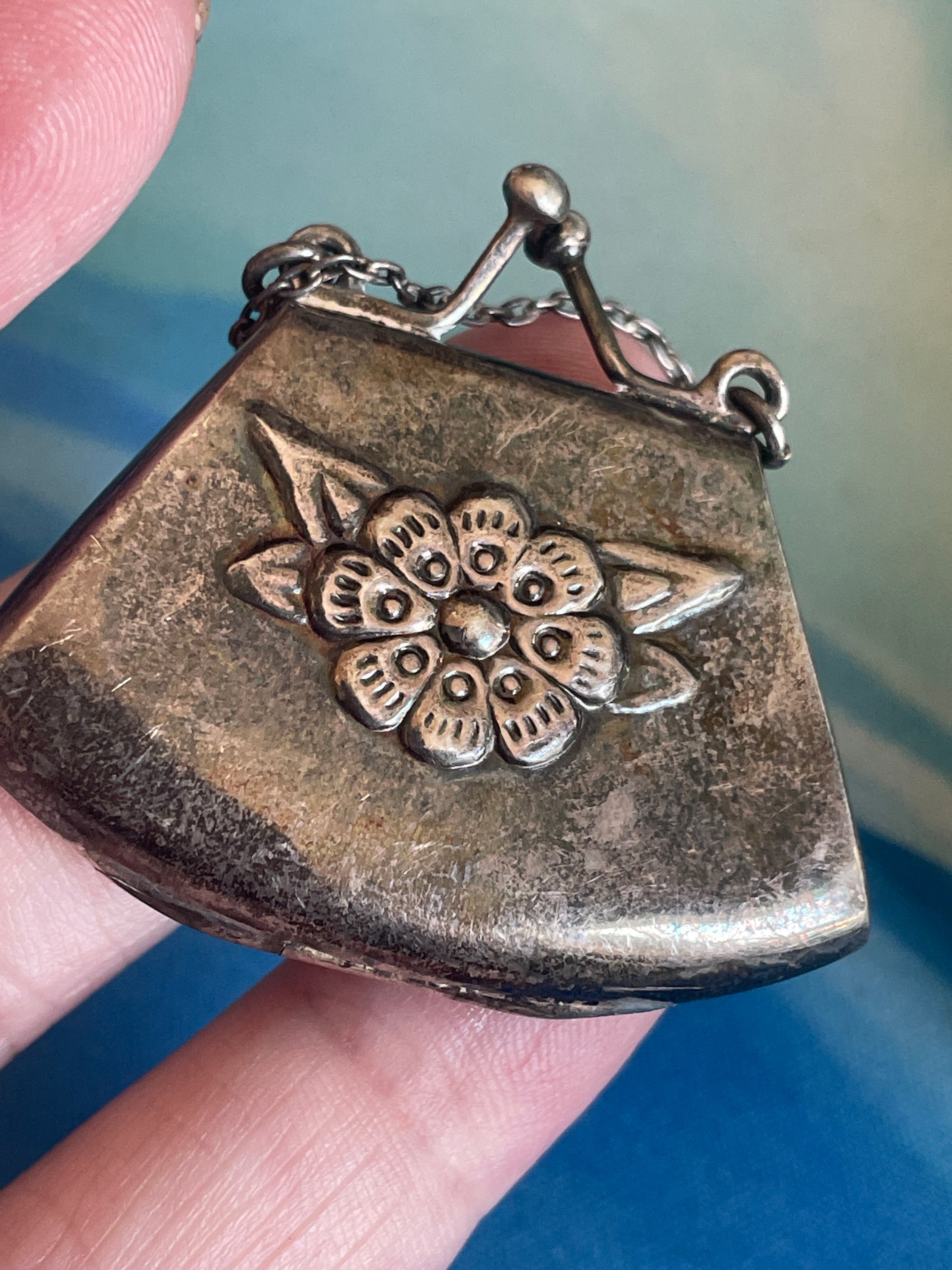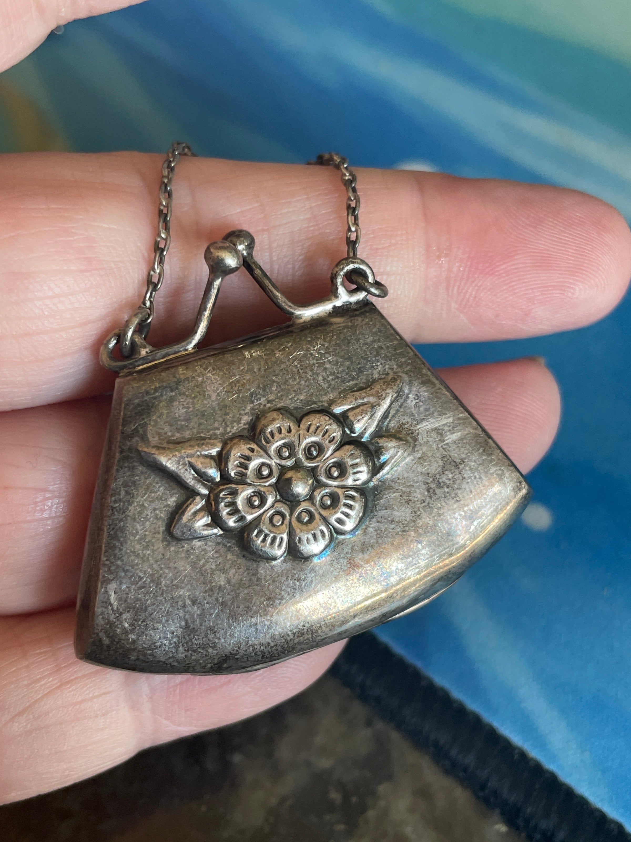 Fabulous larger purse type locket in sterling silver with flowers on both sides. Has a kisslock closure. Measures approx 1.25 inches (purse itself) and 2.25 inches with chain. Has a few little imperfections see photos (tiny dents) but overall good condition.