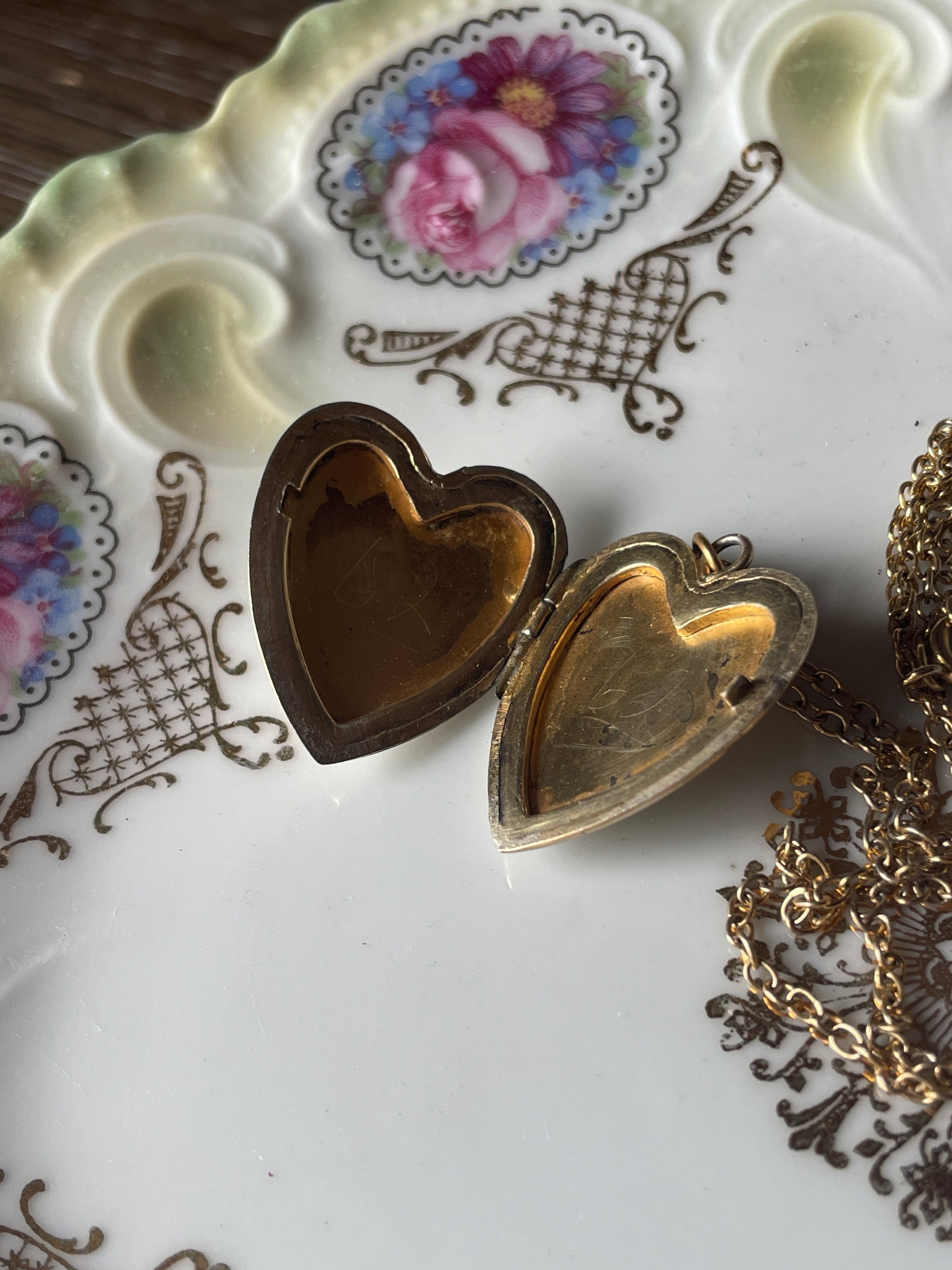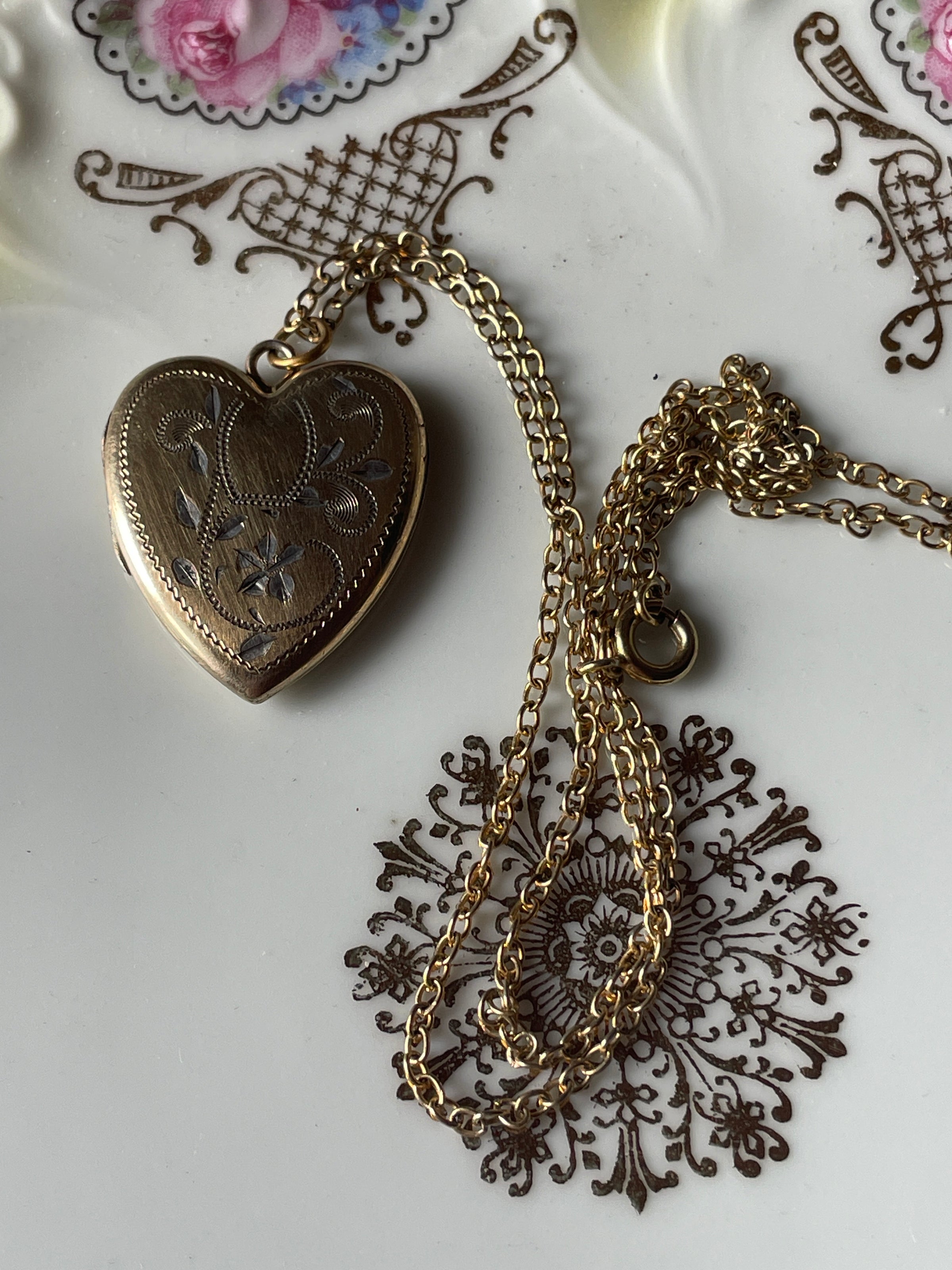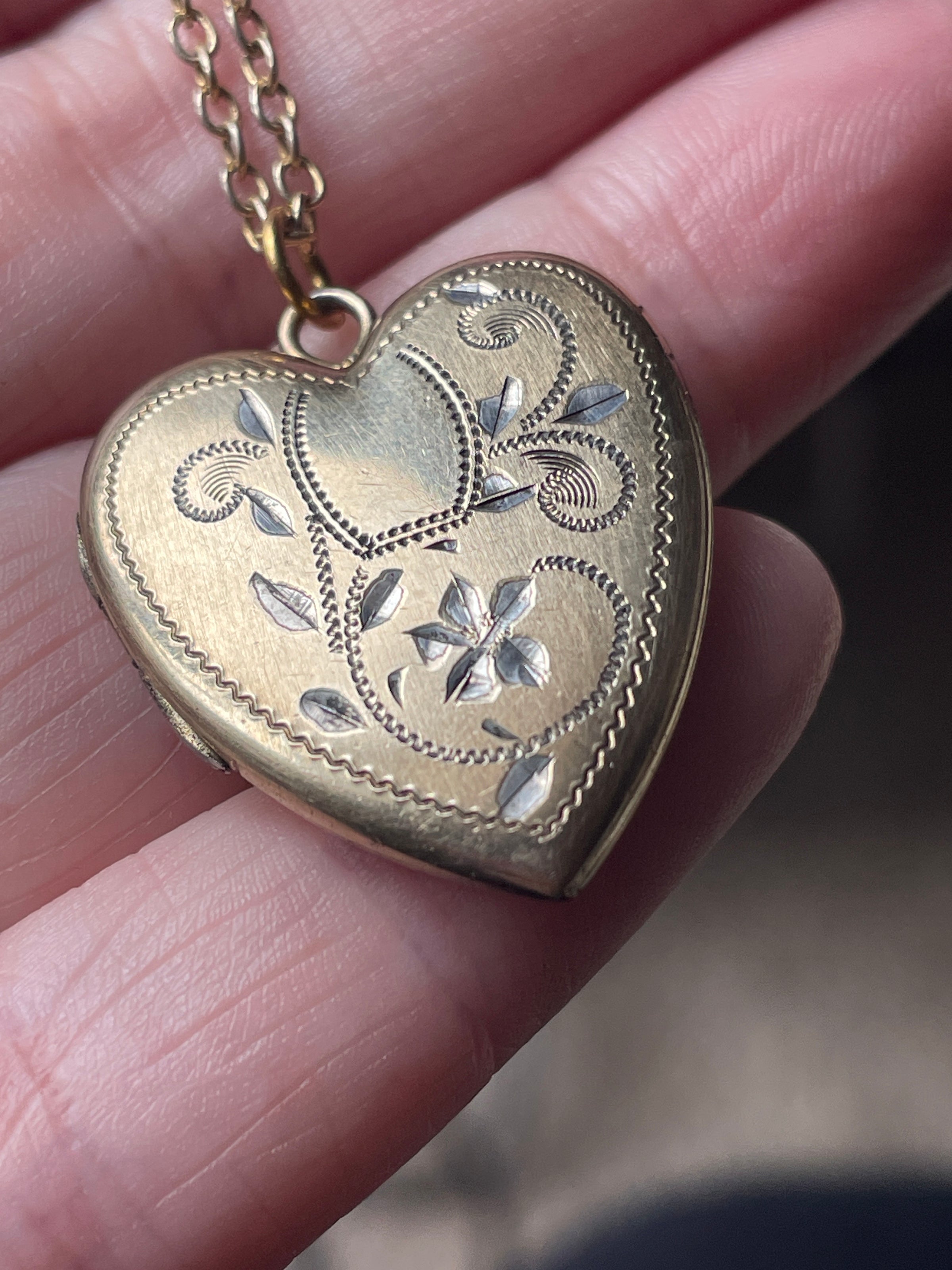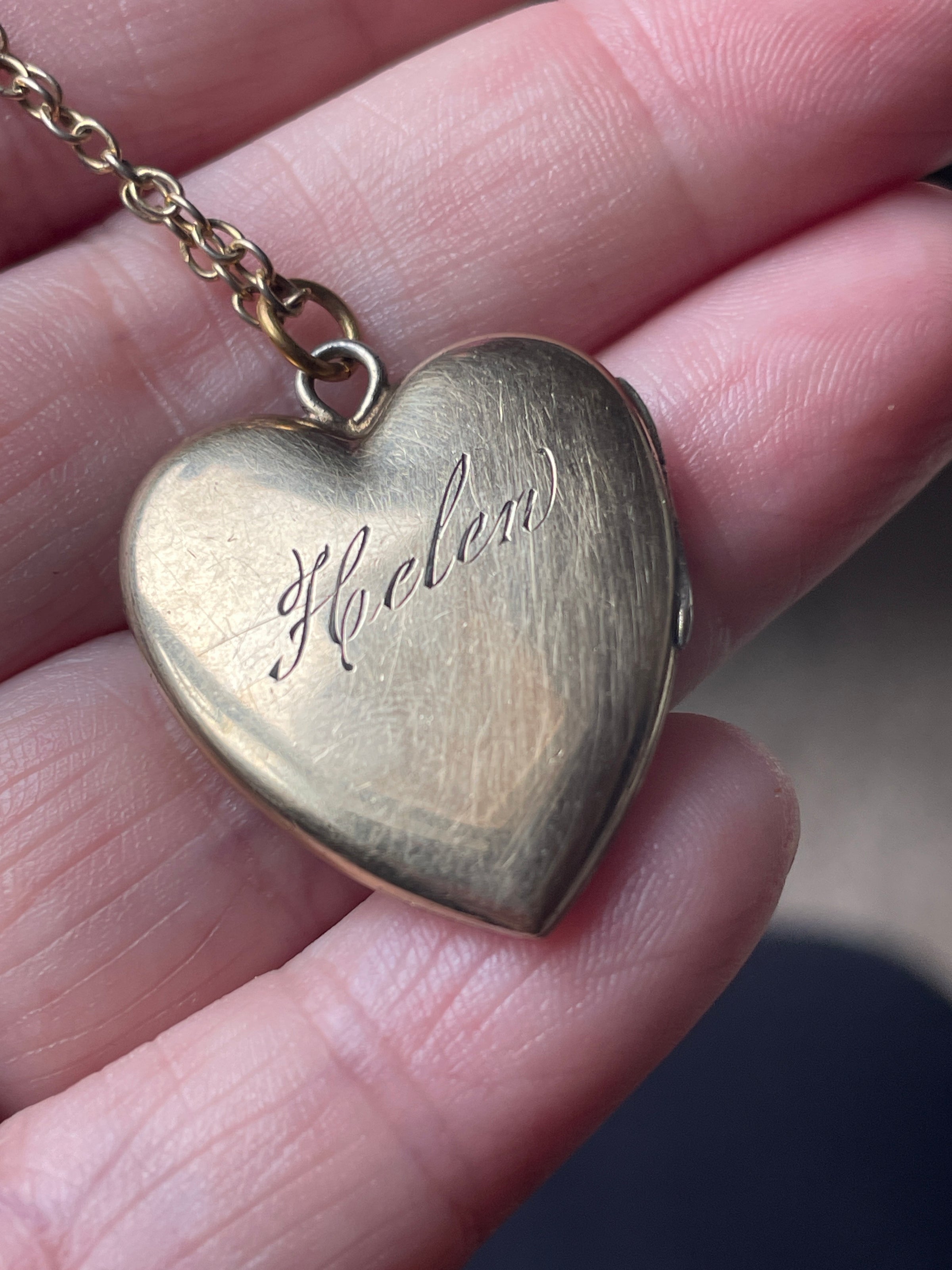 Beautiful heart locket with engraved flower design and the name “Helen” engraved on back. Locket measures just under 1.25 inches with top bail x 0.75 inches. Inside has some wear and markings. Closes with a snap. Unmarked but likely gold filled. Comes on 18 inch chain.
