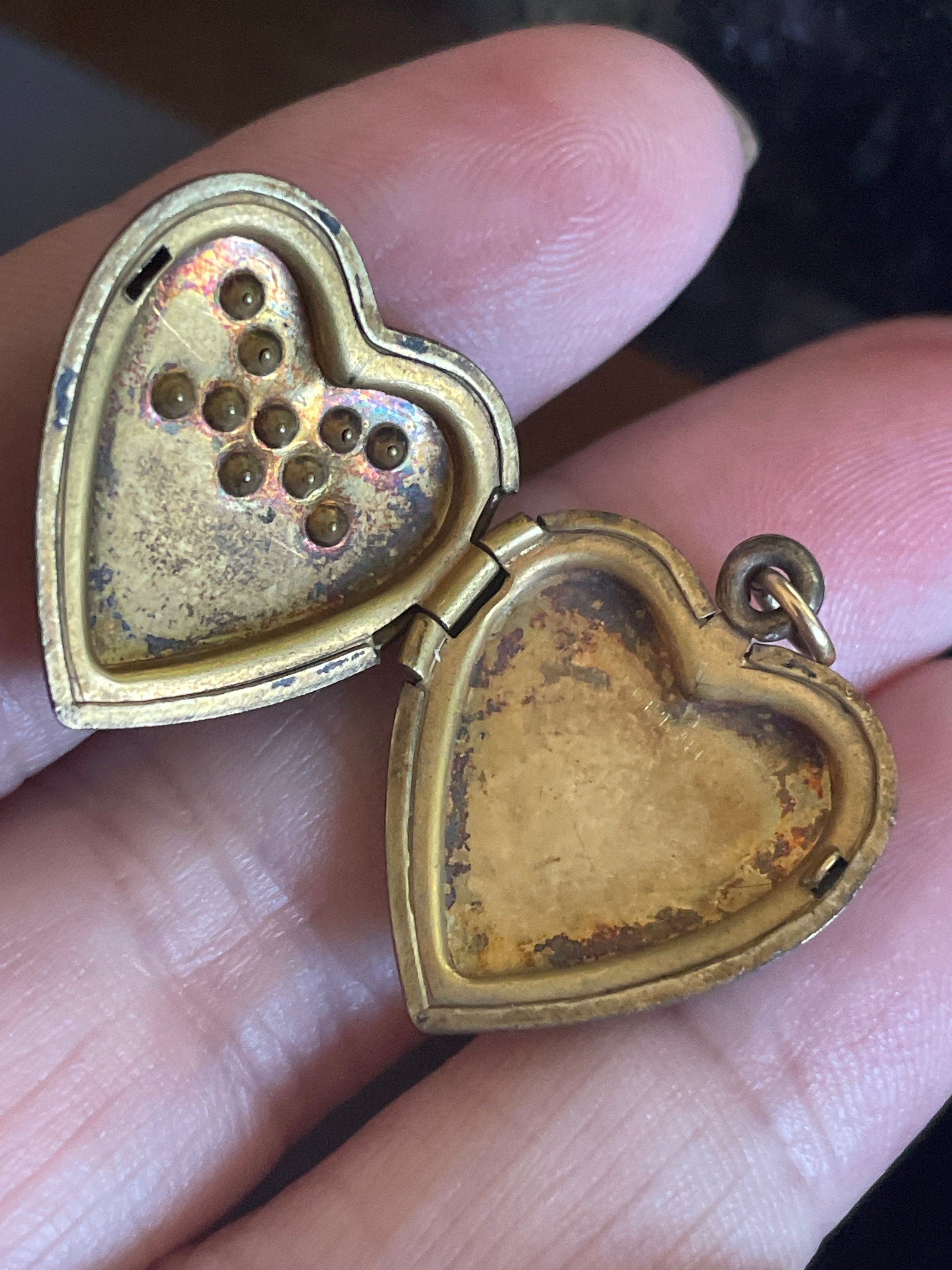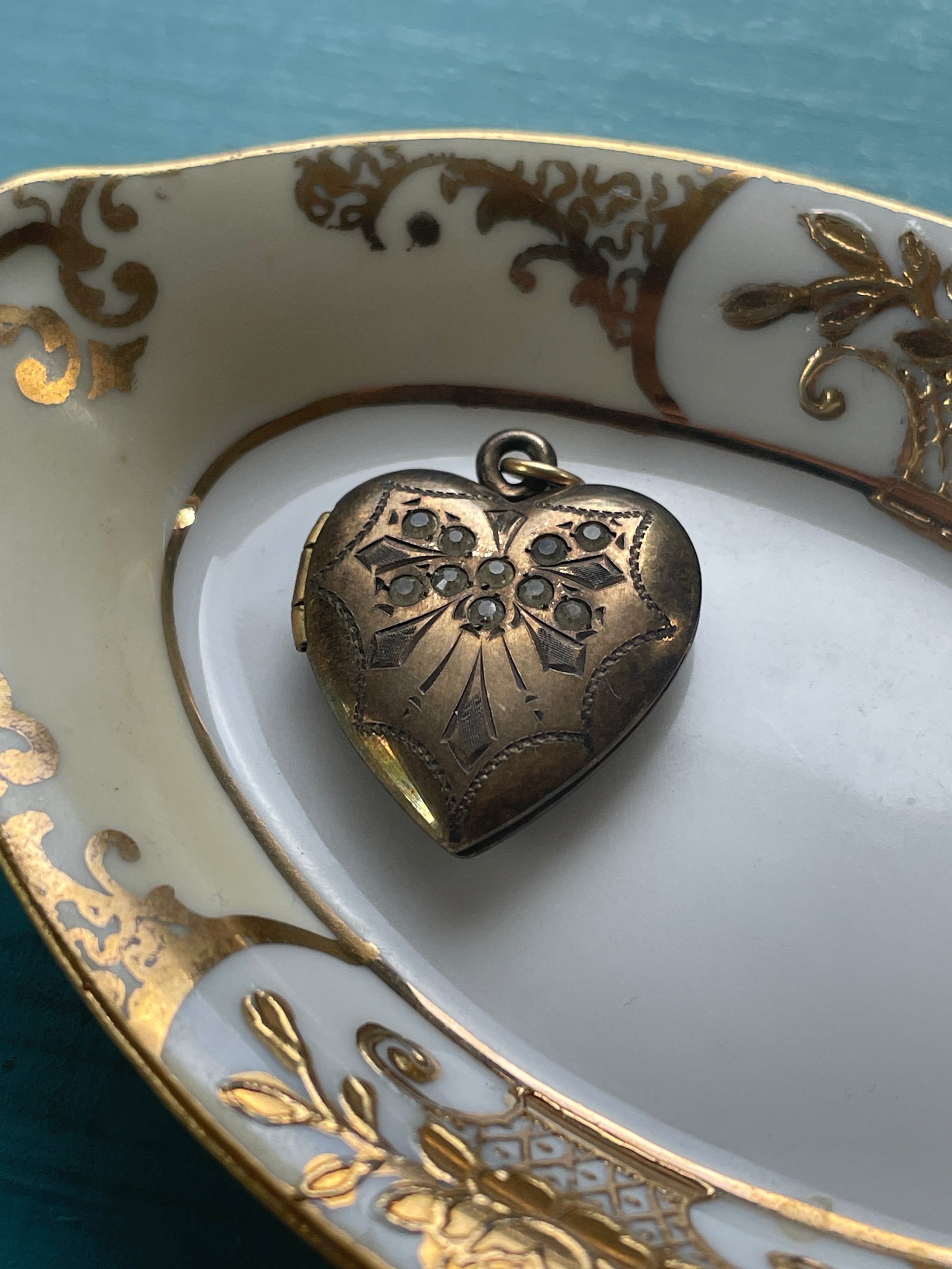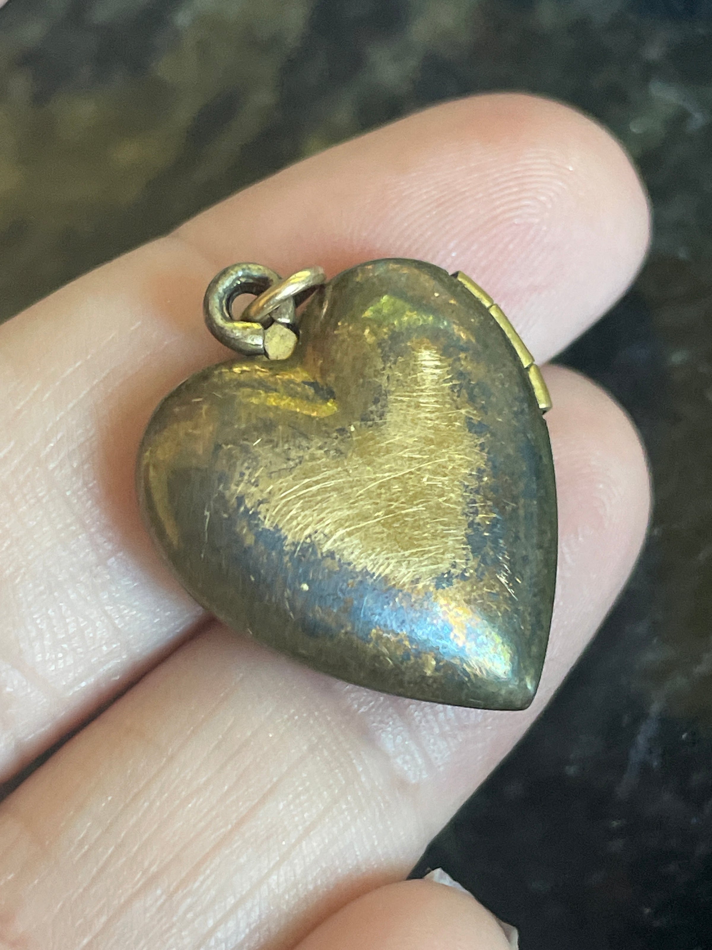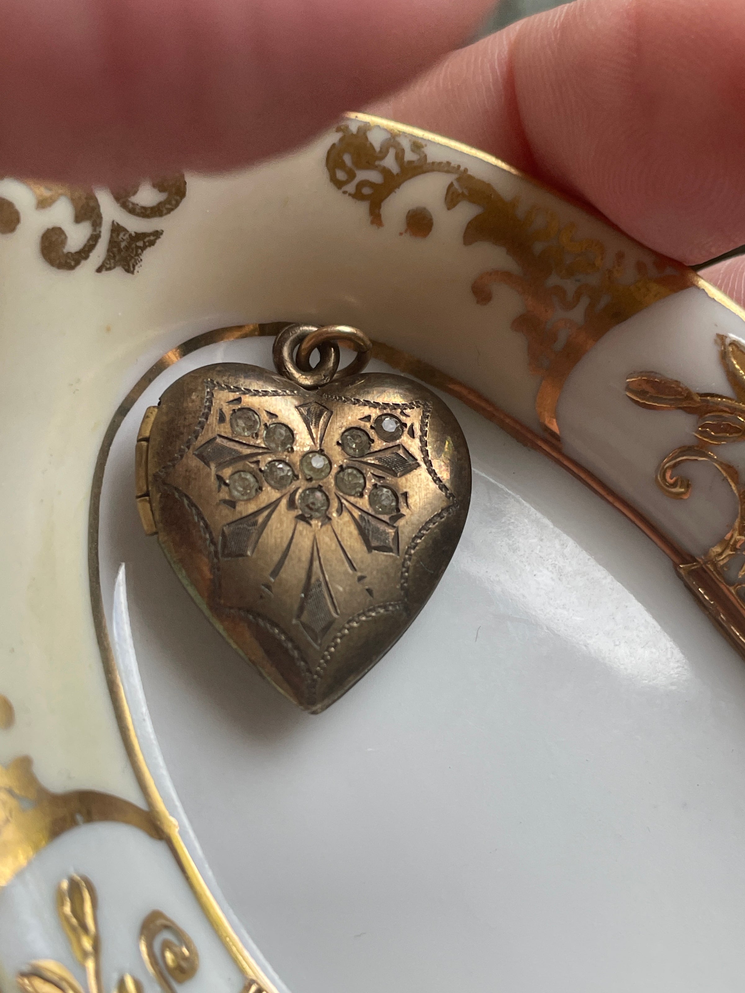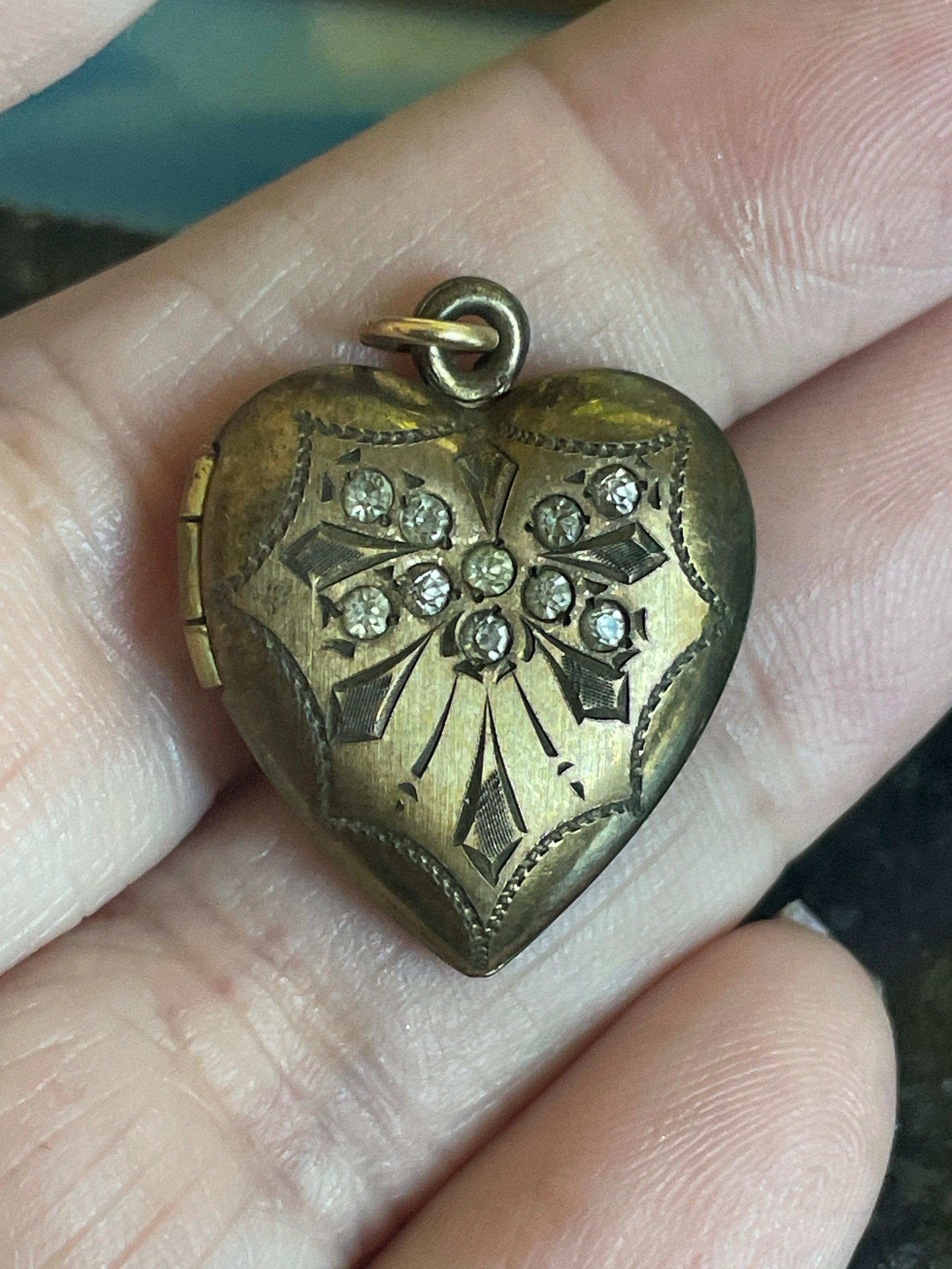 Gorgeous Heart locket with paste design. Locket measures just under 1 inch (with top loop) x 0.75 inches. No frames present. Note wear on back. Front consistently darkened with age. Stamped “1/20 12k GF”.