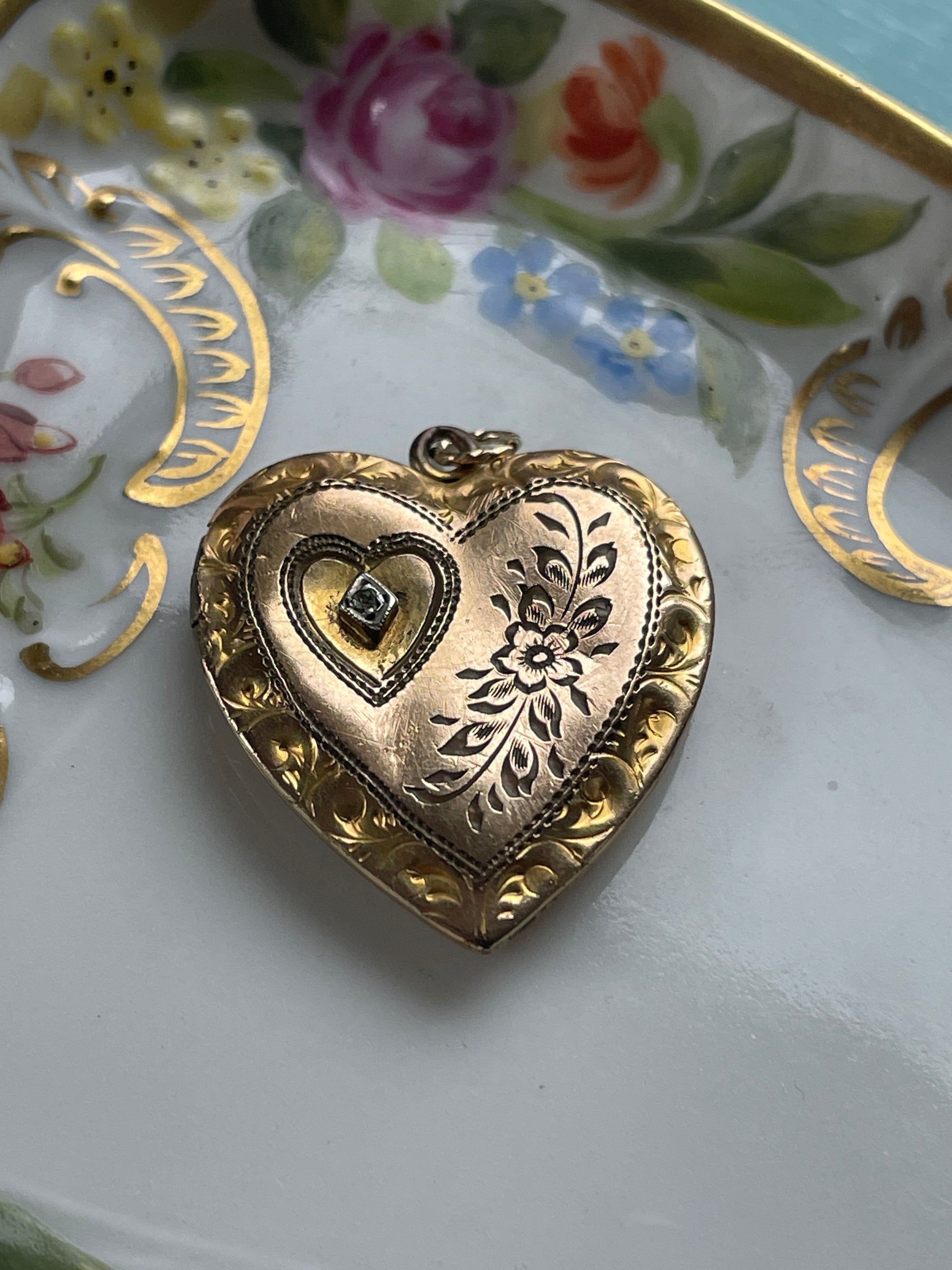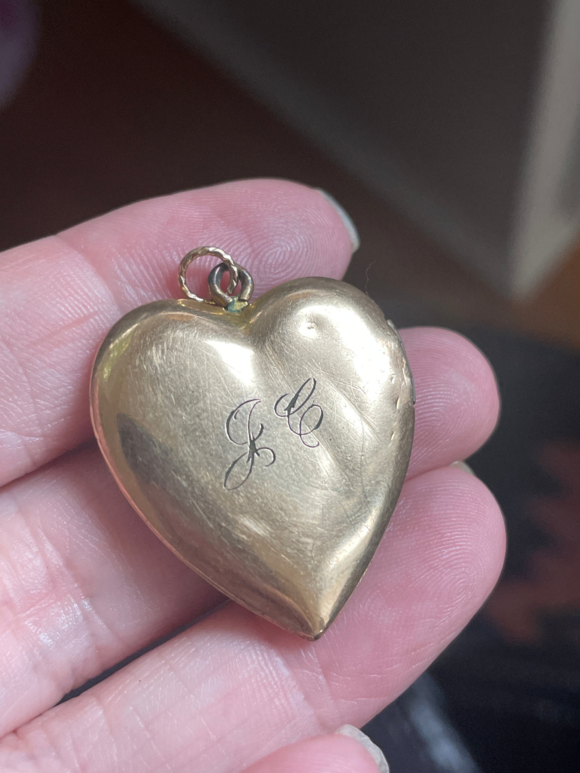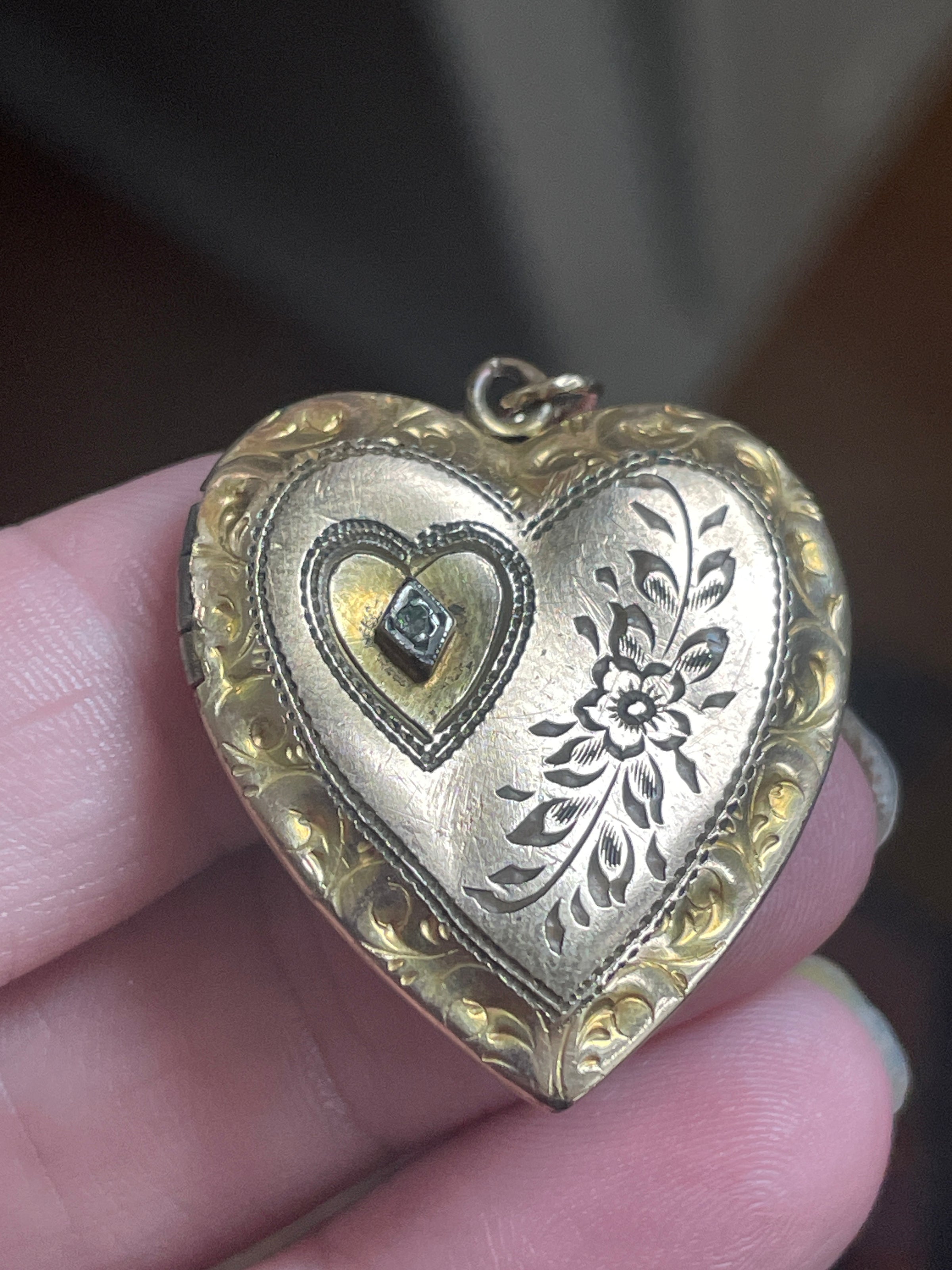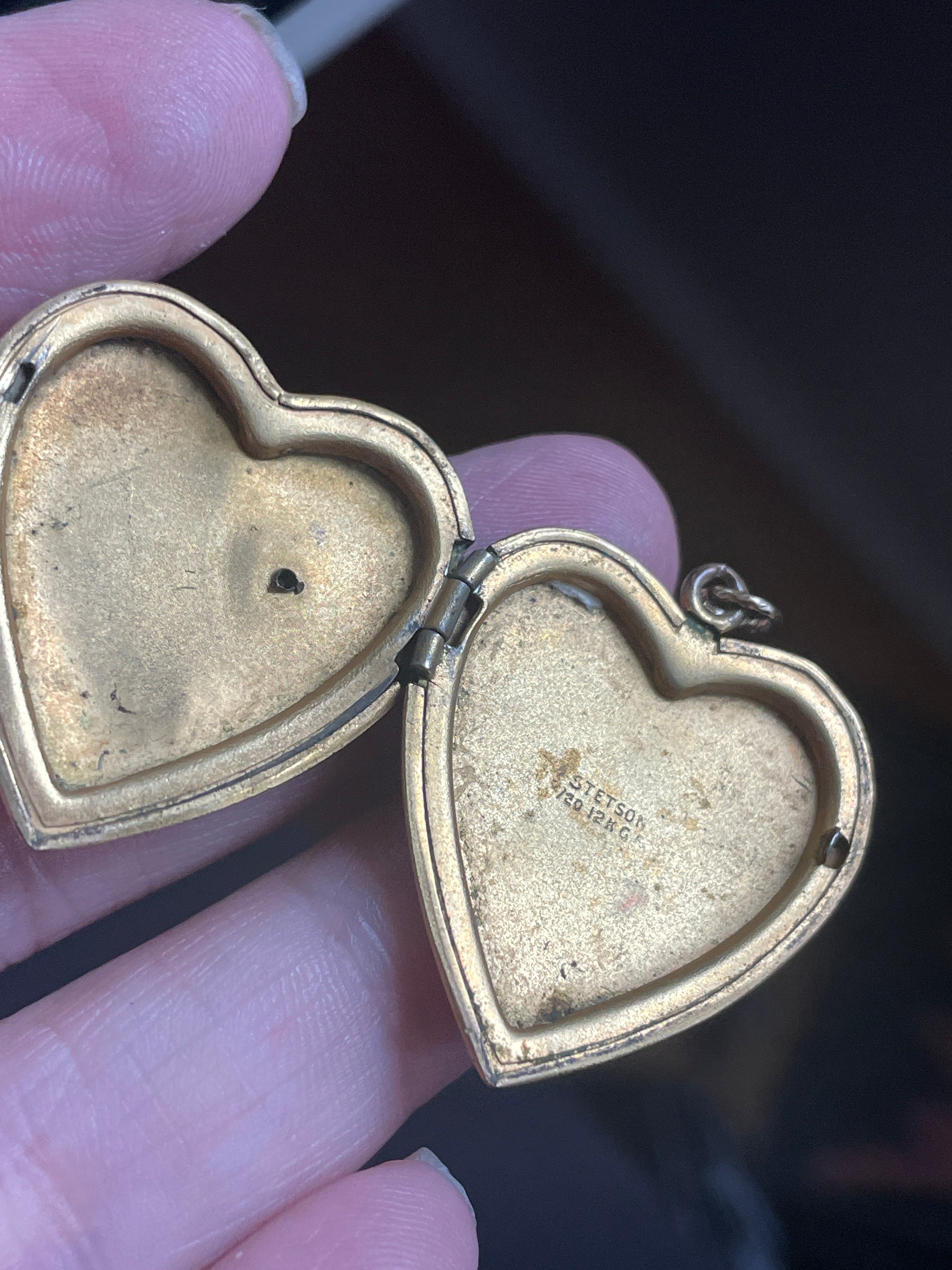Lovely larger engraved floral heart locket in gold filled metal. Measures just over 1.25 inches (with top loop) x 1 inch. Front has a bit of a small dent but hard to notice. Locket hinge is a bit wobbly but does currently close (price reflects). Stamped “Stetson” and marked for being gold filled inside. Has initials on back along with a few dents.