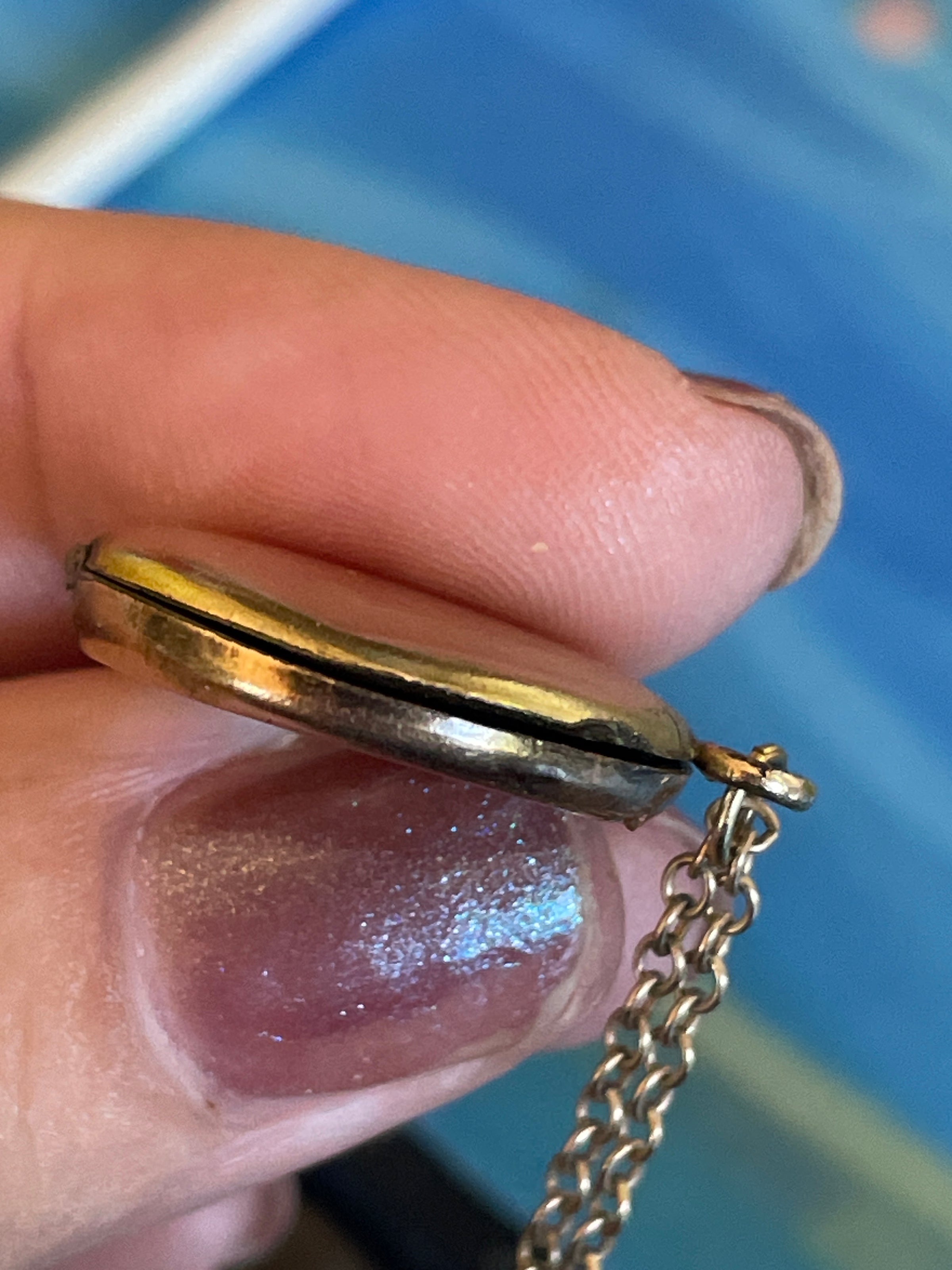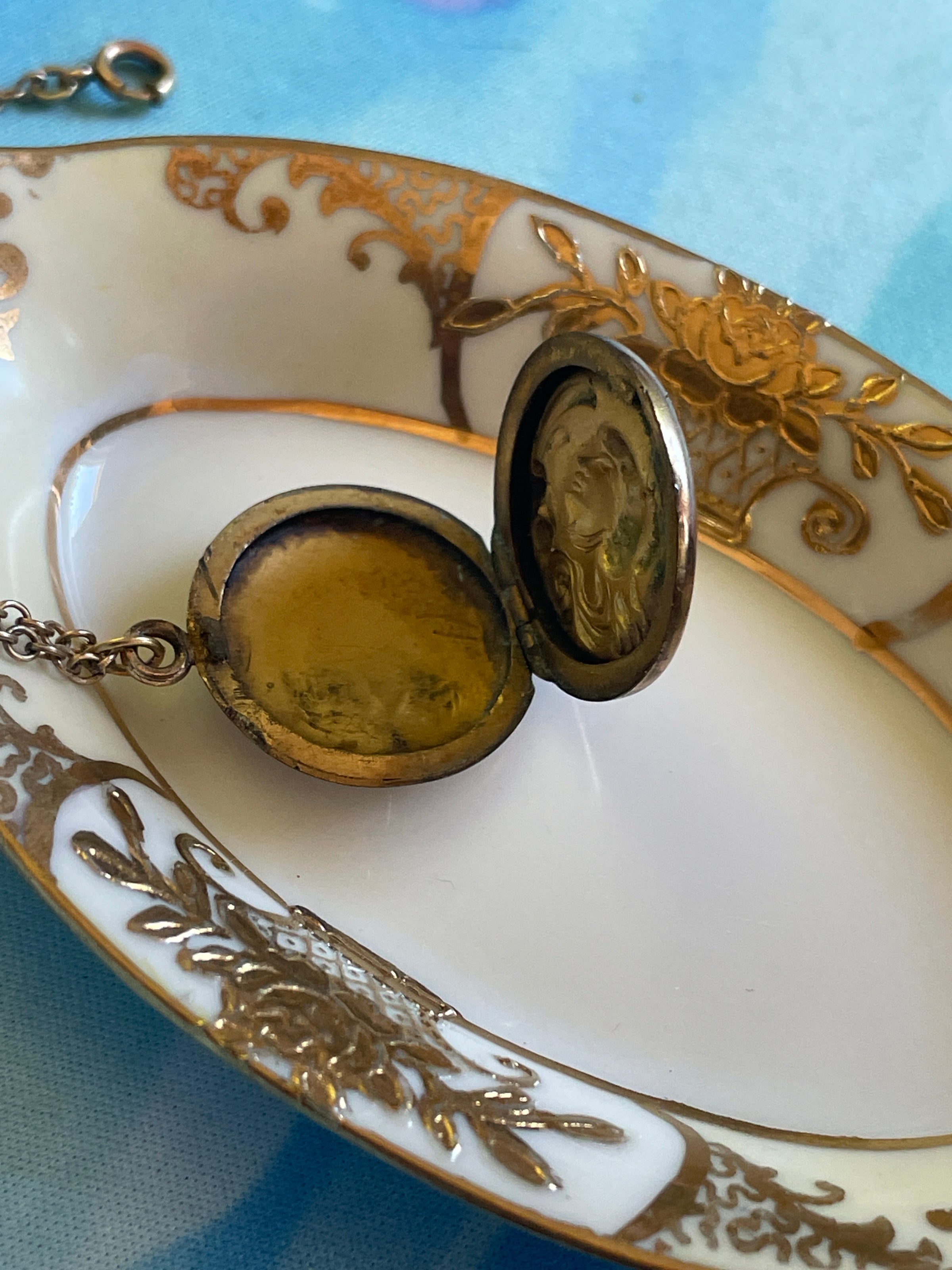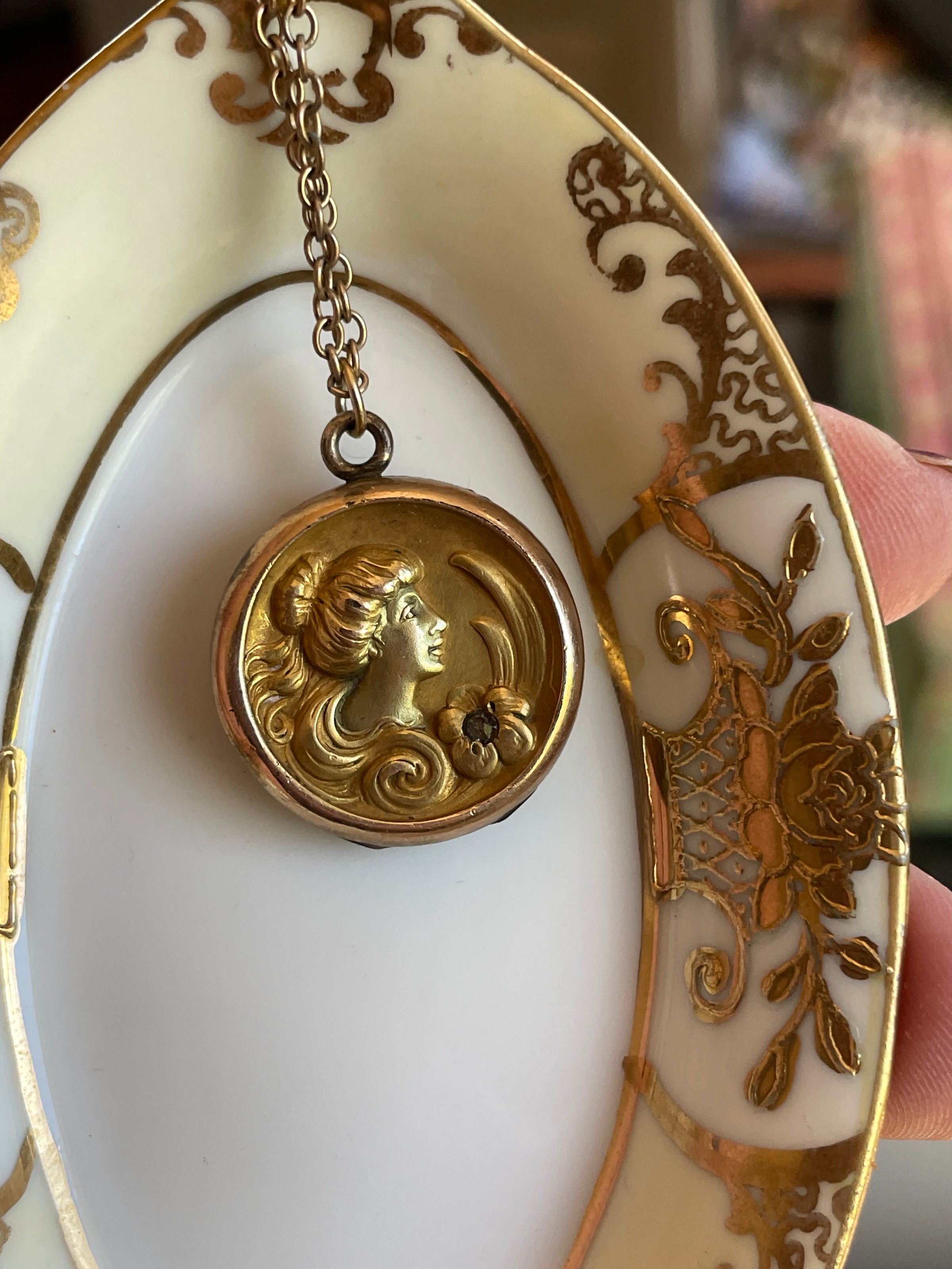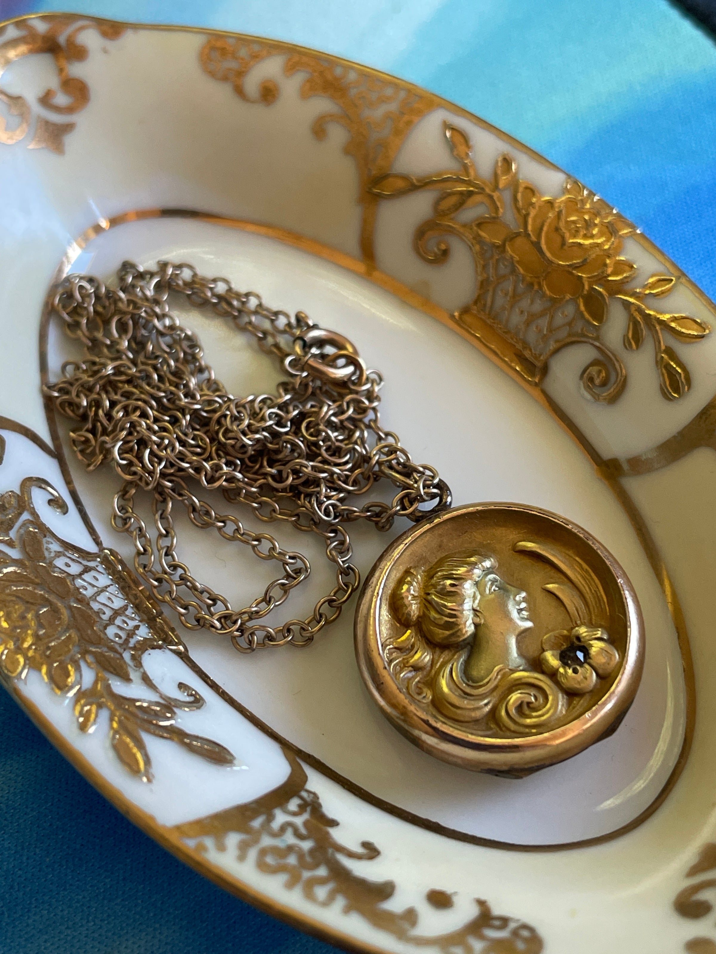 Stunning rare Nouveau Lady locket with floral accent.  Smaller size than similar pieces I’ve seen.  Locket measures approx 0.75 inches x 1 inch with loop.  Chain measures approx 28 inches.  Back is fairly dented but still closes well.  Side still has some space when closed.  See last photo.  Chain is stamped for gold filled on clasp.