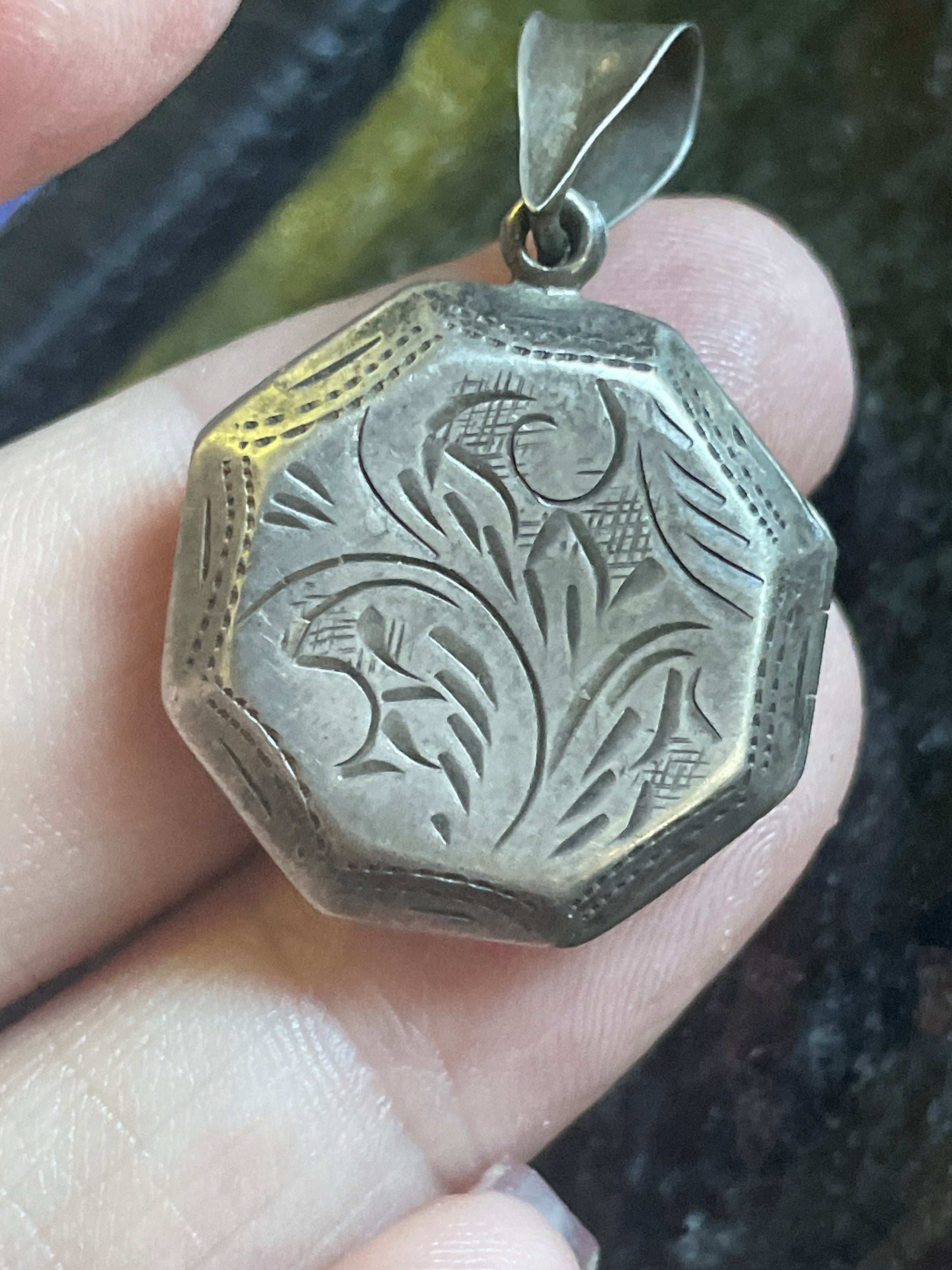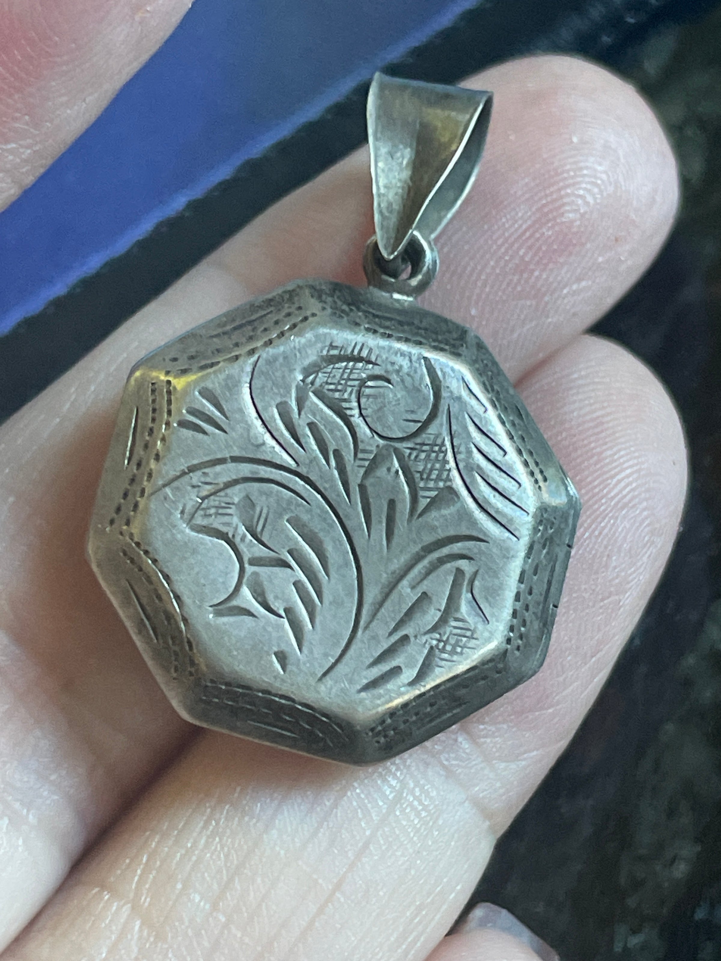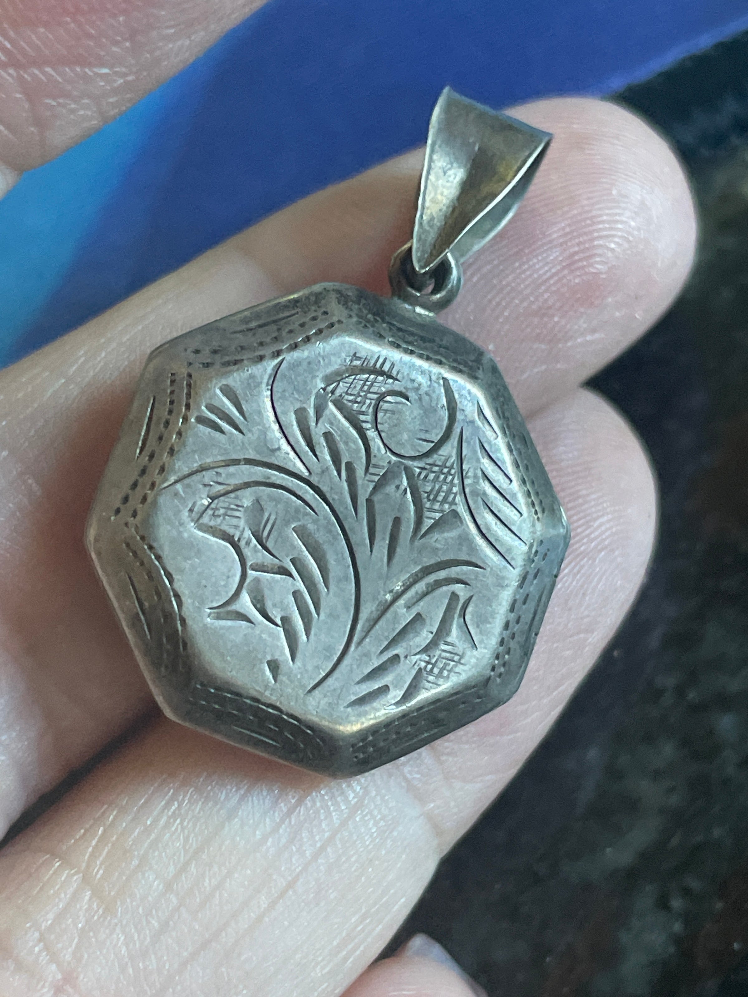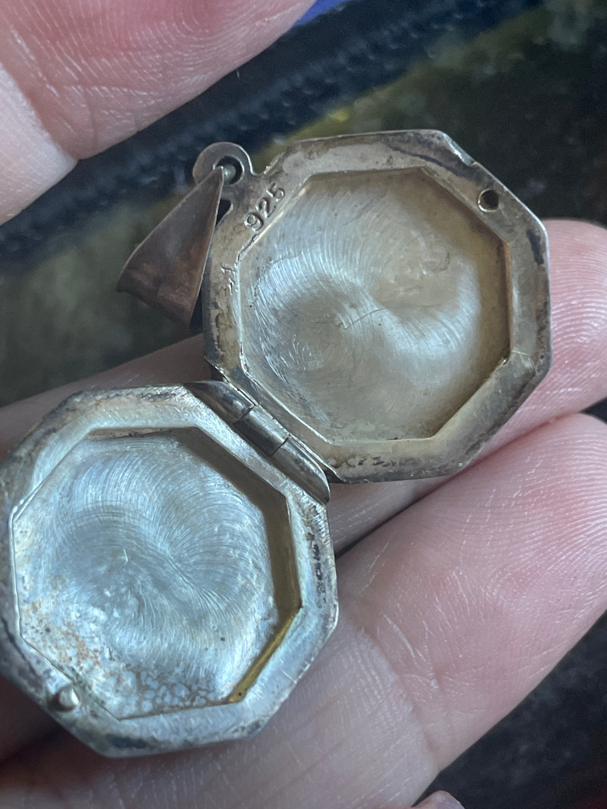 Fabulous octagonal locket in sterling silver. Measures approx 1.25 inches with top bail x 0.75 inches. Stamped 925 inside for sterling: