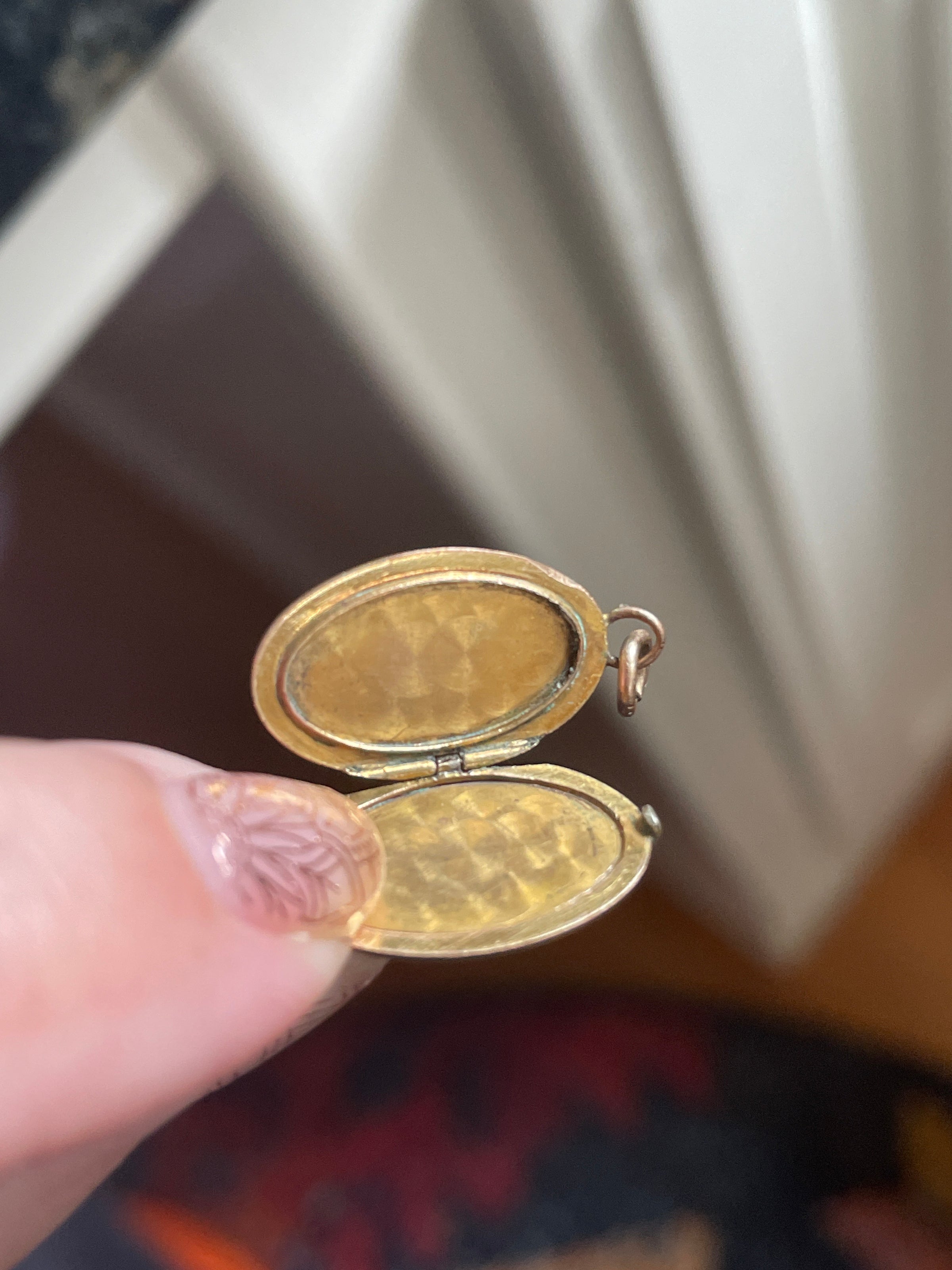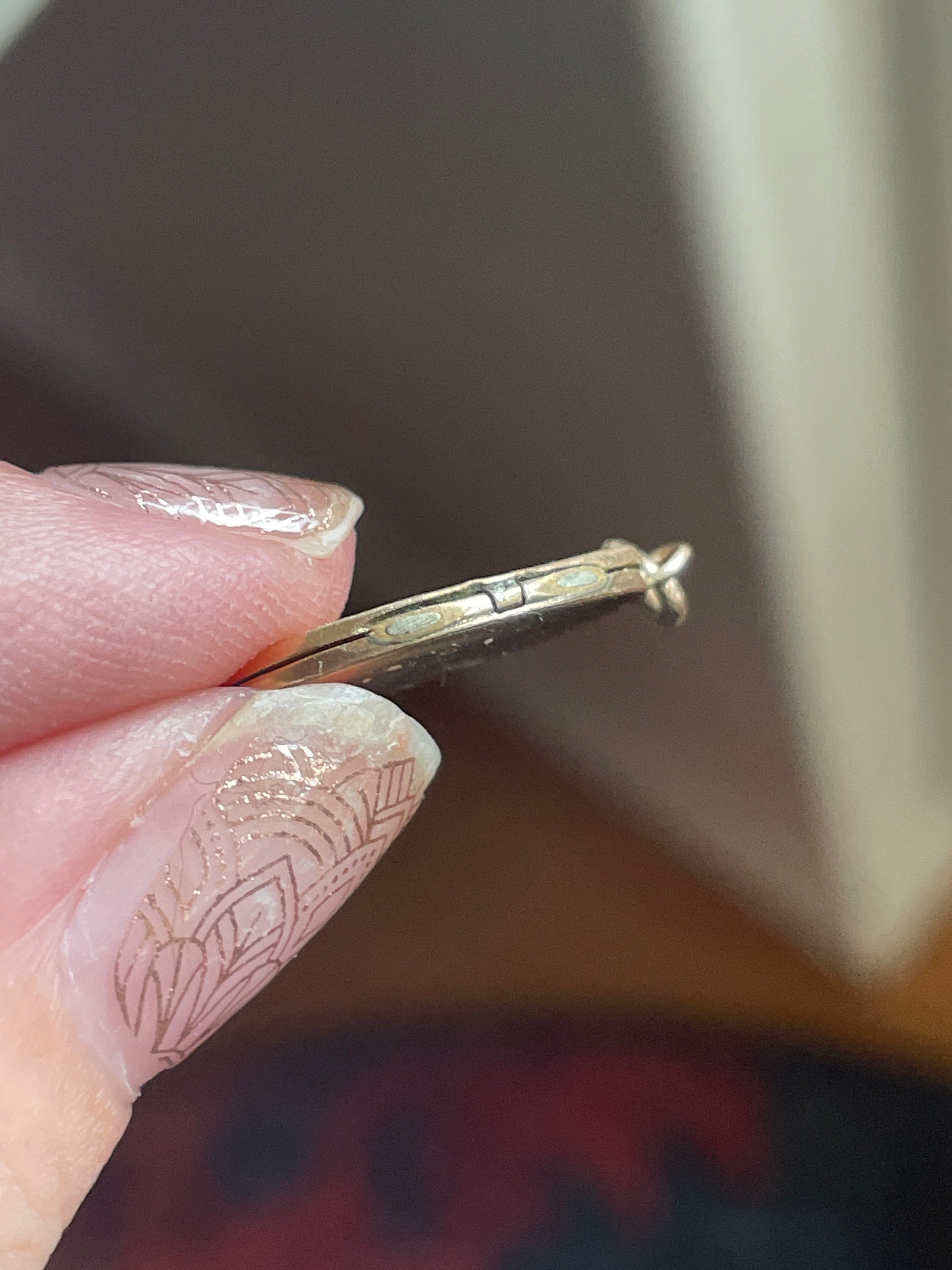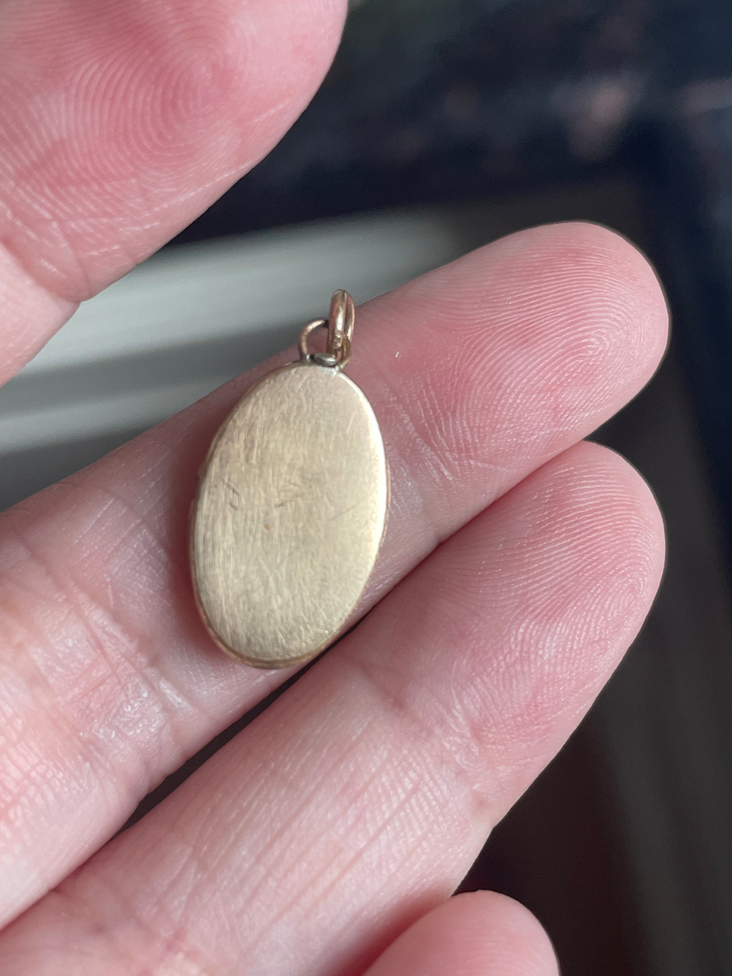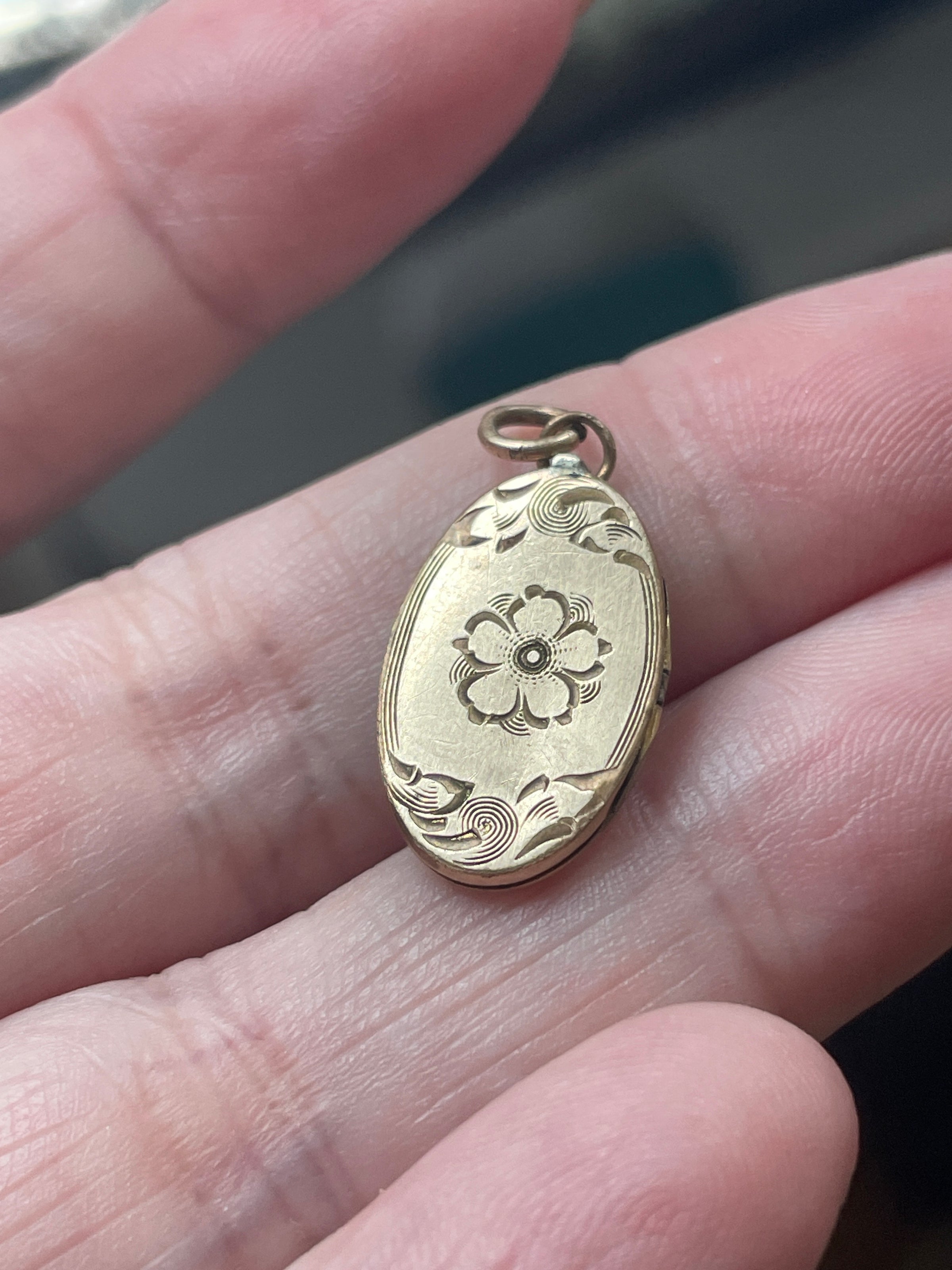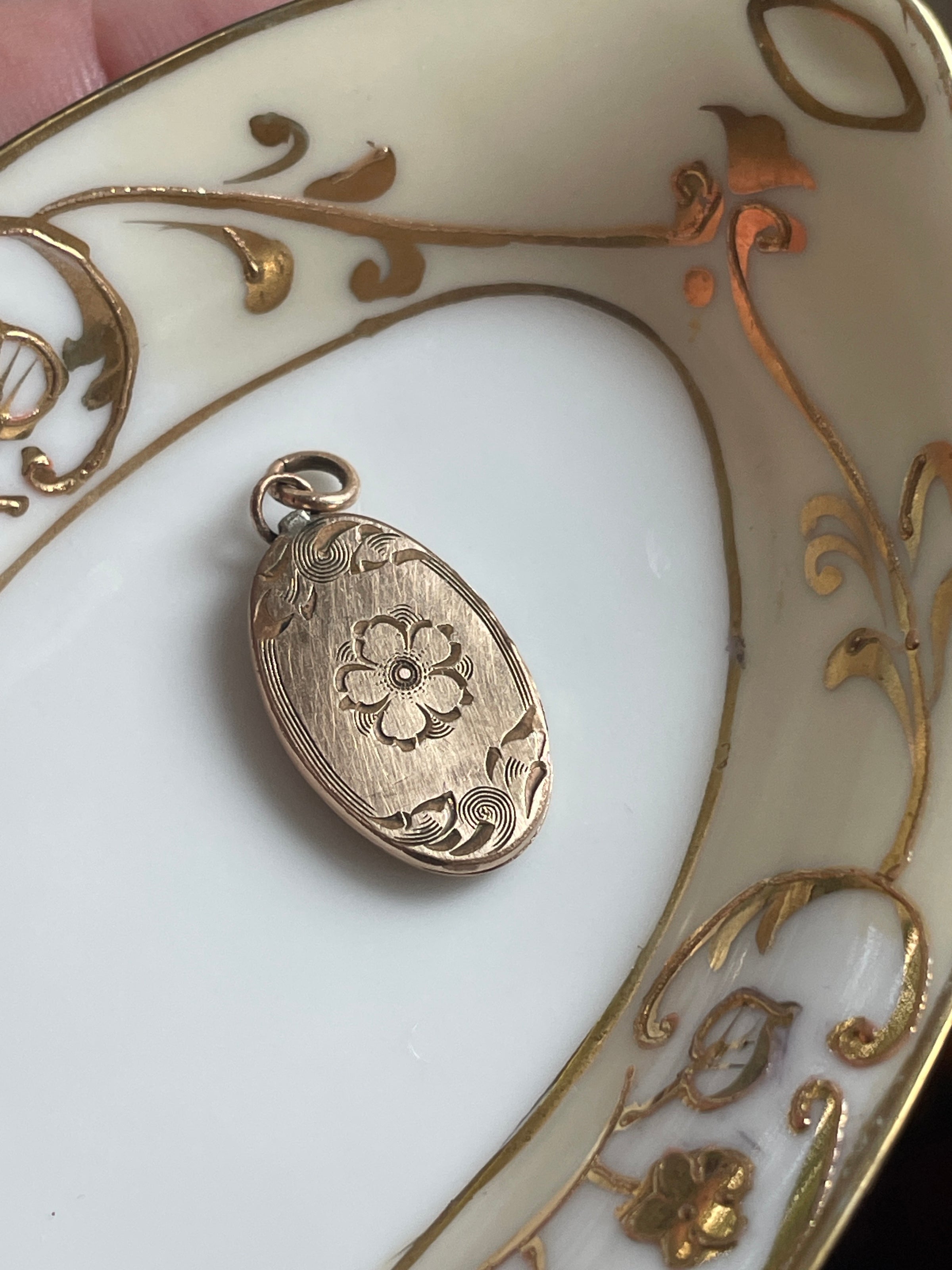 Lovely antique flower locket in very dainty design. Locket measures approx 0.75 inches and just over with top loop x approx 11mm. One frame present. Has closure at top even though opens to side. Closes but does not snap shut.