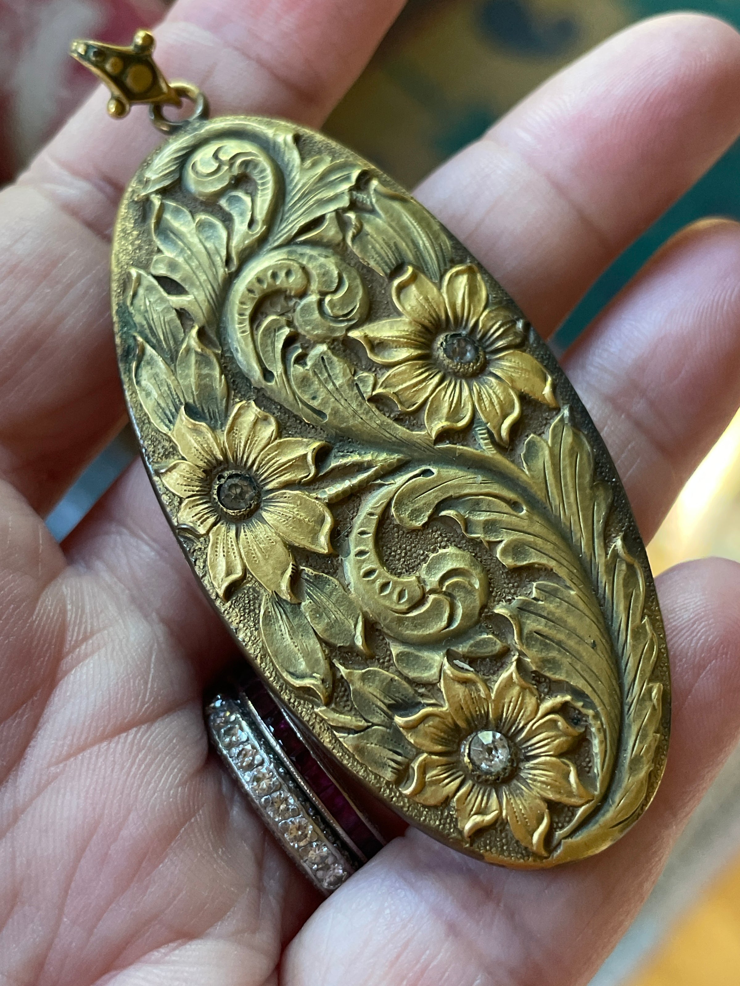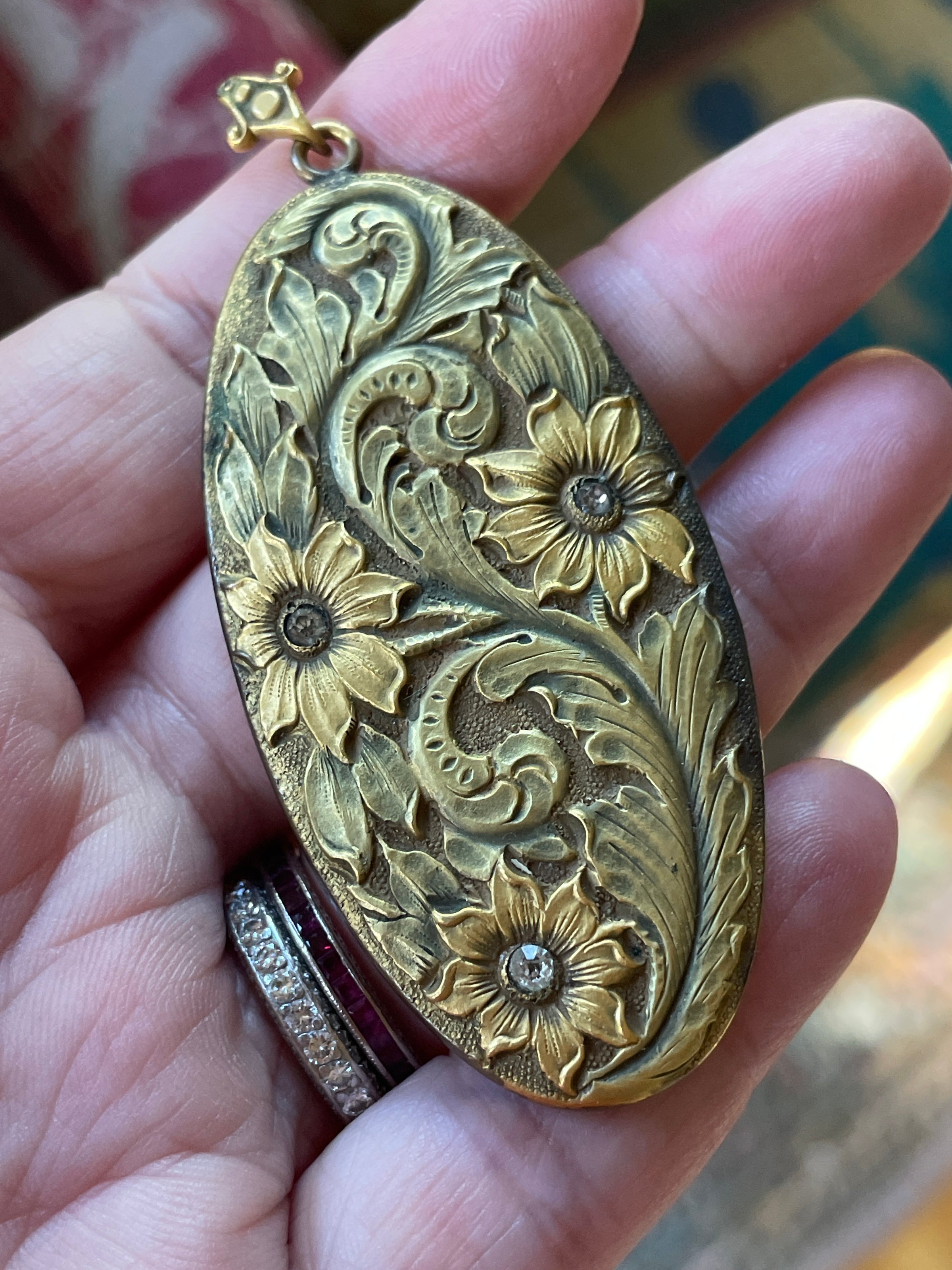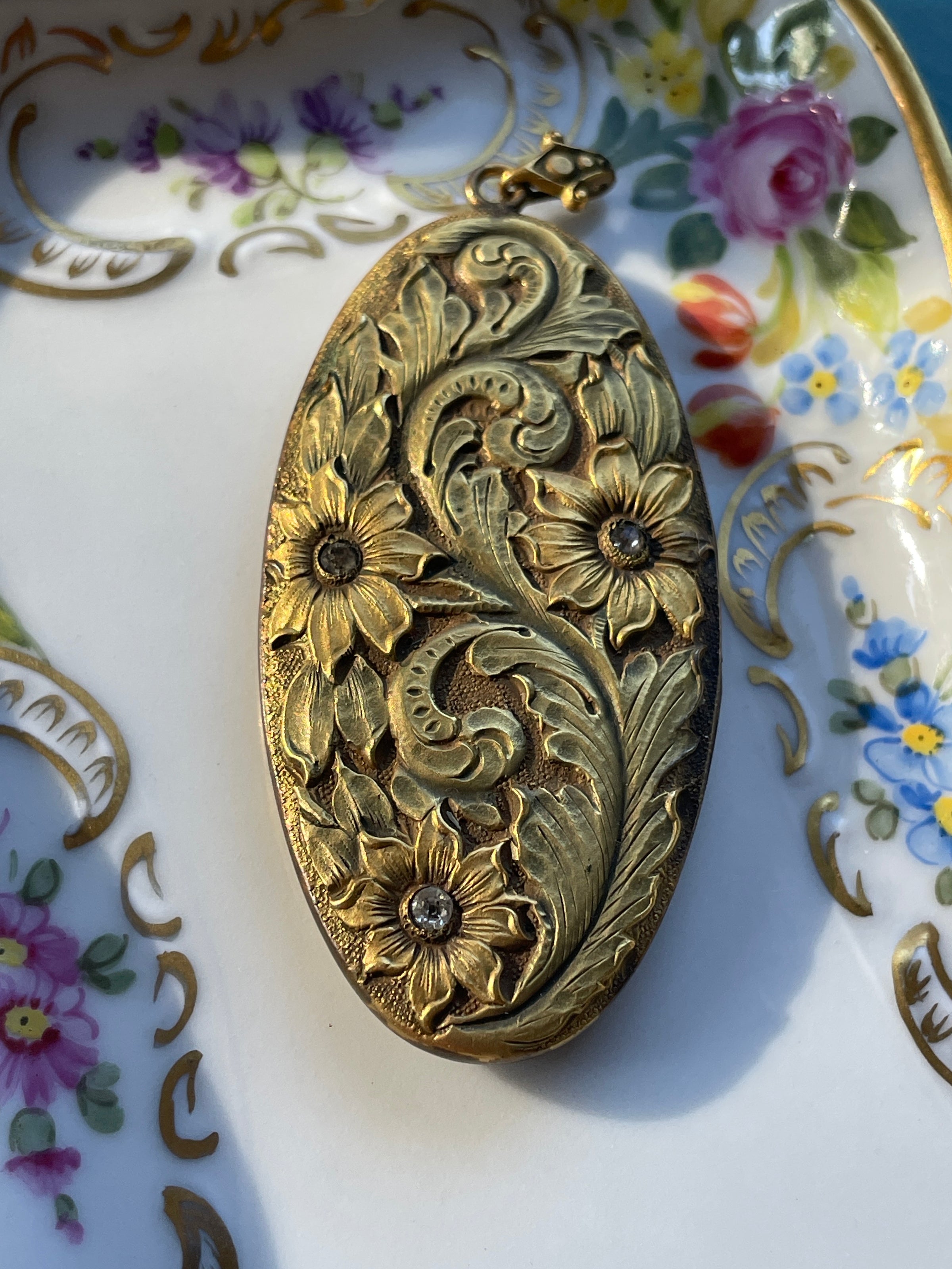 Stunning ultra rare large repousse (raised design) flower locket with paste accents in each flower. Locket measures 2.75 inches x just under 1.25 inches. One frame and acetate present. Stamped but very hard to make out the maker’s mark. Back has wear around edges see photos. Closes well.