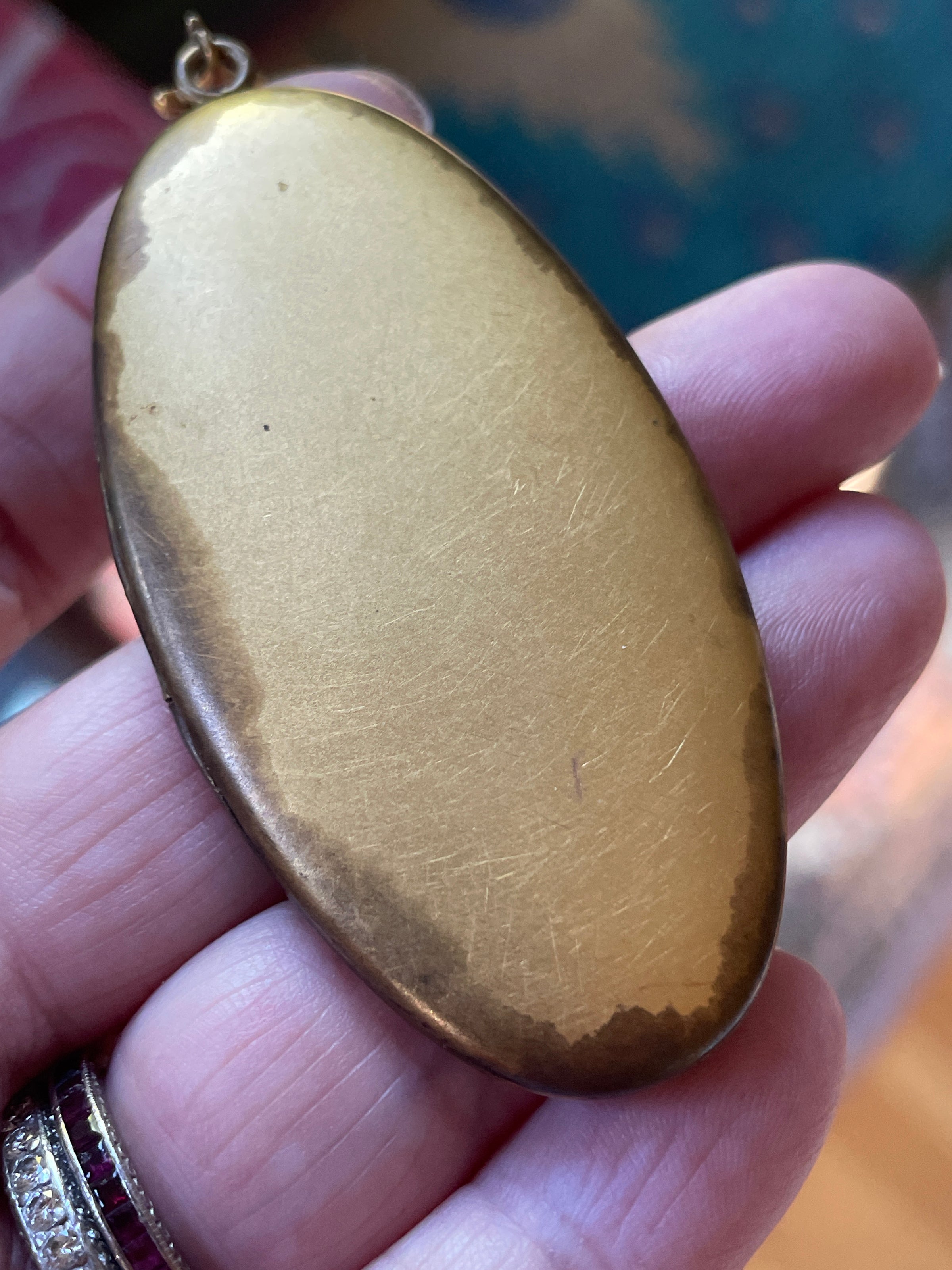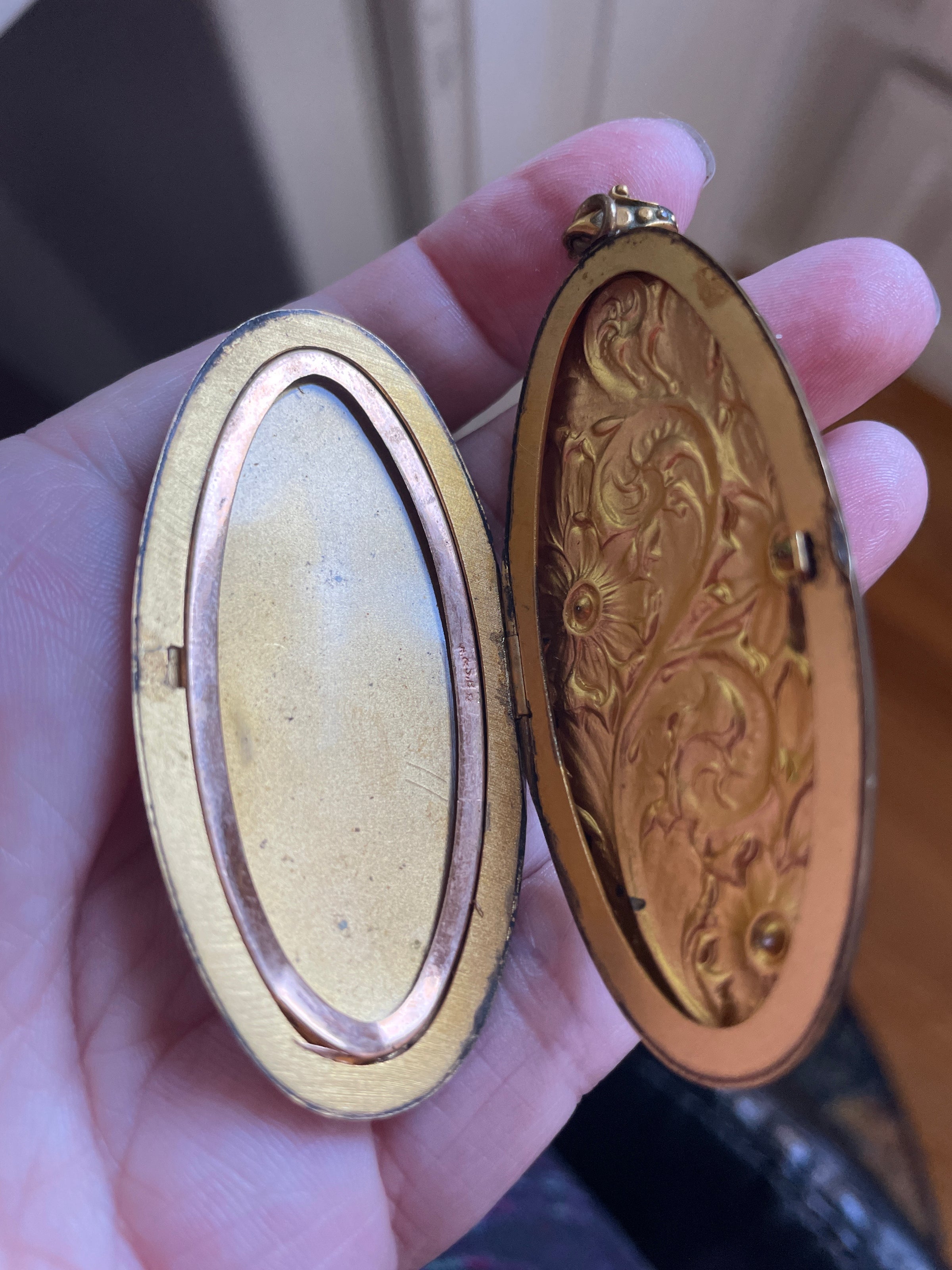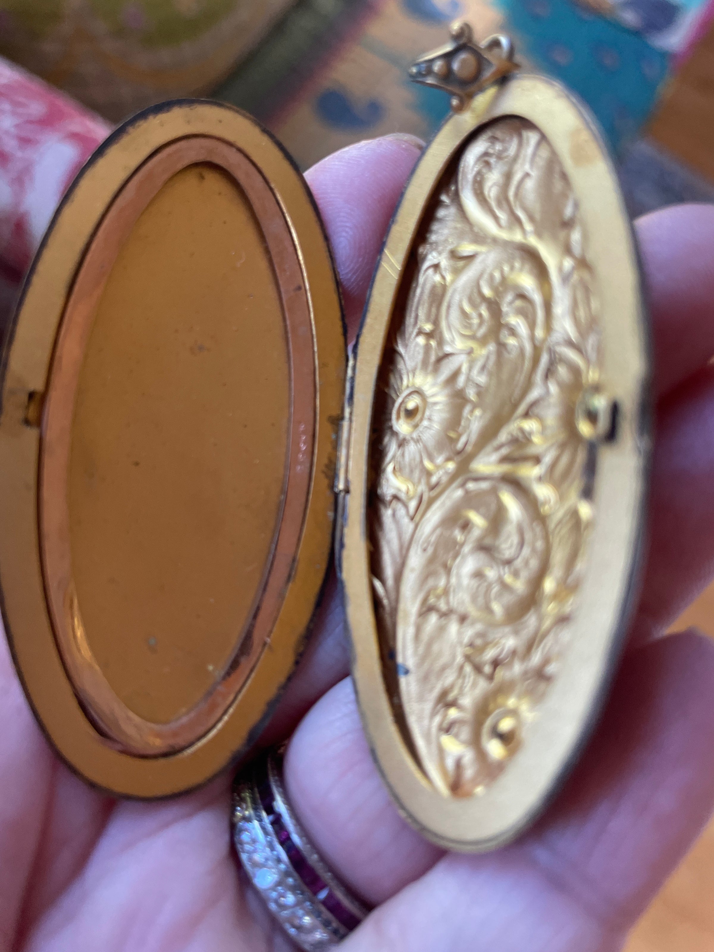 Stunning ultra rare large repousse (raised design) flower locket with paste accents in each flower. Locket measures 2.75 inches x just under 1.25 inches. One frame and acetate present. Stamped but very hard to make out the maker’s mark. Back has wear around edges see photos. Closes well.