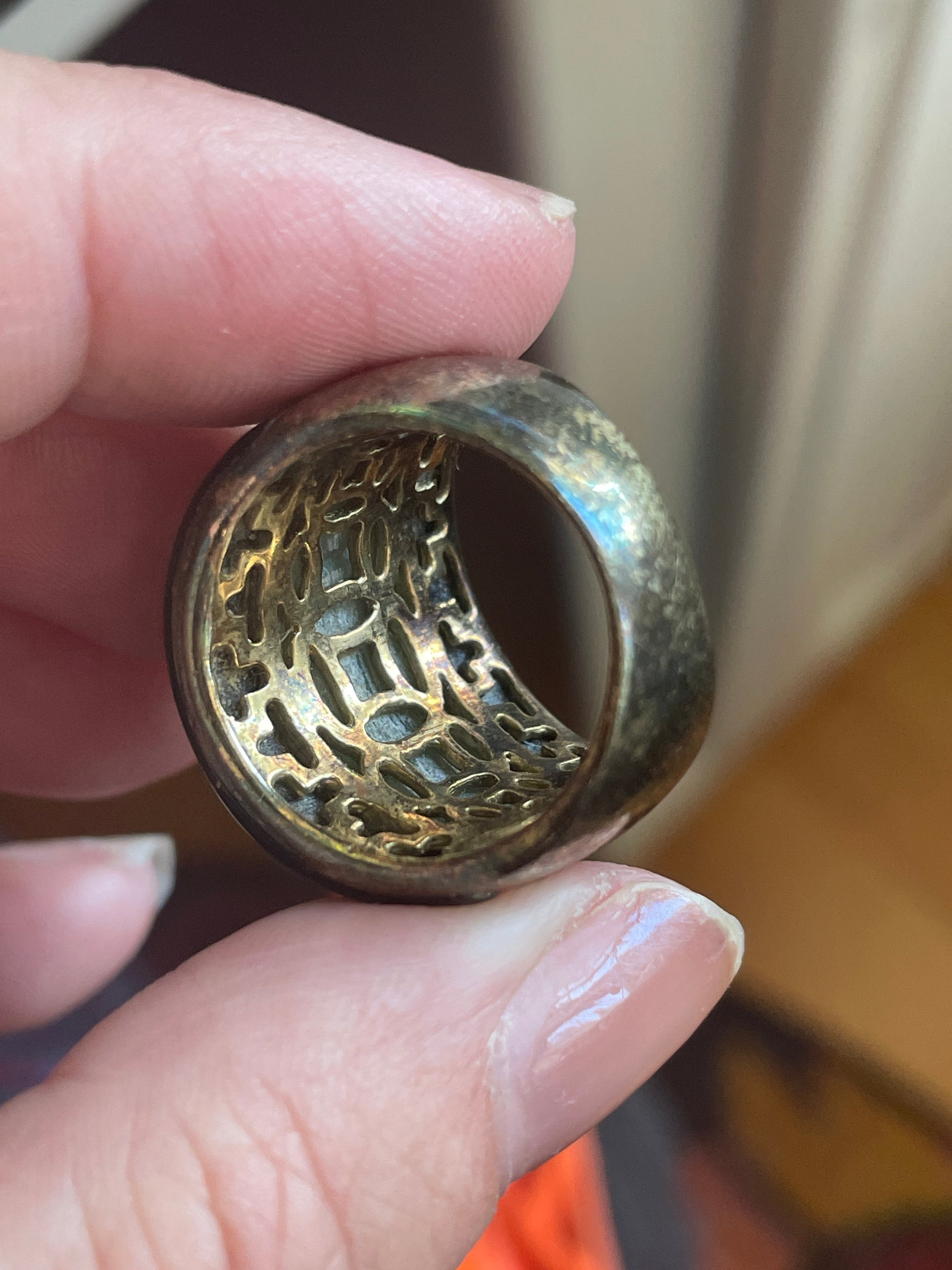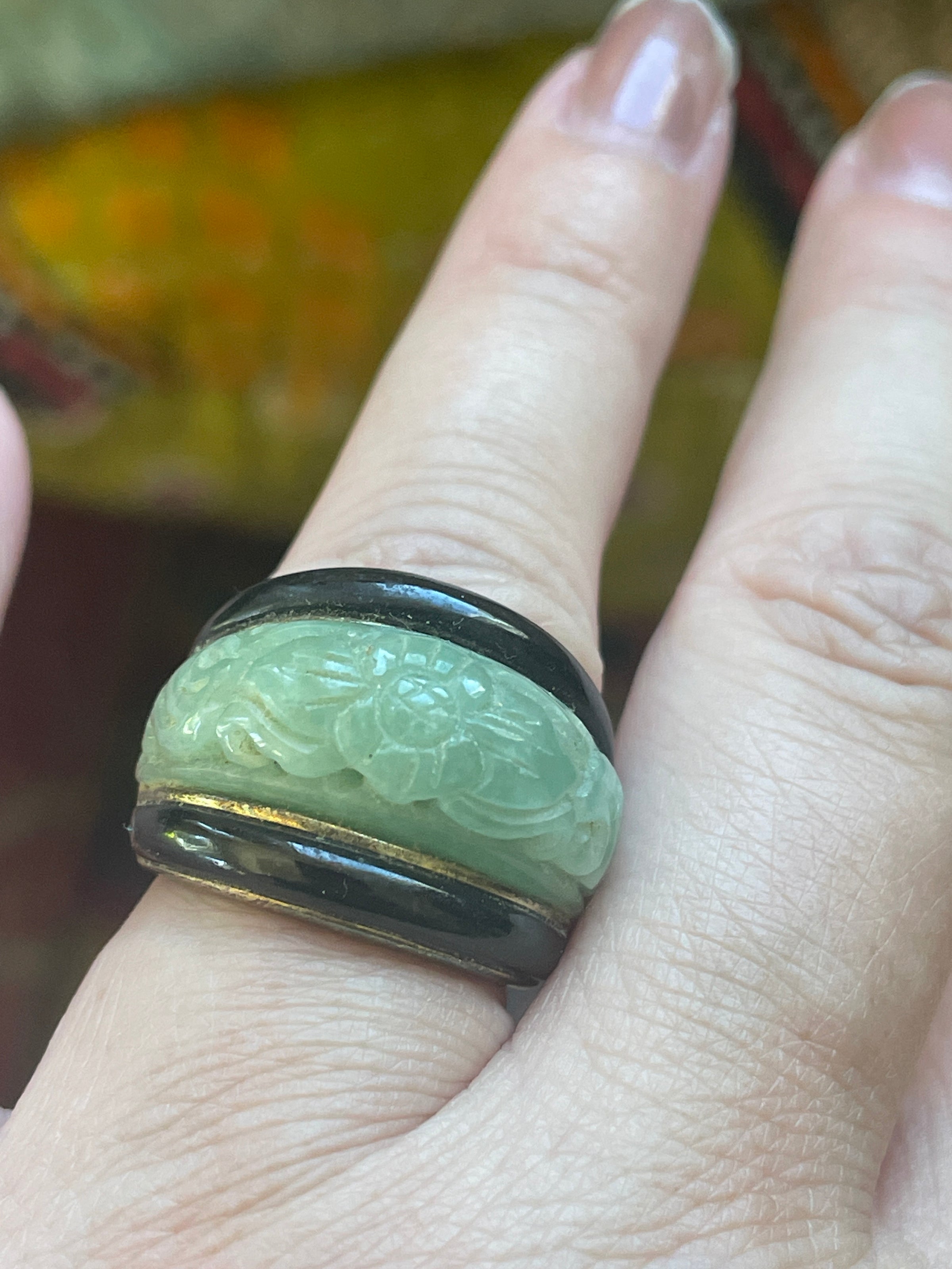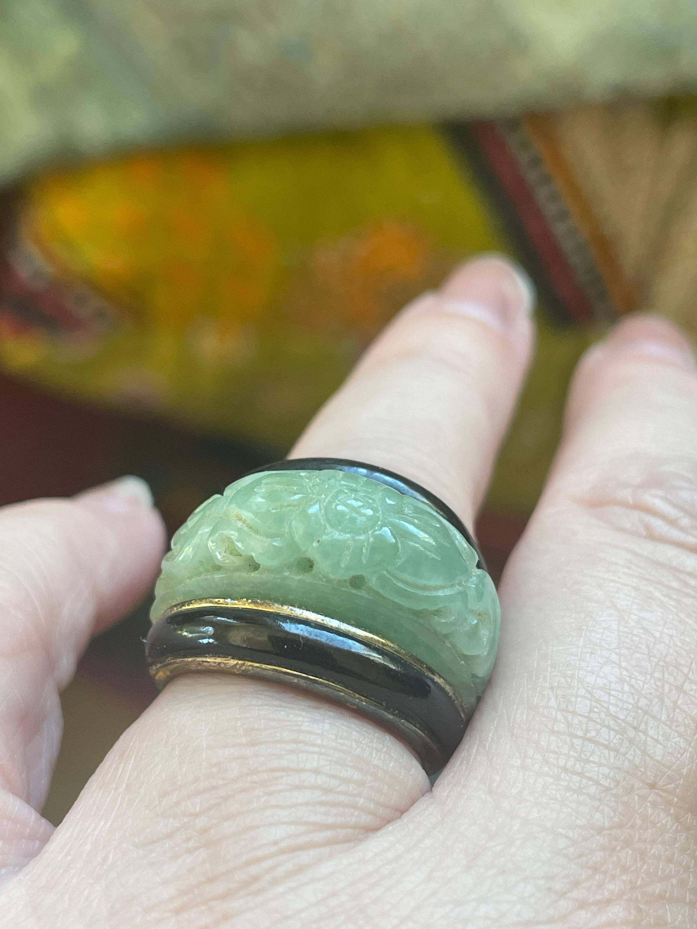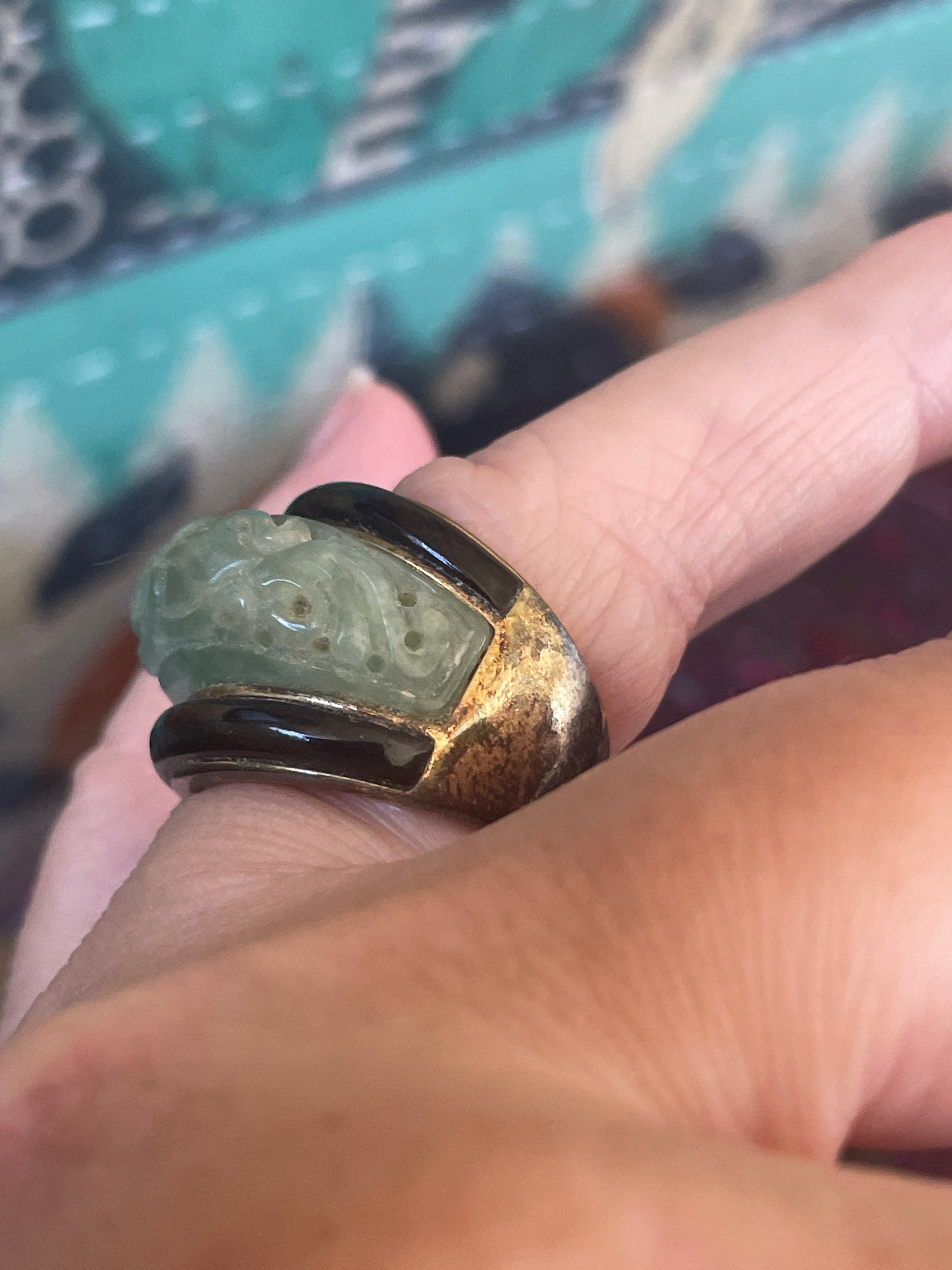 Fabulous rare carved Jade ring with black enamel accents in sterling silver. Ring size = 6.75. Stamped 925 for sterling. Sterling is oxidized from age but will leave to new owner to decide on cleaning.